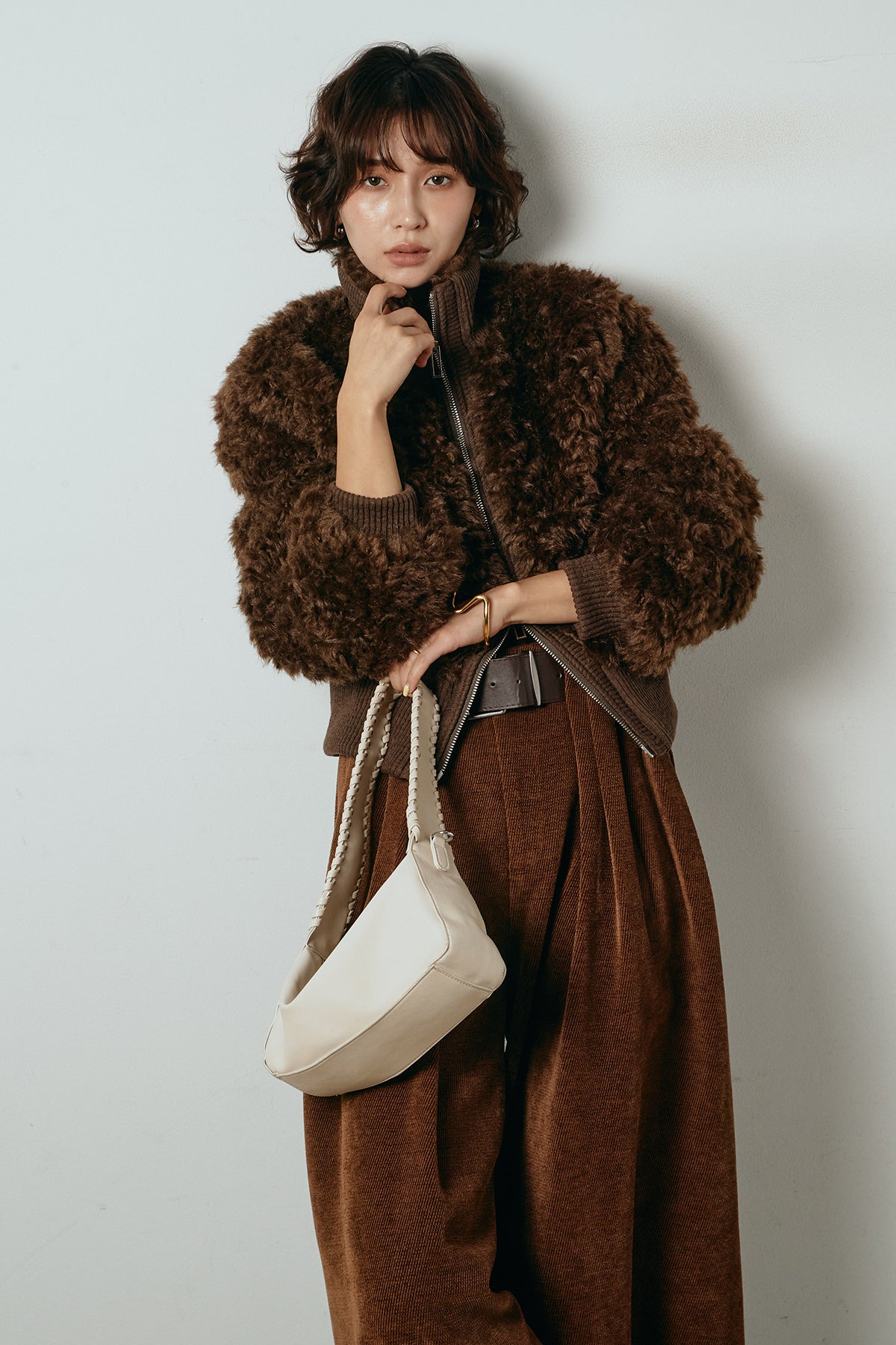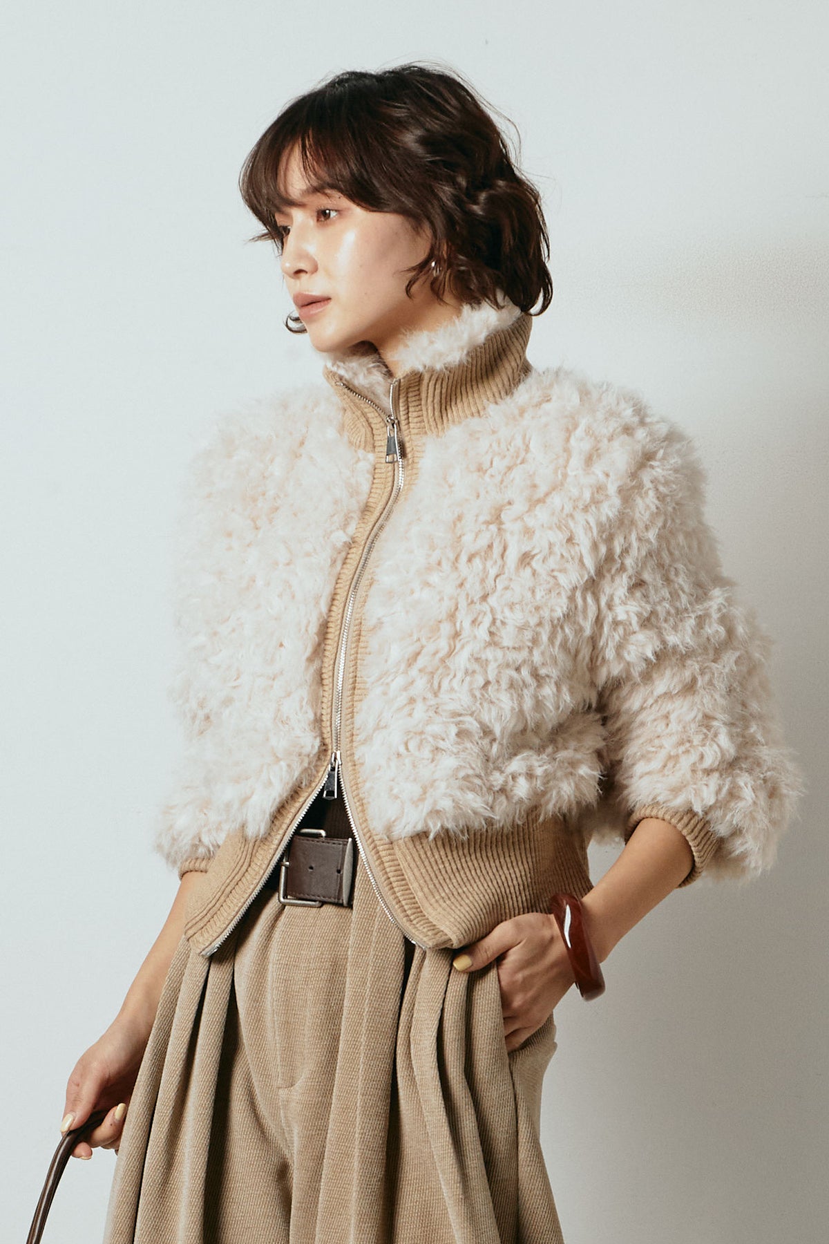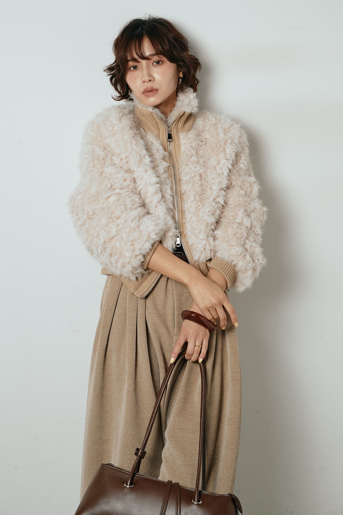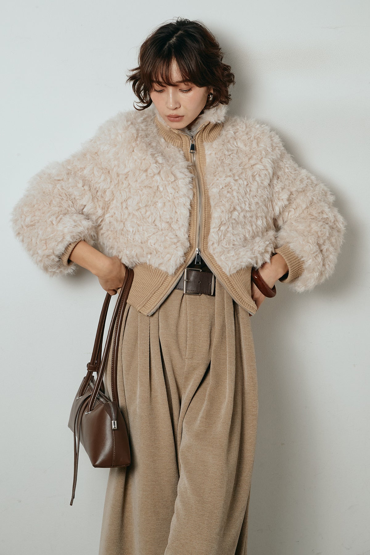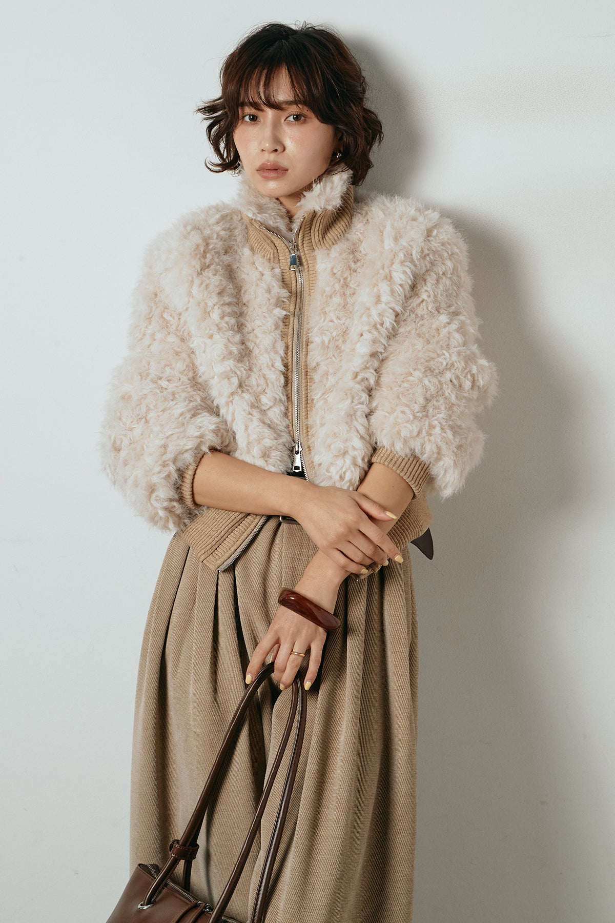 ふんわりとしたボア素材が存在感を放つ、ハイネックデザインのショート丈ブルゾン。首元まで包み込むハイネックとジップ仕様で、暖かさとすっきり感を両立しています。コンパクトな丈感がバランスを取りやすく、ワイドボトムやスカートとも好相性。羽織るだけで季節感のあるスタイリングが完成する、主役級の一枚です。