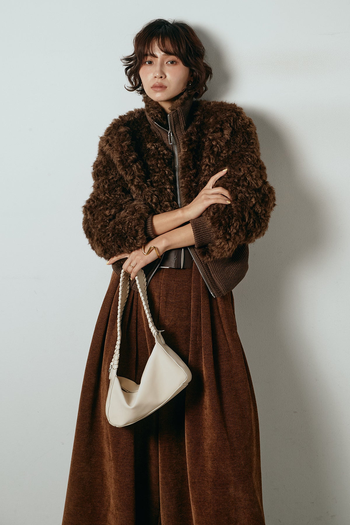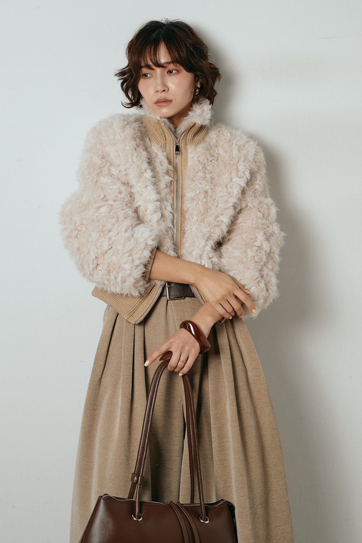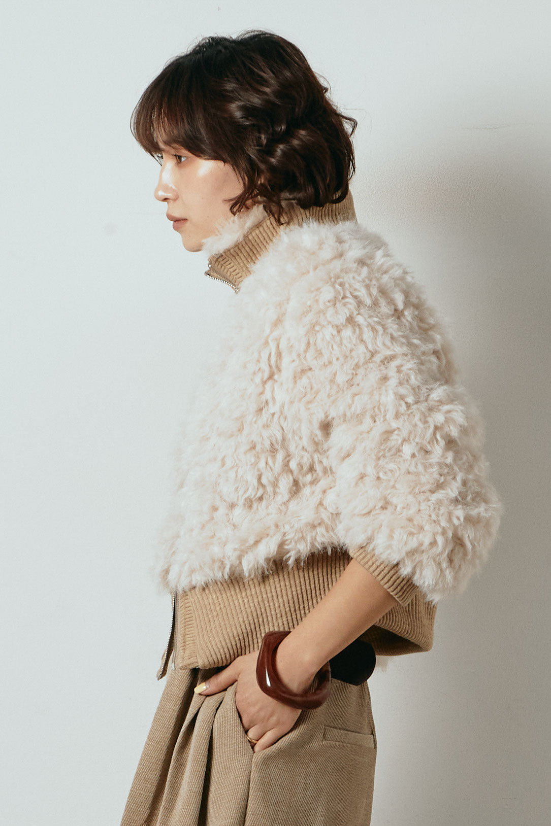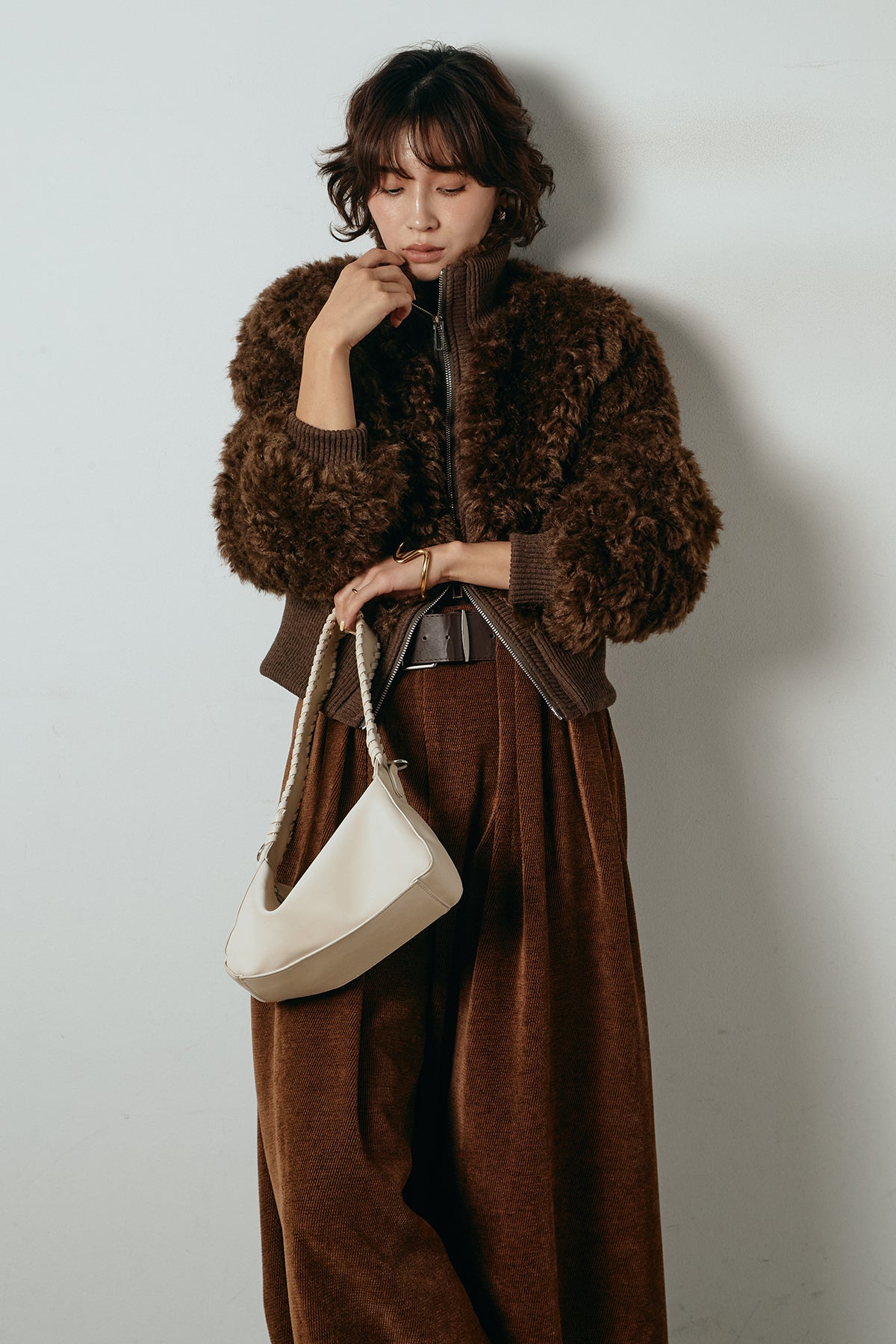 ふんわりとしたボア素材が存在感を放つ、ハイネックデザインのショート丈ブルゾン。首元まで包み込むハイネックとジップ仕様で、暖かさとすっきり感を両立しています。コンパクトな丈感がバランスを取りやすく、ワイドボトムやスカートとも好相性。羽織るだけで季節感のあるスタイリングが完成する、主役級の一枚です。