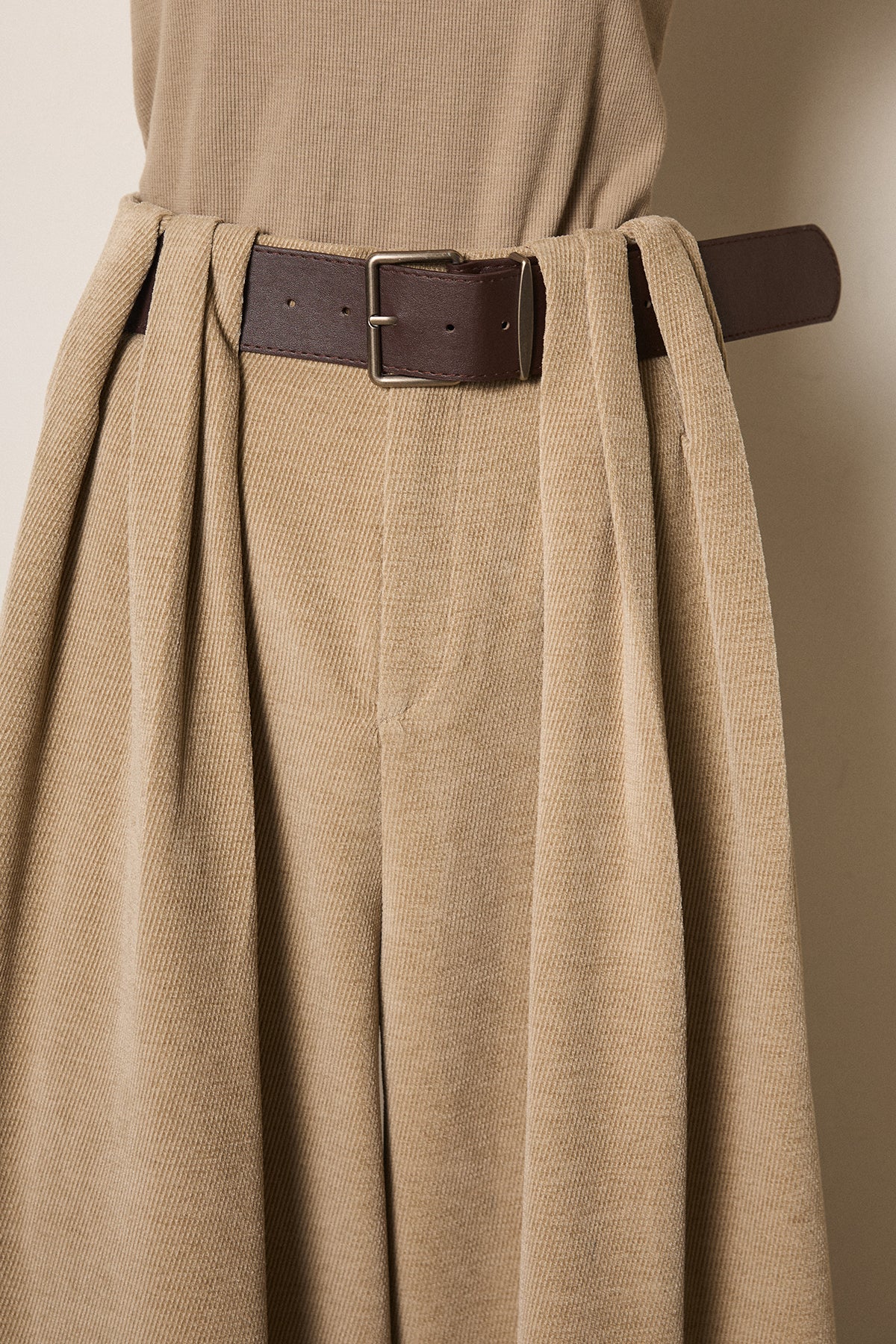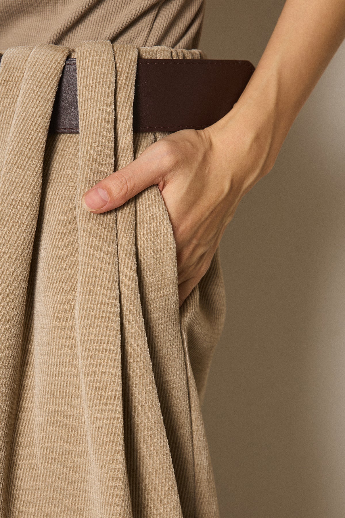 しなやかに落ちるコーデュロイが描くワイドシルエットが魅力の1本。ウエスト周りに施したタックが立体感を生み、歩くたびにゆるやかなドレープが揺れて存在感を放ちます。ベルトループ付きでトップスインもすっきり決まり、ざっくりニットやショート丈のアウターともバランスよくスタイリング可能。ラフさと上品さを両立させたワイドパンツです。