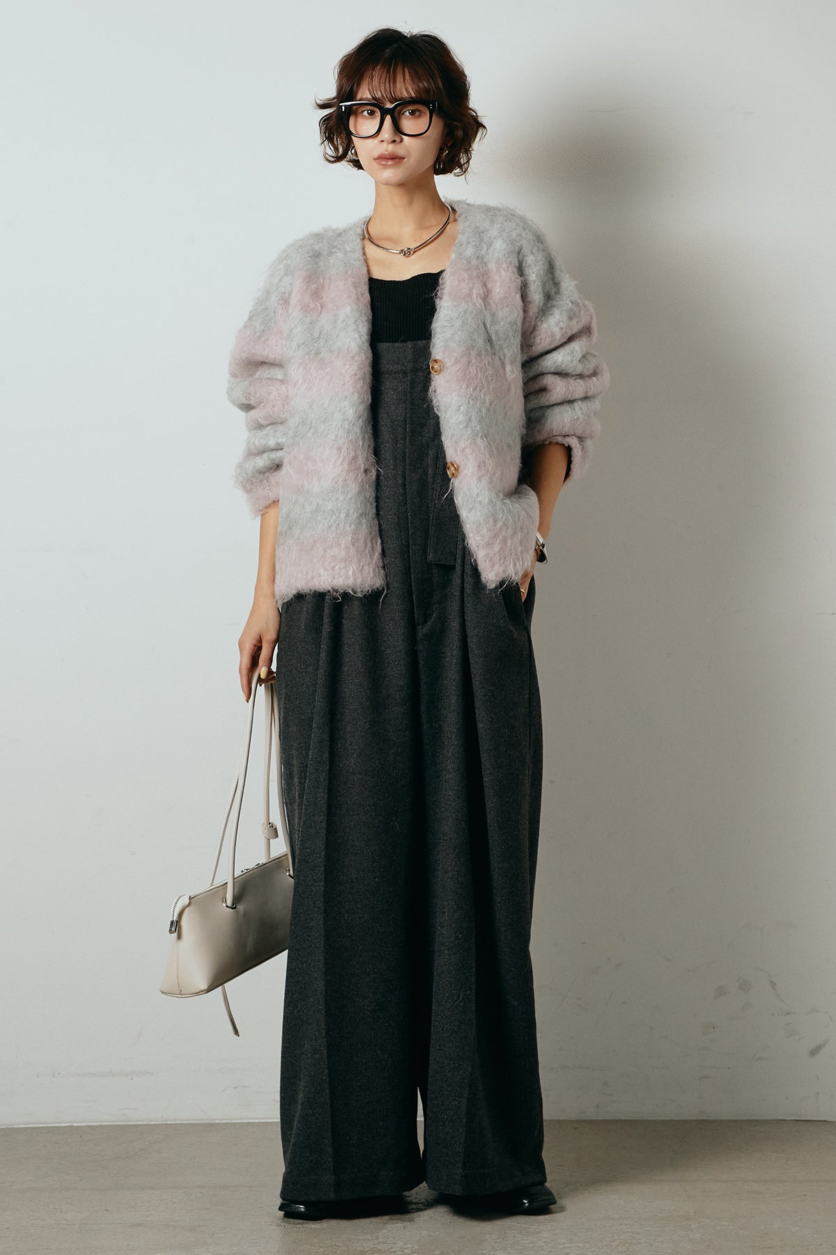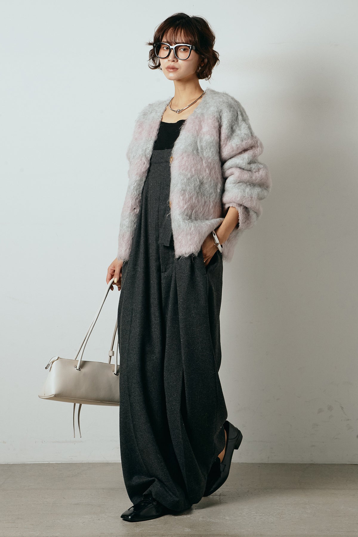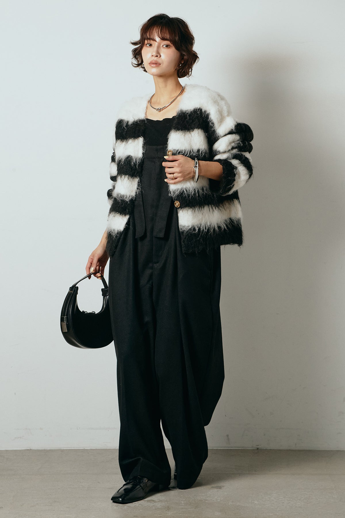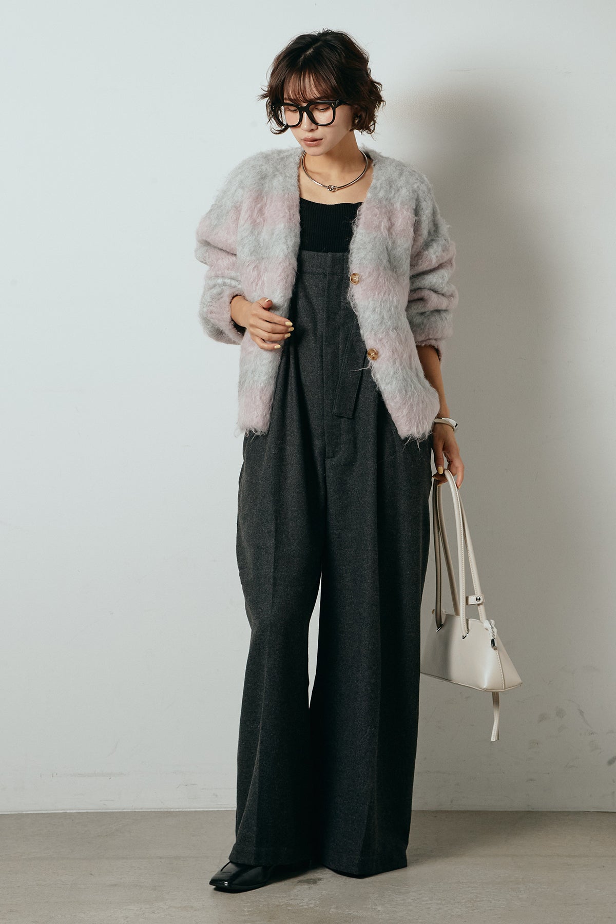 [SET]シャギーボーダー柄ニットカーディガン+ウール混フランネルワイドサロペット(2set)