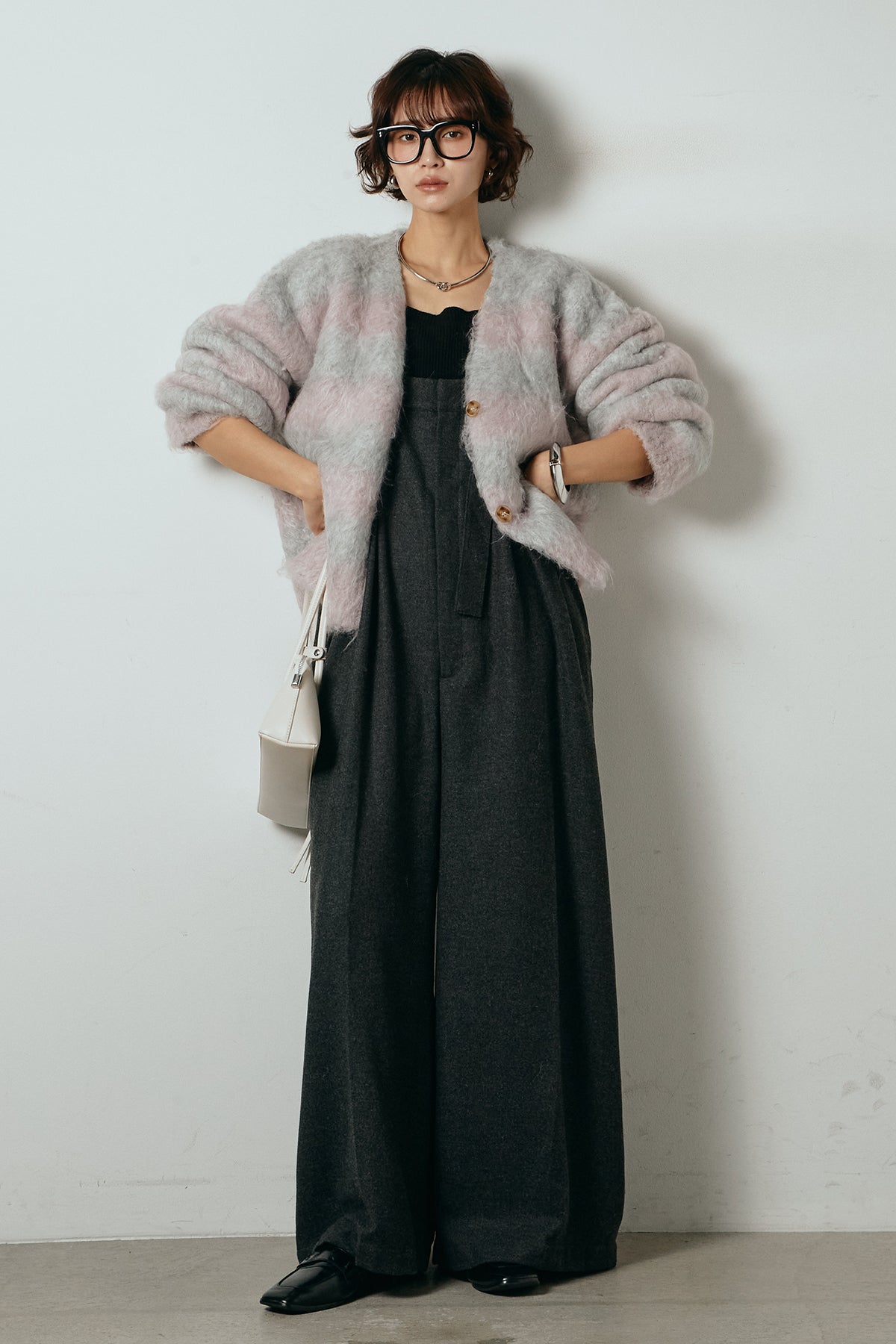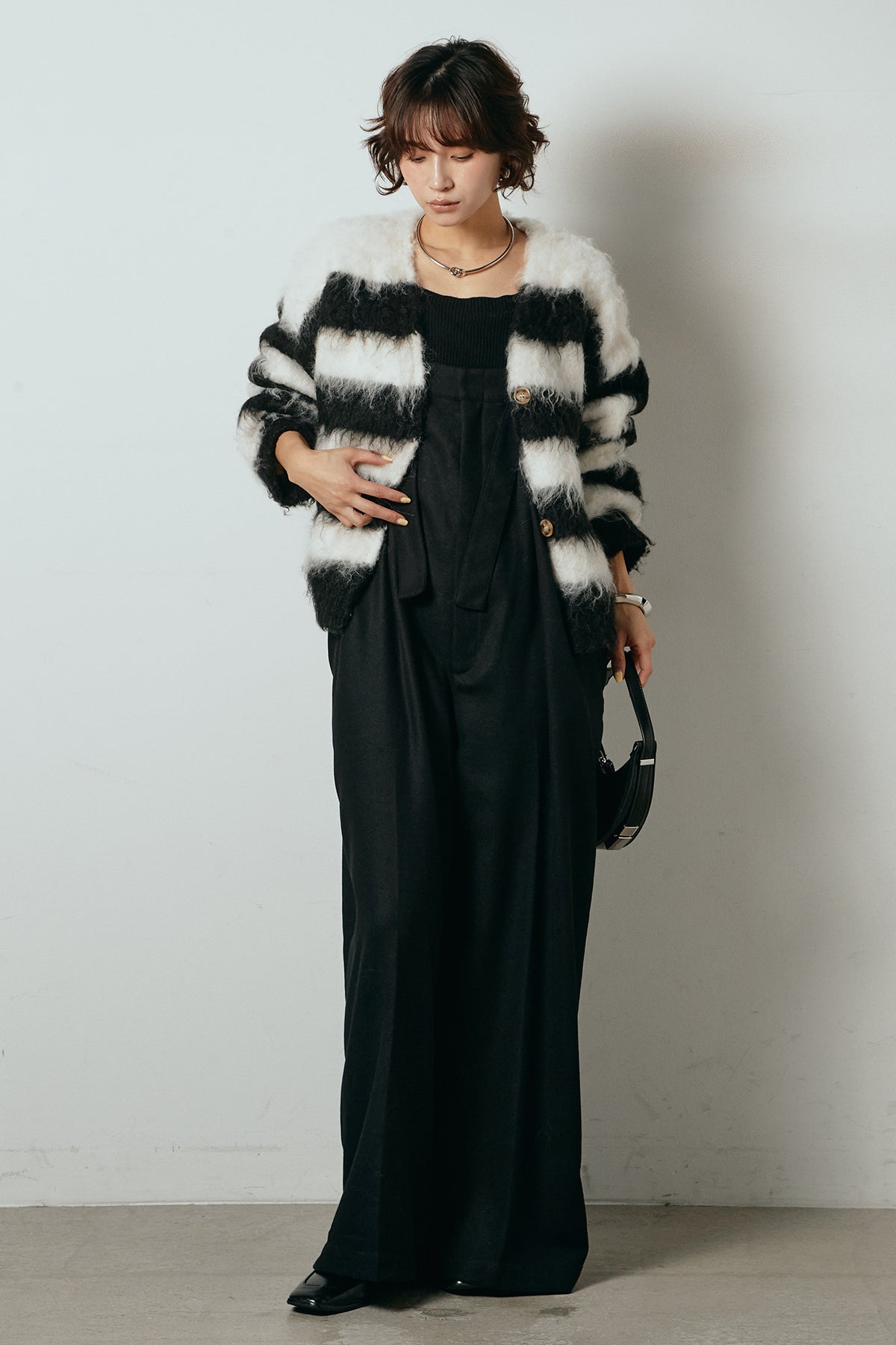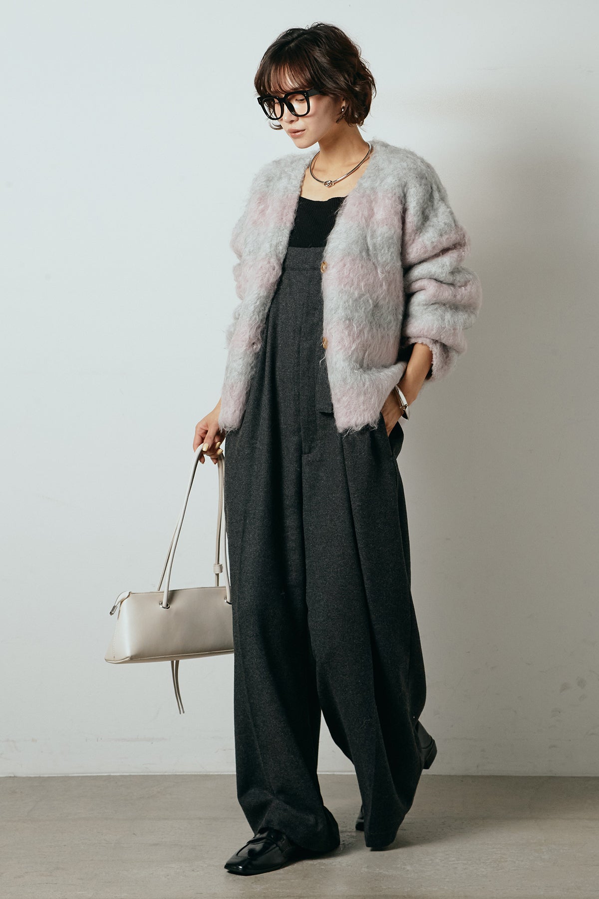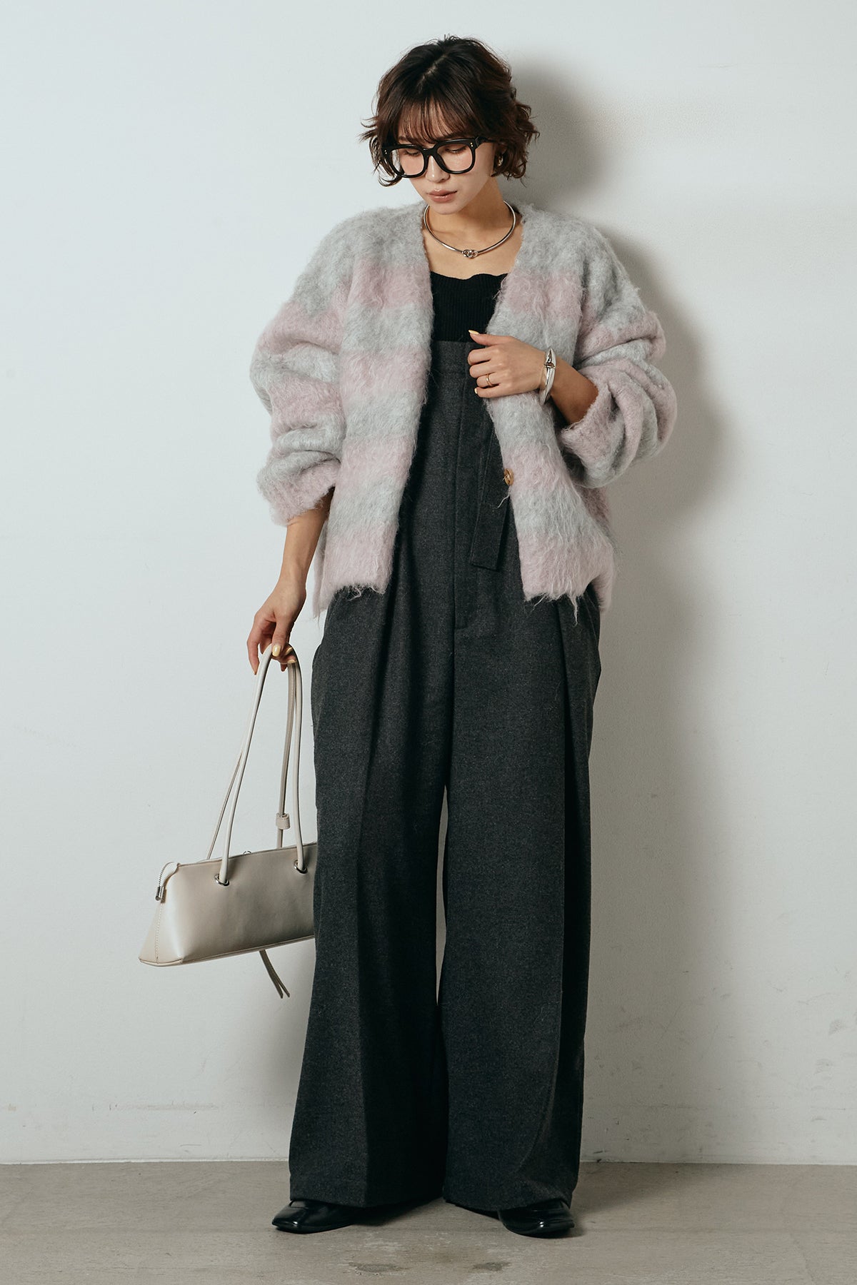 [SET]シャギーボーダー柄ニットカーディガン+ウール混フランネルワイドサロペット(2set)