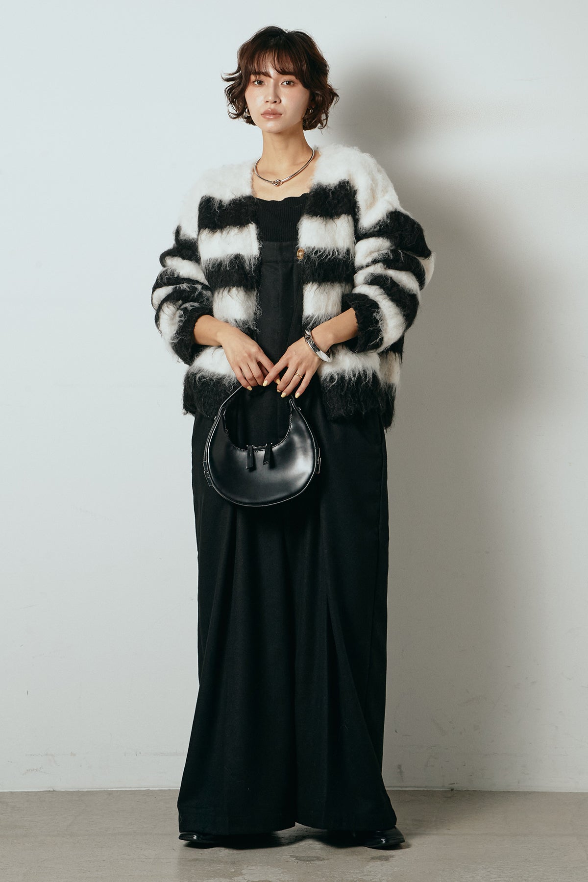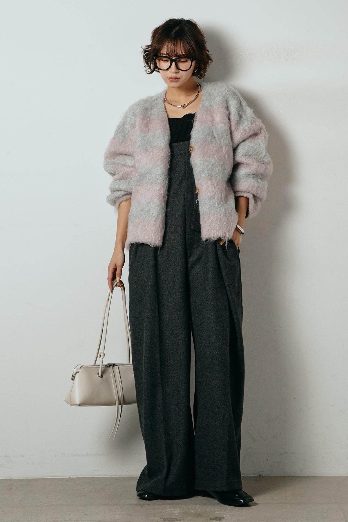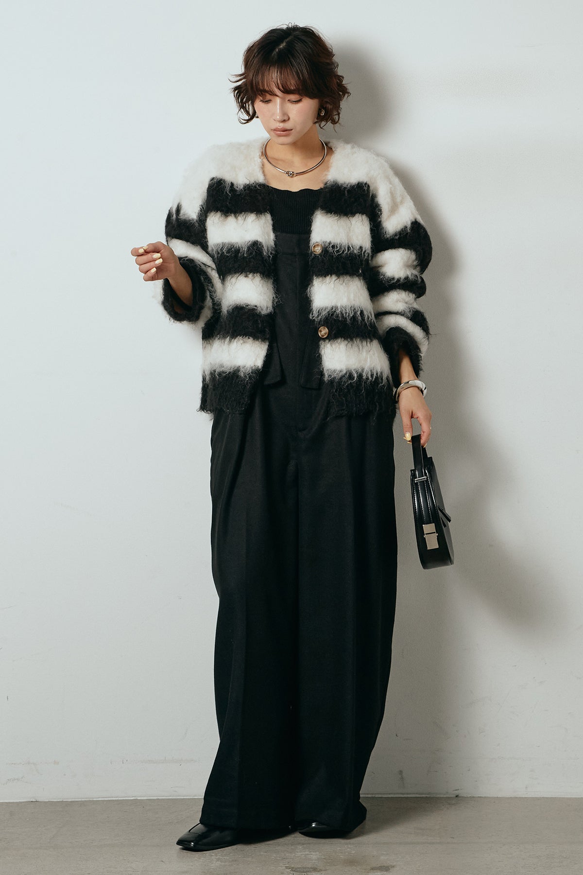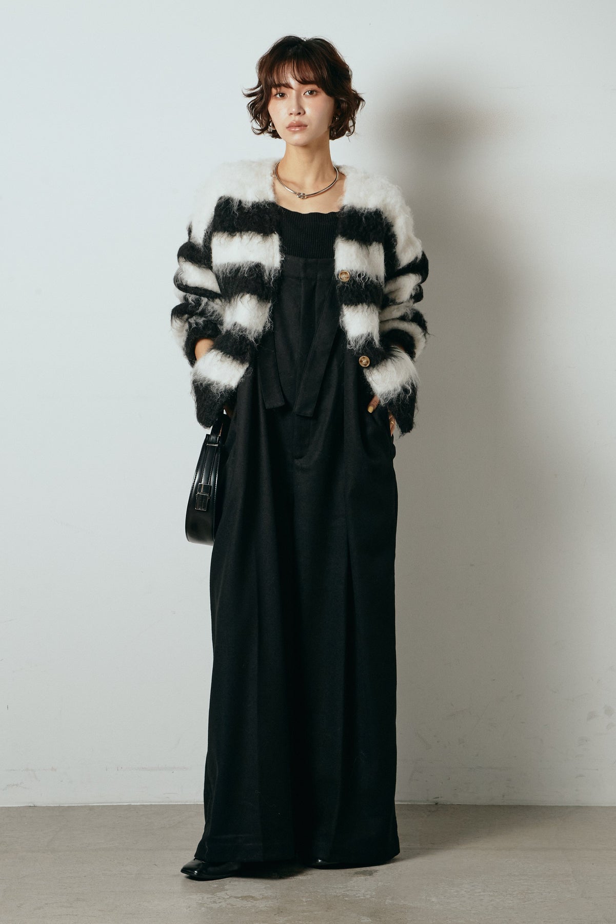 [SET]シャギーボーダー柄ニットカーディガン+ウール混フランネルワイドサロペット(2set)