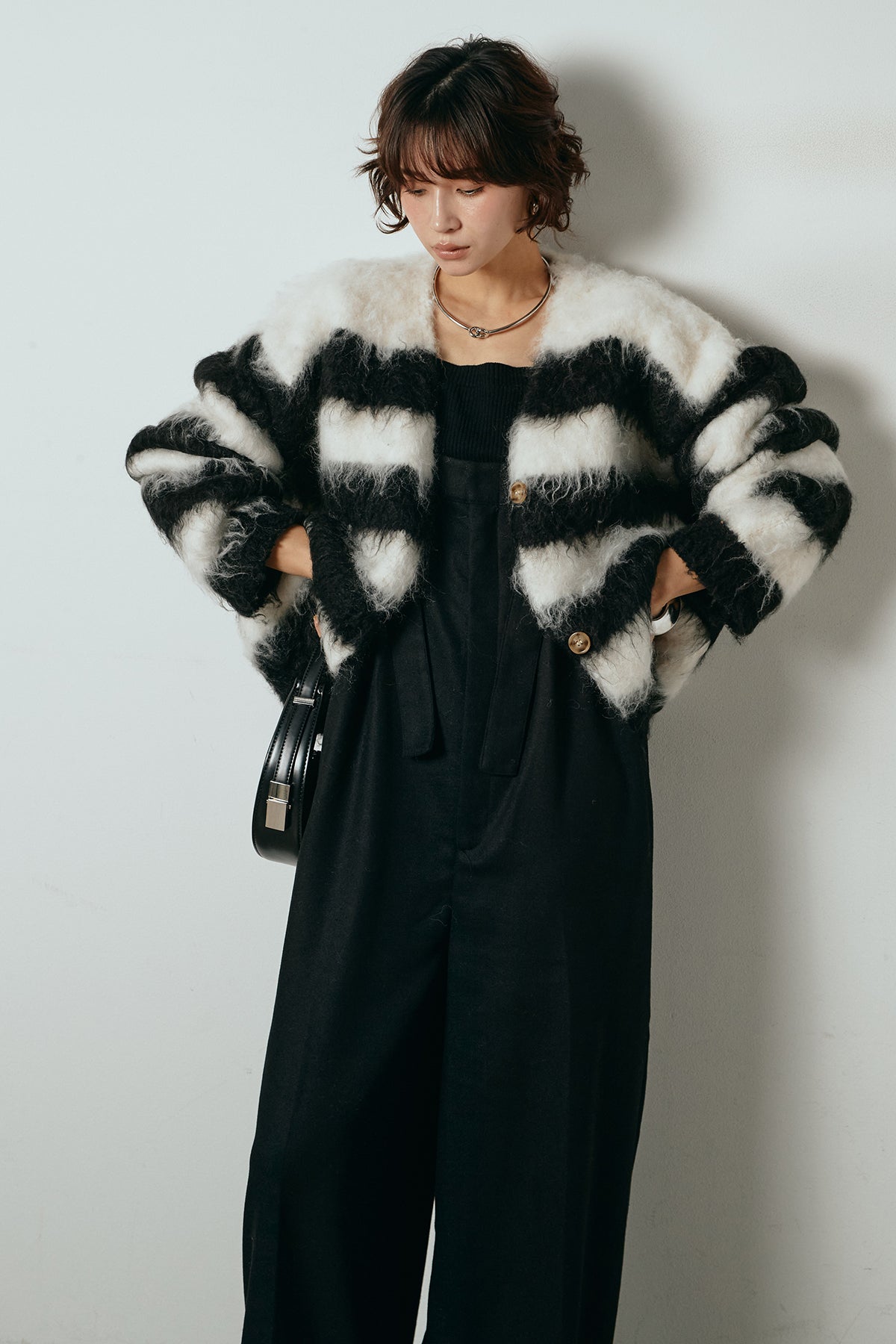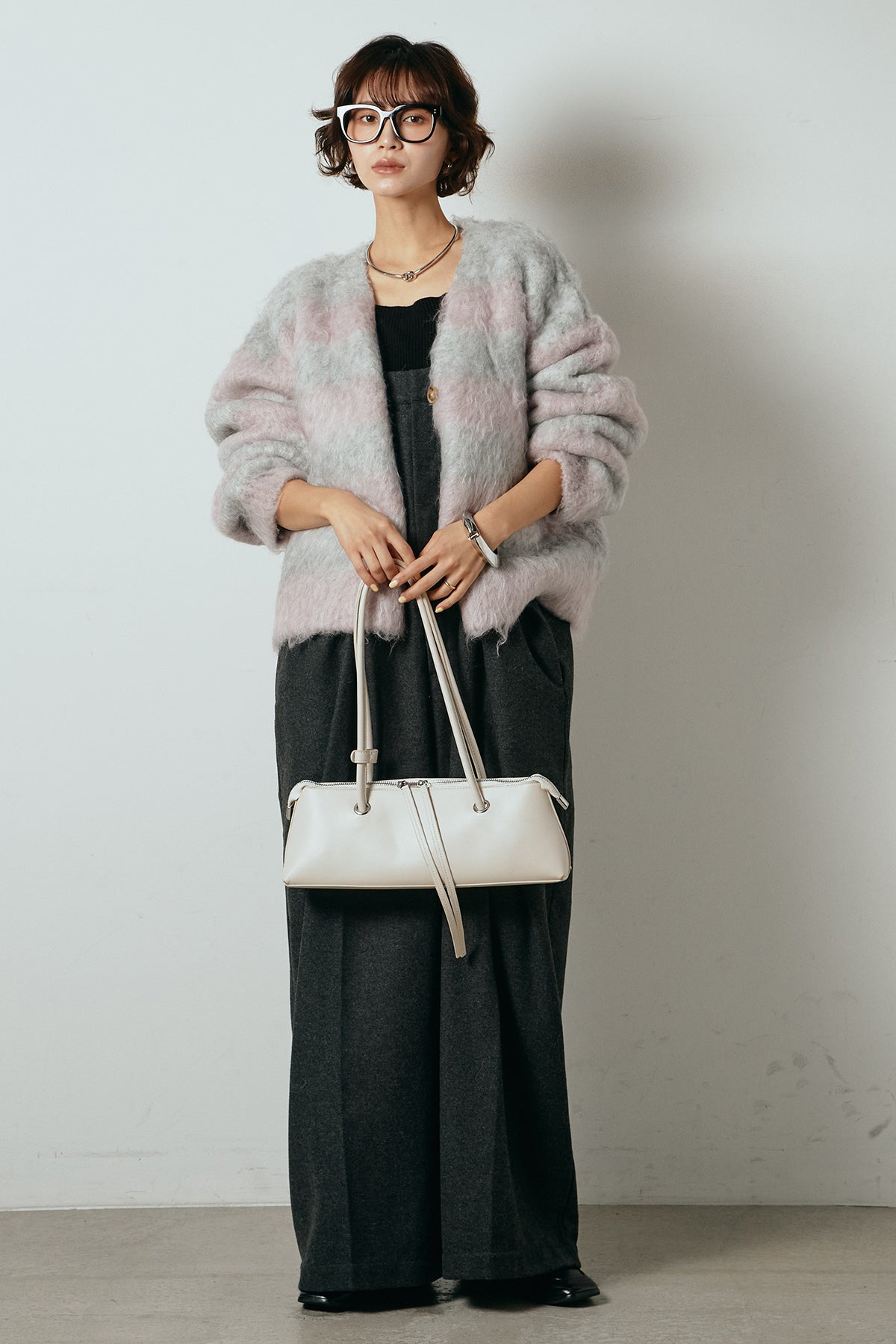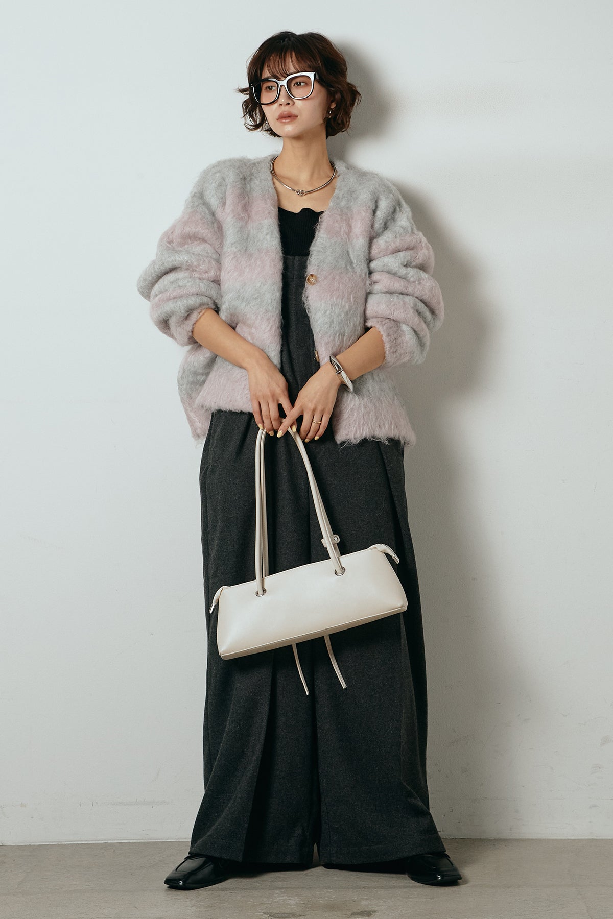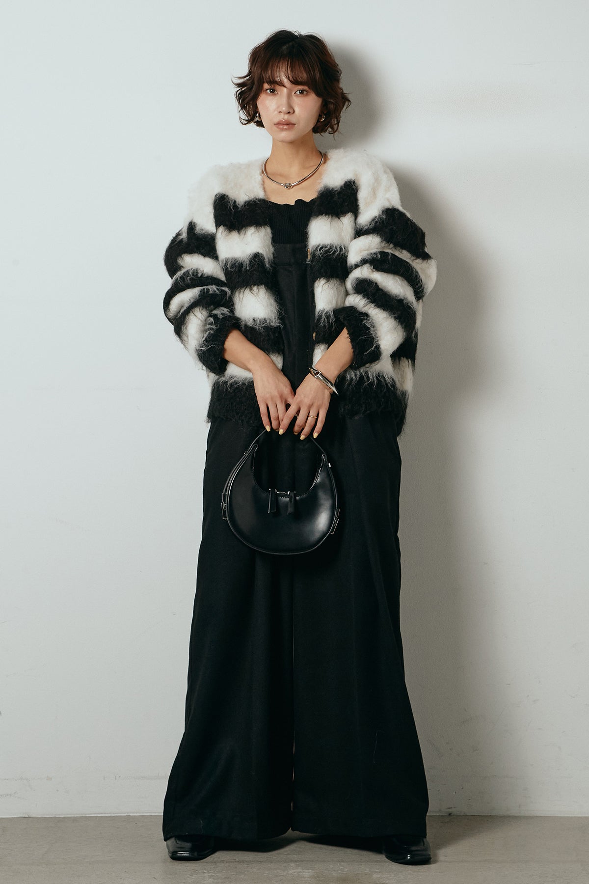 [SET]シャギーボーダー柄ニットカーディガン+ウール混フランネルワイドサロペット(2set)