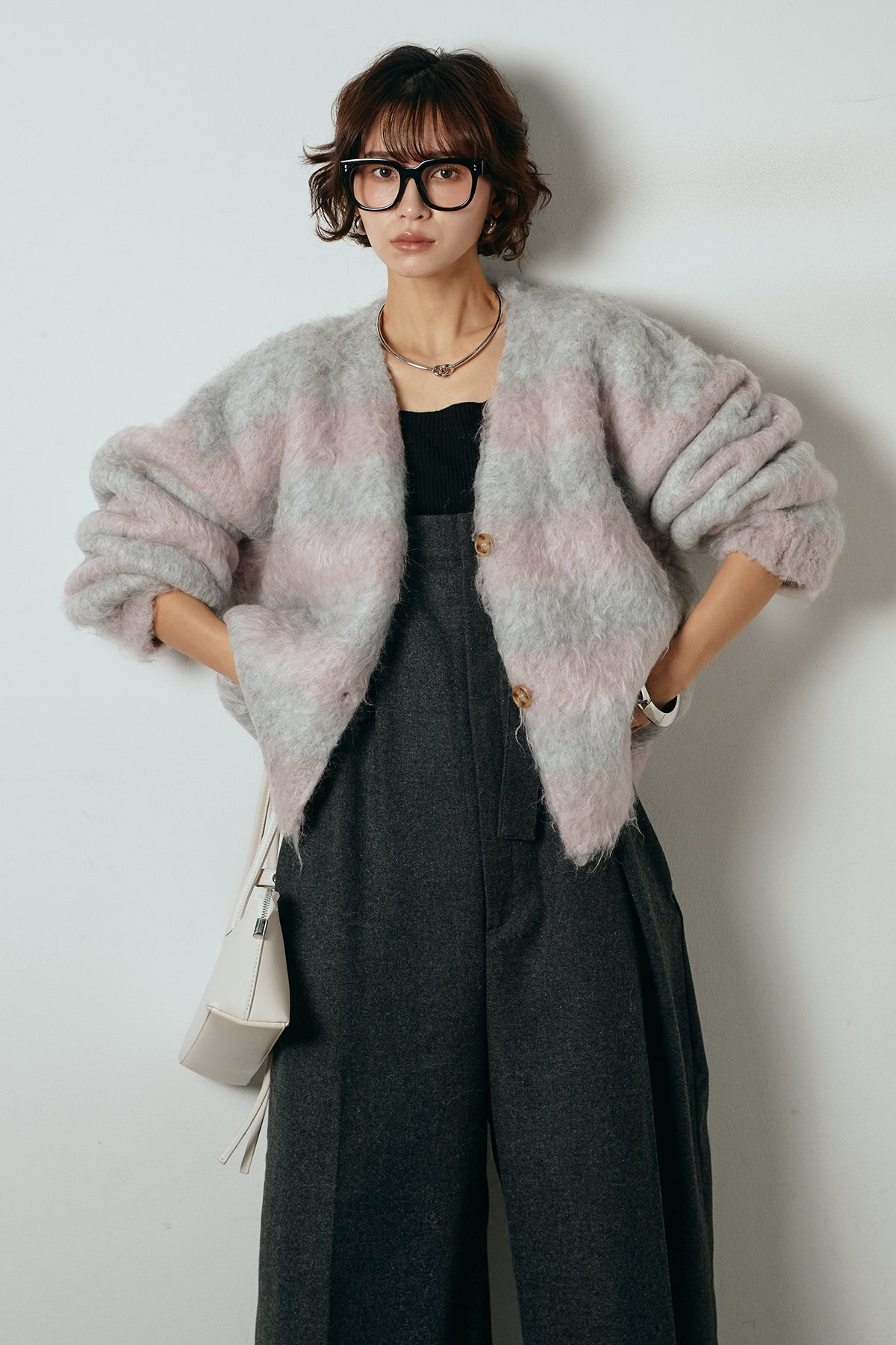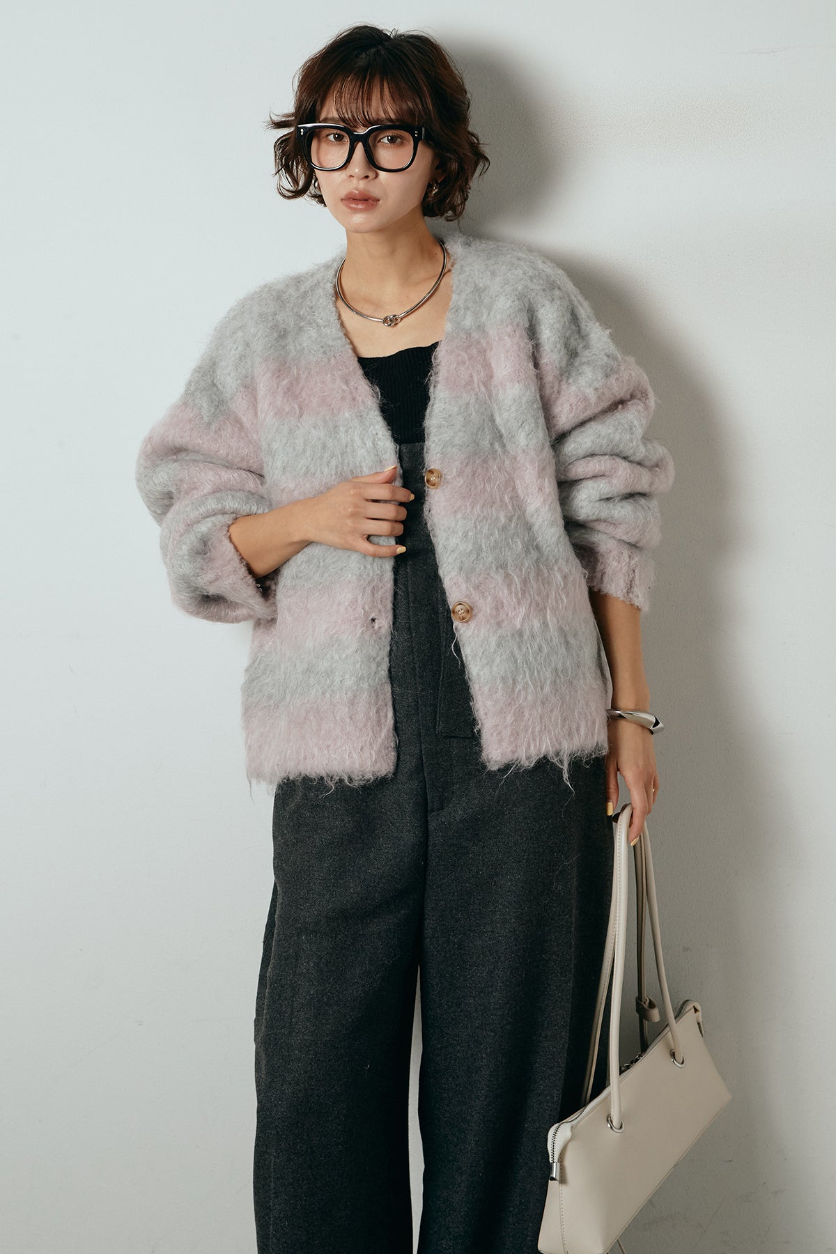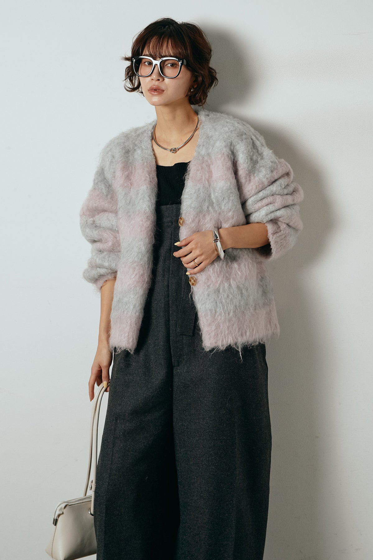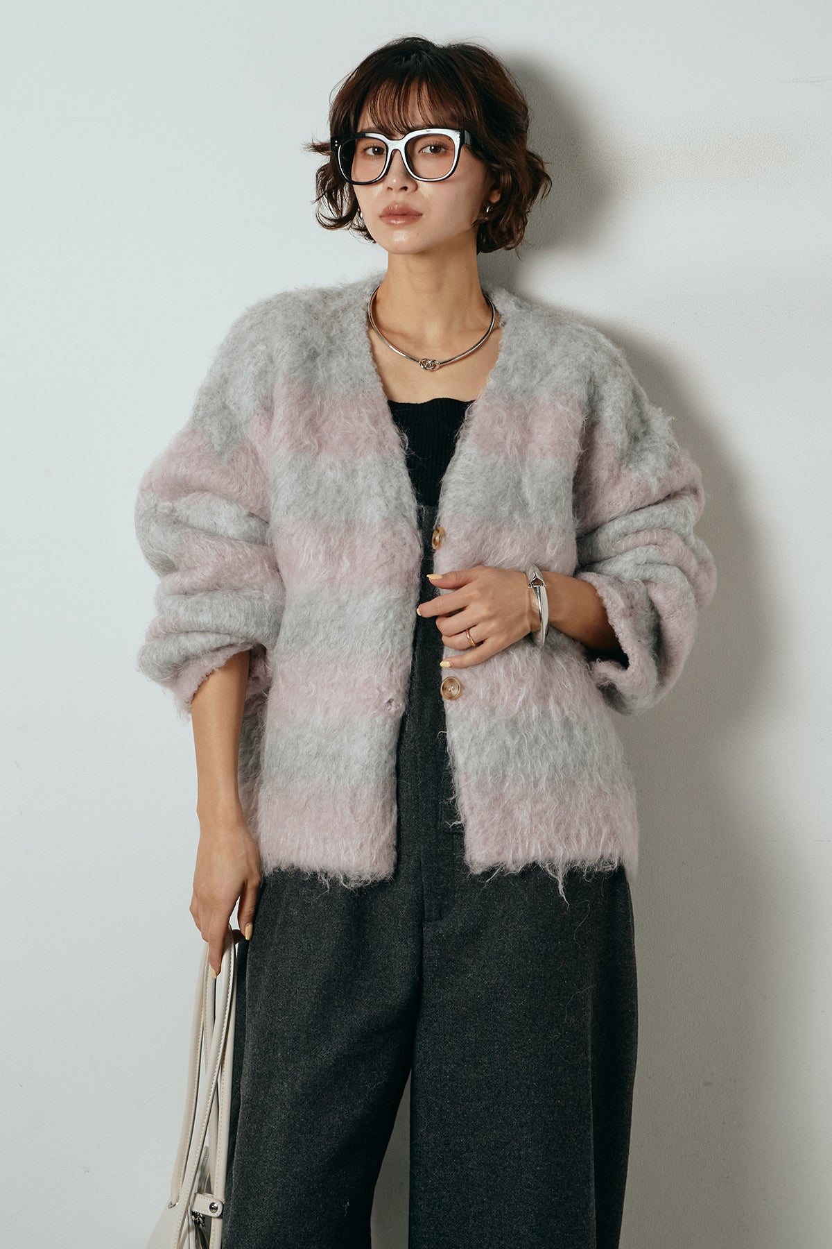 ふんわりとしたシャギー素材に、淡く溶け合うボーダー柄をのせたニットカーディガン。柔らかな毛足が優しい表情を生み、軽く羽織るだけで季節感のあるスタイリングに仕上がります。コンパクトすぎない程よいシルエットで、ボトムを選ばず合わせやすいのも魅力。前を留めても開けてもバランスよく、コーディネートにさりげない華やかさを添える一枚です。