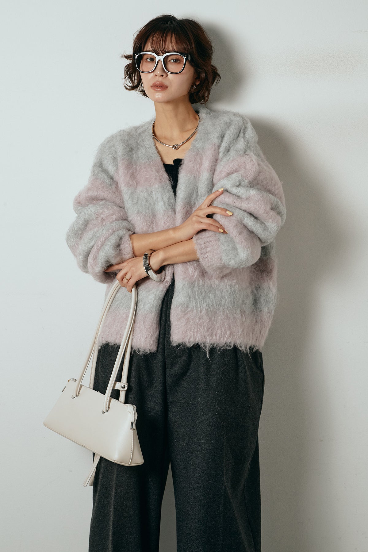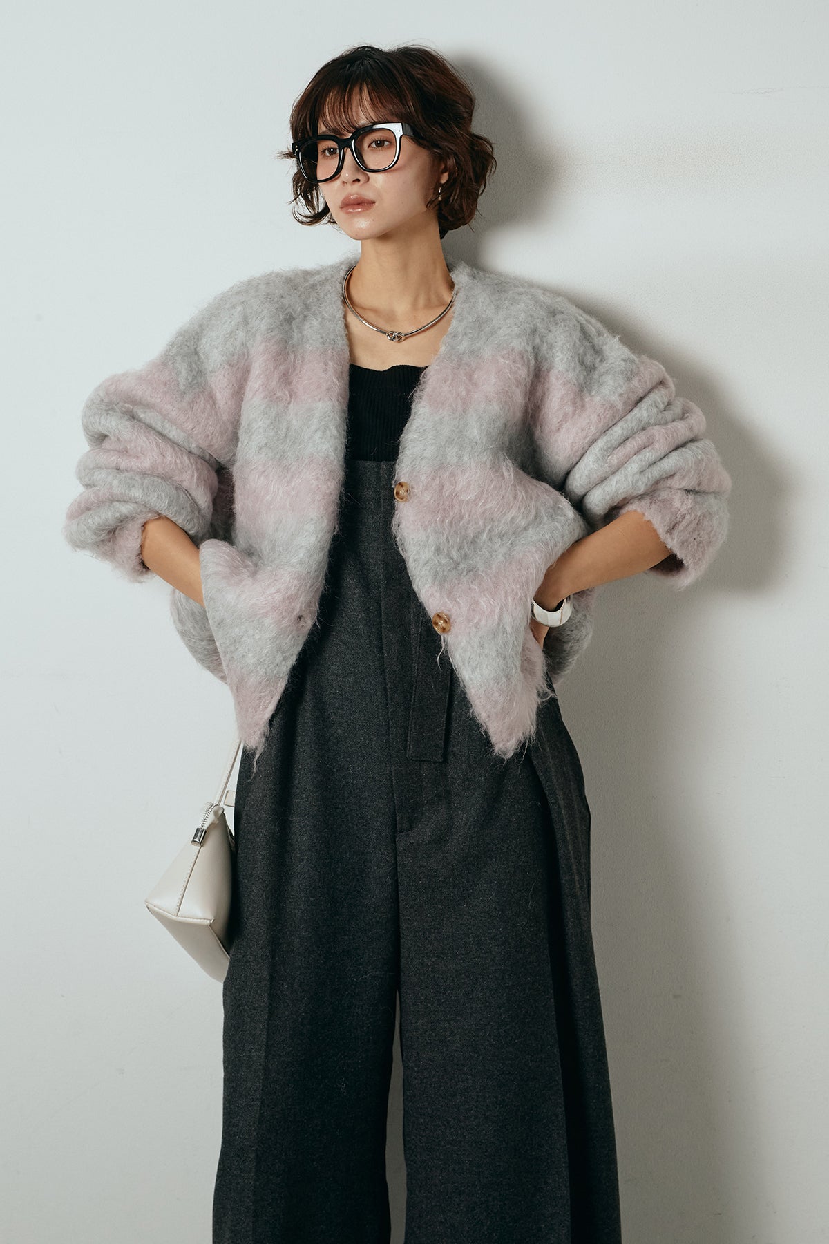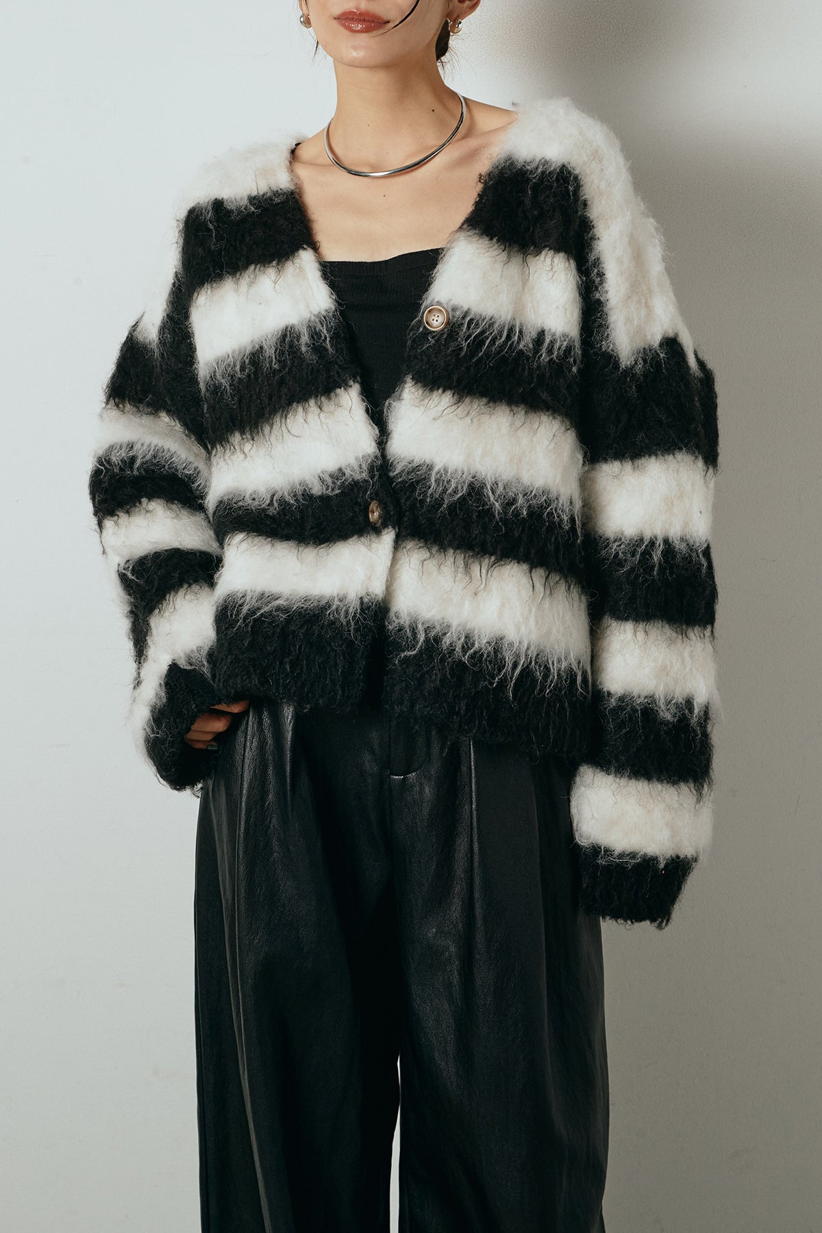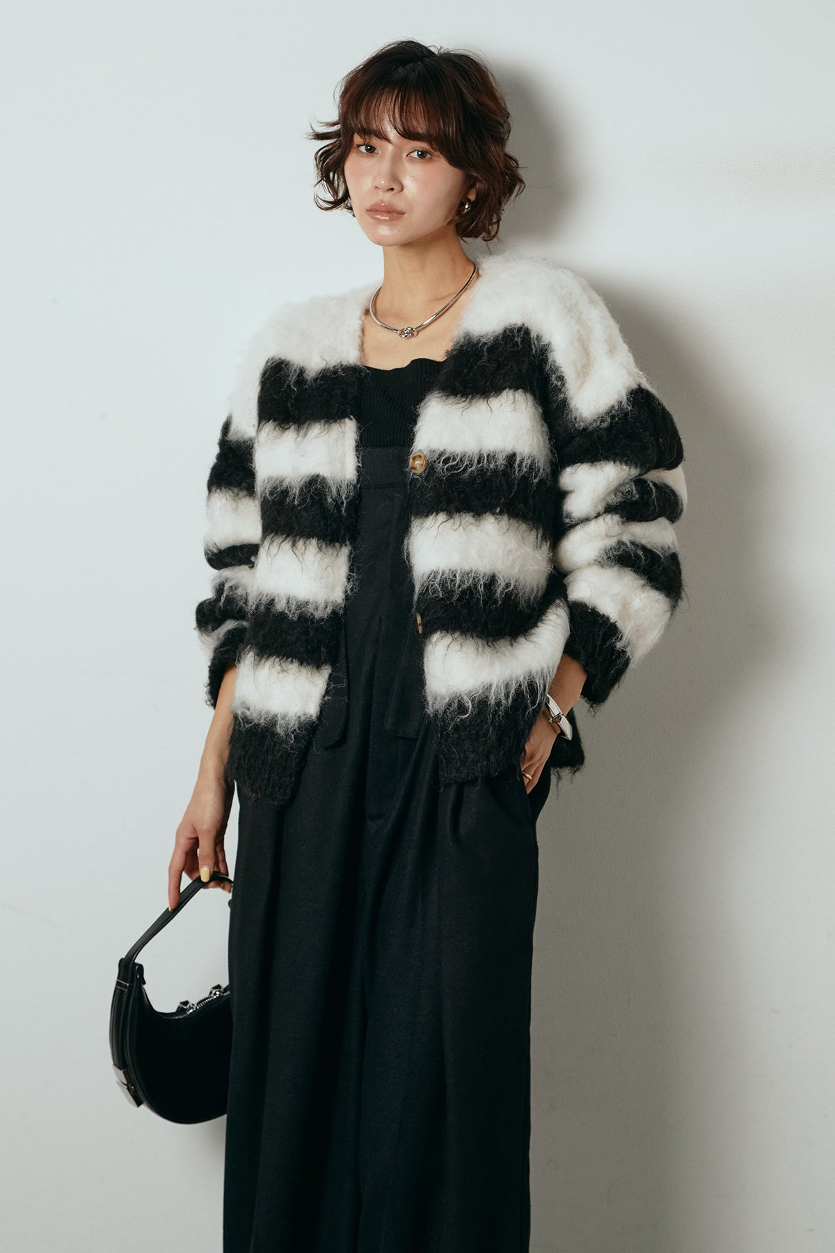 ふんわりとしたシャギー素材に、淡く溶け合うボーダー柄をのせたニットカーディガン。柔らかな毛足が優しい表情を生み、軽く羽織るだけで季節感のあるスタイリングに仕上がります。コンパクトすぎない程よいシルエットで、ボトムを選ばず合わせやすいのも魅力。前を留めても開けてもバランスよく、コーディネートにさりげない華やかさを添える一枚です。