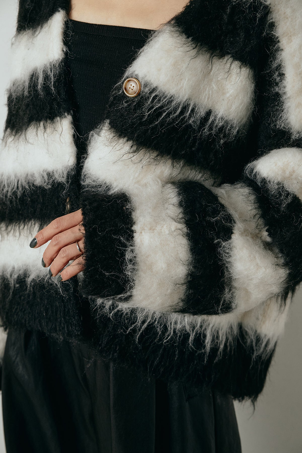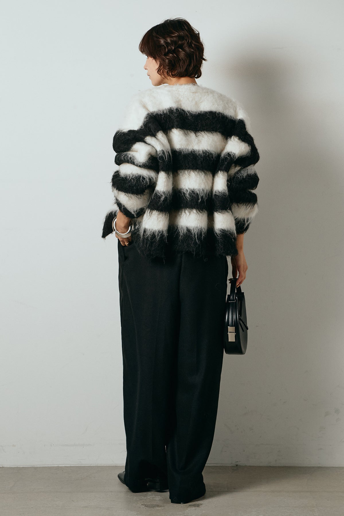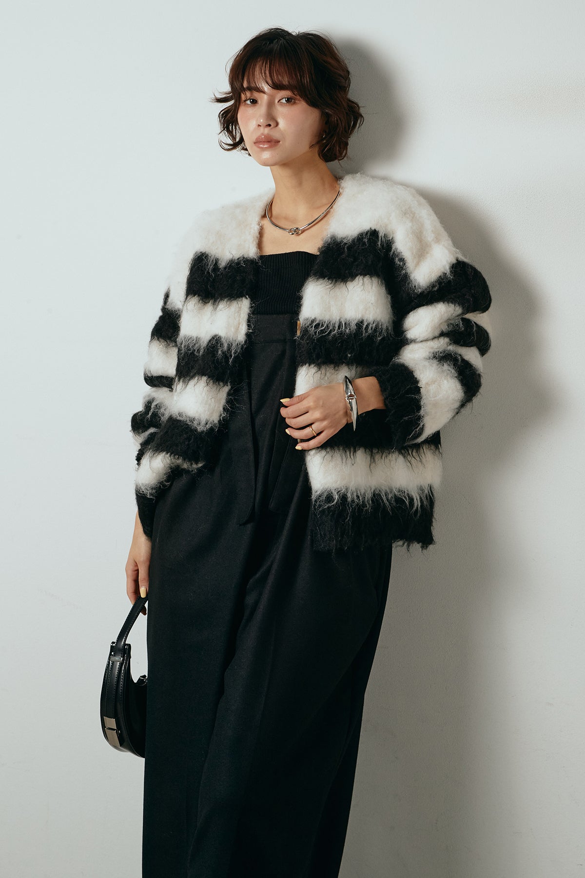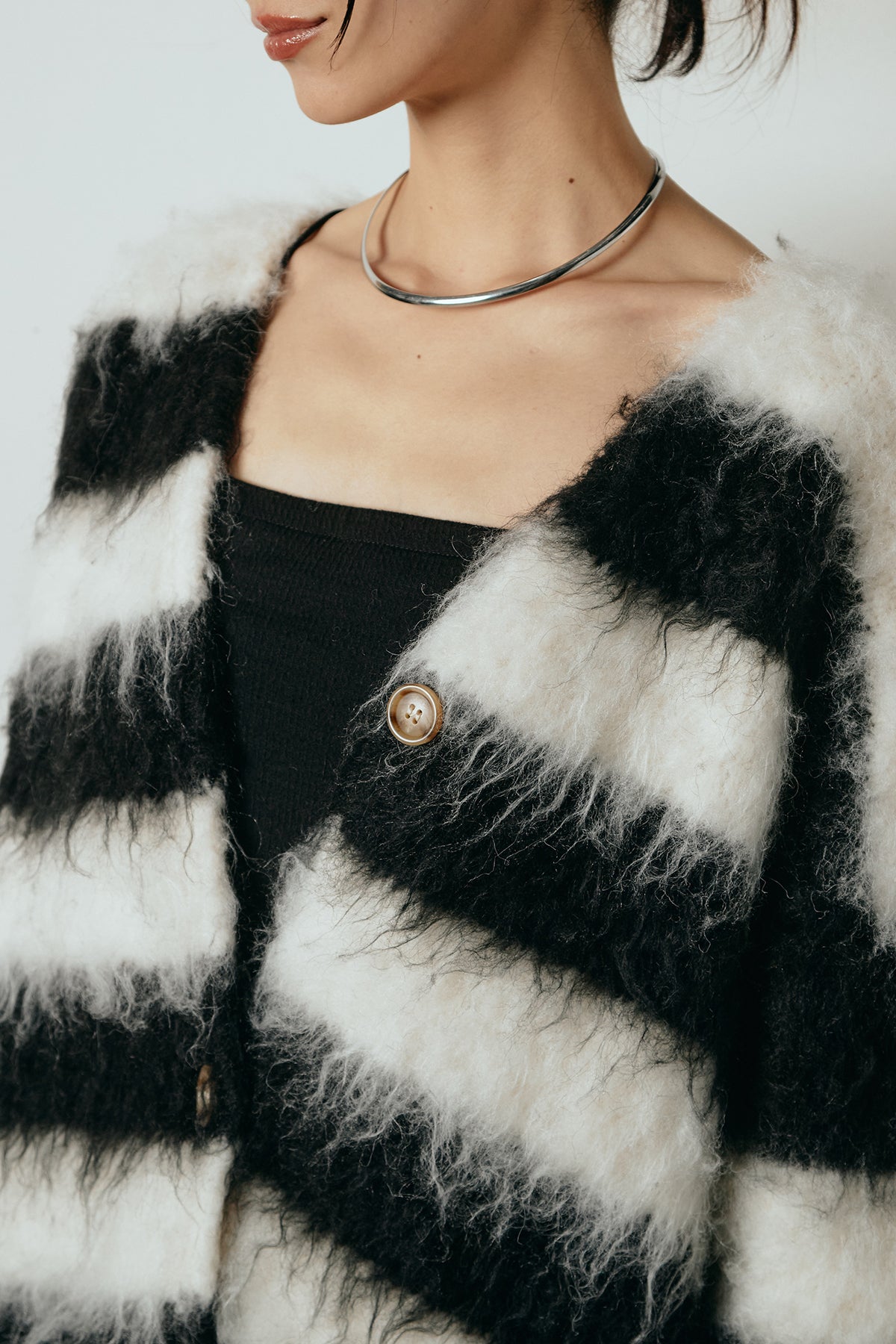 ふんわりとしたシャギー素材に、淡く溶け合うボーダー柄をのせたニットカーディガン。柔らかな毛足が優しい表情を生み、軽く羽織るだけで季節感のあるスタイリングに仕上がります。コンパクトすぎない程よいシルエットで、ボトムを選ばず合わせやすいのも魅力。前を留めても開けてもバランスよく、コーディネートにさりげない華やかさを添える一枚です。