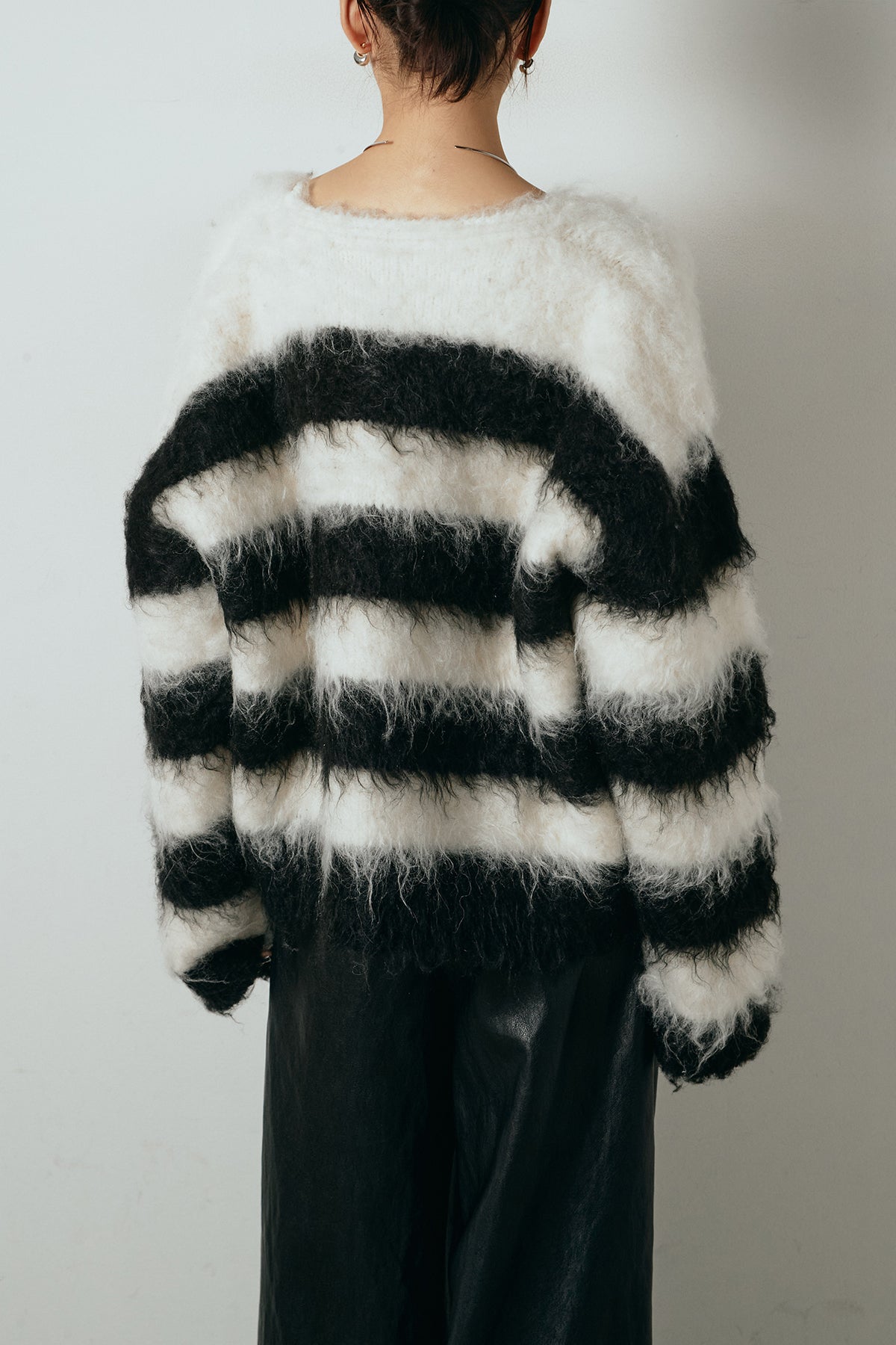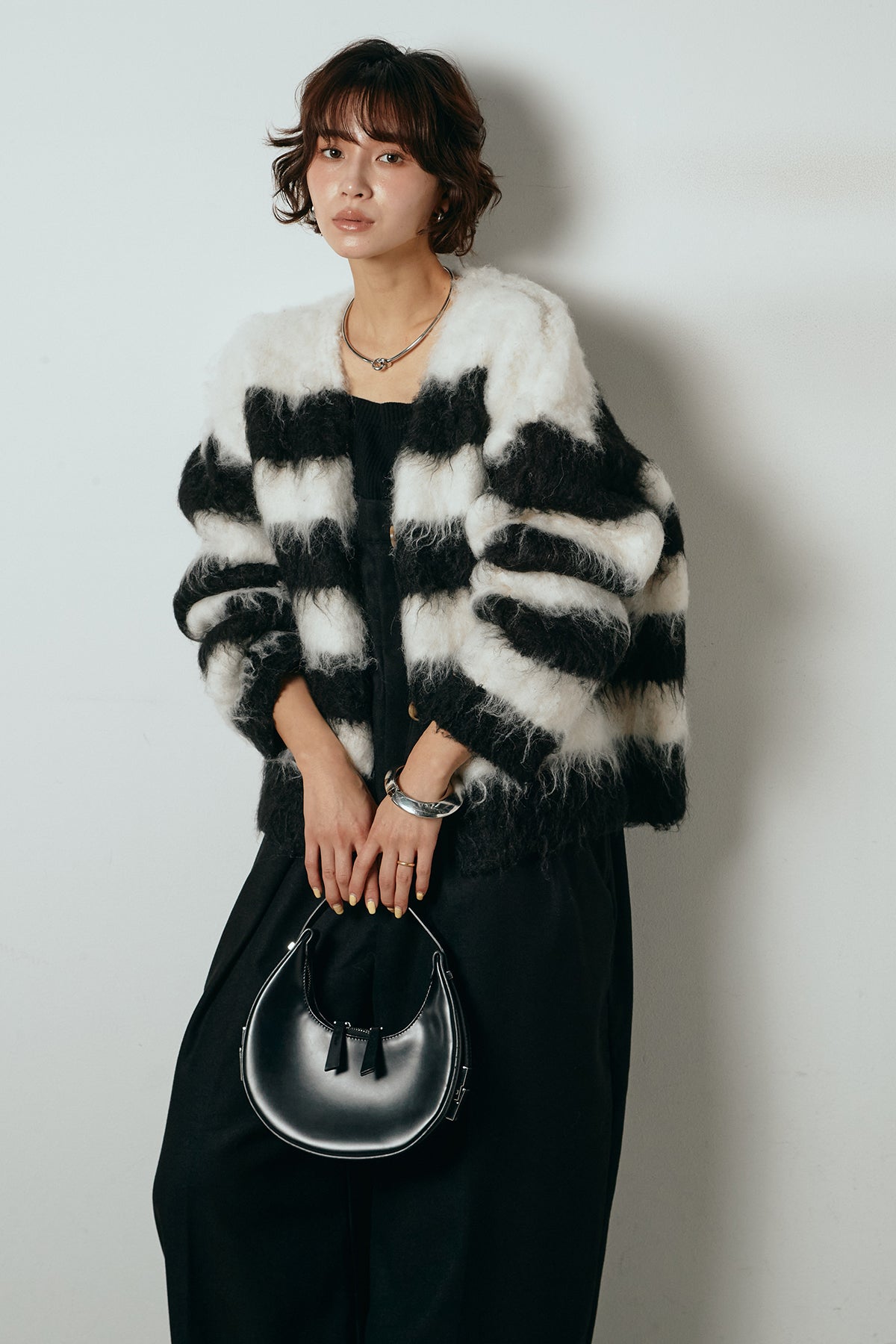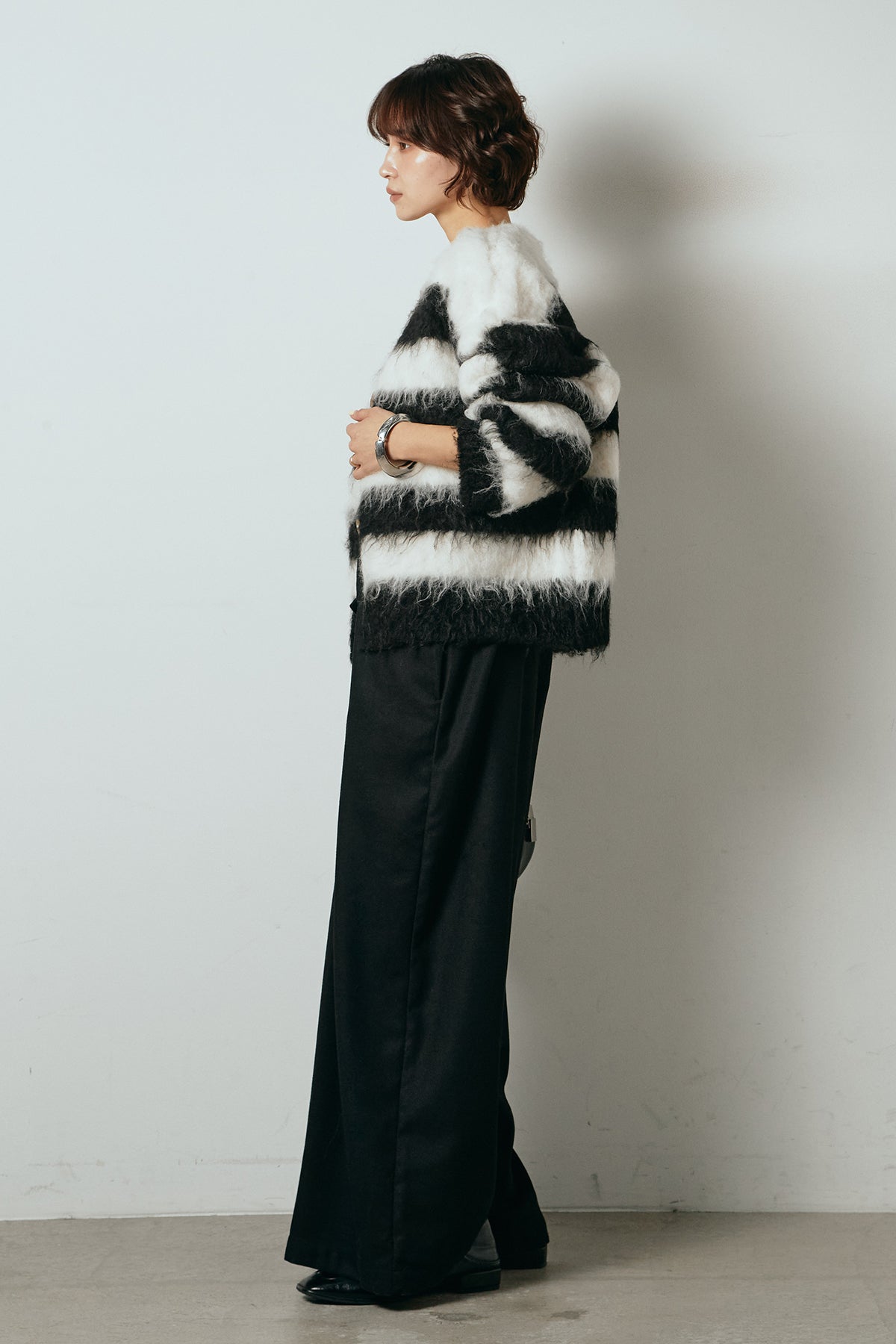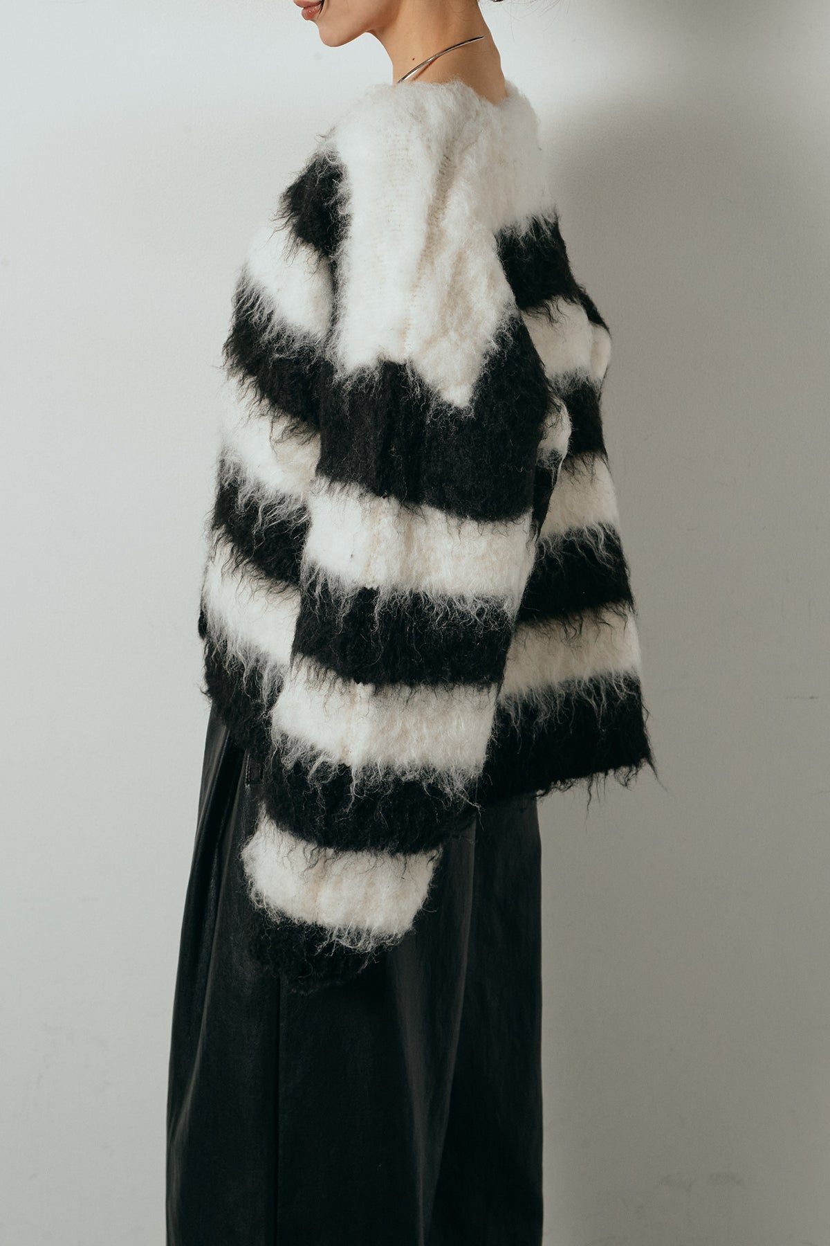 ふんわりとしたシャギー素材に、淡く溶け合うボーダー柄をのせたニットカーディガン。柔らかな毛足が優しい表情を生み、軽く羽織るだけで季節感のあるスタイリングに仕上がります。コンパクトすぎない程よいシルエットで、ボトムを選ばず合わせやすいのも魅力。前を留めても開けてもバランスよく、コーディネートにさりげない華やかさを添える一枚です。