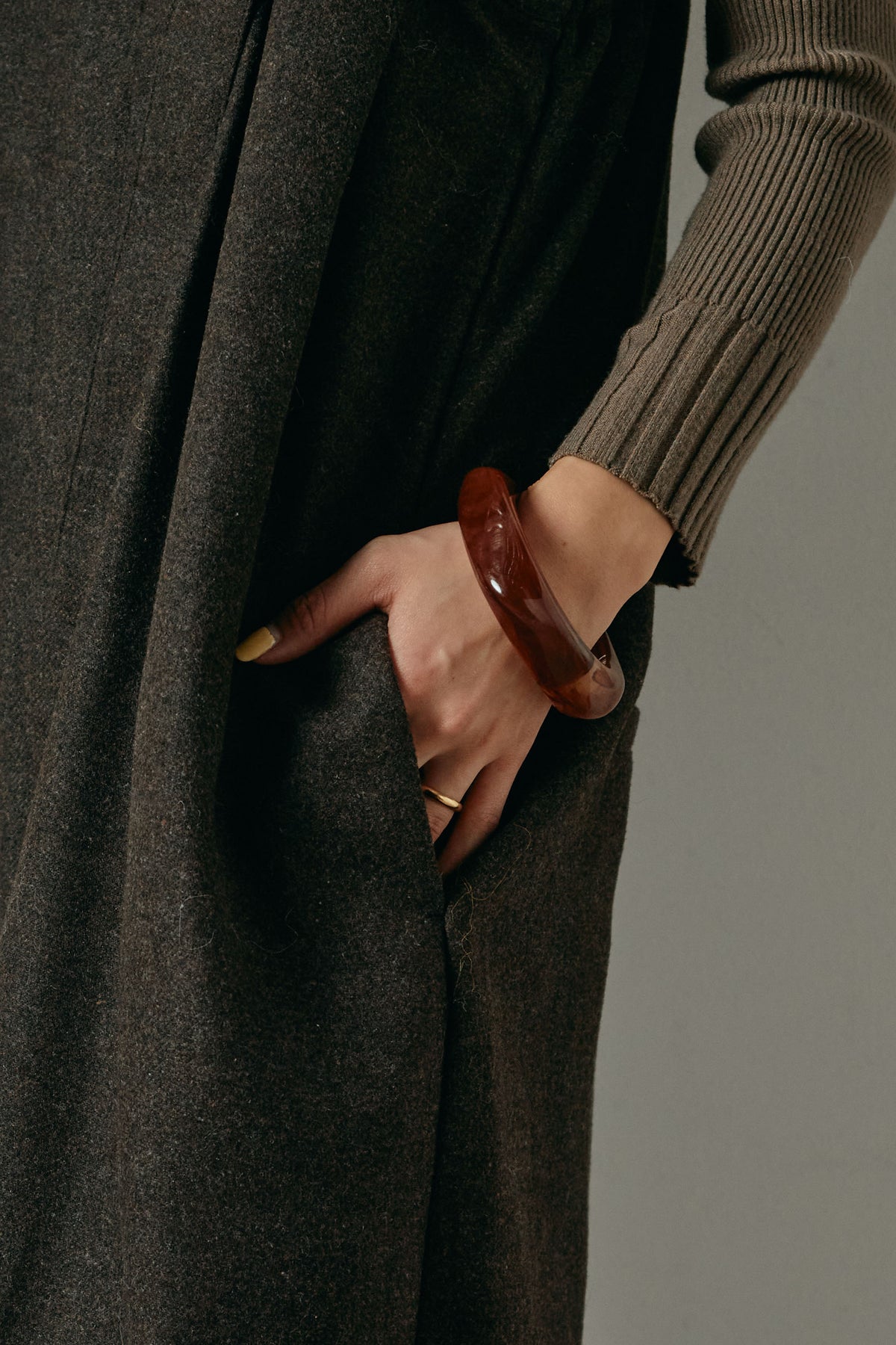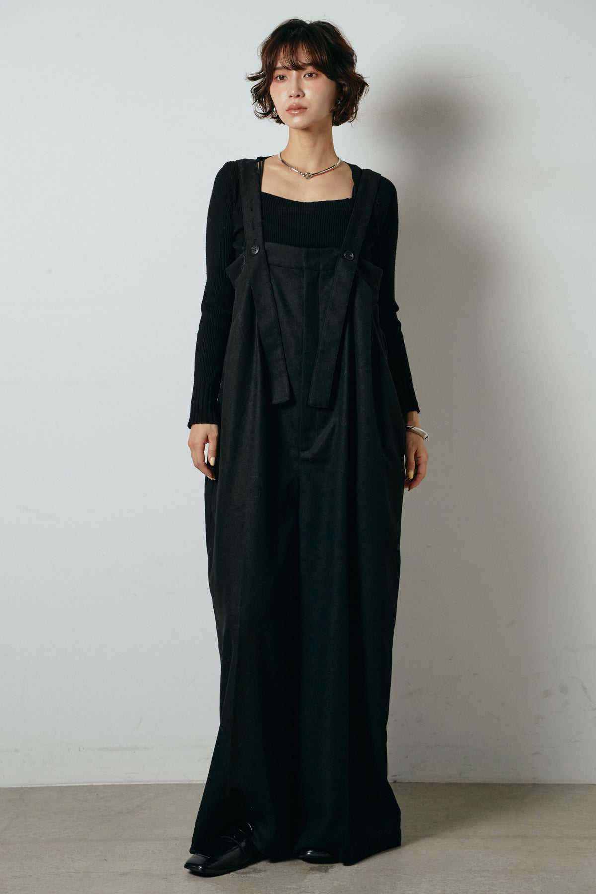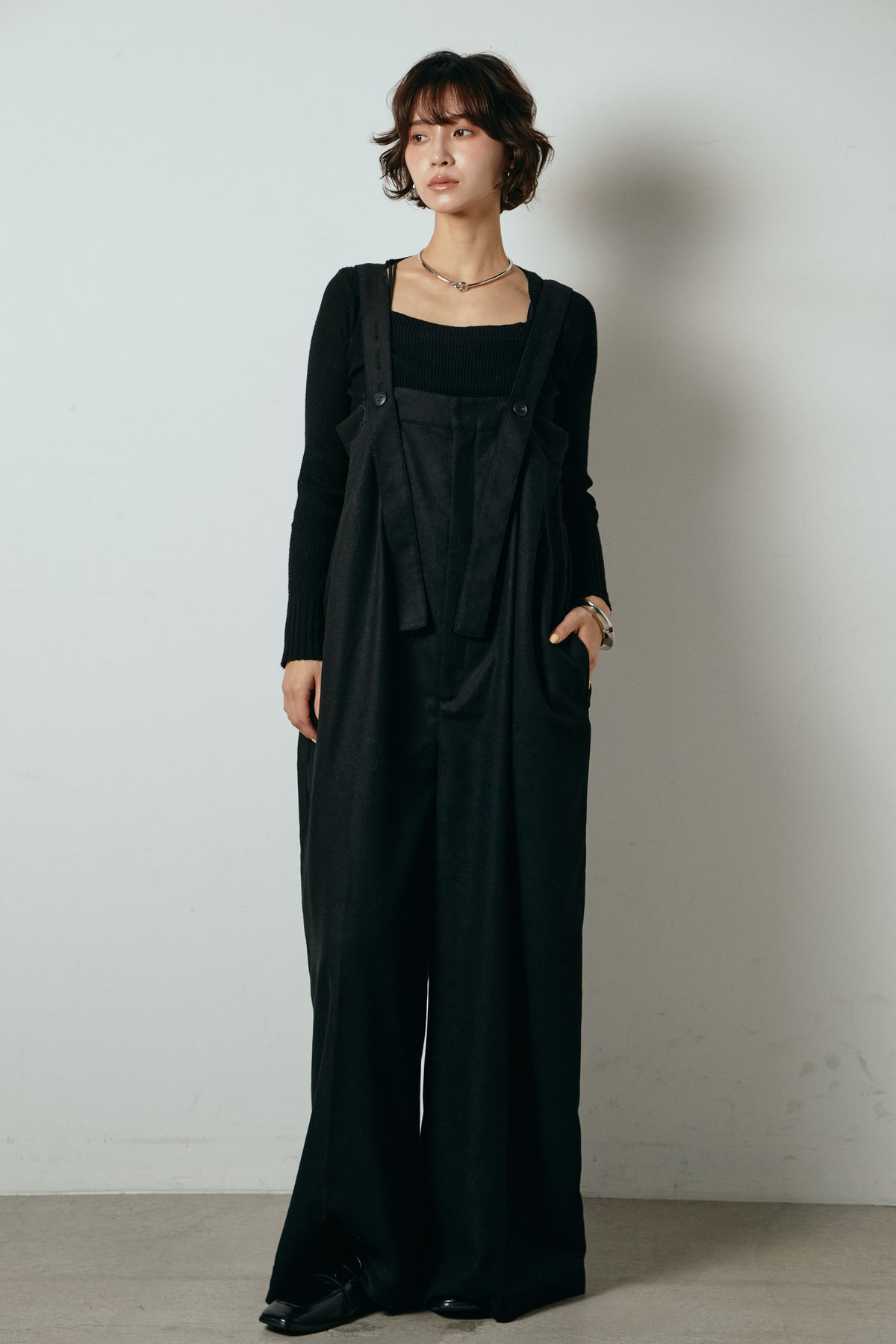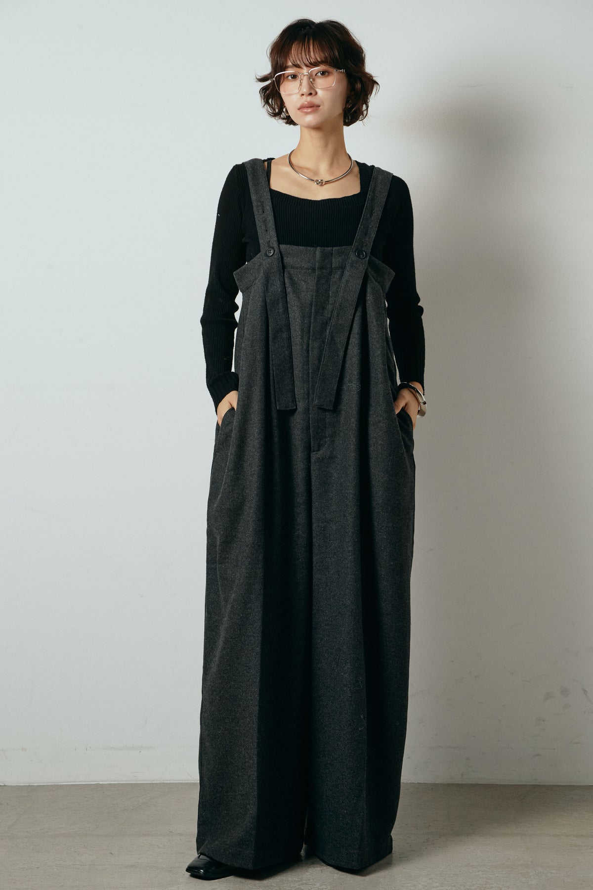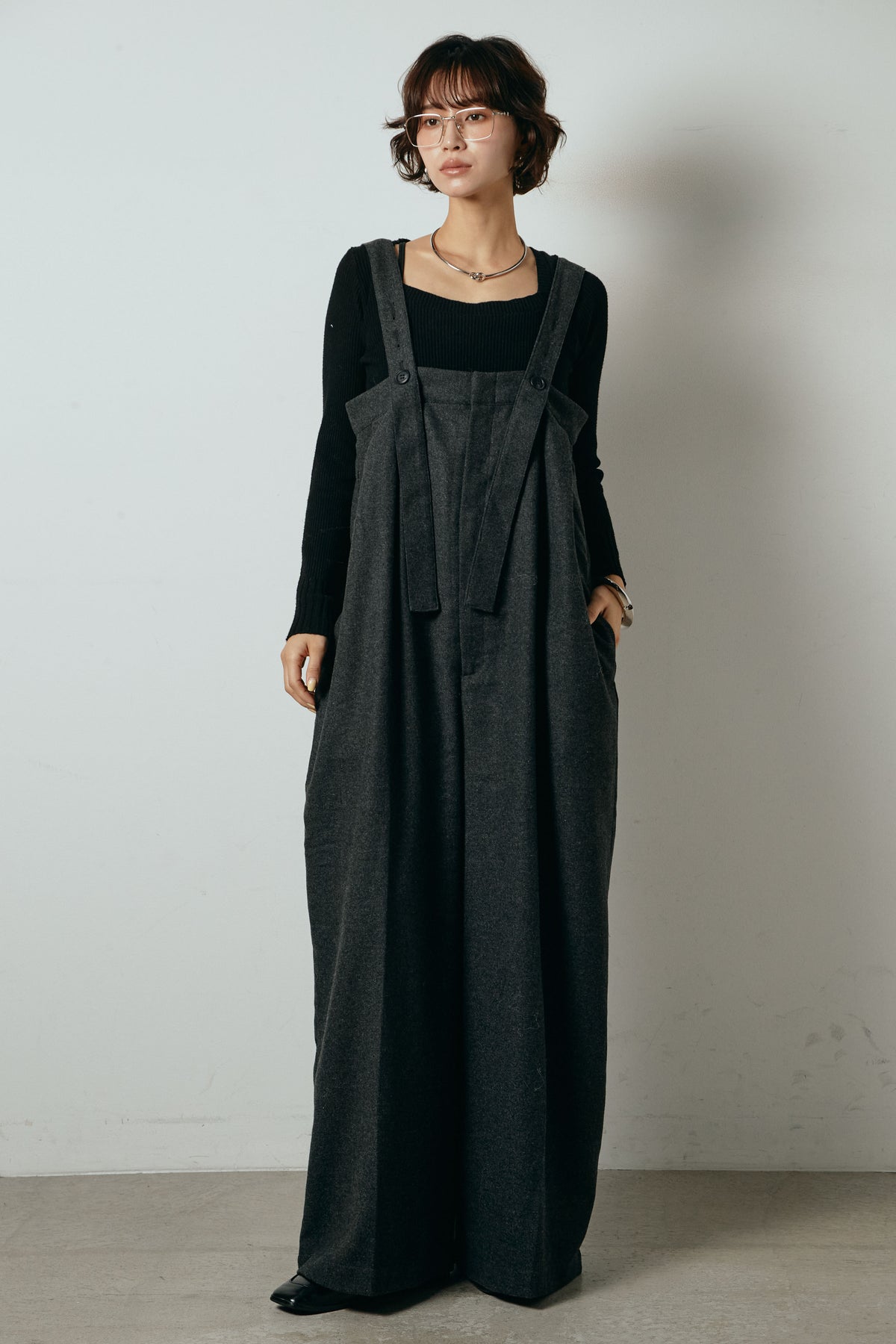 ウール混のフランネル素材で仕立てた、あたたかみのあるワイドシルエットのサロペット。落ち感のある生地が縦ラインをきれいに描き、リラックス感がありながらも大人っぽい印象に仕上げています。太めのストラップとフロントのタックがさりげないアクセントになり、インナー次第で表情を変えられるのも魅力。ニットやカットソーを合わせて、季節感のあるレイヤードを楽しめる一着です。