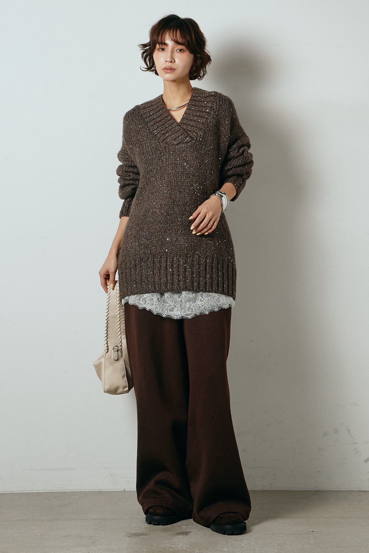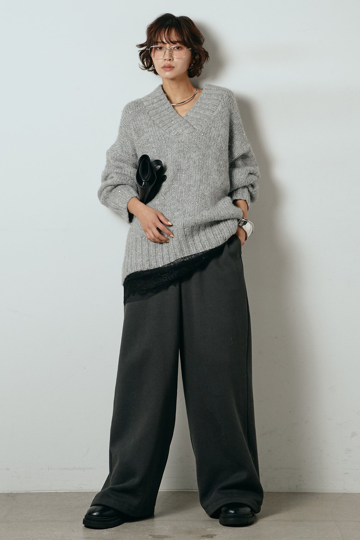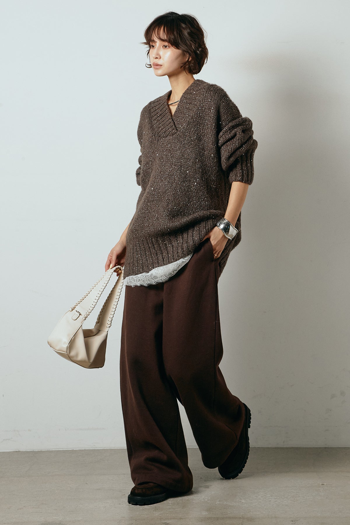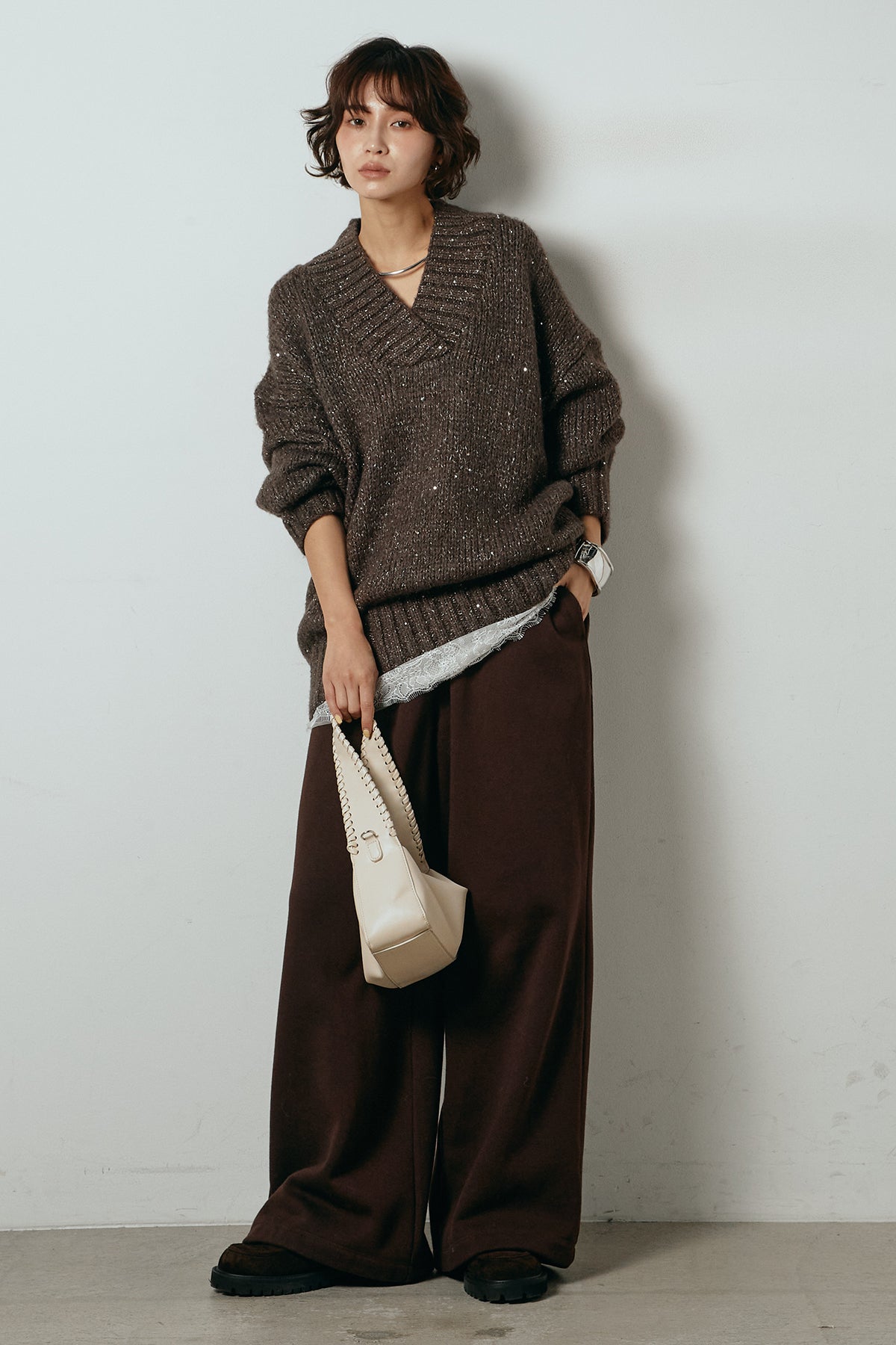 [SET]Vネックラメニットトップス+裏起毛スウェットワイドパンツ(2set)