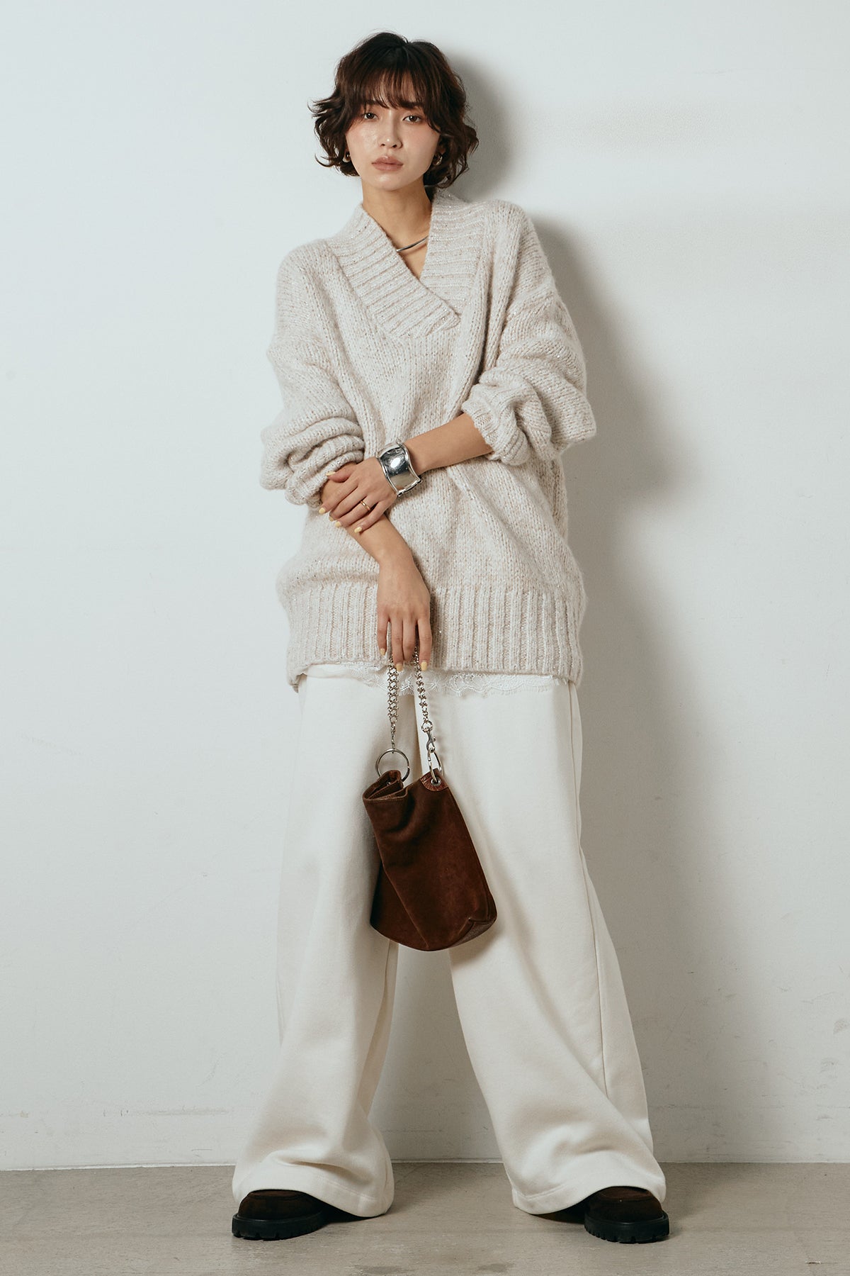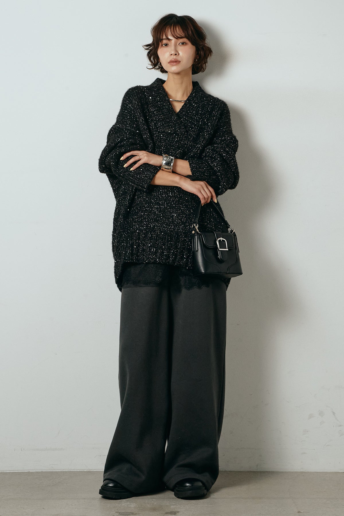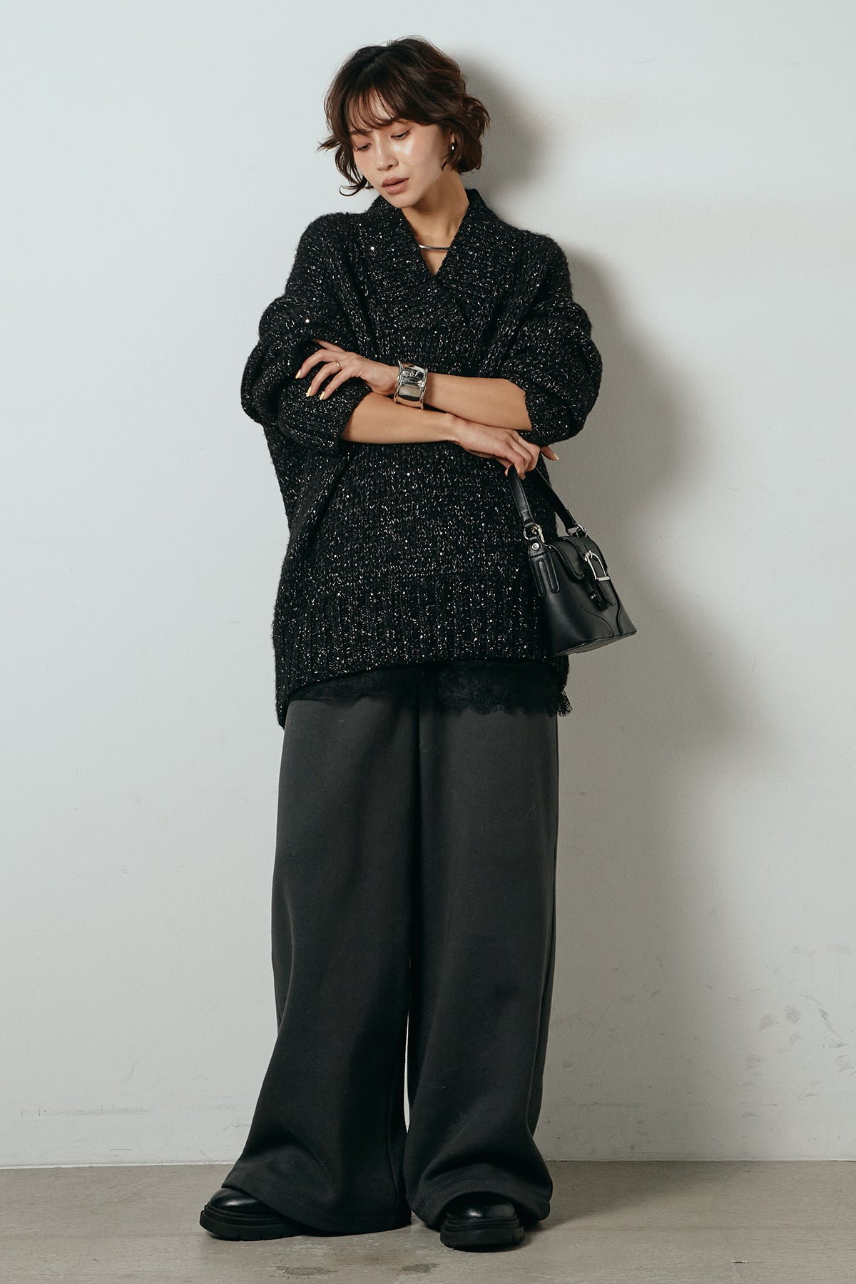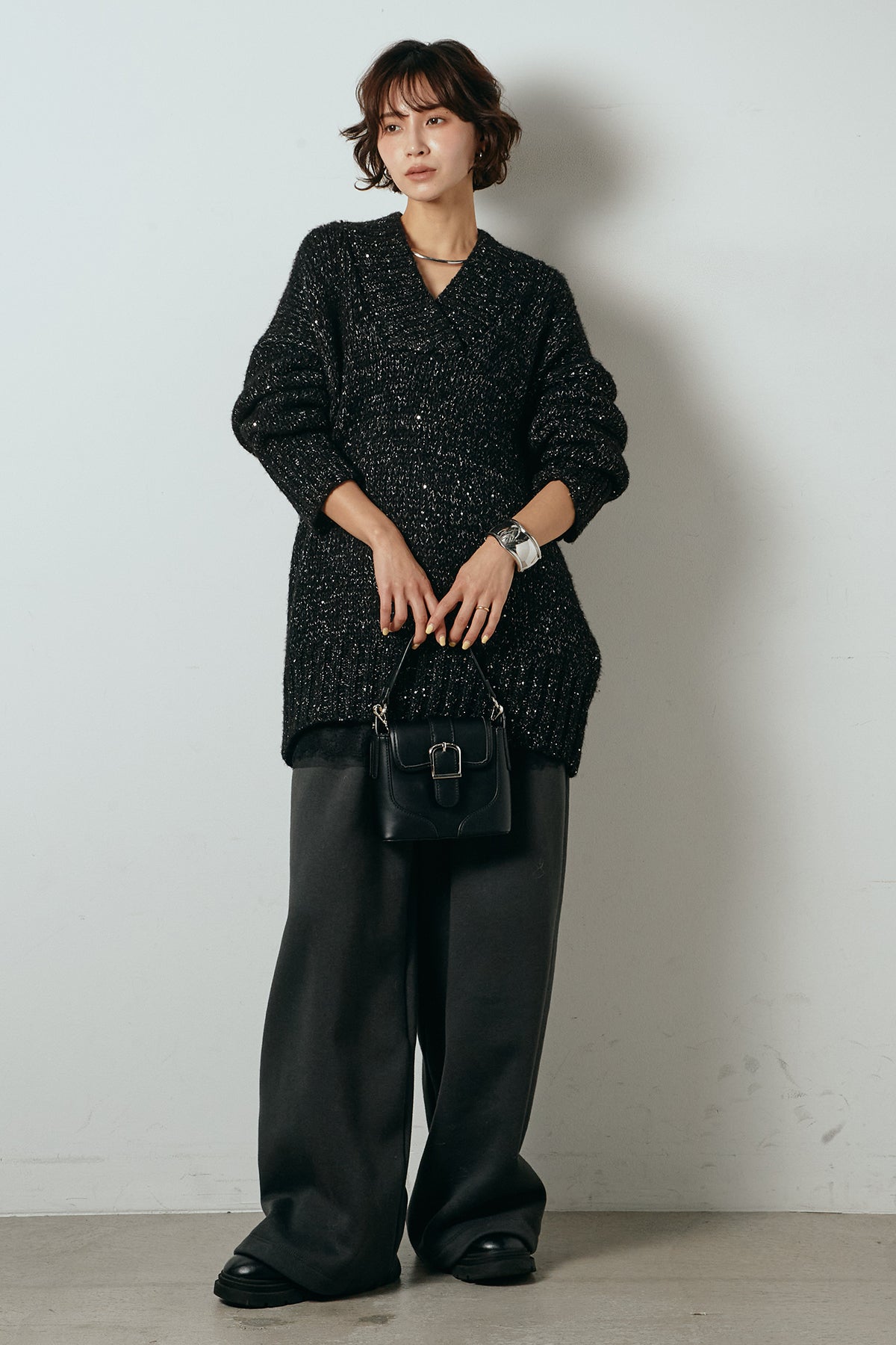 [SET]Vネックラメニットトップス+裏起毛スウェットワイドパンツ(2set)