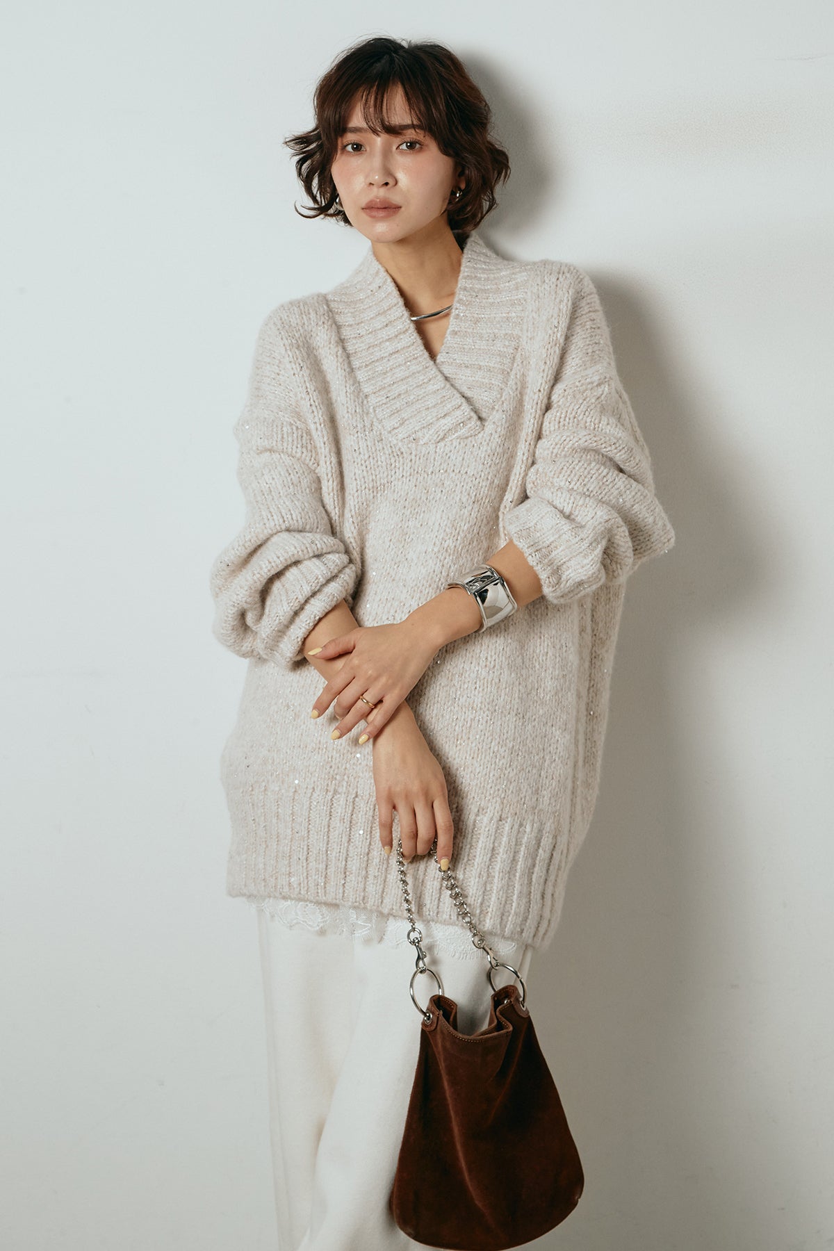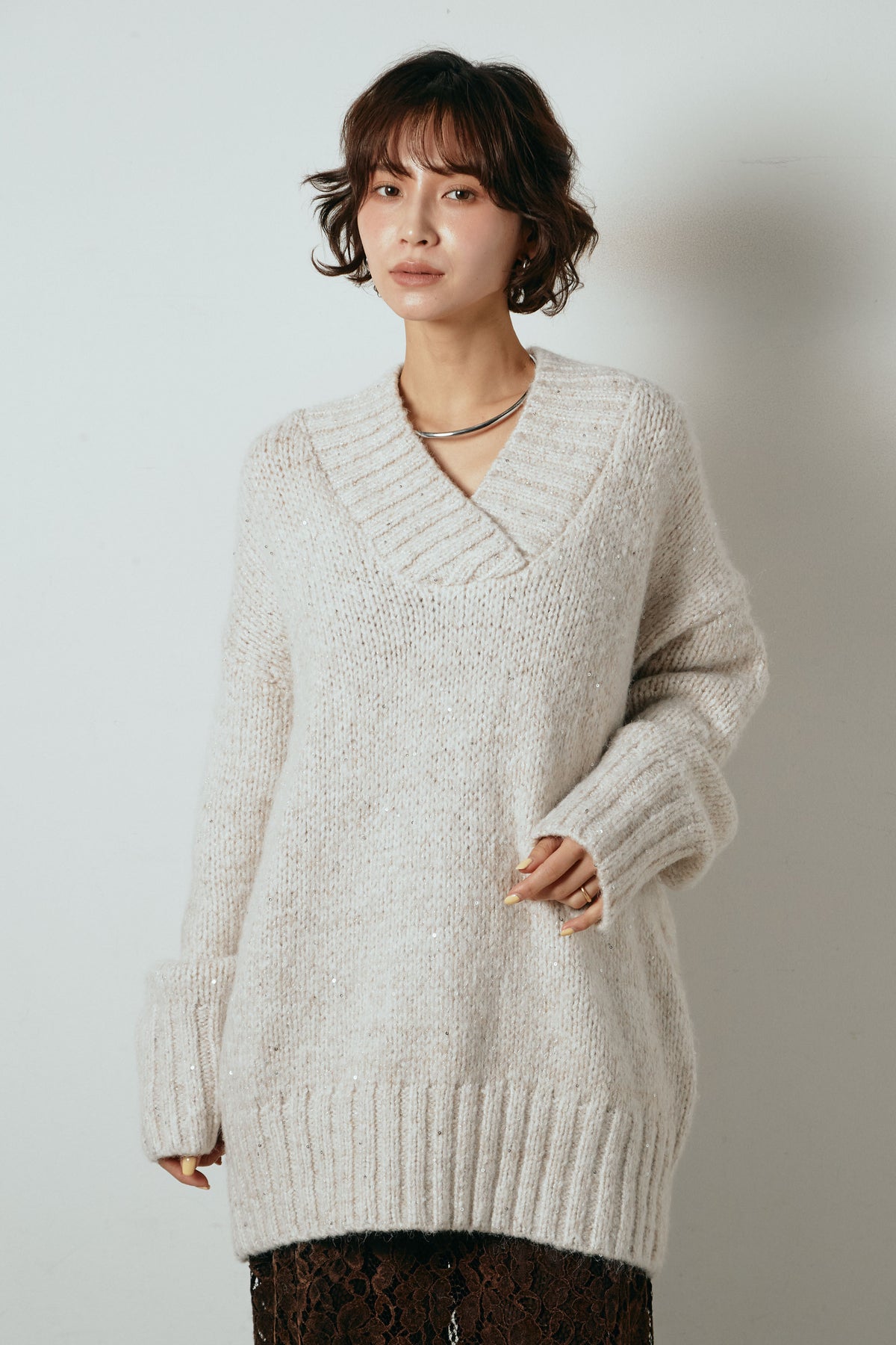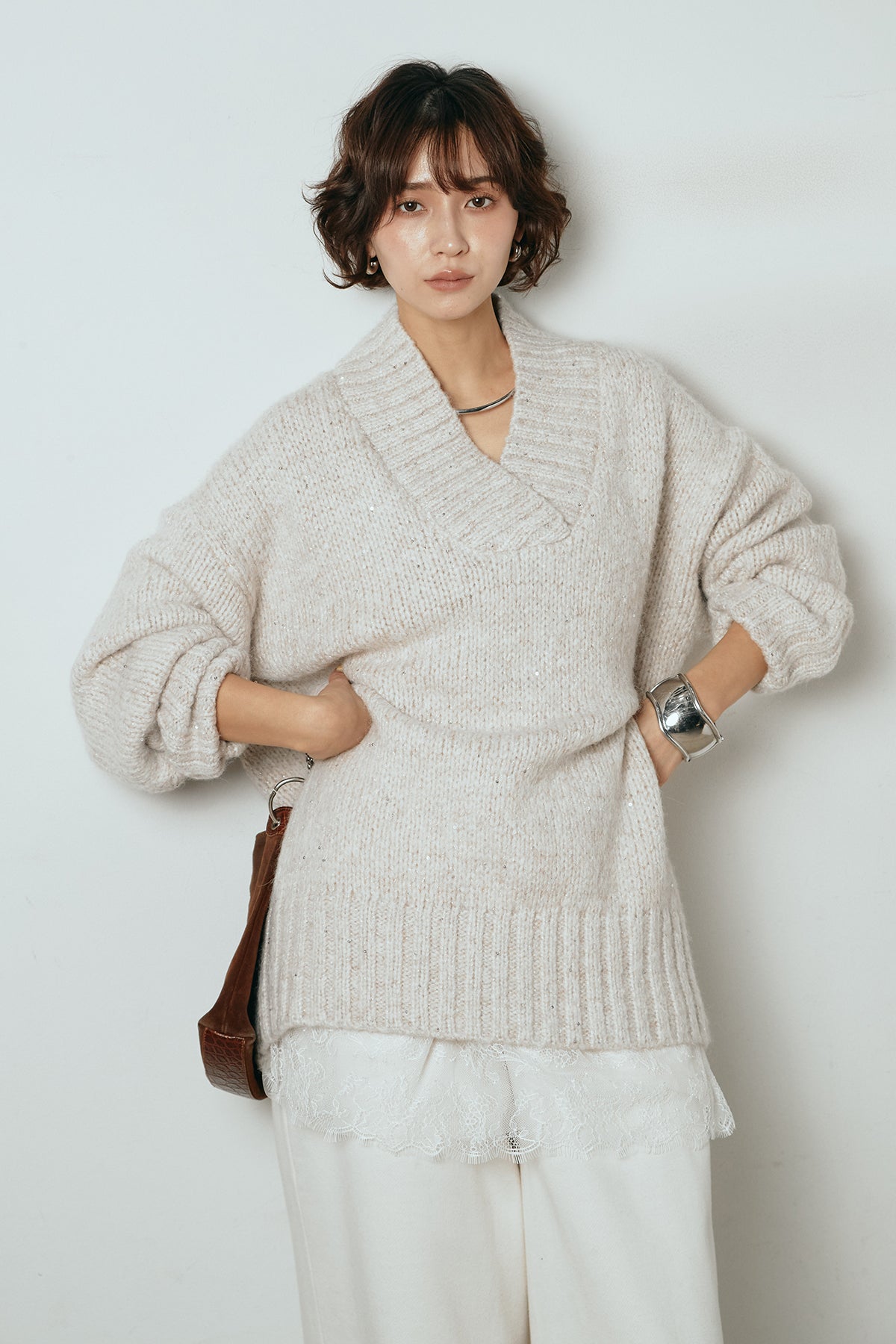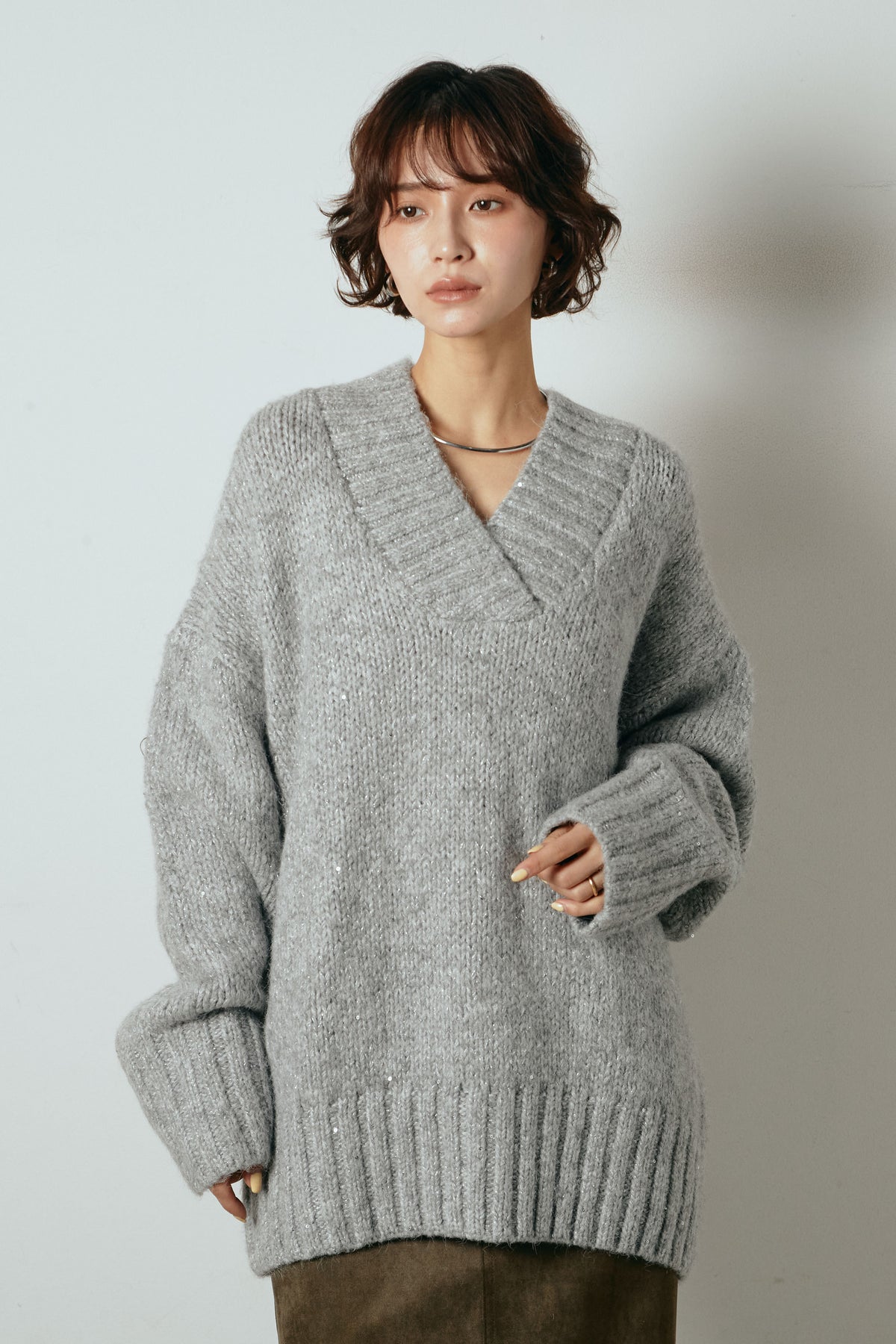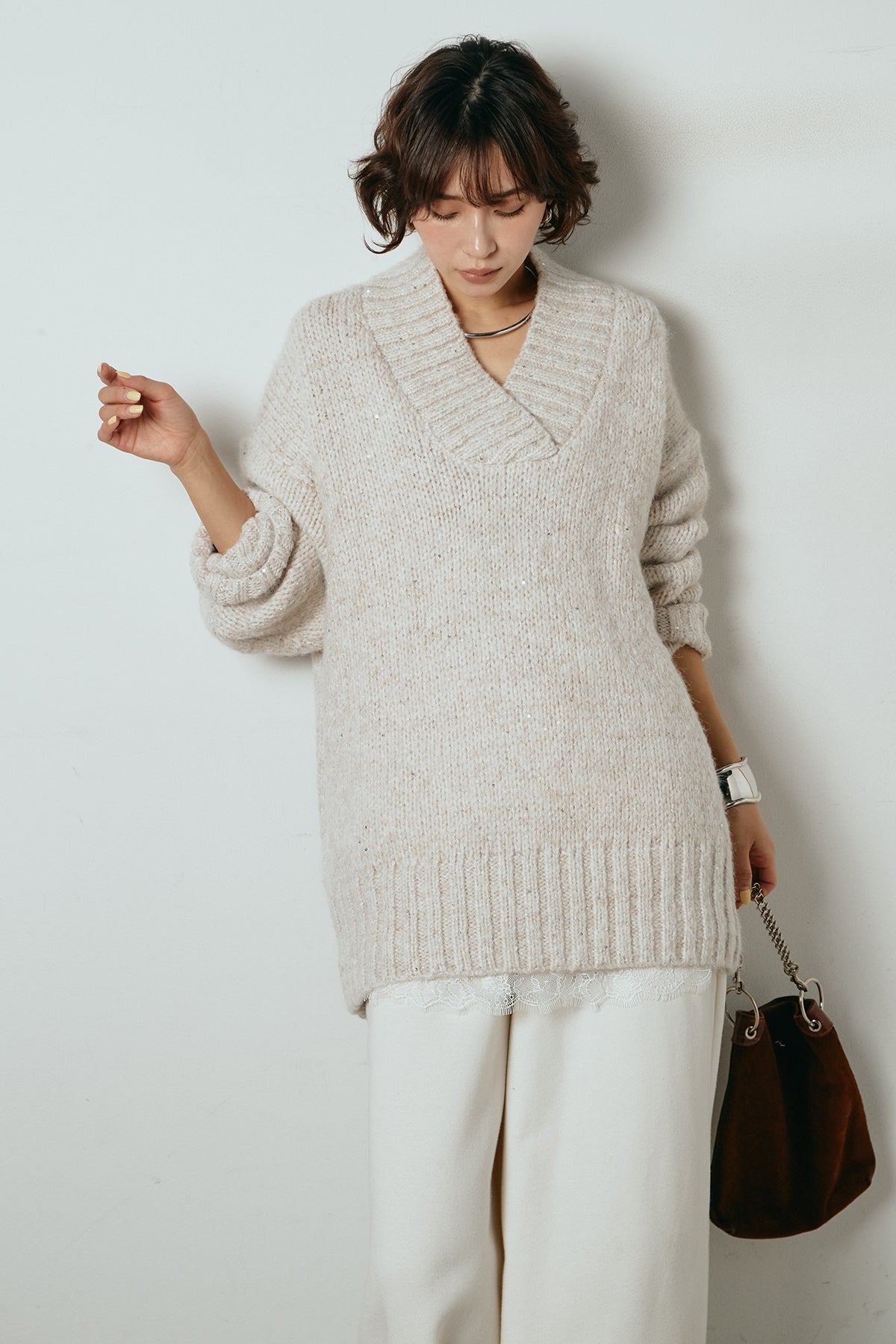 ラメ糸をさりげなく織り込んだ、上品な輝きが魅力のVネックニットトップス。程よくゆとりのあるシルエットと、広めに開いたVネックが顔まわりをすっきりと見せてくれます。リブ編みを効かせたネックラインと袖口が全体を引き締め、ラフになりすぎないバランスに。パンツにもスカートにも合わせやすく、シンプルながら華やかさを添える一枚です。
