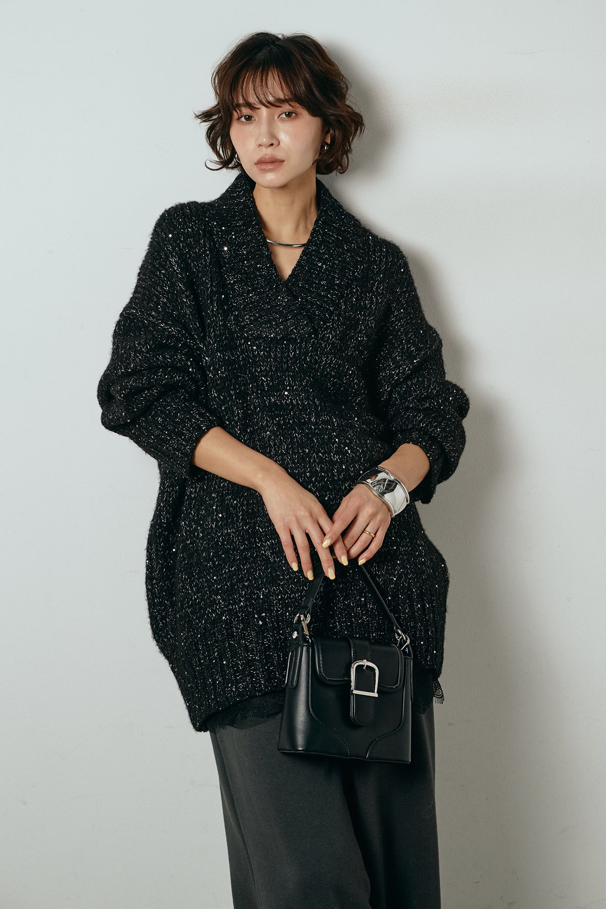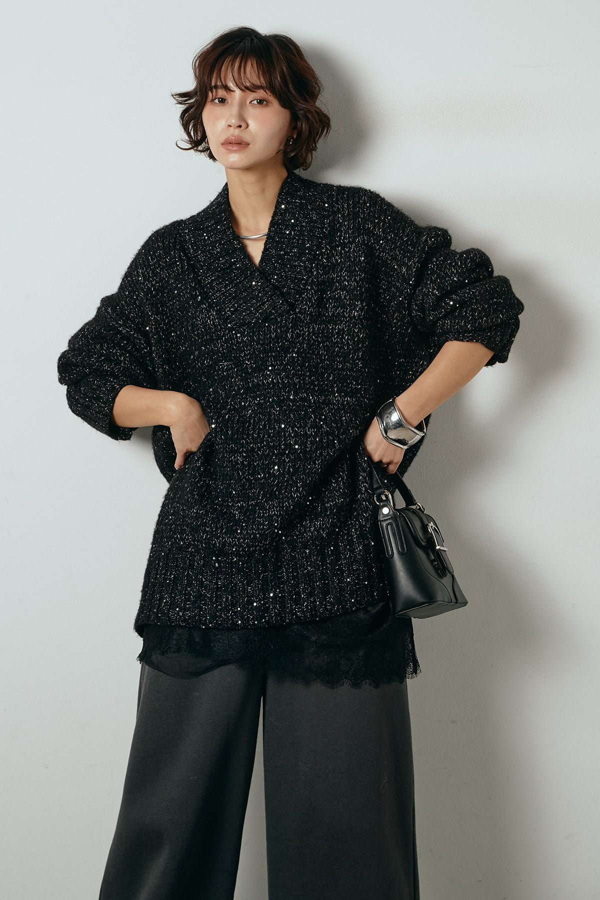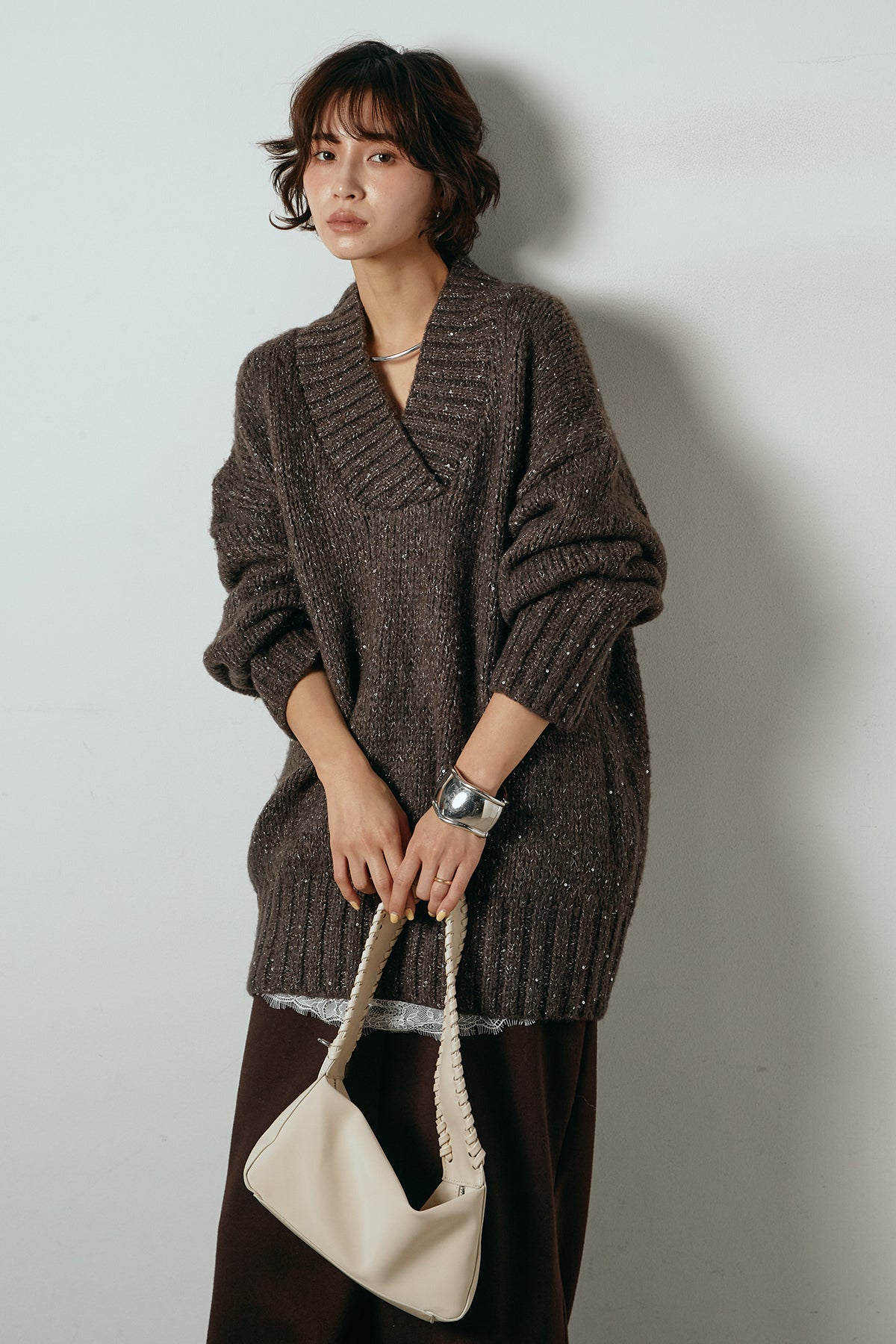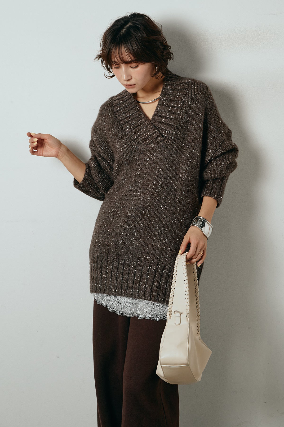 ラメ糸をさりげなく織り込んだ、上品な輝きが魅力のVネックニットトップス。程よくゆとりのあるシルエットと、広めに開いたVネックが顔まわりをすっきりと見せてくれます。リブ編みを効かせたネックラインと袖口が全体を引き締め、ラフになりすぎないバランスに。パンツにもスカートにも合わせやすく、シンプルながら華やかさを添える一枚です。