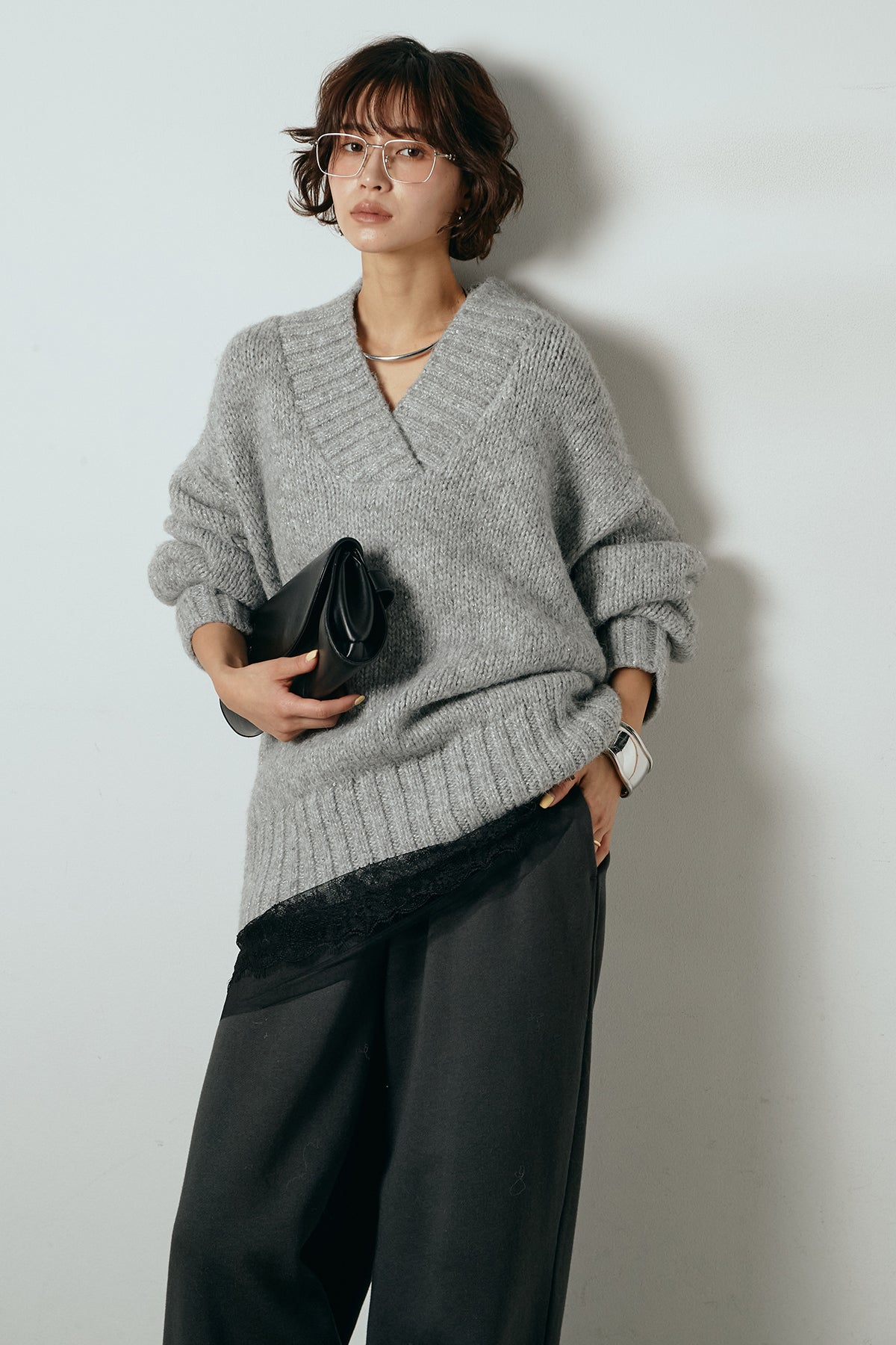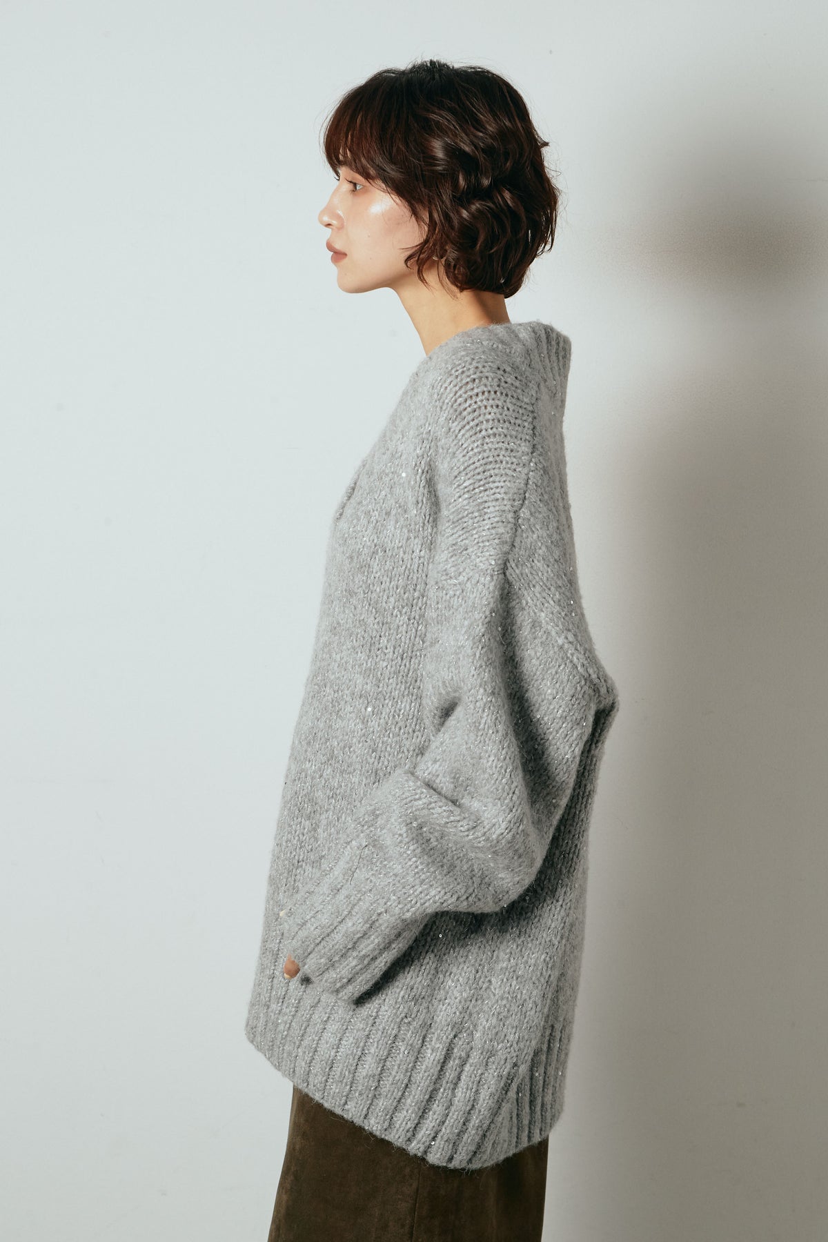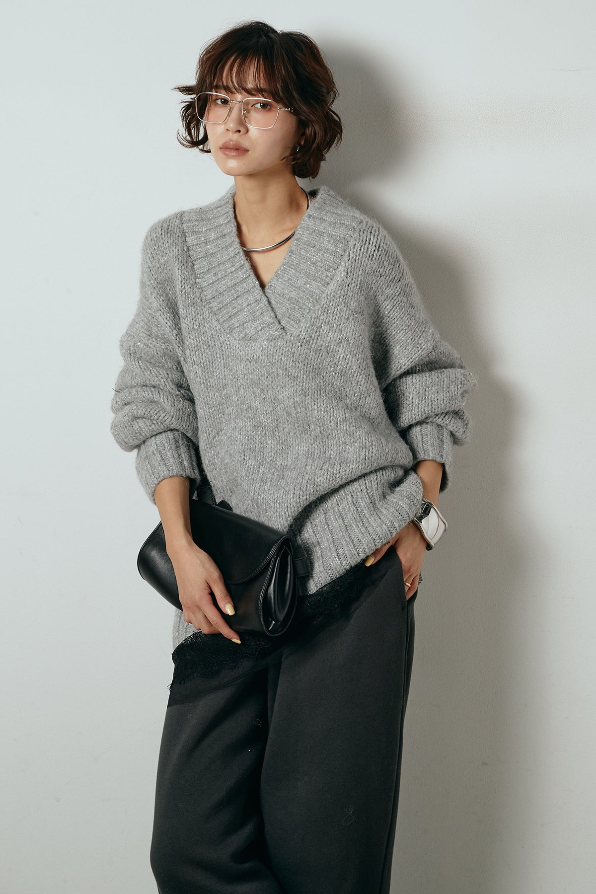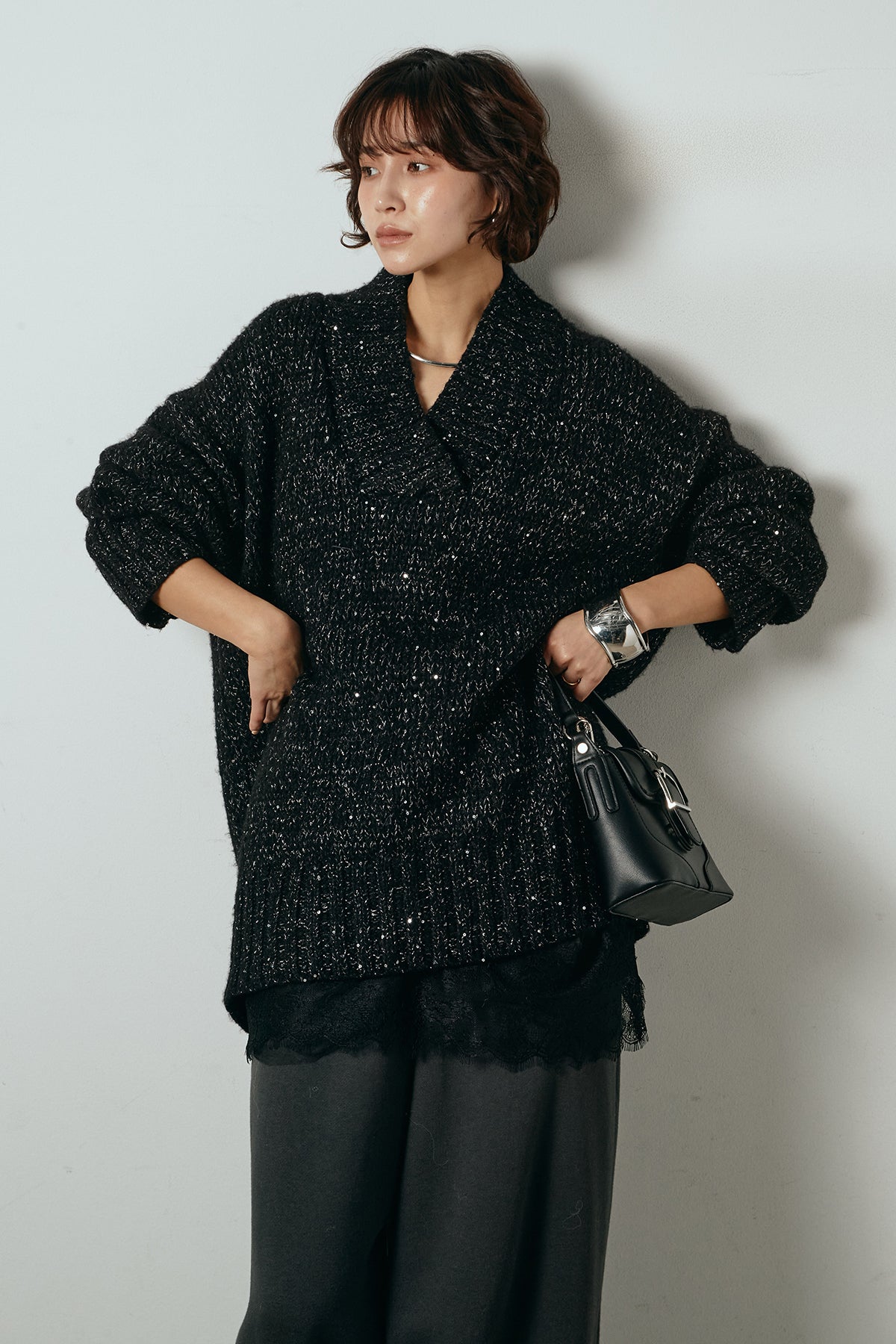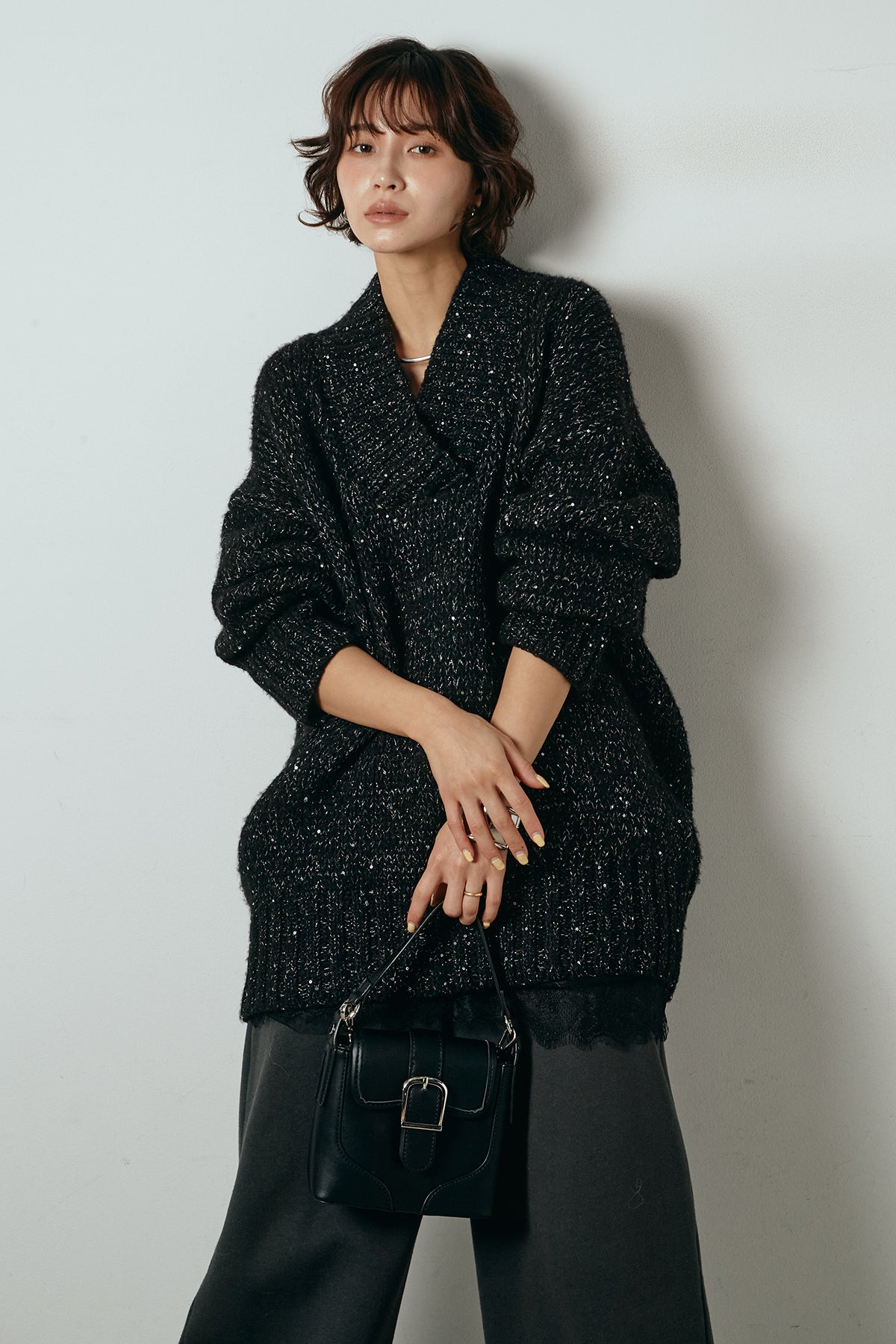 ラメ糸をさりげなく織り込んだ、上品な輝きが魅力のVネックニットトップス。程よくゆとりのあるシルエットと、広めに開いたVネックが顔まわりをすっきりと見せてくれます。リブ編みを効かせたネックラインと袖口が全体を引き締め、ラフになりすぎないバランスに。パンツにもスカートにも合わせやすく、シンプルながら華やかさを添える一枚です。