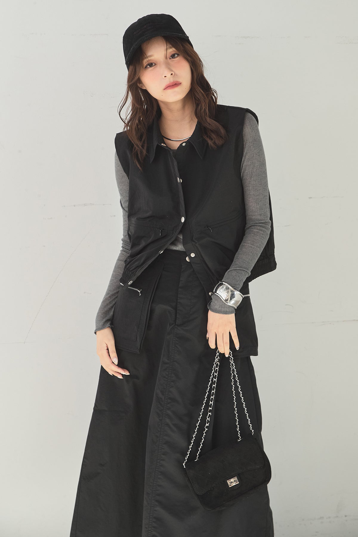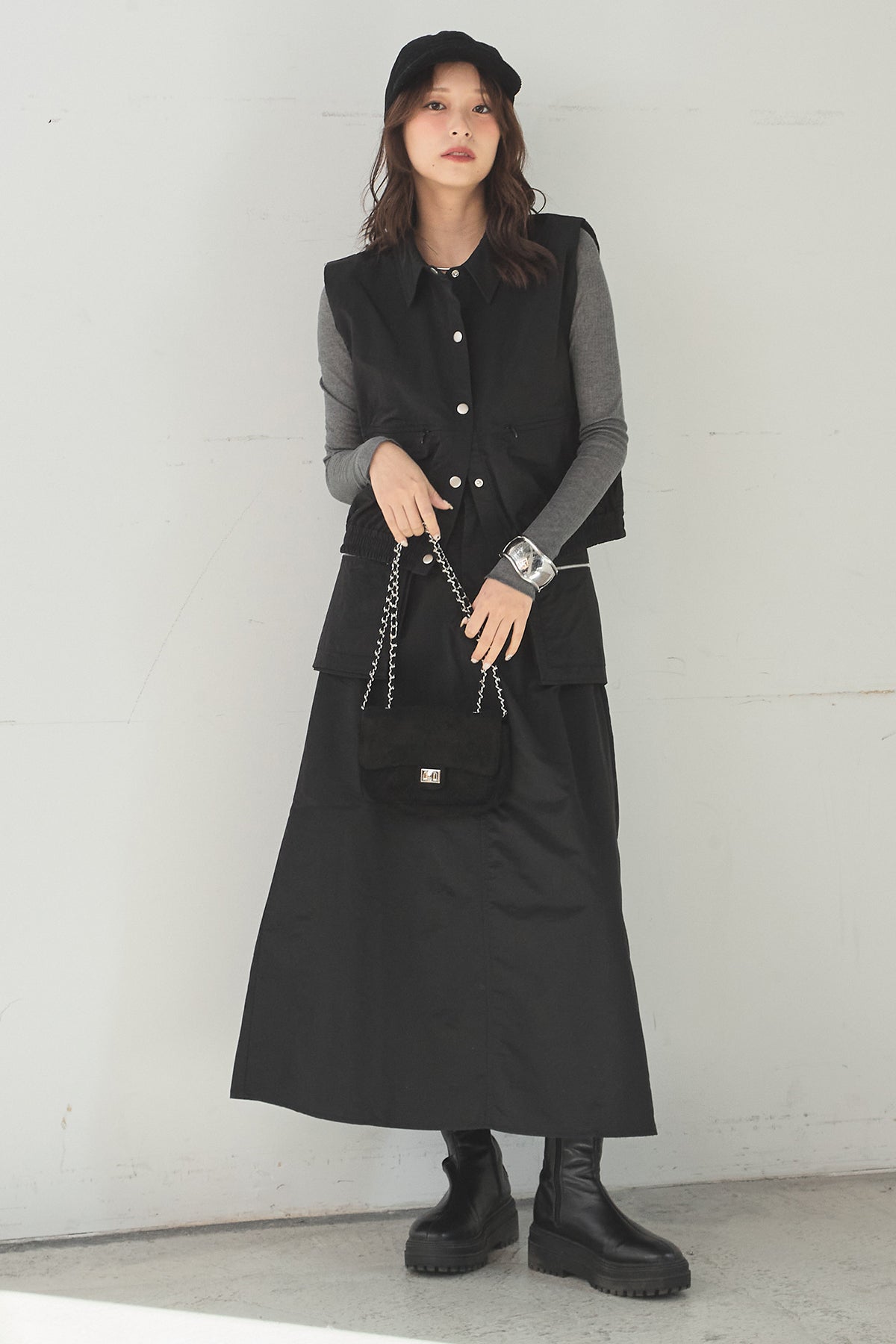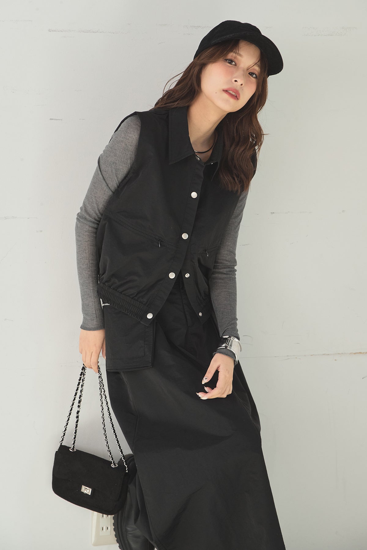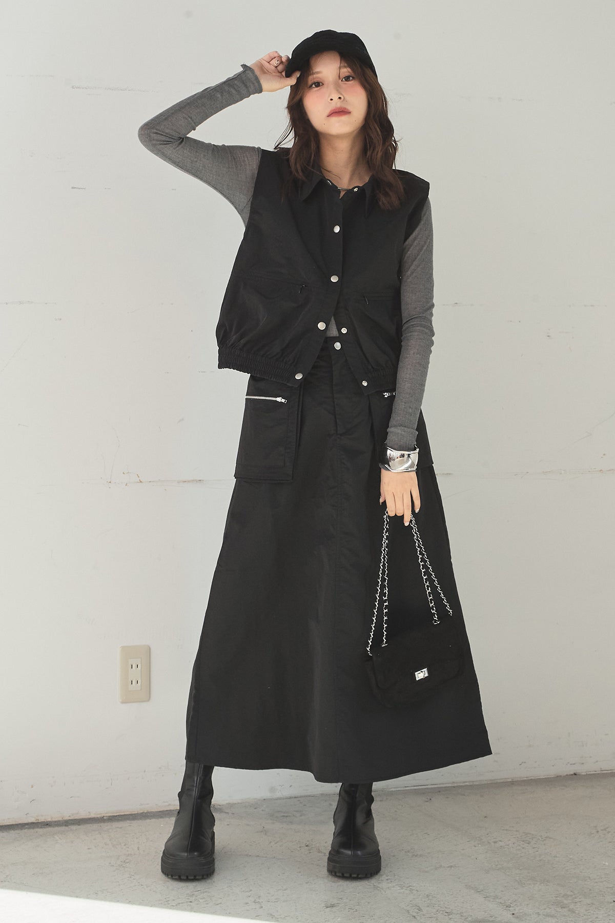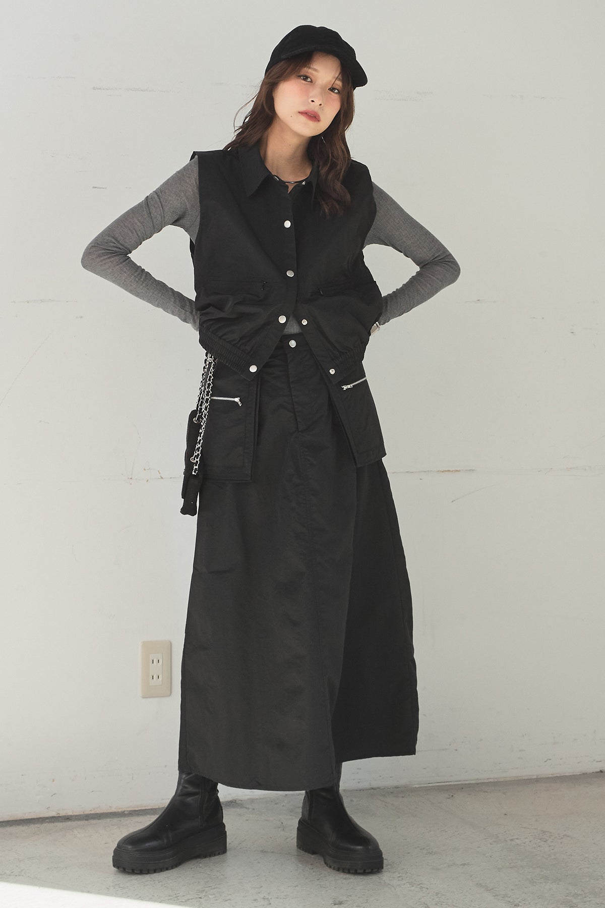 [SET]襟付きナイロンベスト+サイドデザインナイロンスカート+リブシアークルーネック長袖トップス(3set)