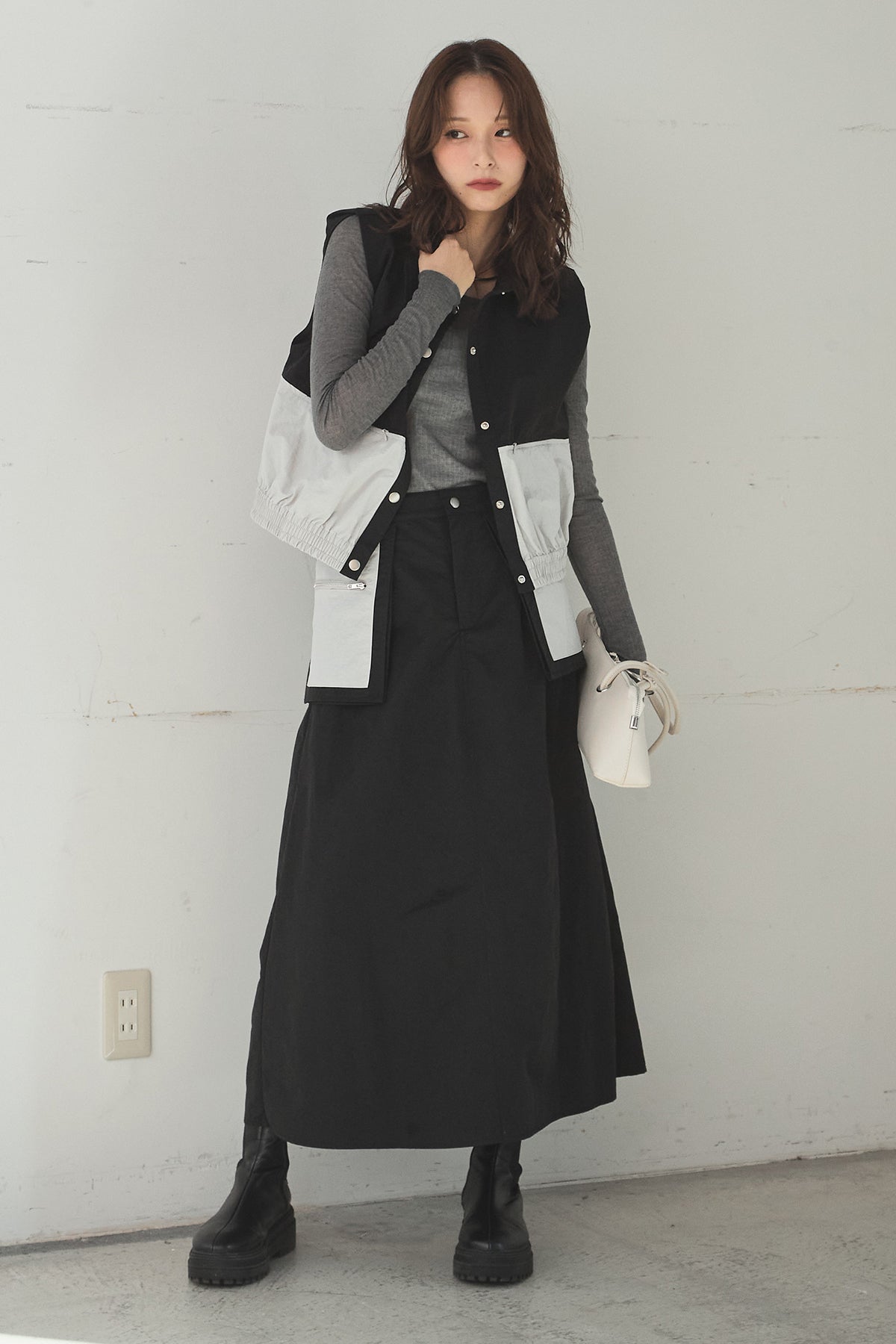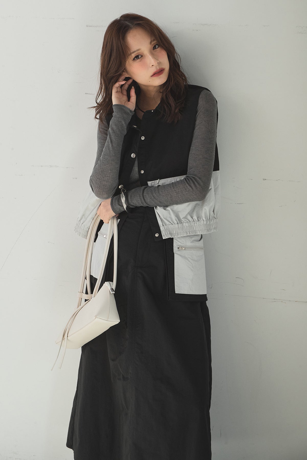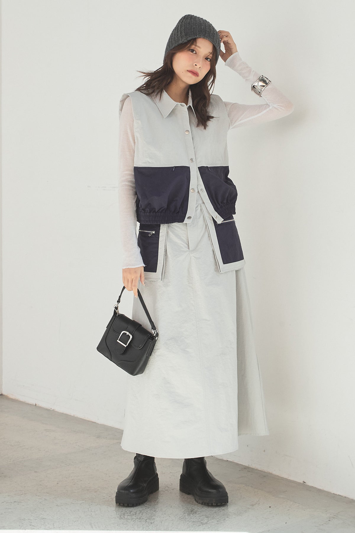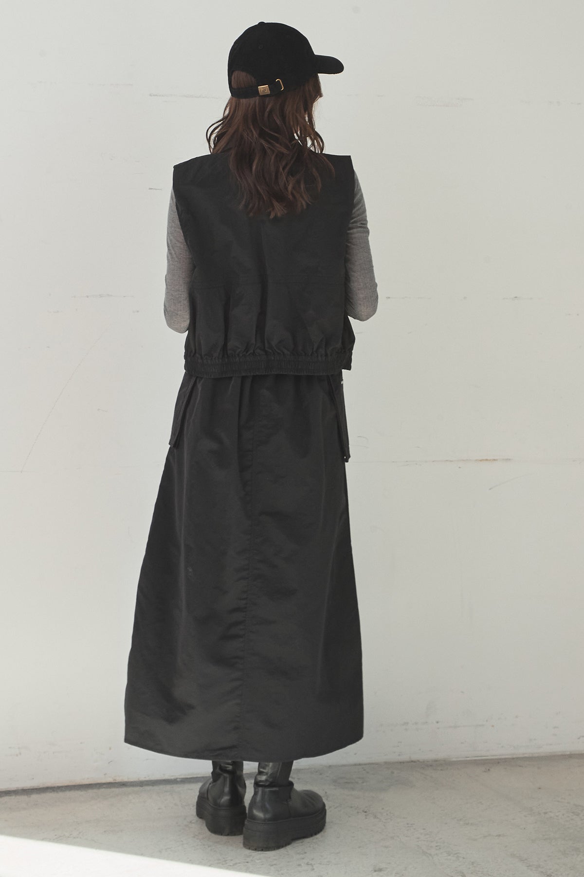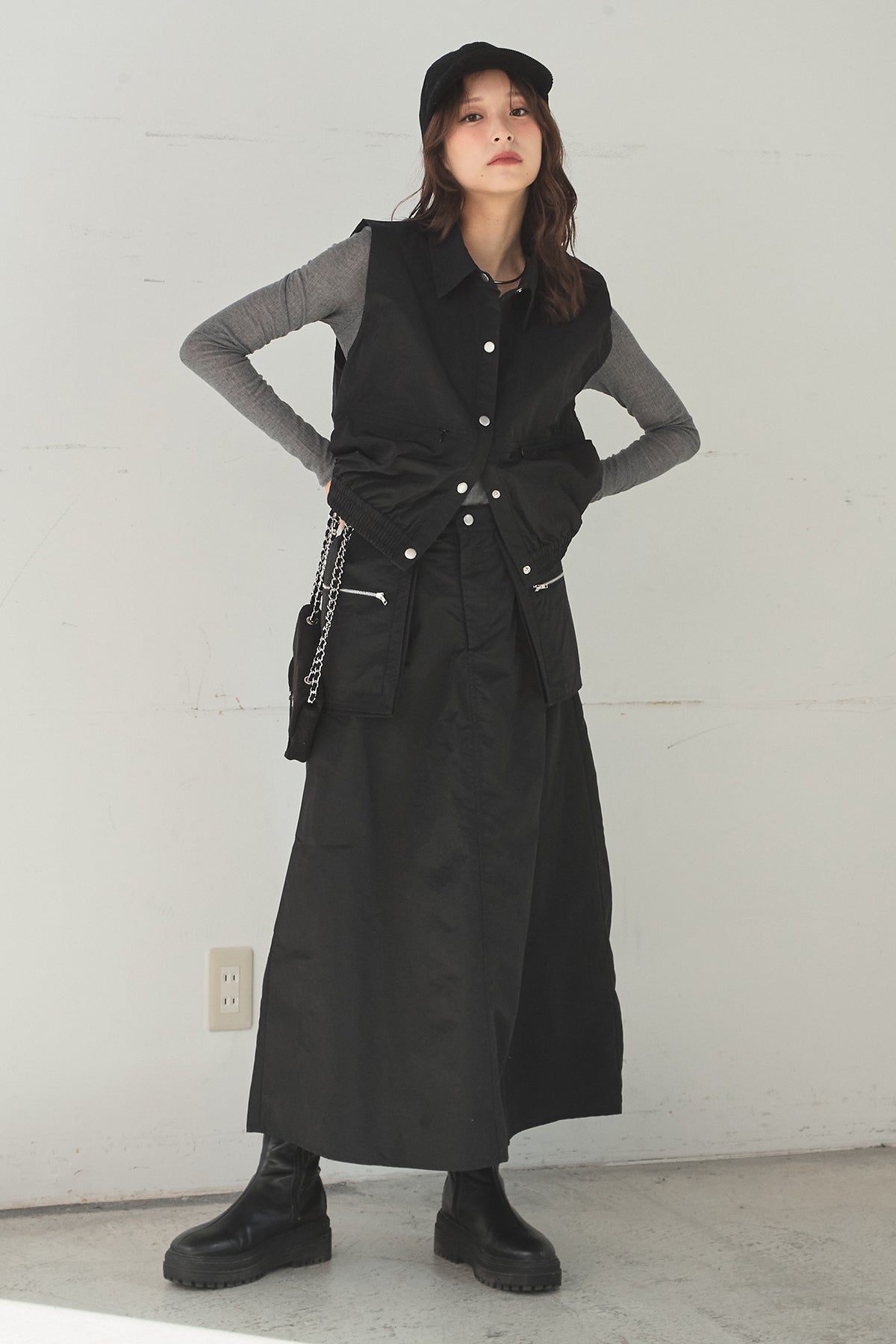 [SET]襟付きナイロンベスト+サイドデザインナイロンスカート+リブシアークルーネック長袖トップス(3set)