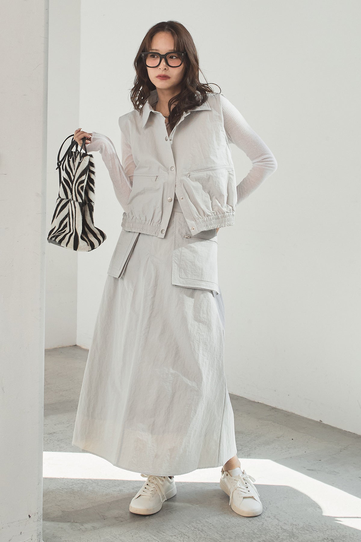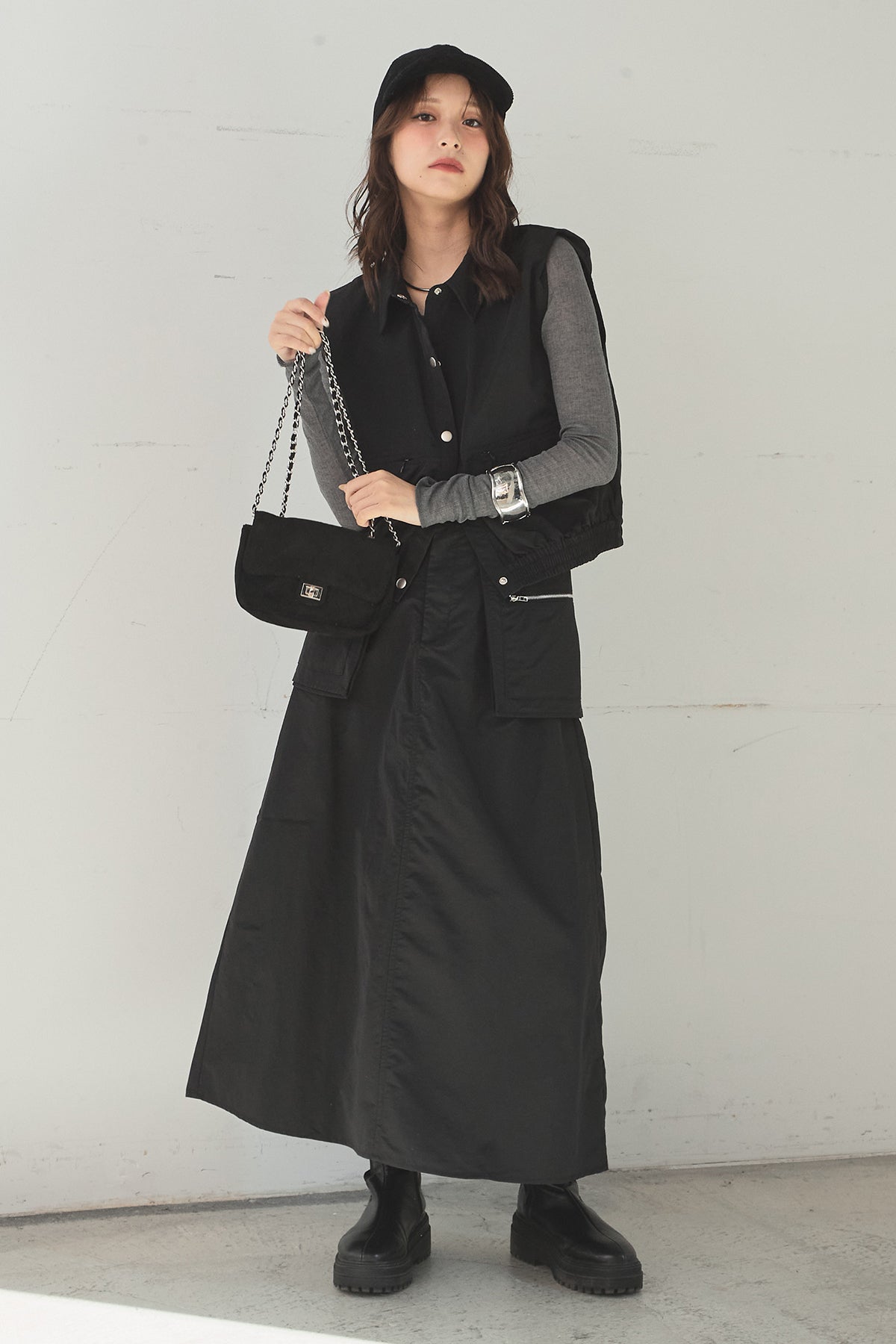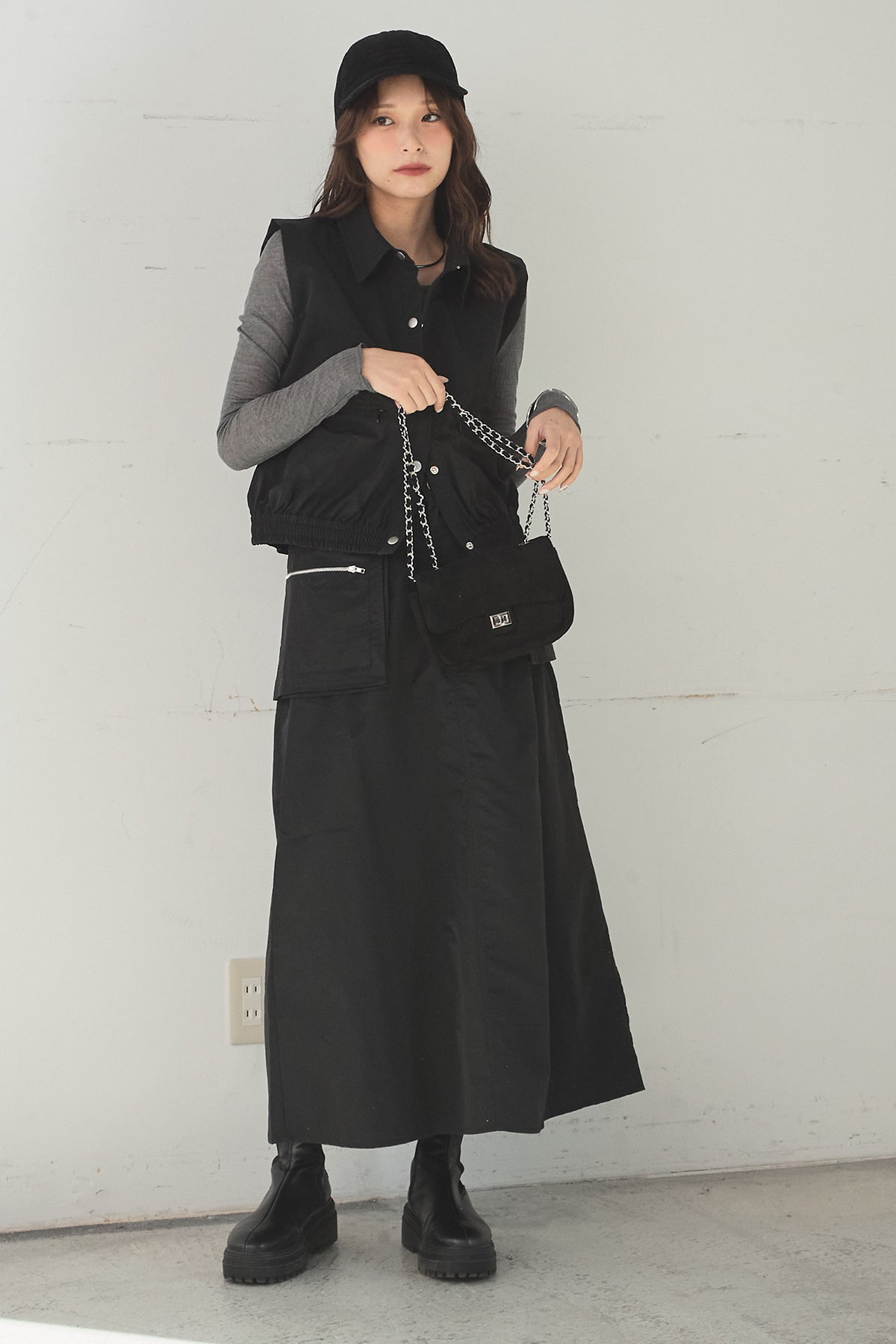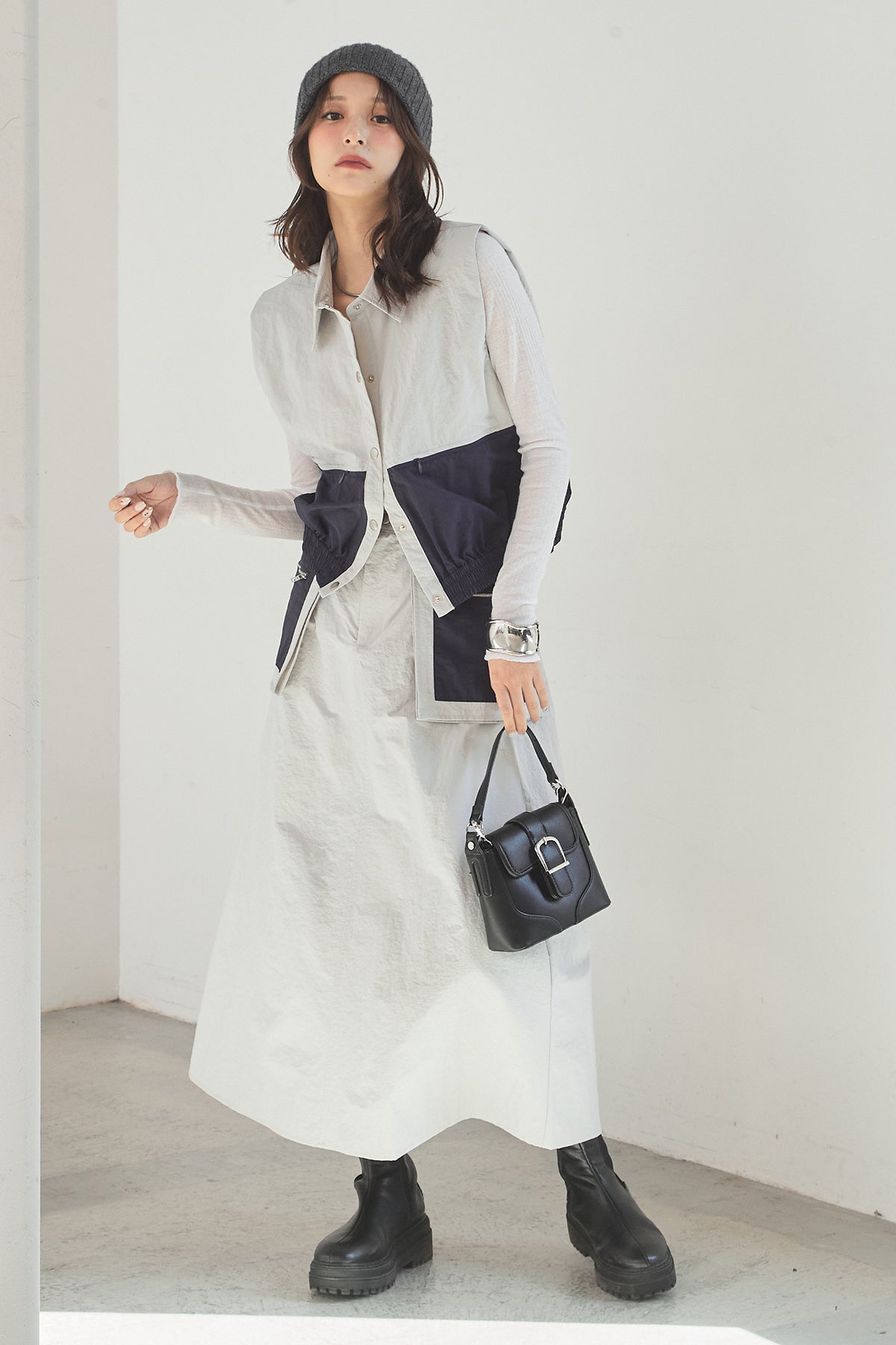 [SET]襟付きナイロンベスト+サイドデザインナイロンスカート+リブシアークルーネック長袖トップス(3set)