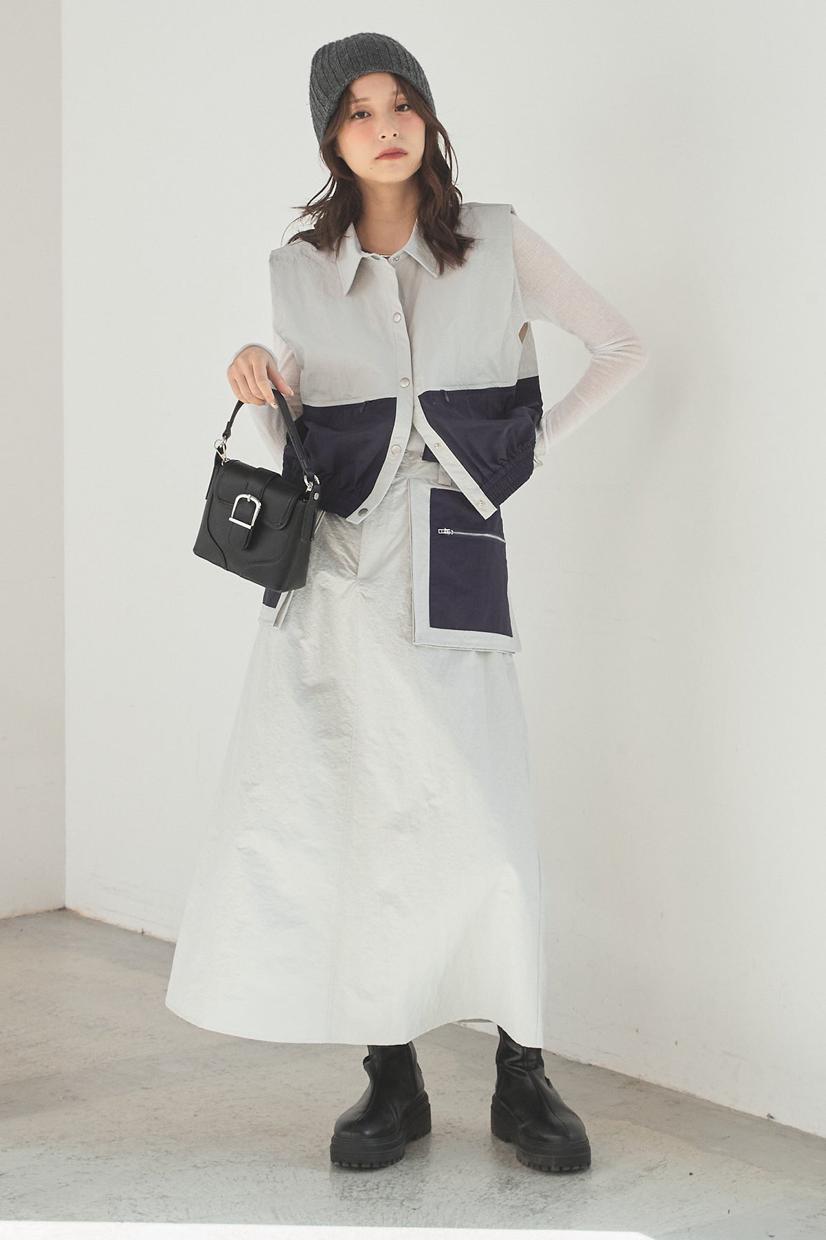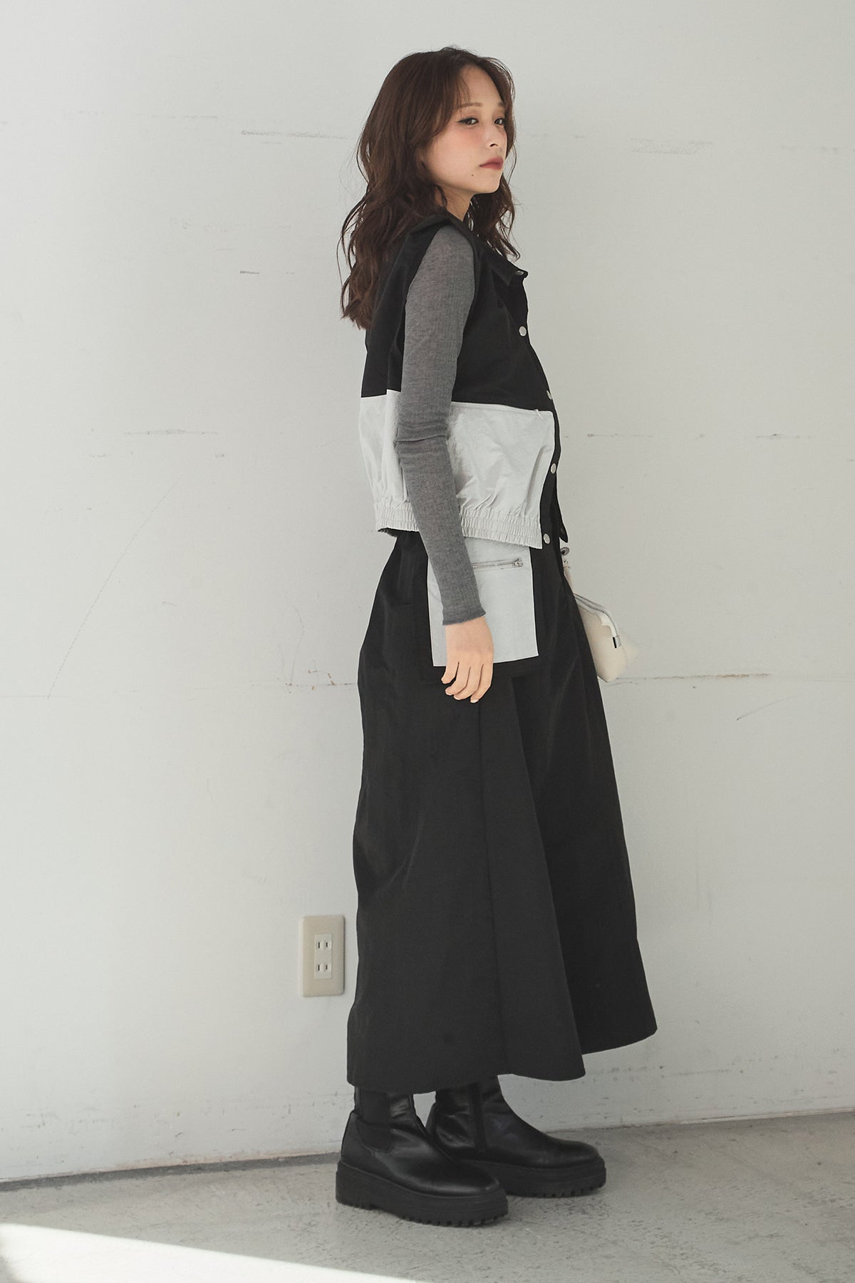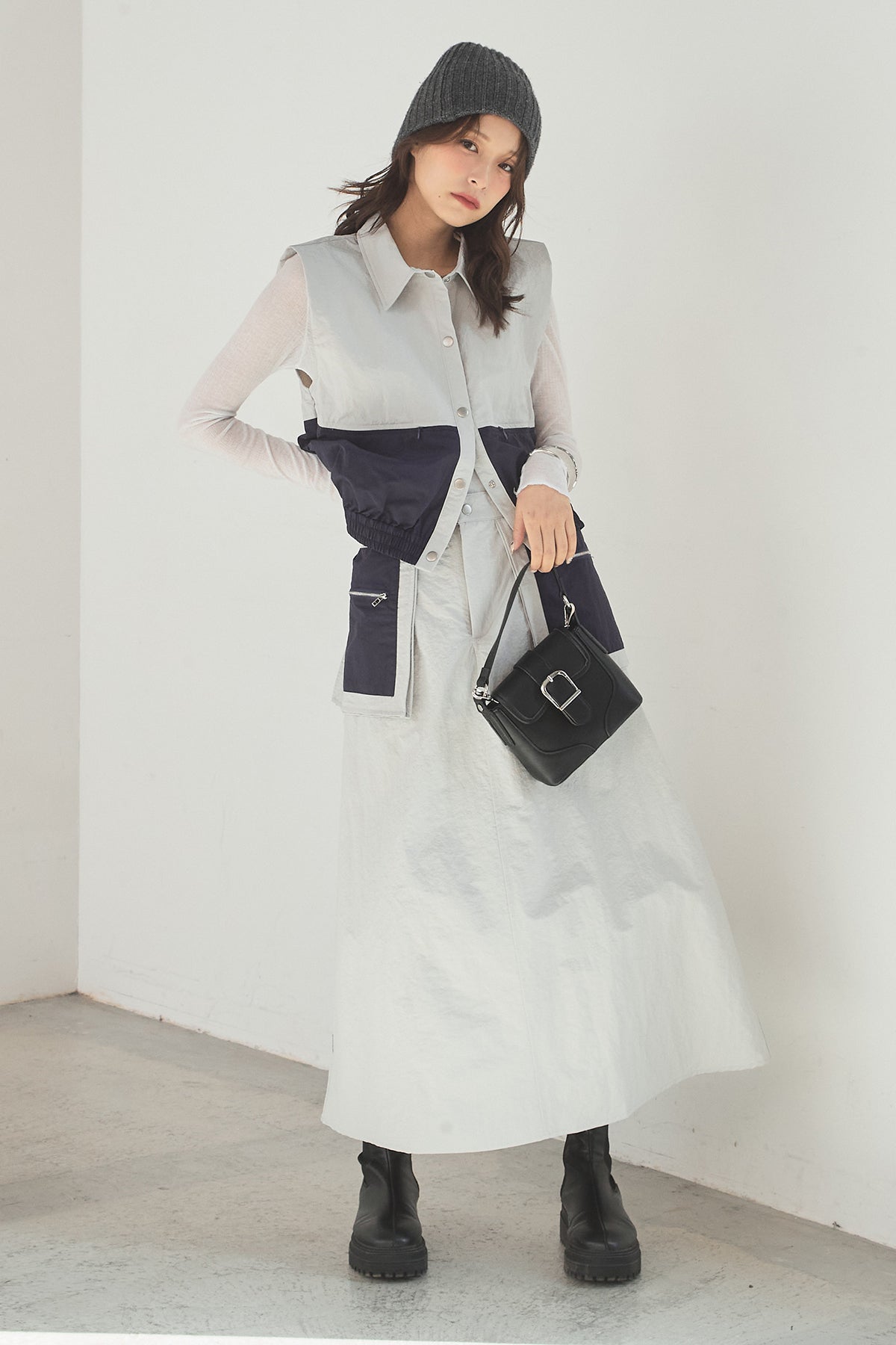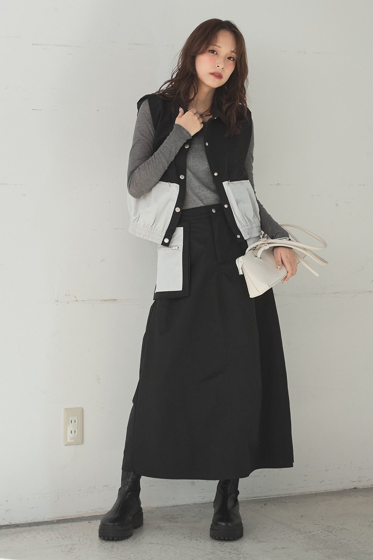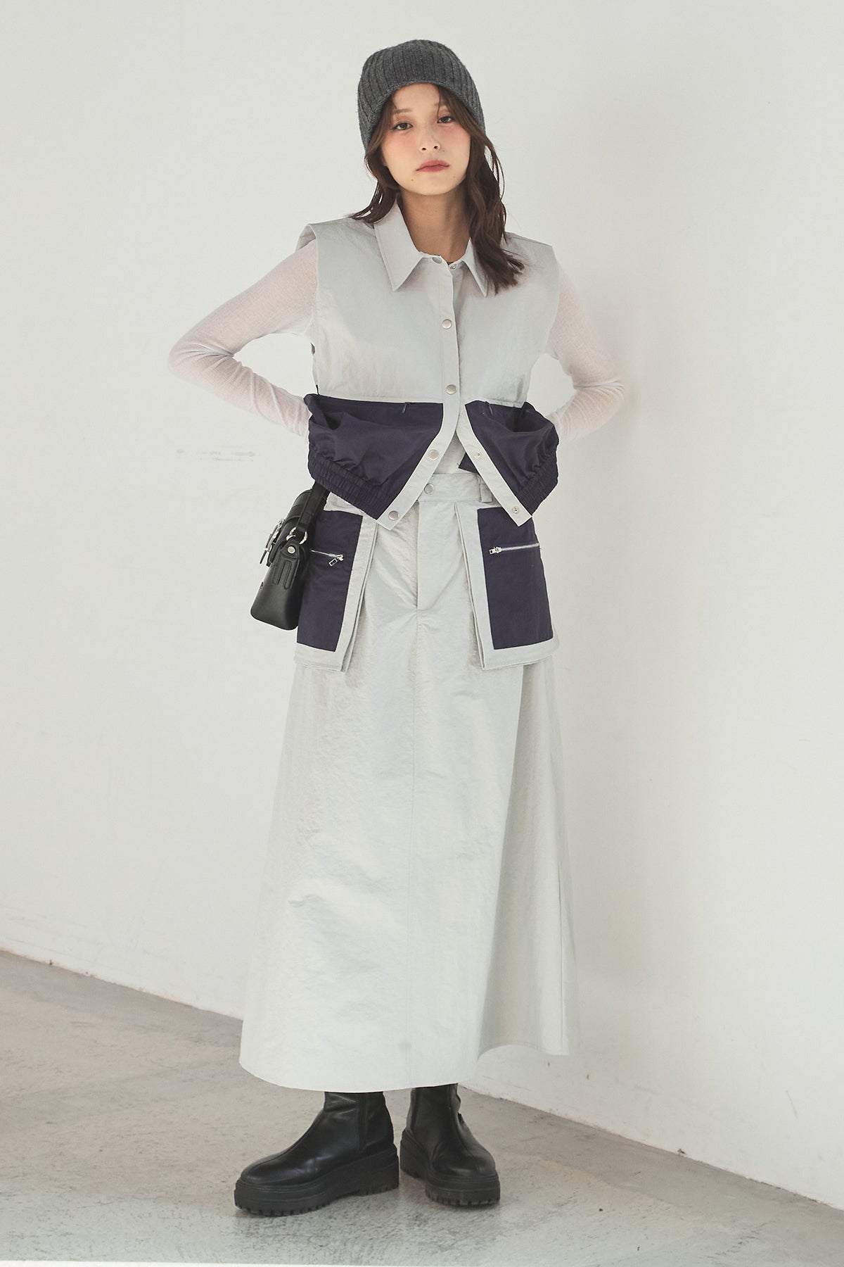 [SET]襟付きナイロンベスト+サイドデザインナイロンスカート+リブシアークルーネック長袖トップス(3set)