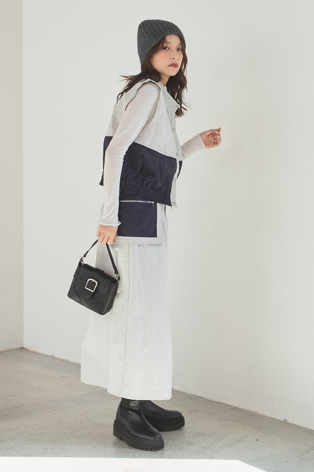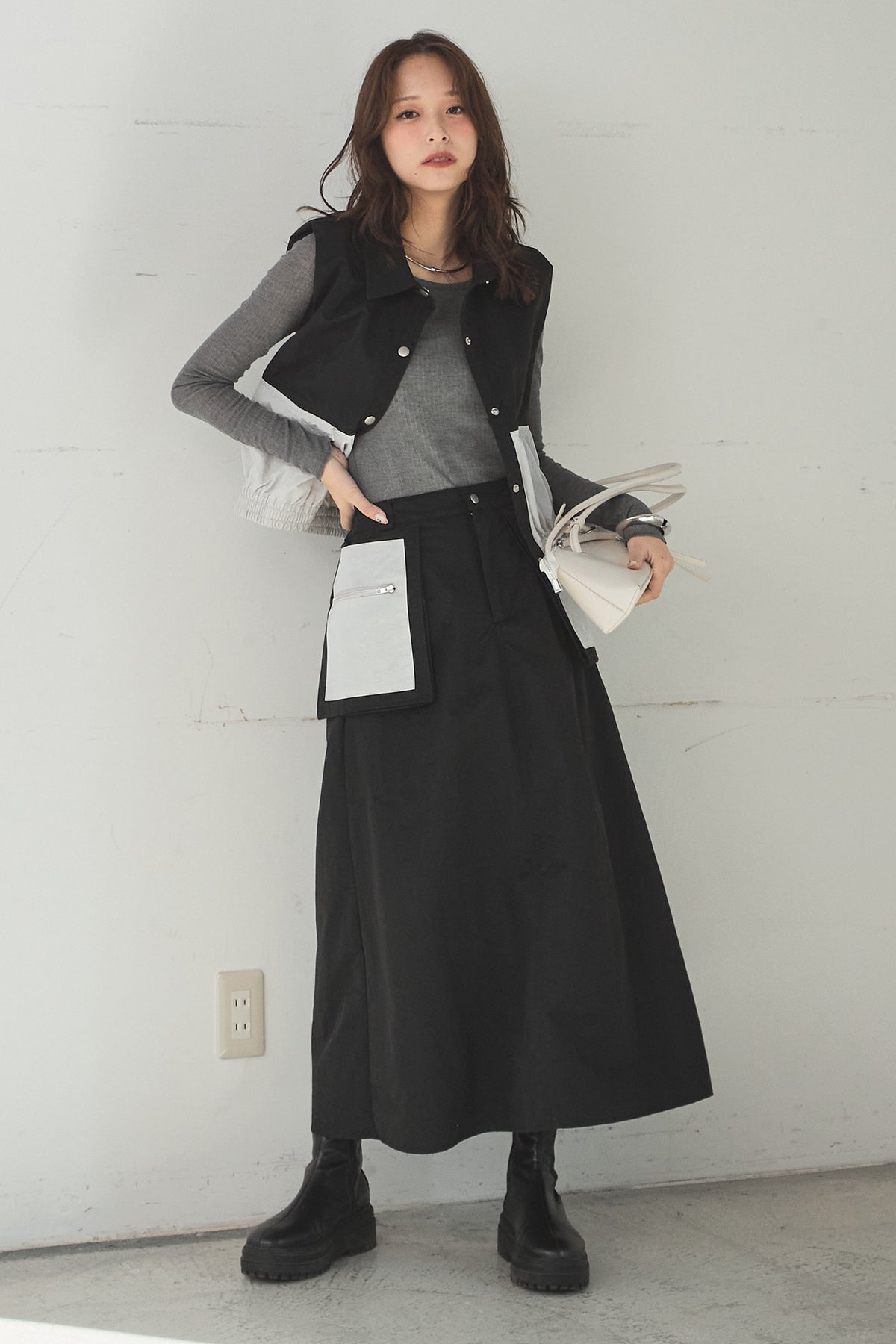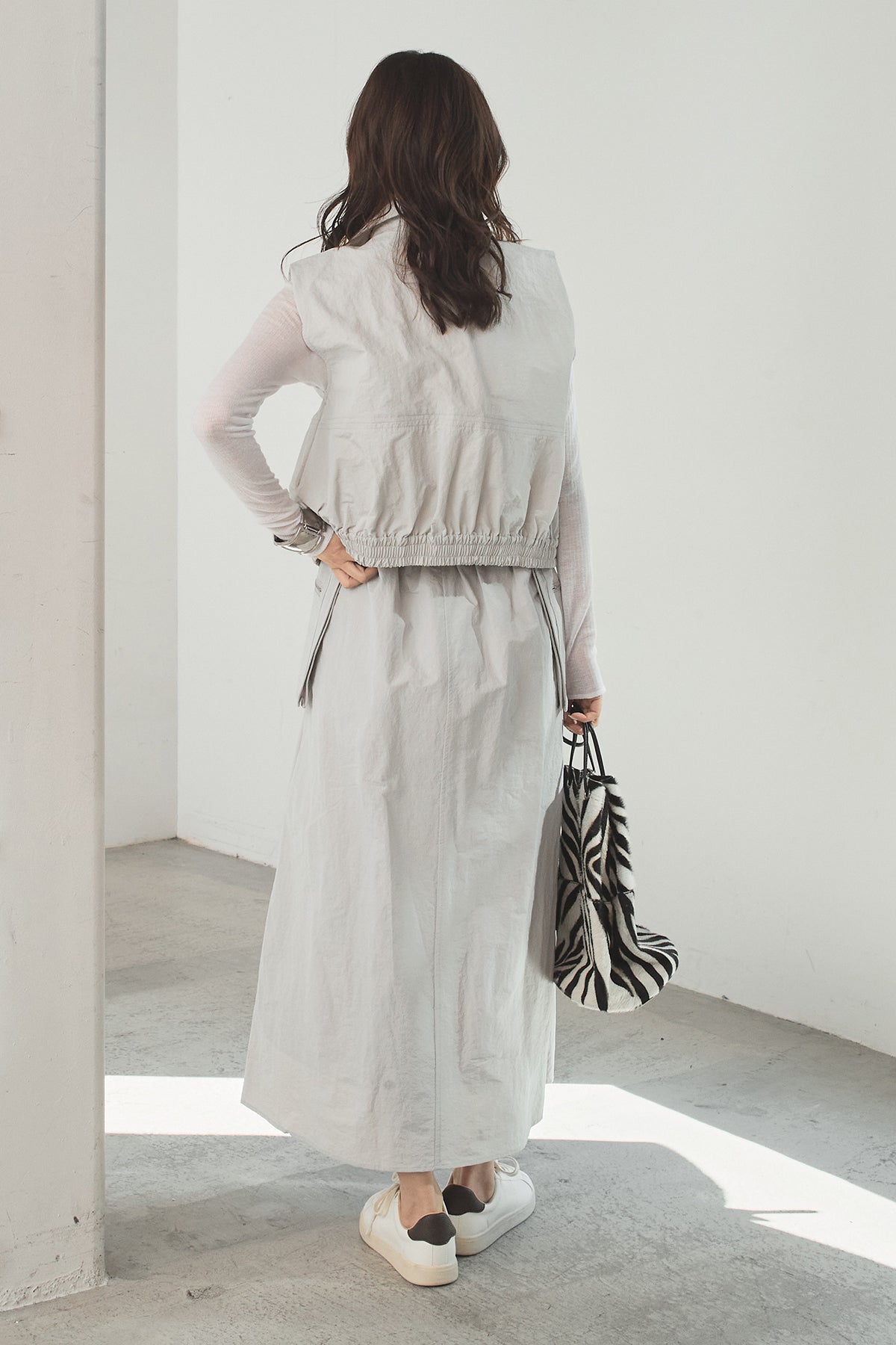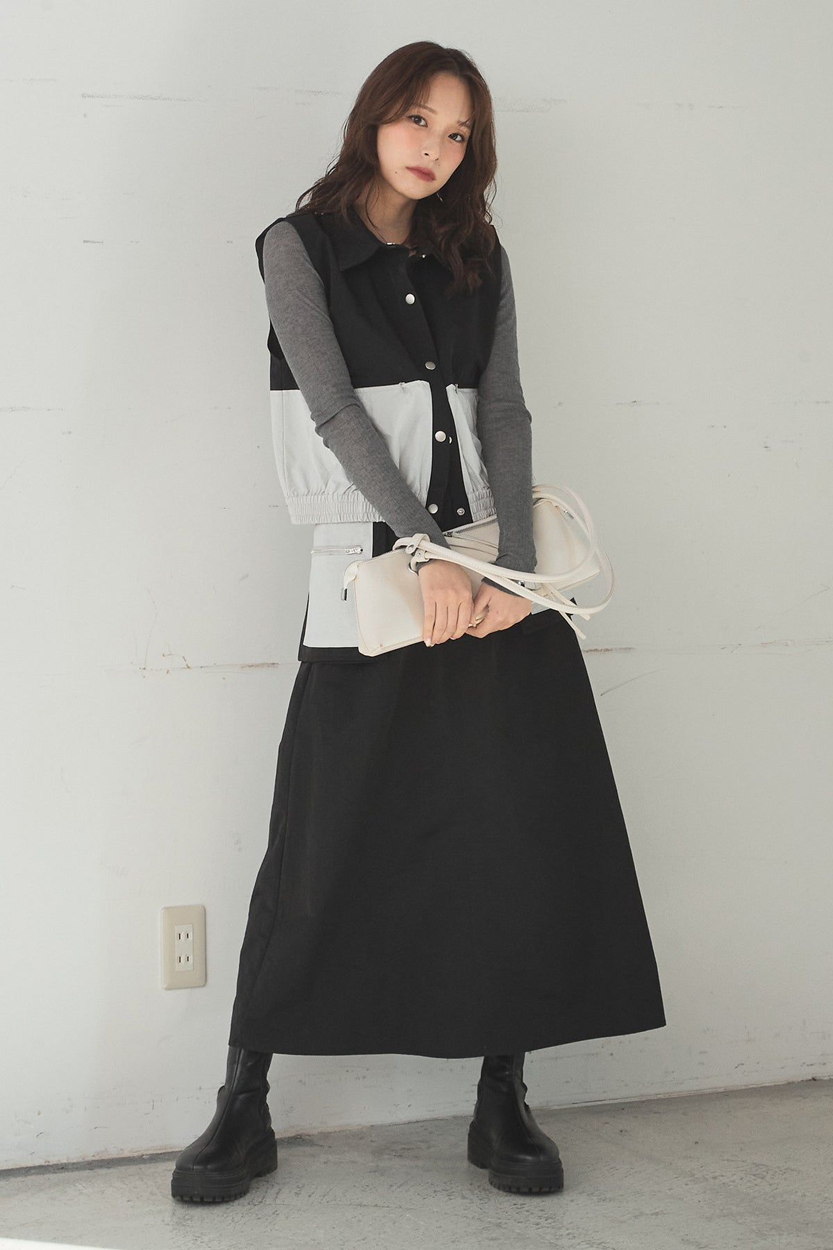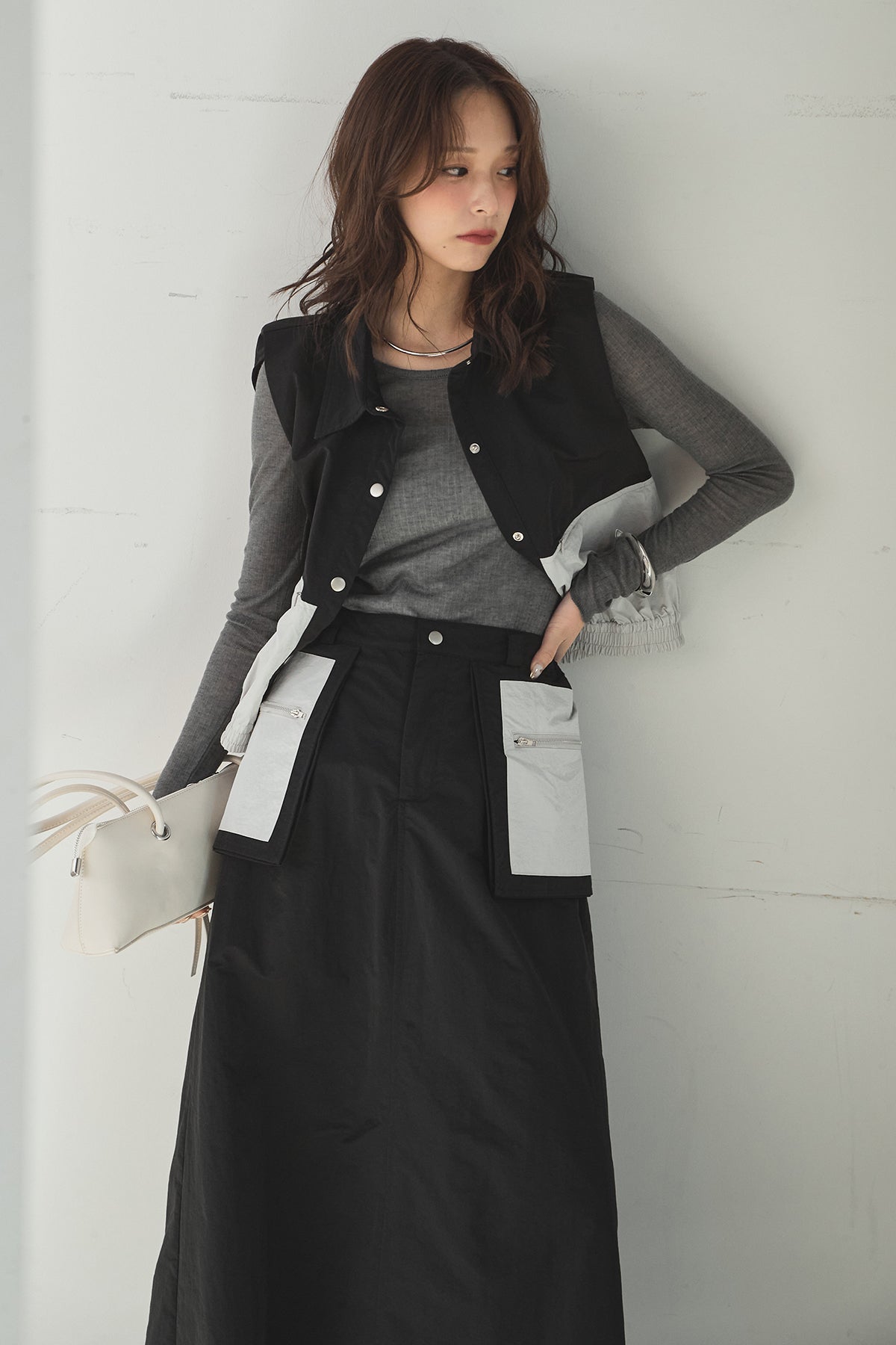 [SET]襟付きナイロンベスト+サイドデザインナイロンスカート+リブシアークルーネック長袖トップス(3set)