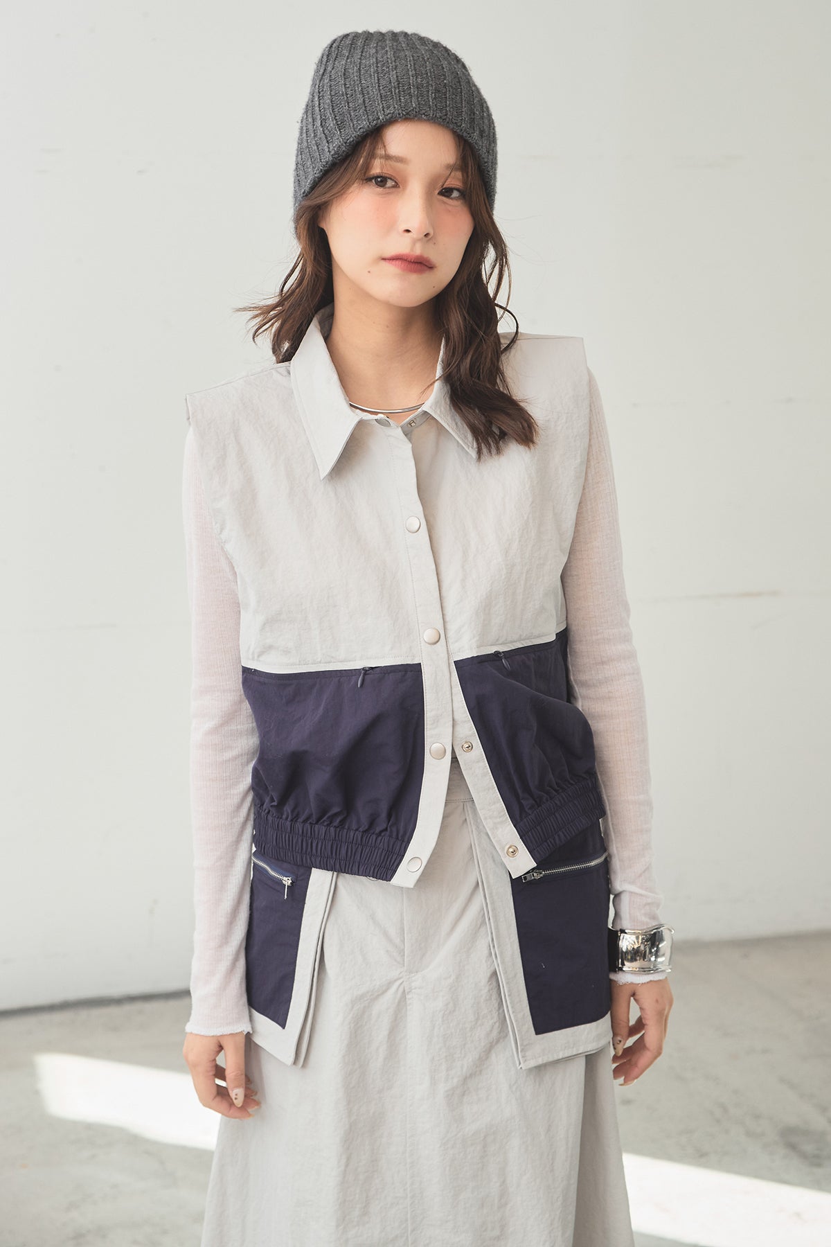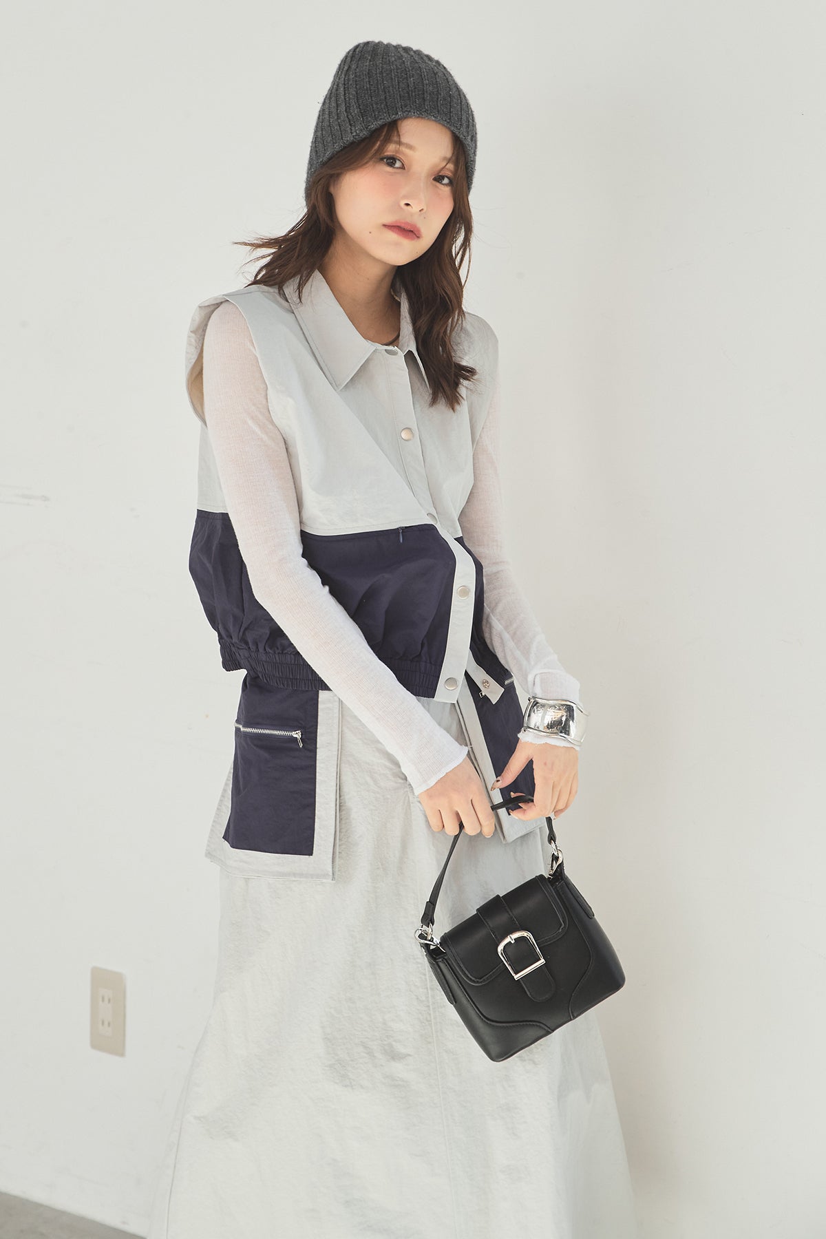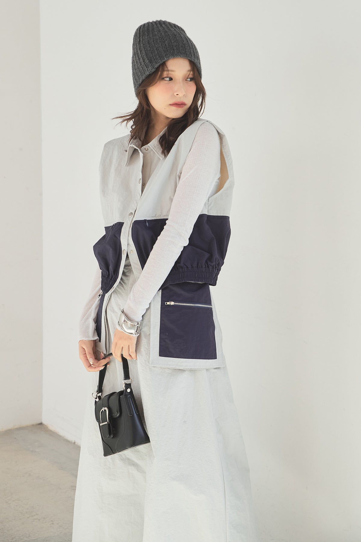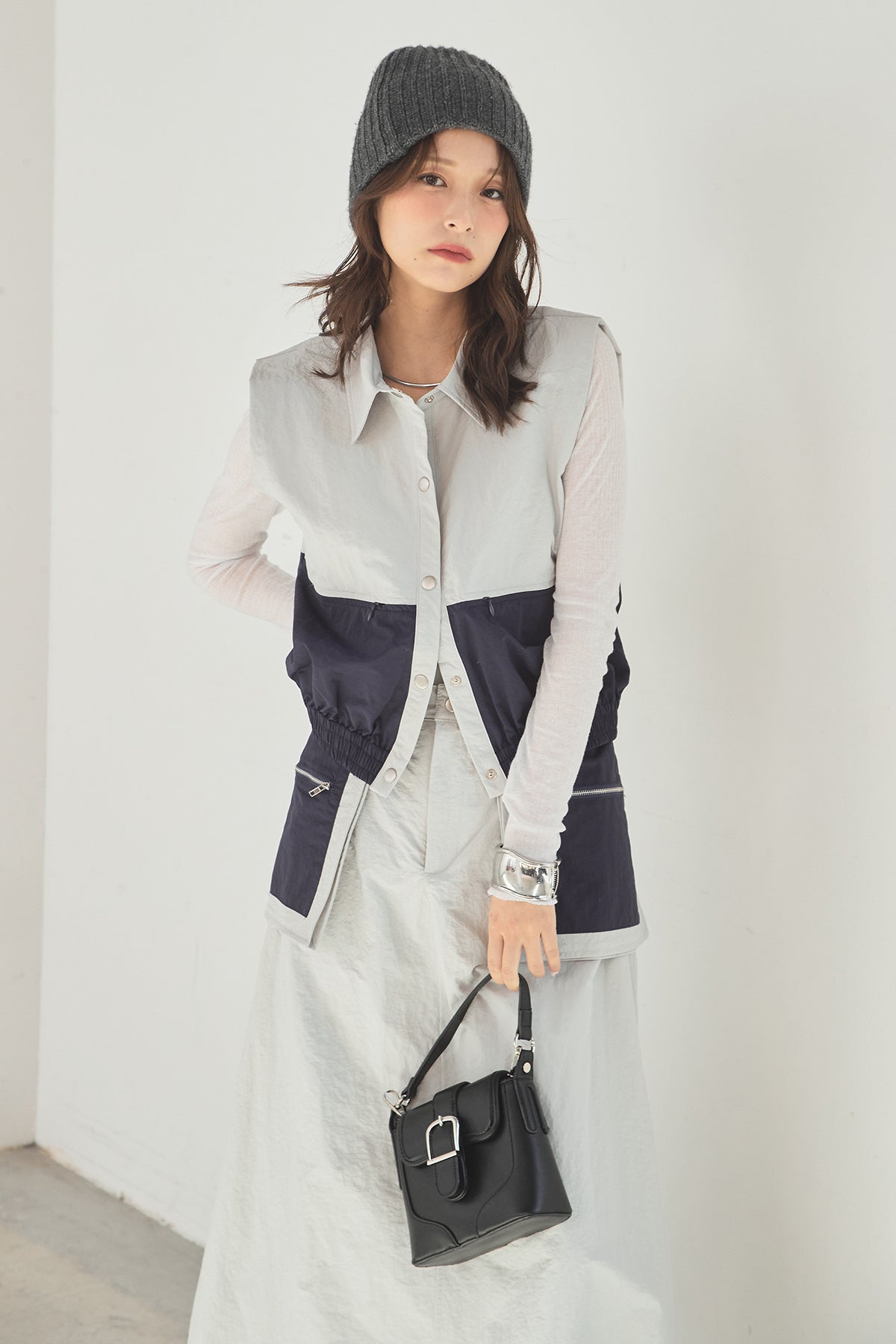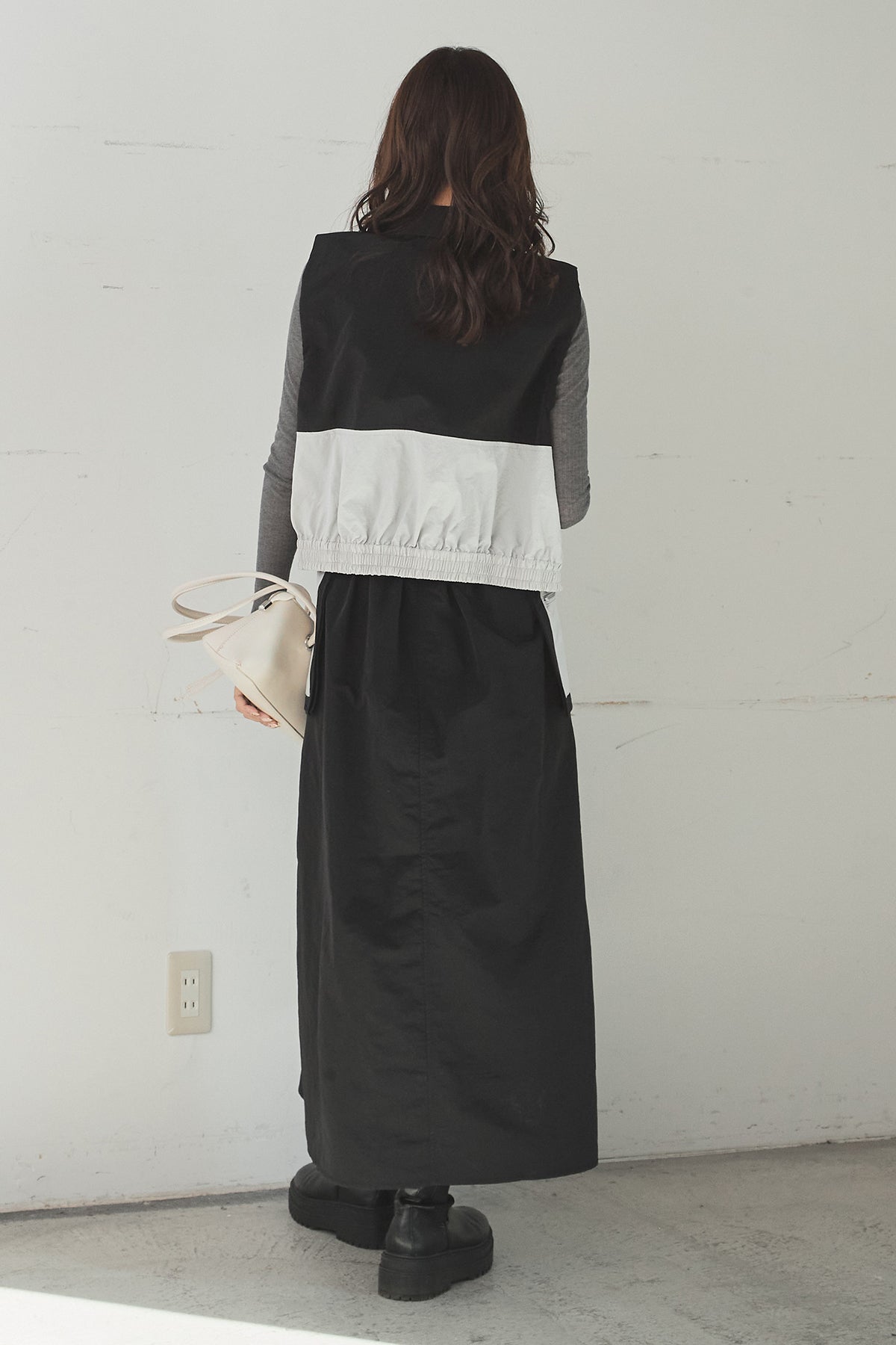 [SET]襟付きナイロンベスト+サイドデザインナイロンスカート+リブシアークルーネック長袖トップス(3set)