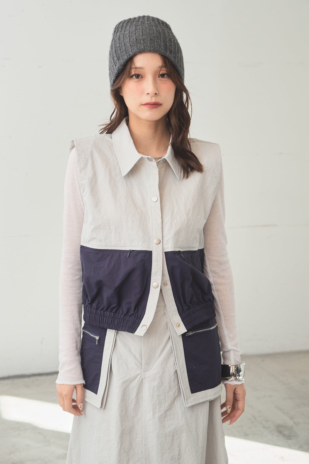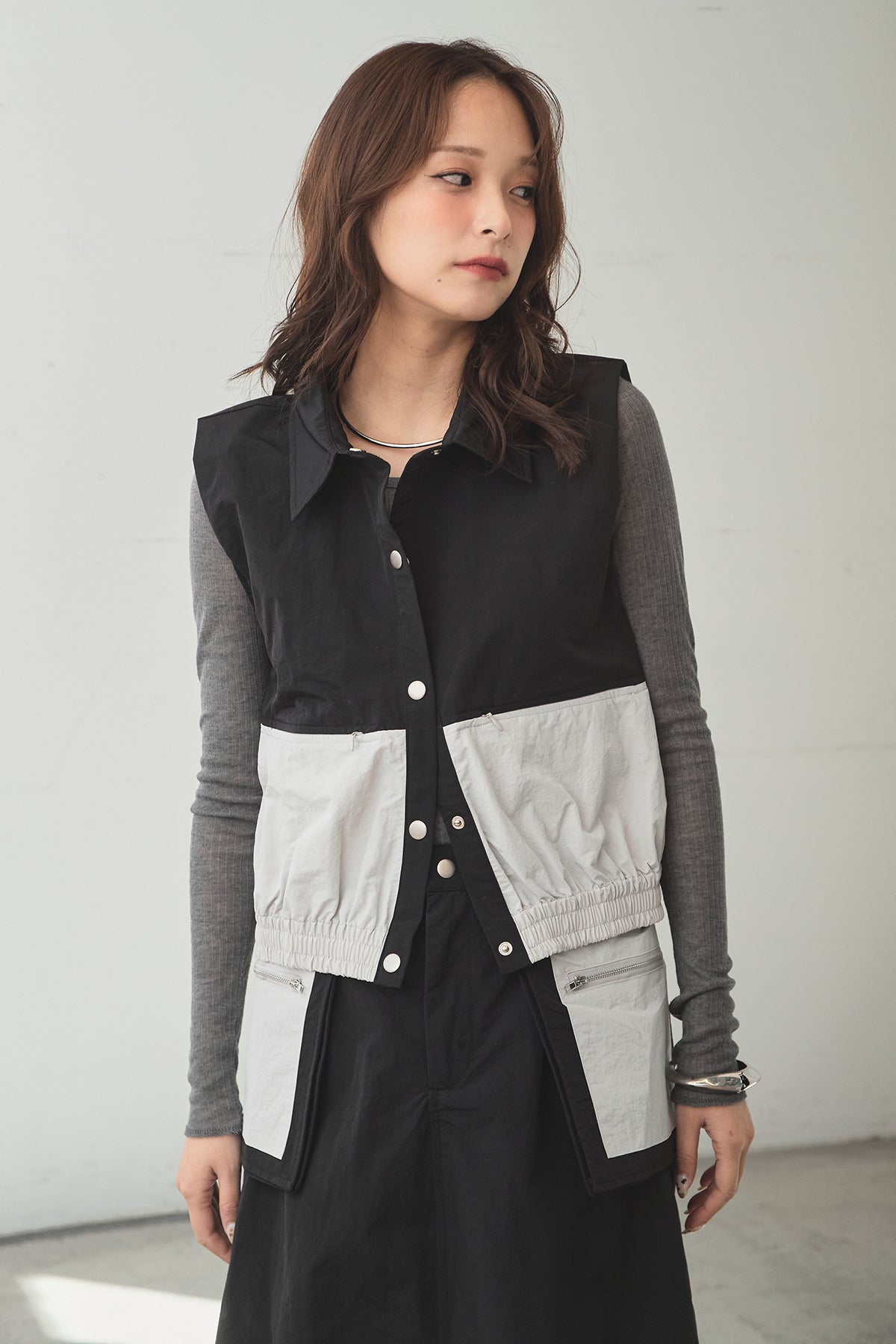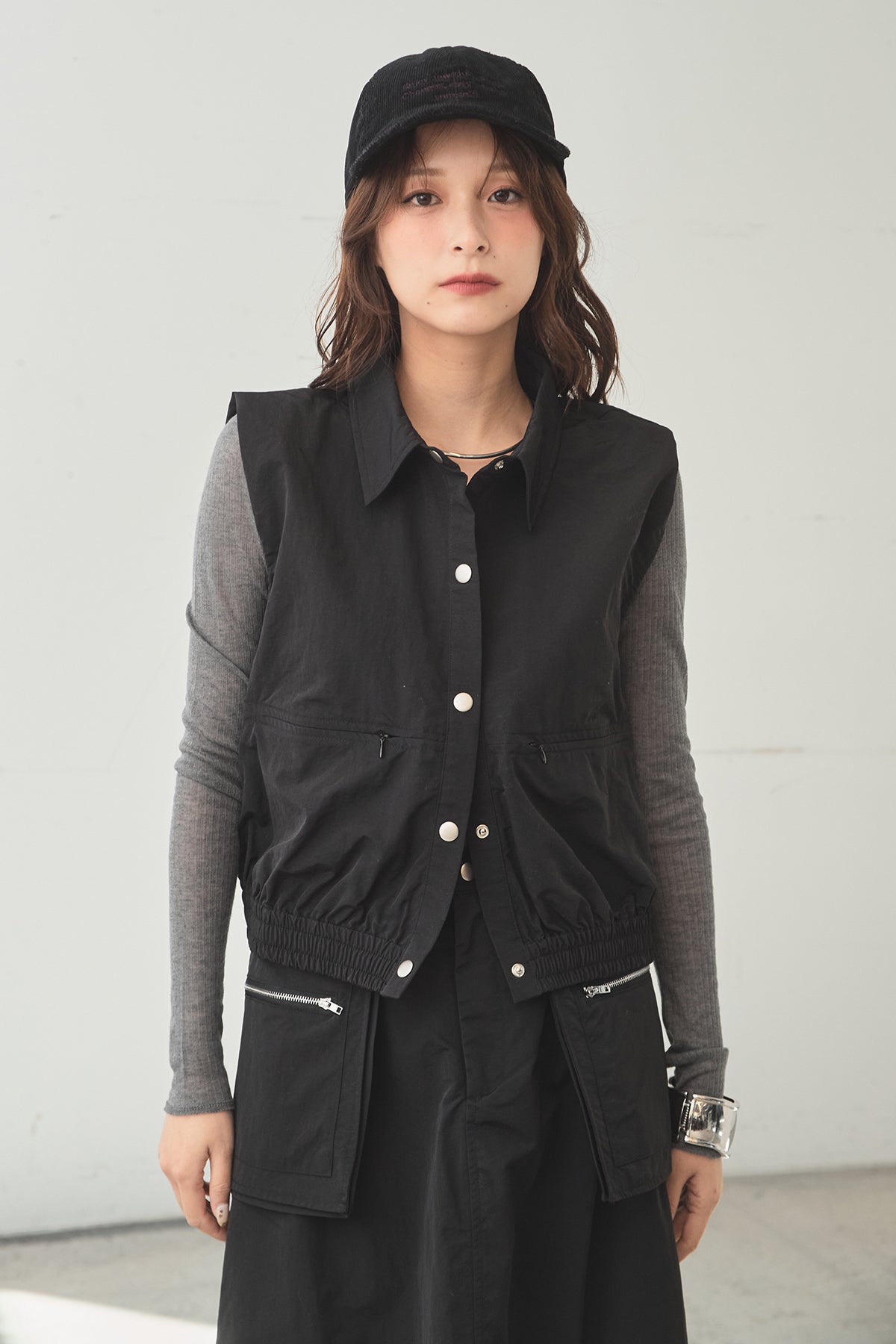 軽やかなナイロン素材を使用した、襟付きデザインのベスト。シャツライクな襟元が程よいきちんと感を添え、カジュアルになりすぎない印象に仕上げています。ウエスト部分の切り替えとコンパクトな丈感がバランスよく、レイヤードスタイルにも取り入れやすい一着に。トップスの上から重ねるだけで、スタイリングに奥行きと変化を与えてくれるアイテムです。