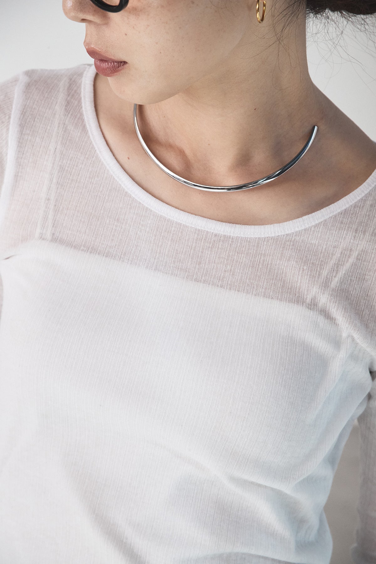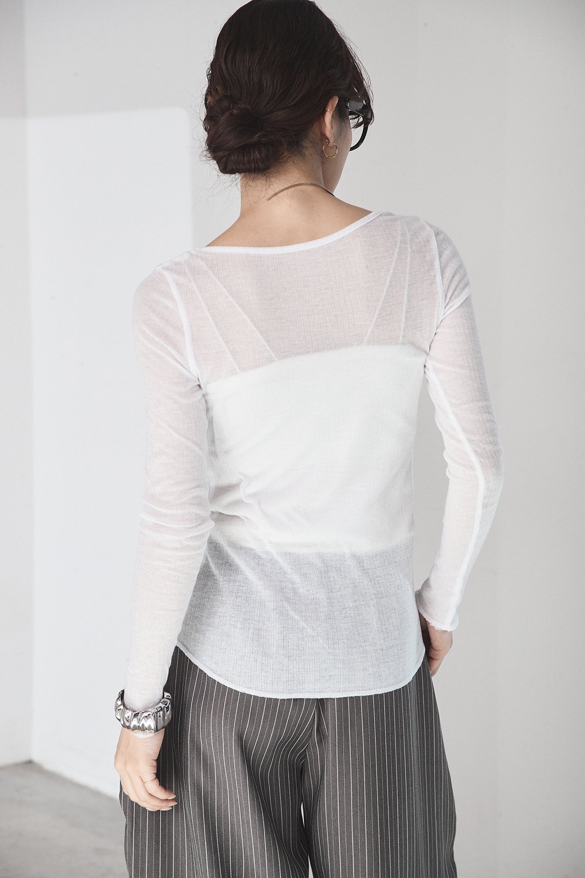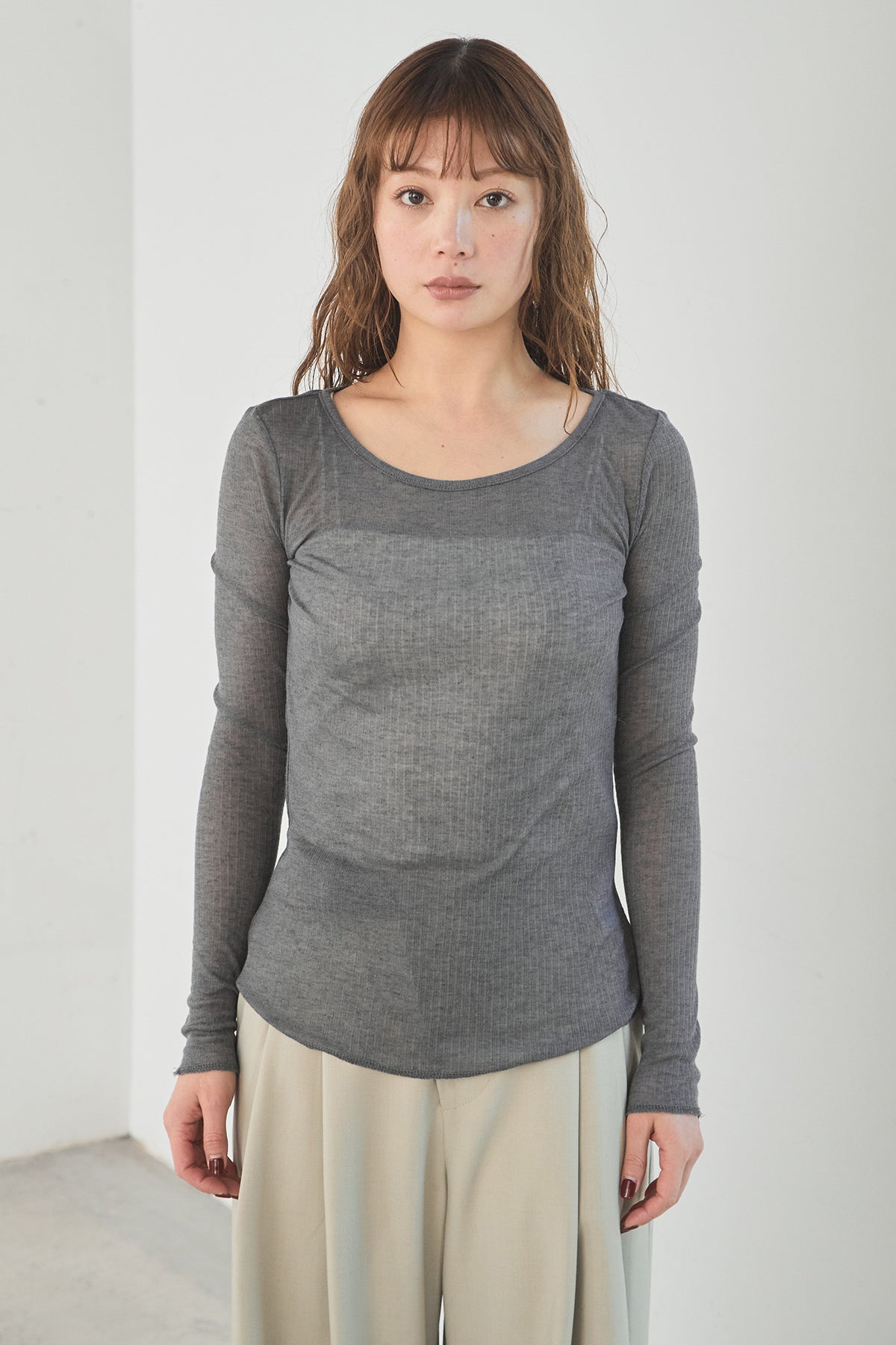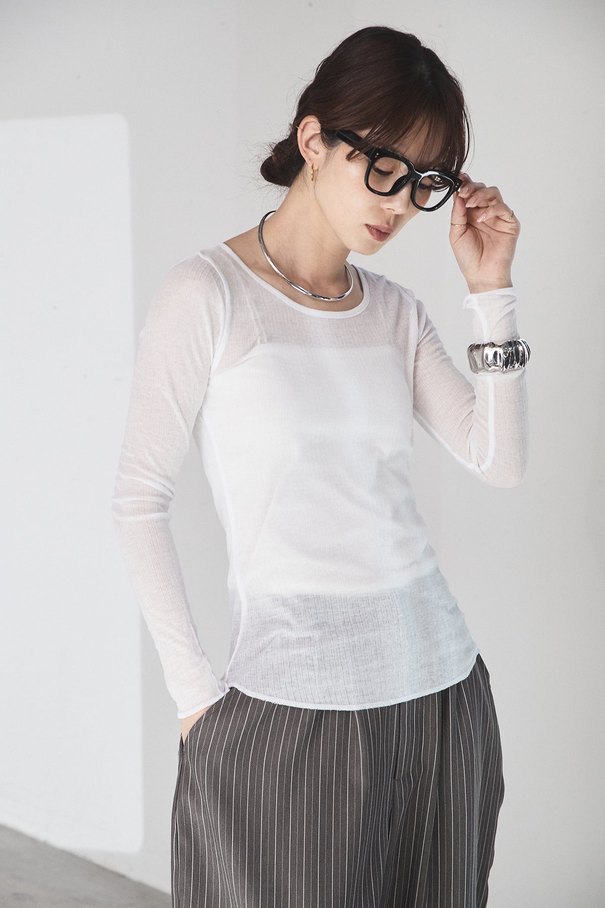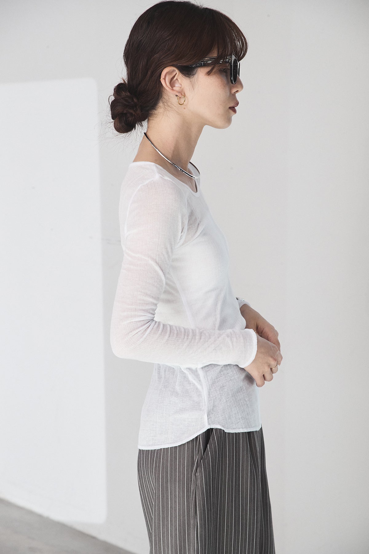 リブ編みのシアー素材を使用したクルーネック長袖トップス。 程よい透け感で、重ね着しても軽やかな印象にまとまります。 シンプルなデザインで、インナー使いもしやすく着回しやすい一枚。 ジャケットやニットの下にも合わせやすく、デイリーに活躍します。