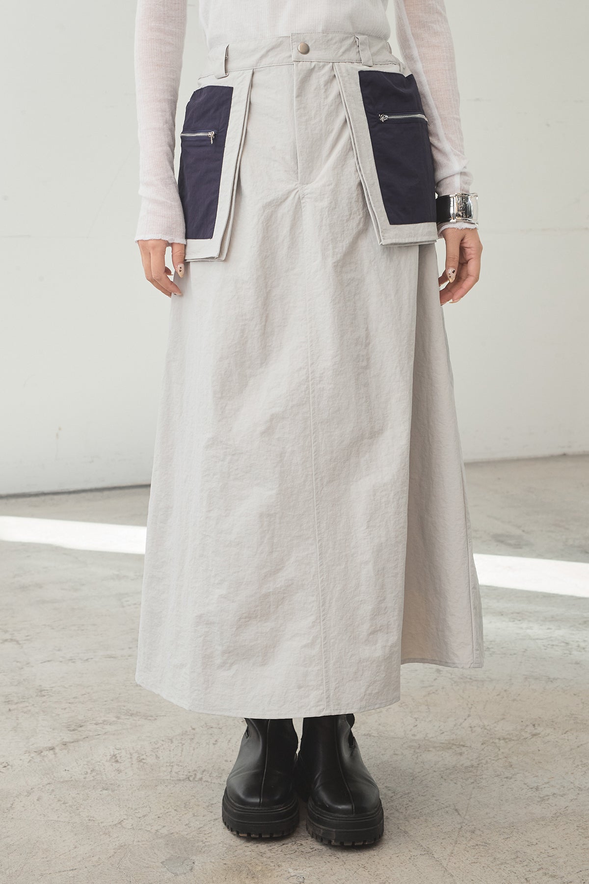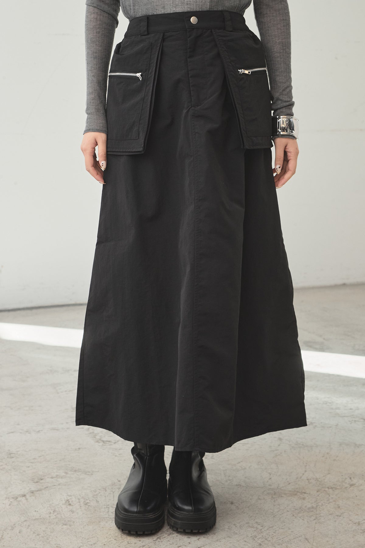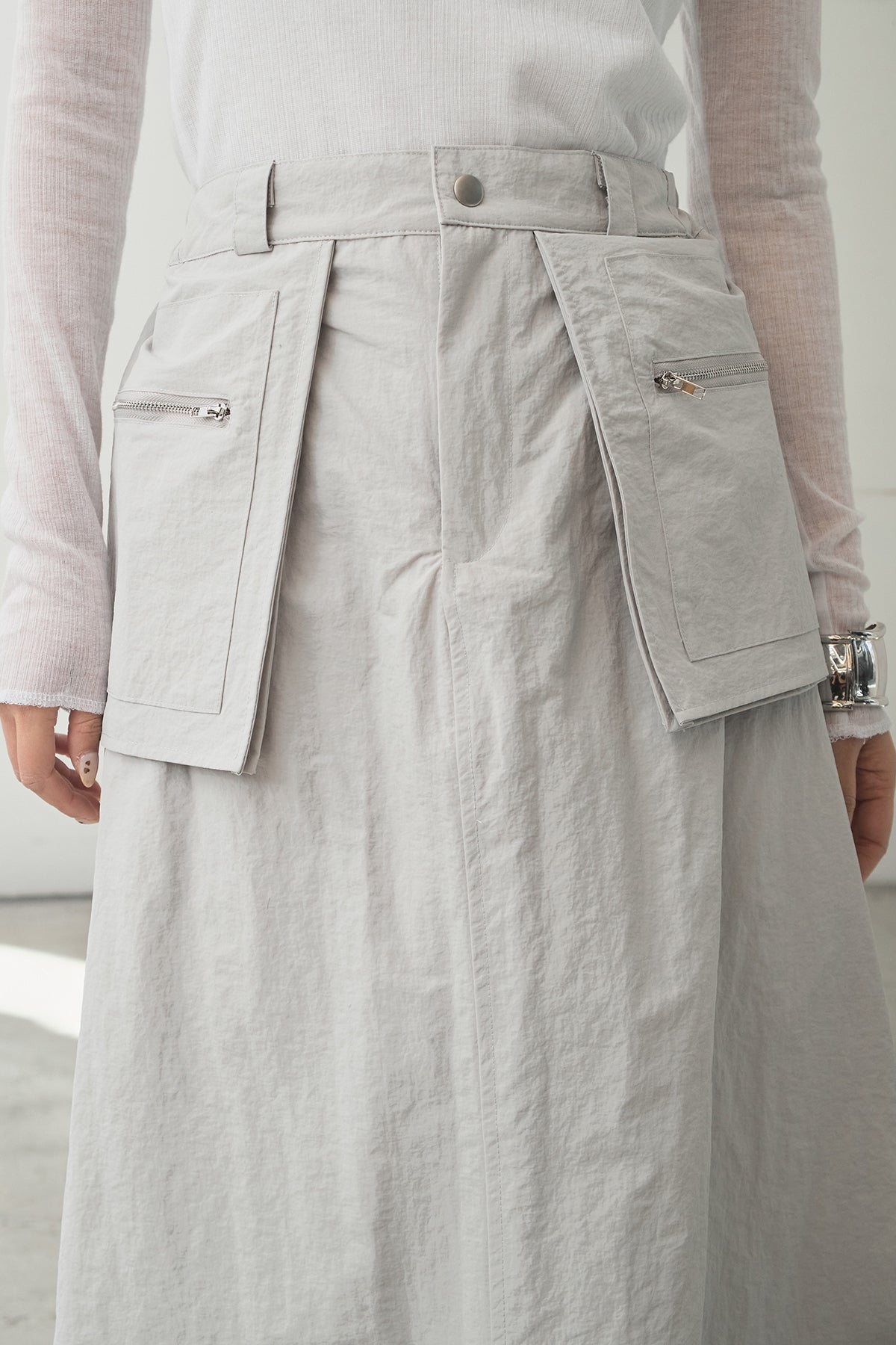 サイドにデザインディテールを施した、ナイロン素材のロングスカート。軽やかな素材感と程よいハリがシルエットを美しく保ち、すっきりとした印象に仕上げています。立体感のあるサイドデザインがさりげないアクセントとなり、シンプルながらも表情のある一枚に。カジュアルにもきれいめにも合わせやすく、スタイリングの幅を広げてくれるアイテムです。