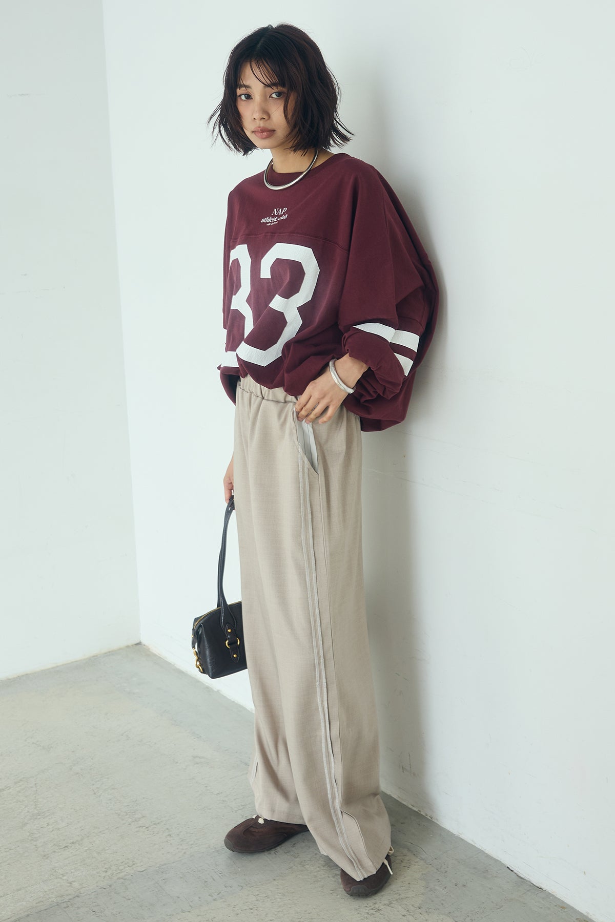 フロントに大胆にあしらわれたナンバープリントが目を惹く、スポーティーな印象のビッグTシャツ。 存在感のあるデザインがスタイリングのアクセントとなり、シンプルなコーディネートを印象的に仕上げてくれる一着です。 ゆったりとしたビッグシルエットとドロップショルダーが、リラックス感のある抜けた雰囲気を演出。 袖に施されたラインデザインが程よいスポーティーさをプラスし、カジュアルながらもこなれた印象に仕上げています。 裾にはドローストリングを施しており、シルエットのアレンジが可能。 裾を絞ることで丸みのあるフォルムを作り、スタイリングに立体感を加えることができます。 デニムやカーゴパンツ、スカートなどさまざまなボトムスと相性が良く、デイリーに取り入れやすいアイテム。 シンプルなスタイリングに遊び心をプラスし、都会的でこなれたムードを演出してくれる主役級のアイテムです。