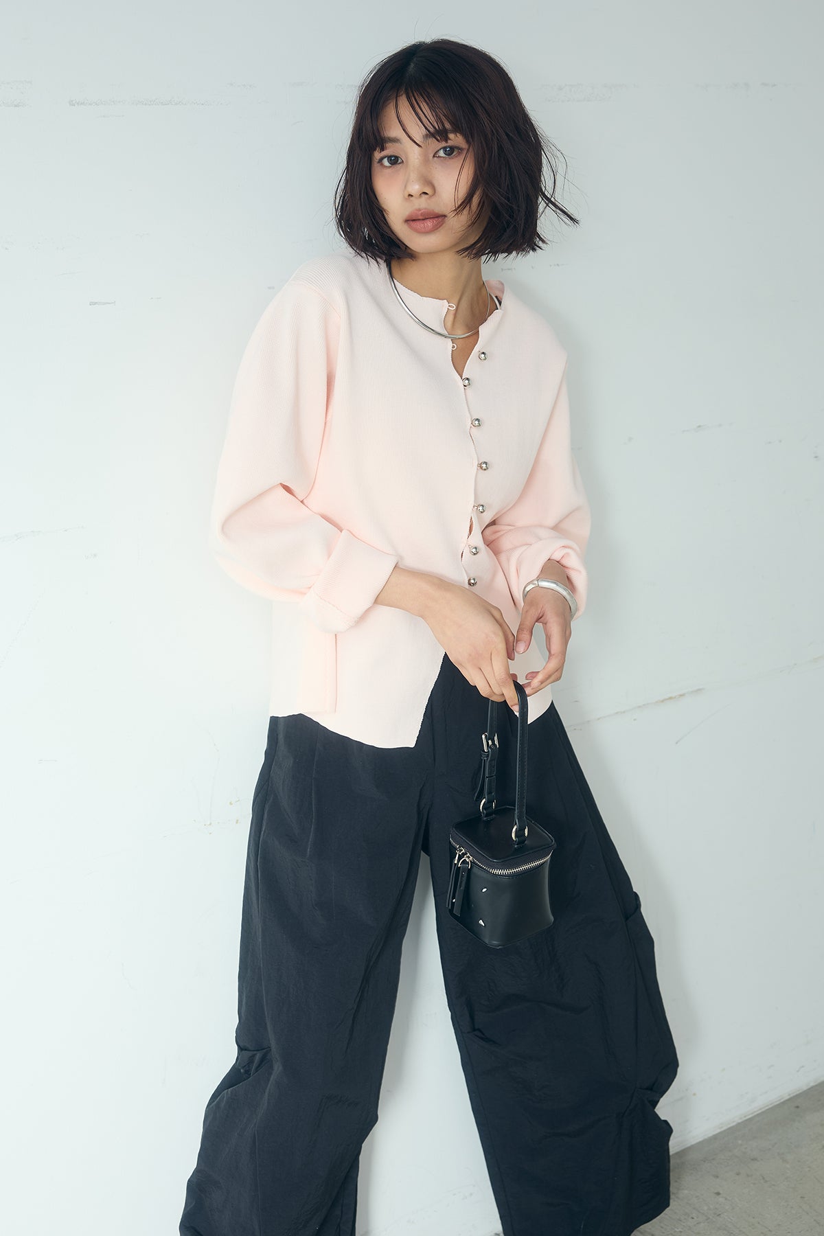 [SET]メタルボタンバナナスリーブカーディガン+ドライタフタタックバレルパンツ(2set)
