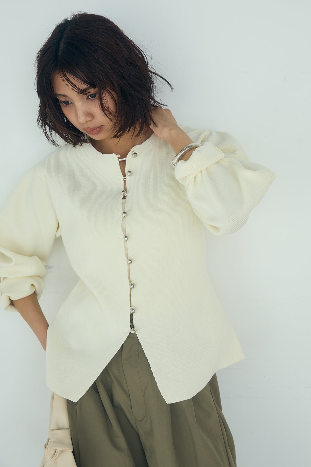 メタルボタンのディテールが目を惹く、ミニマルながら存在感のあるカーディガン。 フロントに並んだメタルボタンがさりげないアクセントとなり、シンプルなスタイリングに洗練された印象をプラスしてくれる一着です。 程よく立体感のあるバナナスリーブが柔らかなシルエットを生み出し、女性らしくモードな雰囲気を演出。 すっきりとしたネックラインとコンパクトな着丈が、全体のバランスを美しく整えてくれます。 程よい厚みのある生地で着心地も良く、トップスとしてはもちろん軽い羽織りとしても活躍。 スラックスやデニム、スカートなど幅広いボトムスと合わせやすく、デイリーからきれいめなシーンまで取り入れやすいアイテムです。 シンプルなスタイリングに遊び心をプラスし、都会的でこなれたムードを演出してくれる主役級のアイテムです。