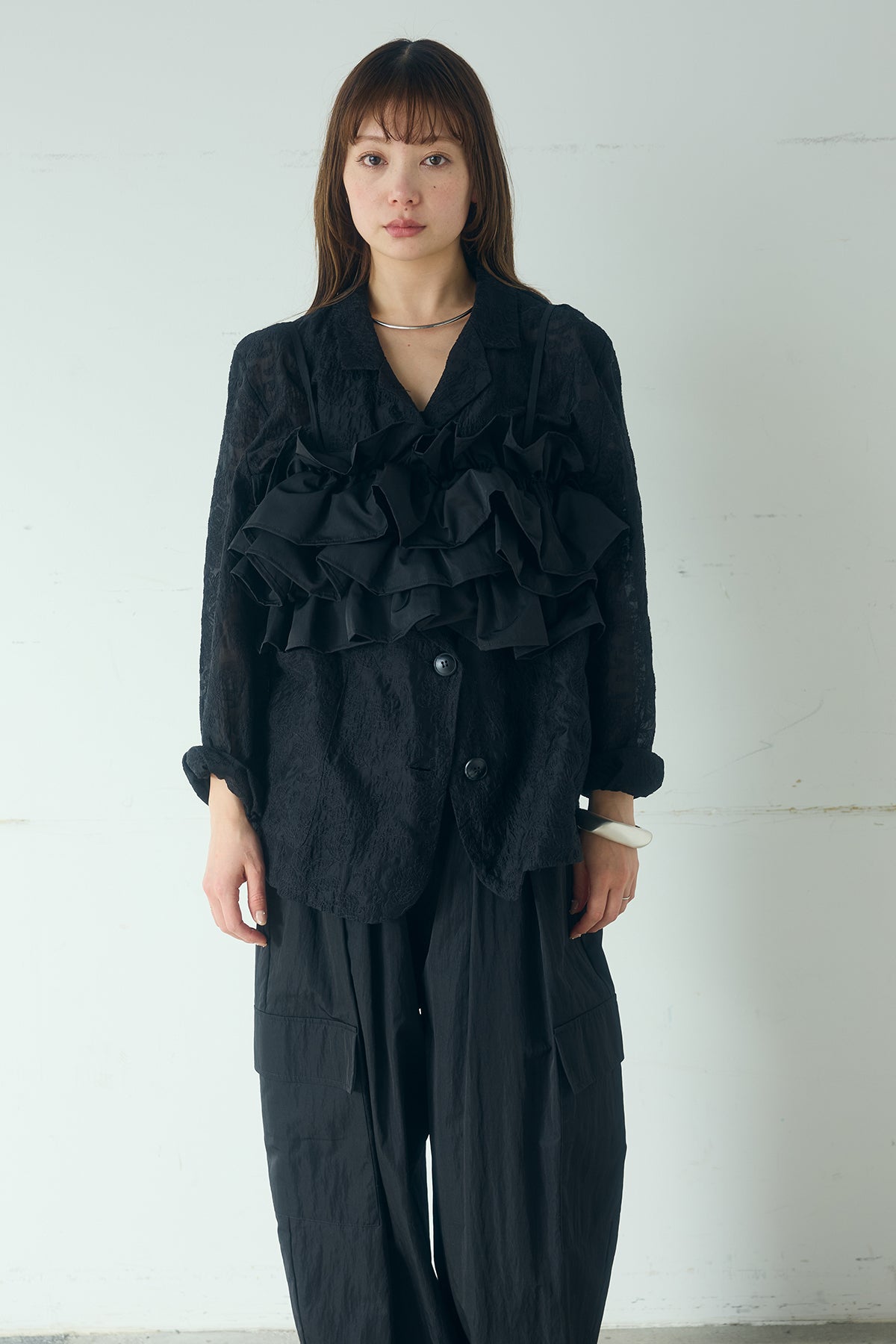 立体的に重ねたフリルが目を惹く、華やかな印象のビスチェ。 ボリュームのあるフリルデザインがスタイリングに奥行きを生み出し、シンプルな装いにアクセントを添えてくれます。 胸元に施されたフリルは柔らかな立体感を演出し、女性らしく存在感のある仕上がりに。 コンパクトなシルエットながらも軽やかな着心地で、レイヤードスタイルを楽しめる一着です。 撥水加工を施した素材を使用しているため、日常使いはもちろんアクティブなシーンにも対応。 Tシャツやシャツ、ジャケットの上に重ねるだけで、いつものコーディネートをぐっと新鮮な印象にアップデートしてくれます。 シンプルなスタイリングに遊び心をプラスし、都会的でこなれたムードを演出してくれる主役級のアイテムです。