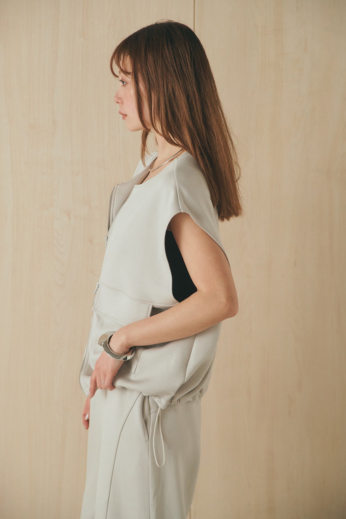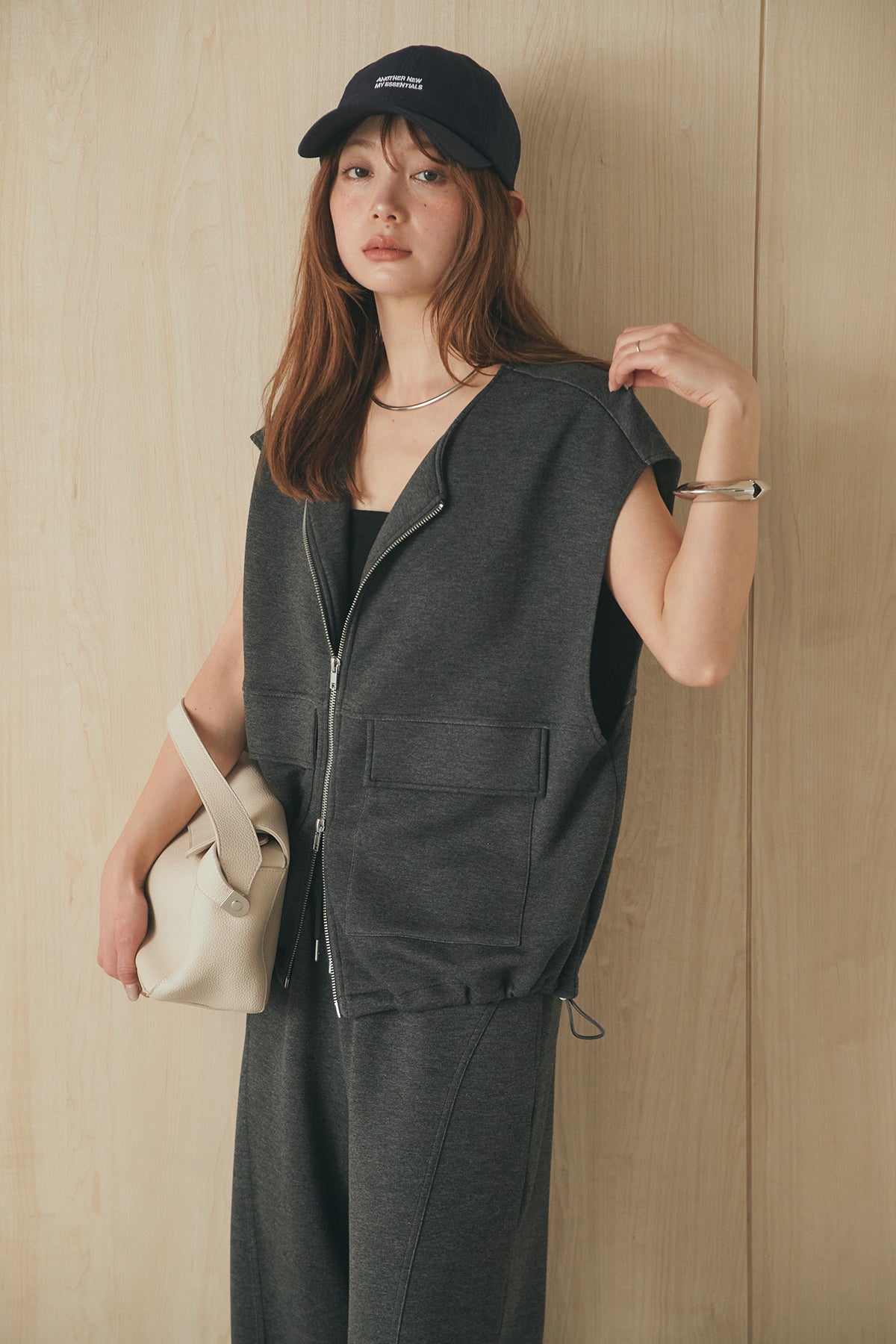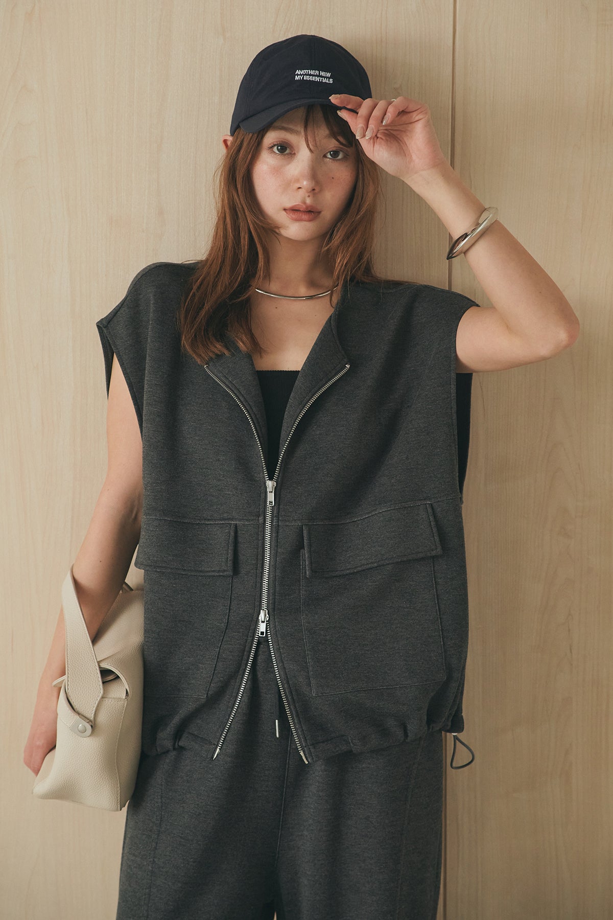 立体感のあるシルエットが魅力のジップベスト。 ハリのあるボンディング生地で仕立て、程よいボリューム感がスタイリングに奥行きをプラスします。フロントジップ仕様で着脱しやすく、シンプルながらも存在感のあるデザインに。 カットソーやワンピースに重ねるだけでバランスよくまとまり、デイリーに取り入れやすいレイヤードアイテムです。