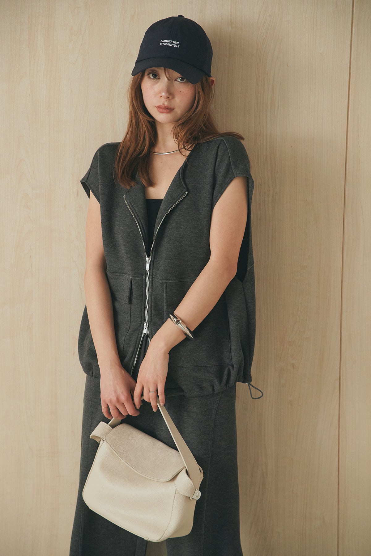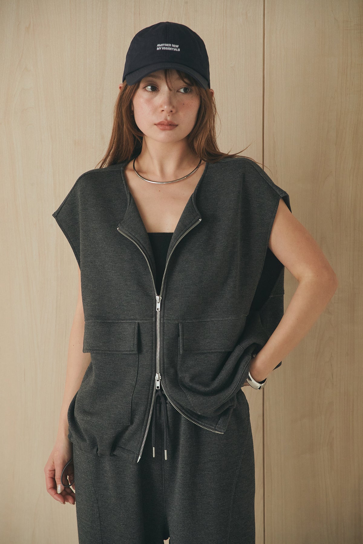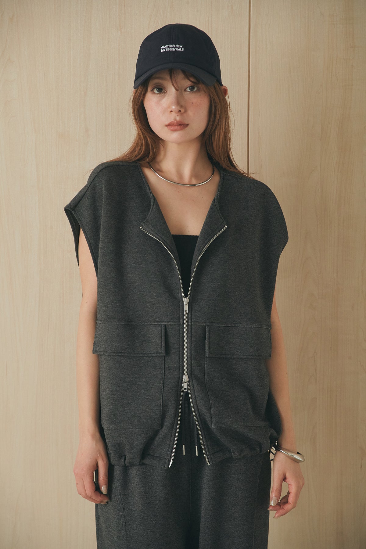 立体感のあるシルエットが魅力のジップベスト。 ハリのあるボンディング生地で仕立て、程よいボリューム感がスタイリングに奥行きをプラスします。フロントジップ仕様で着脱しやすく、シンプルながらも存在感のあるデザインに。 カットソーやワンピースに重ねるだけでバランスよくまとまり、デイリーに取り入れやすいレイヤードアイテムです。