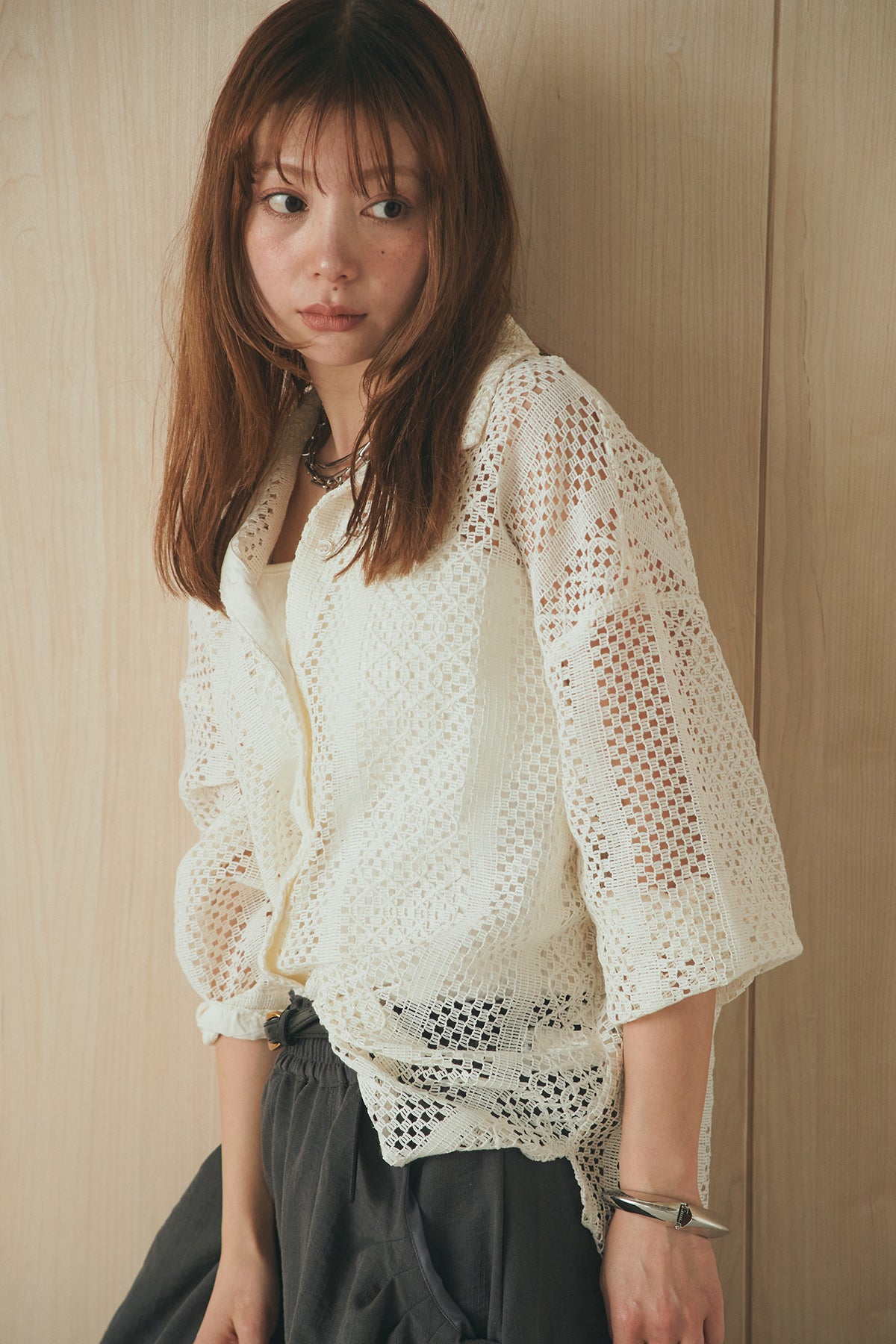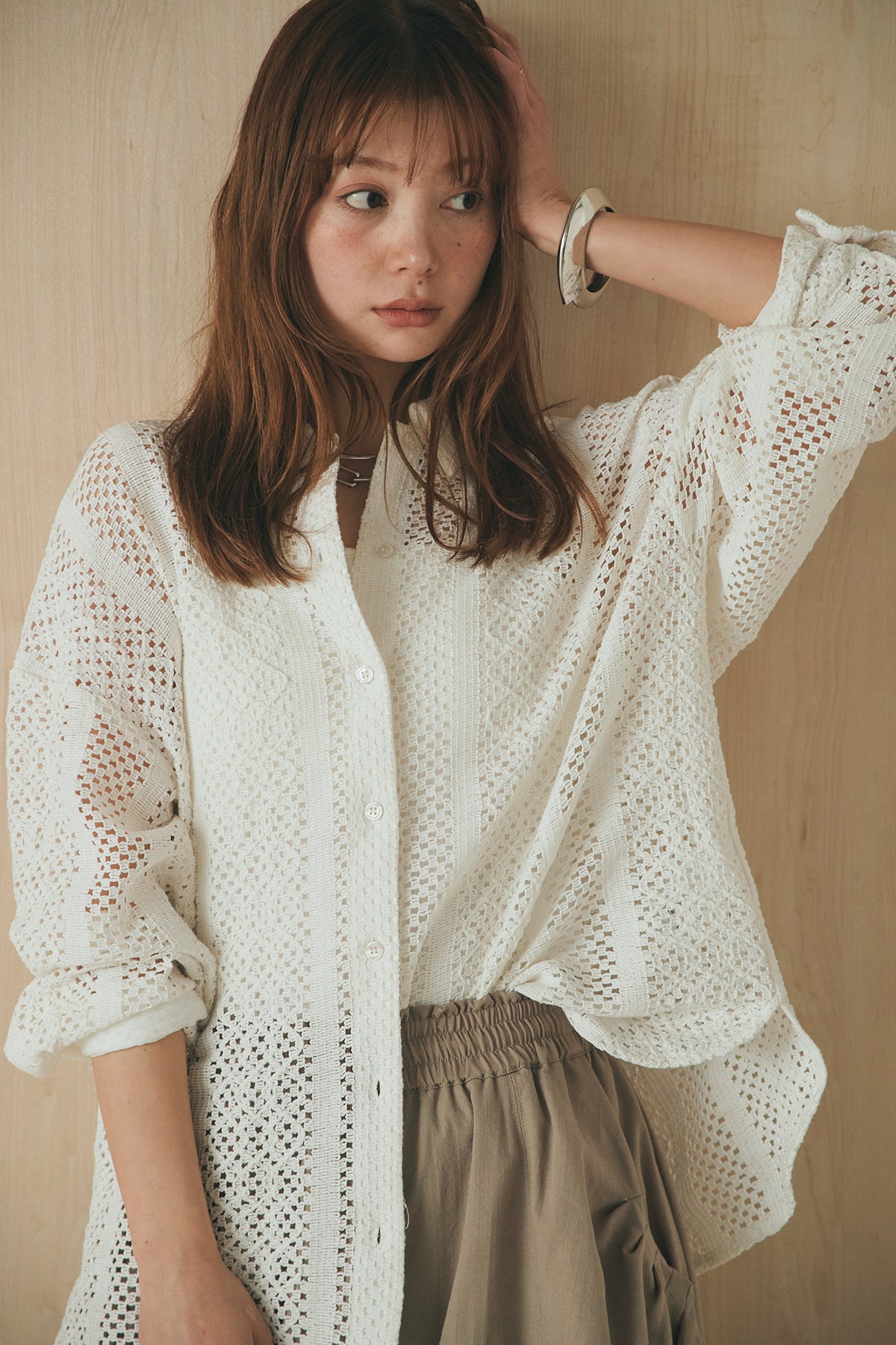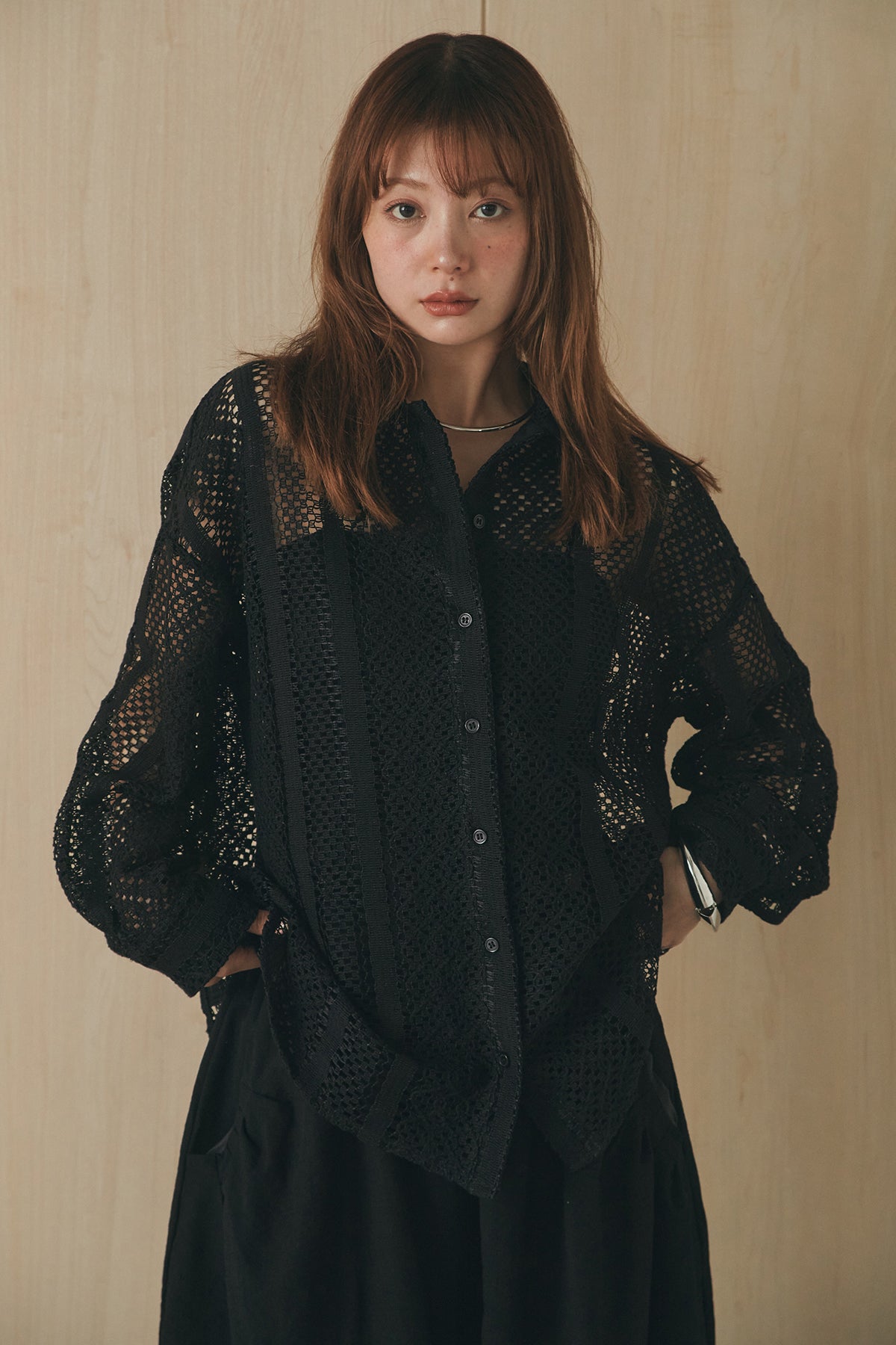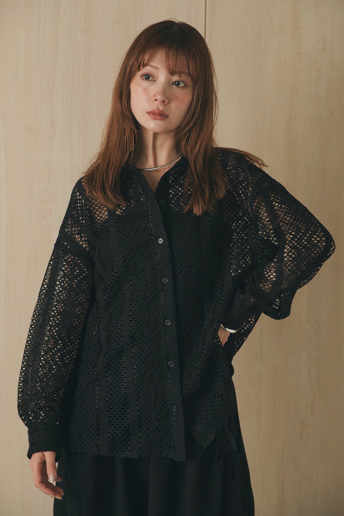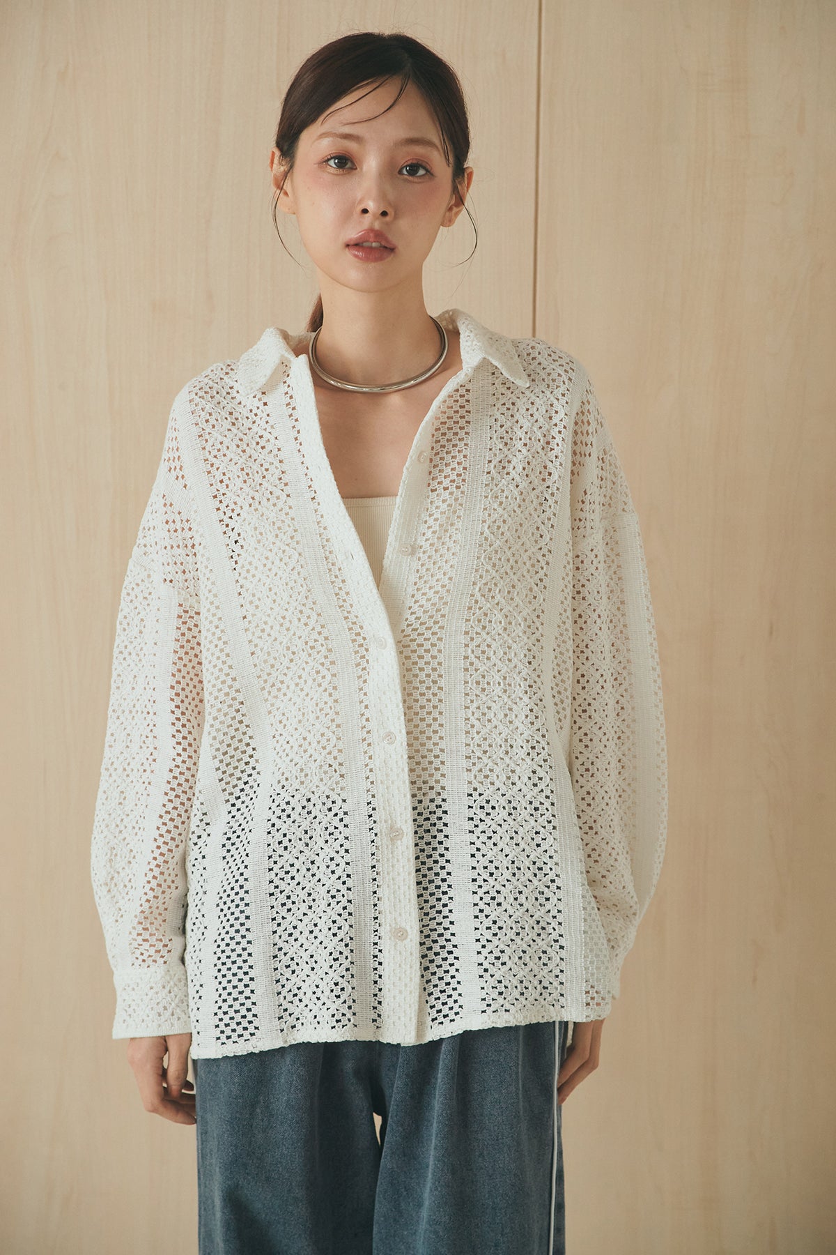 繊細なレースが印象的な長袖襟付きシャツ。 透け感のある軽やかな素材が抜け感を生み、スタイリングにさりげない華やかさをプラスします。ゆとりのあるシルエットでラフに着こなせながらも、襟付きデザインが全体をすっきりとまとめてくれる一枚。 前を閉じてトップスとしても、羽織りとしても活躍し、インナーとのレイヤードで幅広いスタイリングが楽しめるアイテムです。