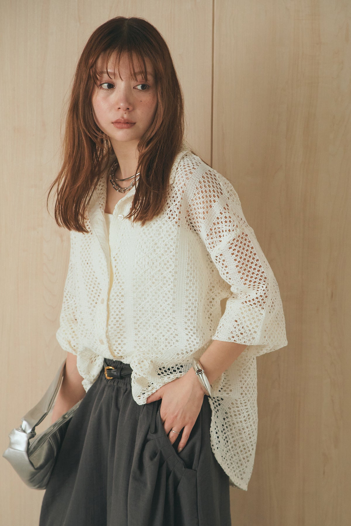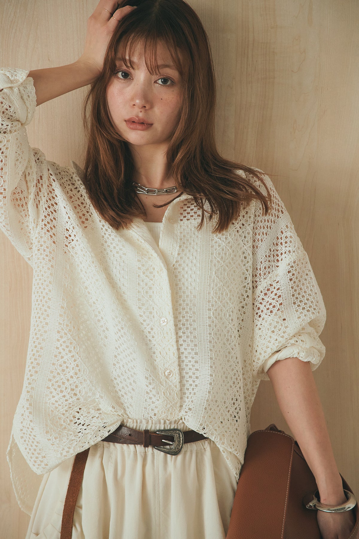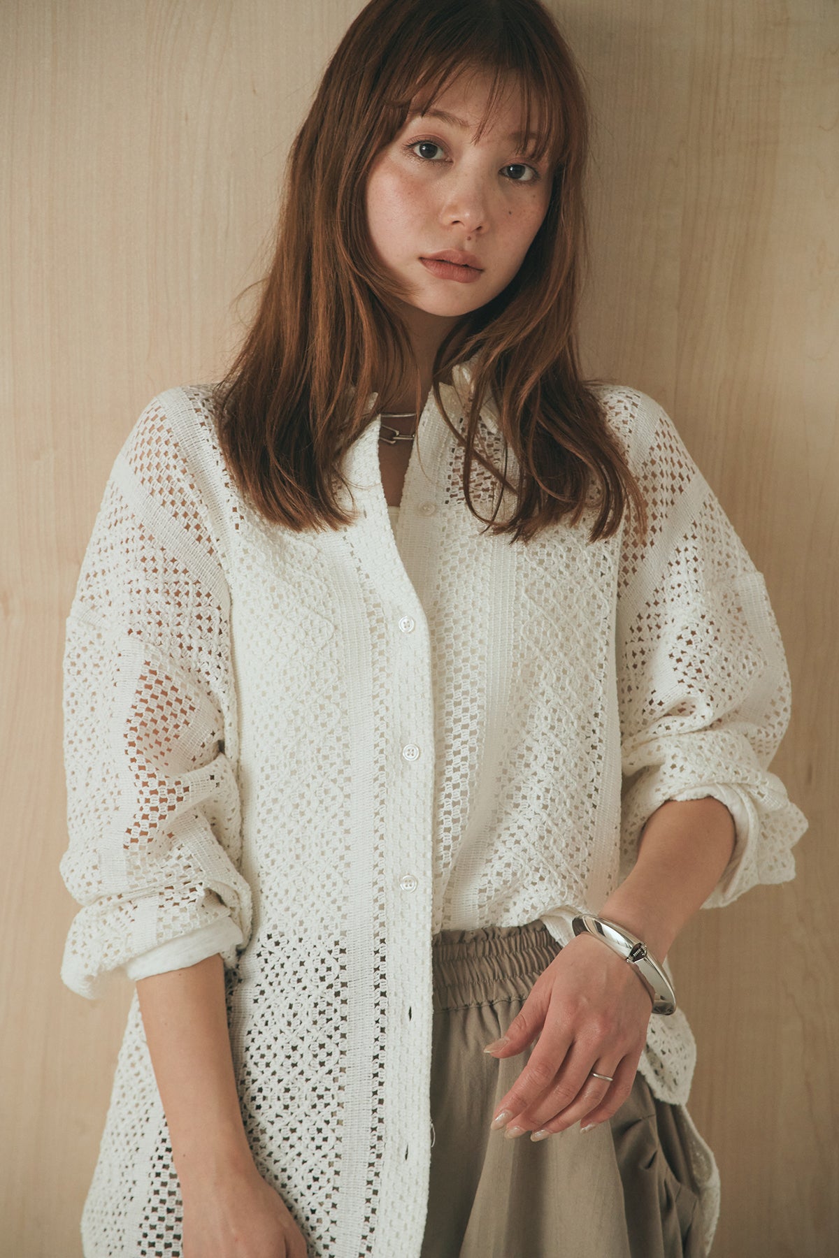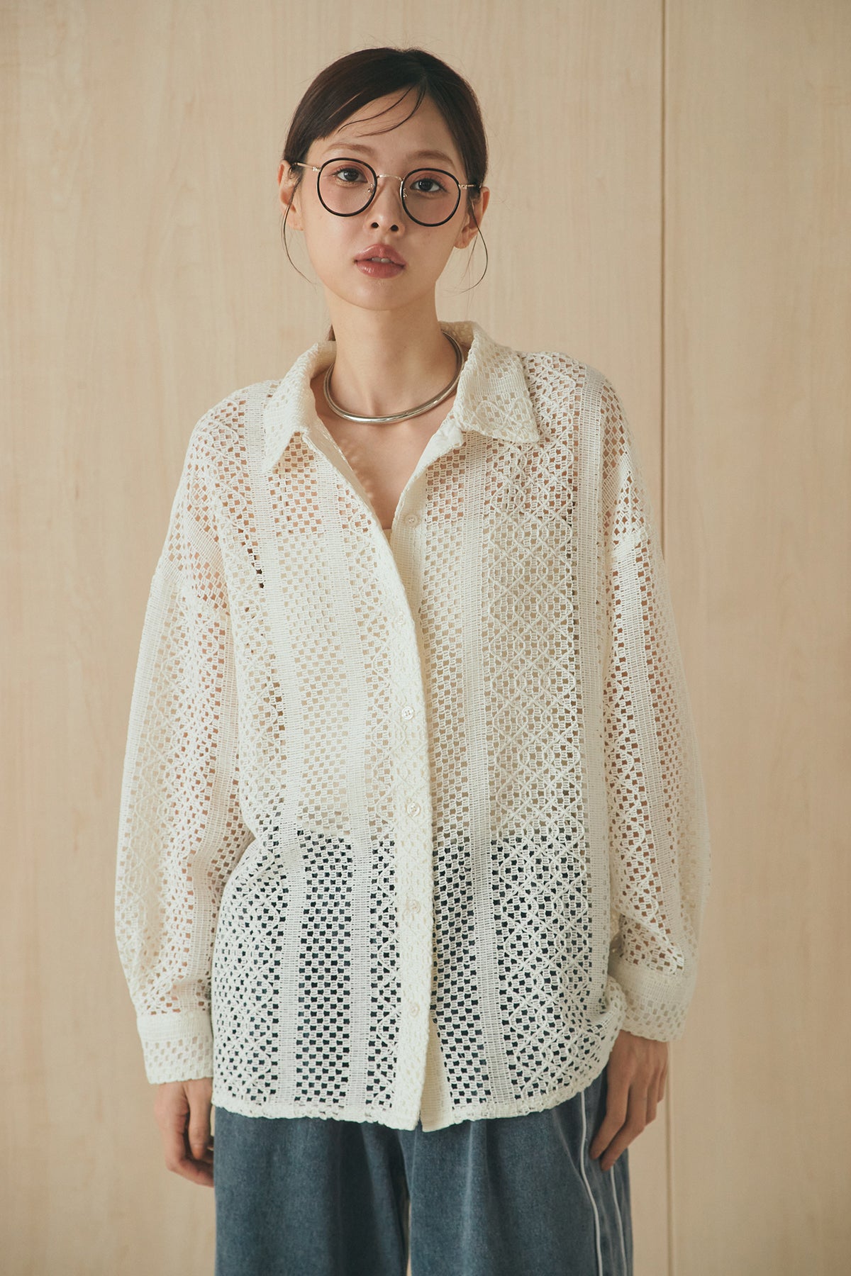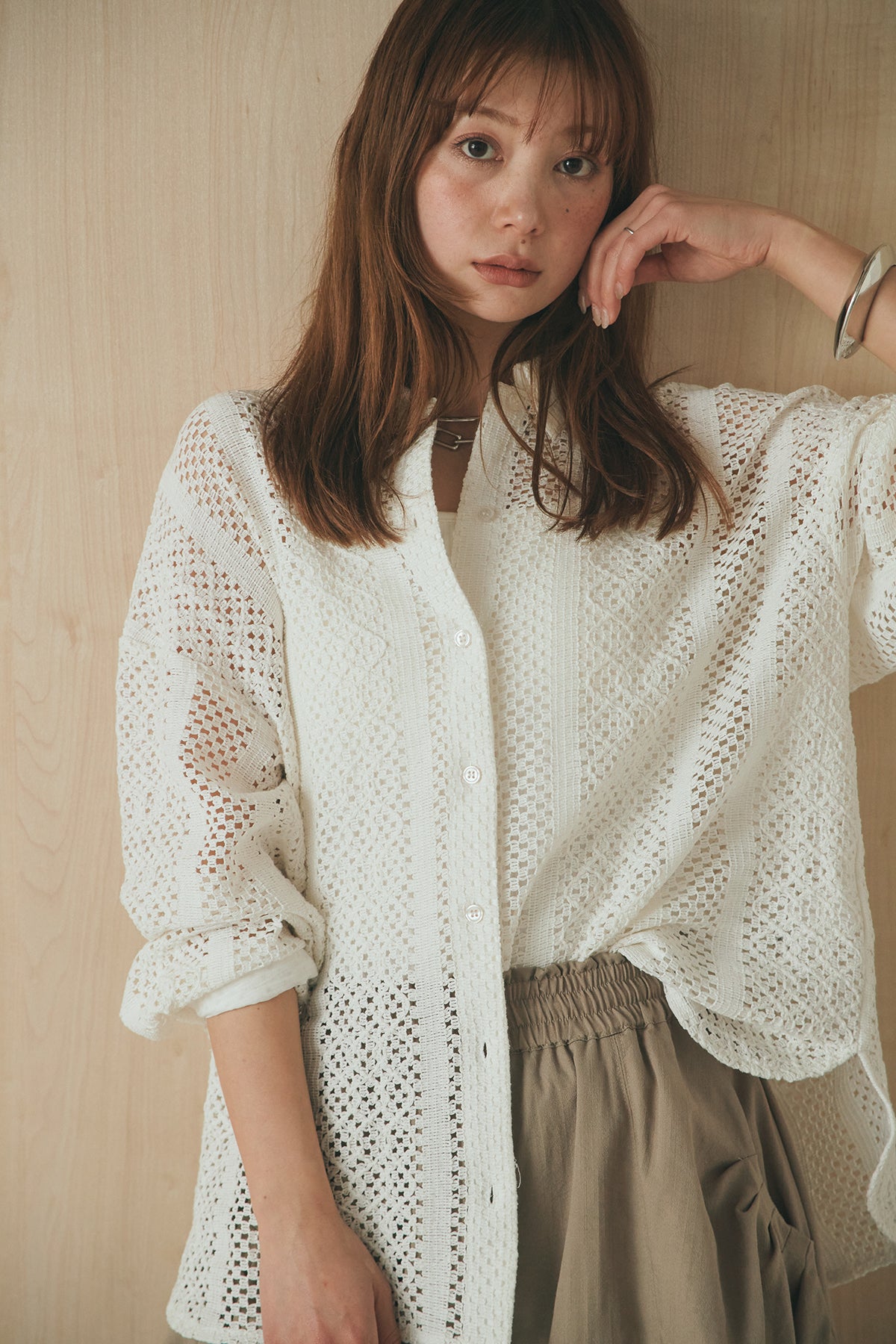 繊細なレースが印象的な長袖襟付きシャツ。 透け感のある軽やかな素材が抜け感を生み、スタイリングにさりげない華やかさをプラスします。ゆとりのあるシルエットでラフに着こなせながらも、襟付きデザインが全体をすっきりとまとめてくれる一枚。 前を閉じてトップスとしても、羽織りとしても活躍し、インナーとのレイヤードで幅広いスタイリングが楽しめるアイテムです。