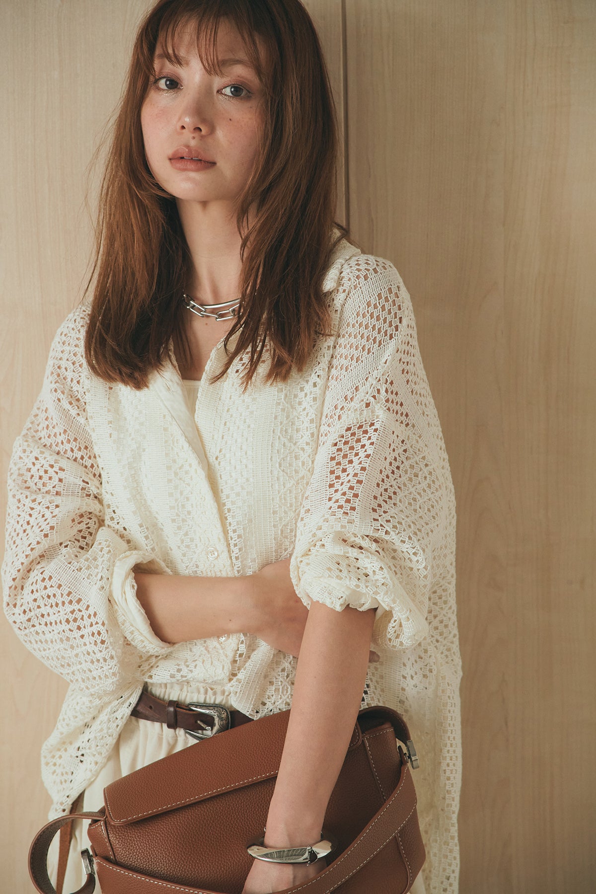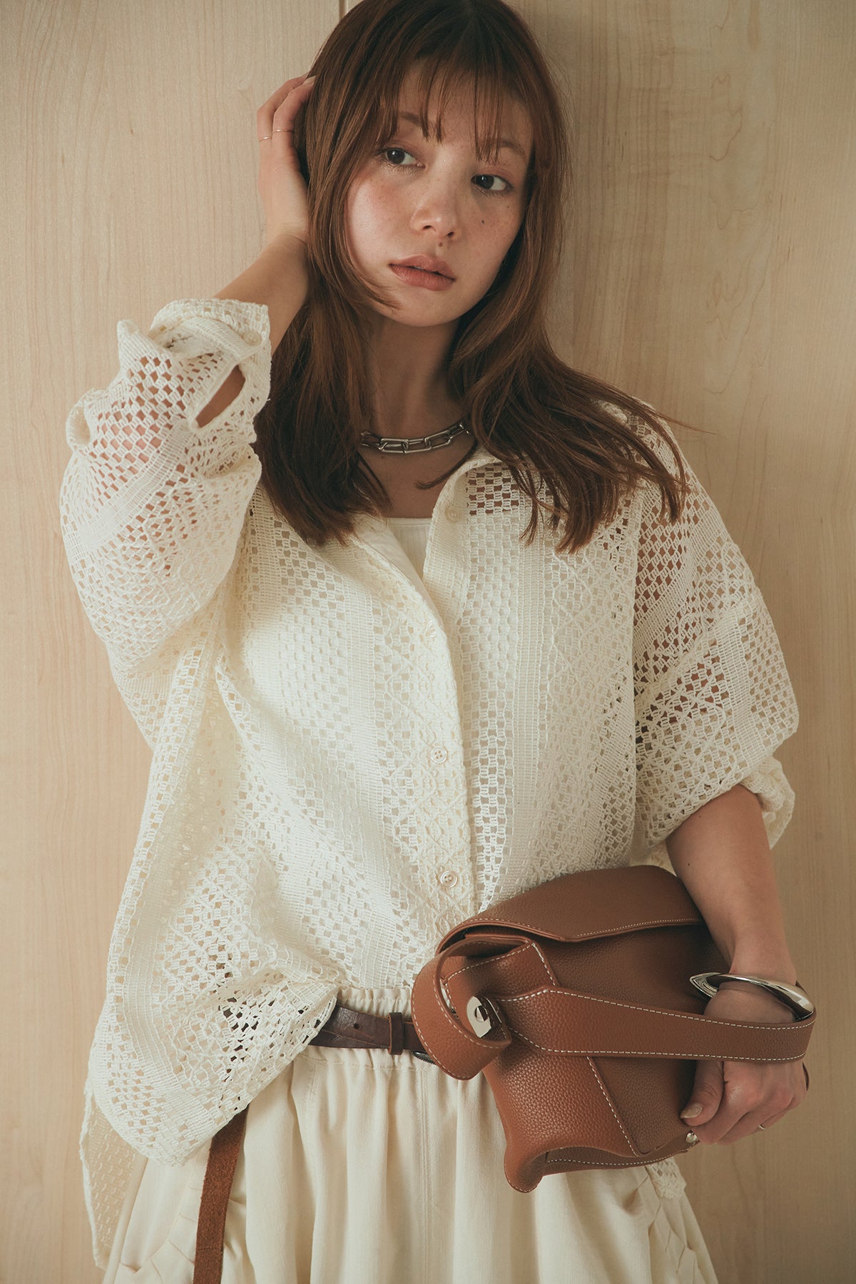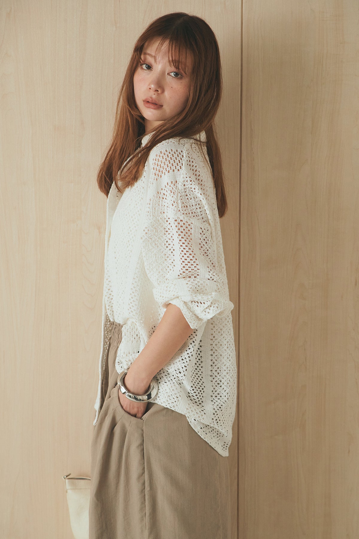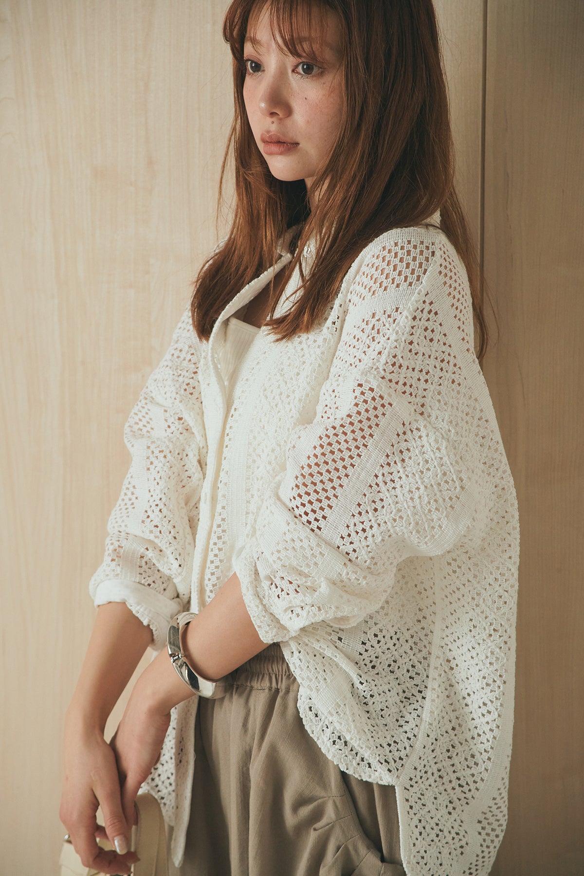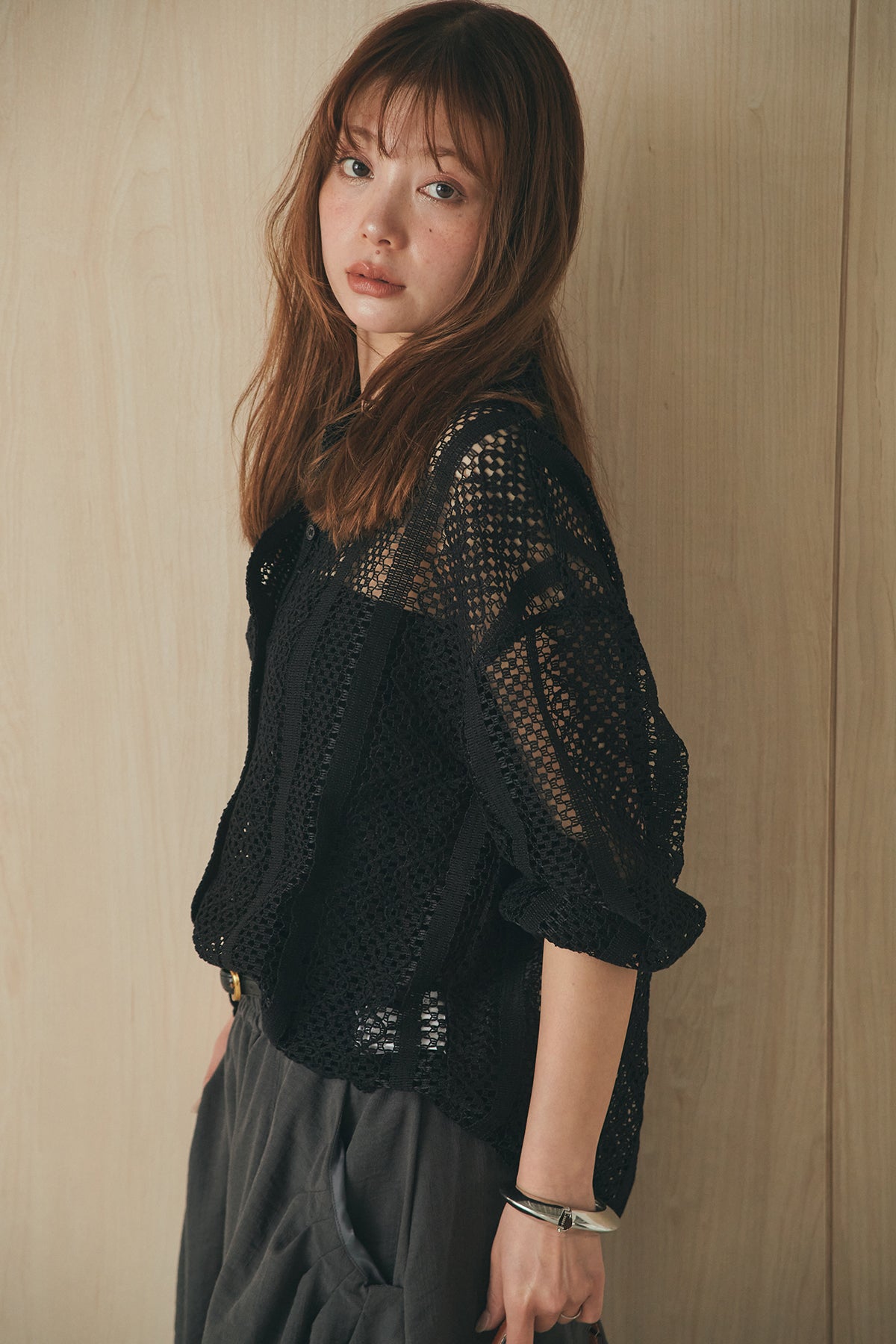 繊細なレースが印象的な長袖襟付きシャツ。 透け感のある軽やかな素材が抜け感を生み、スタイリングにさりげない華やかさをプラスします。ゆとりのあるシルエットでラフに着こなせながらも、襟付きデザインが全体をすっきりとまとめてくれる一枚。 前を閉じてトップスとしても、羽織りとしても活躍し、インナーとのレイヤードで幅広いスタイリングが楽しめるアイテムです。