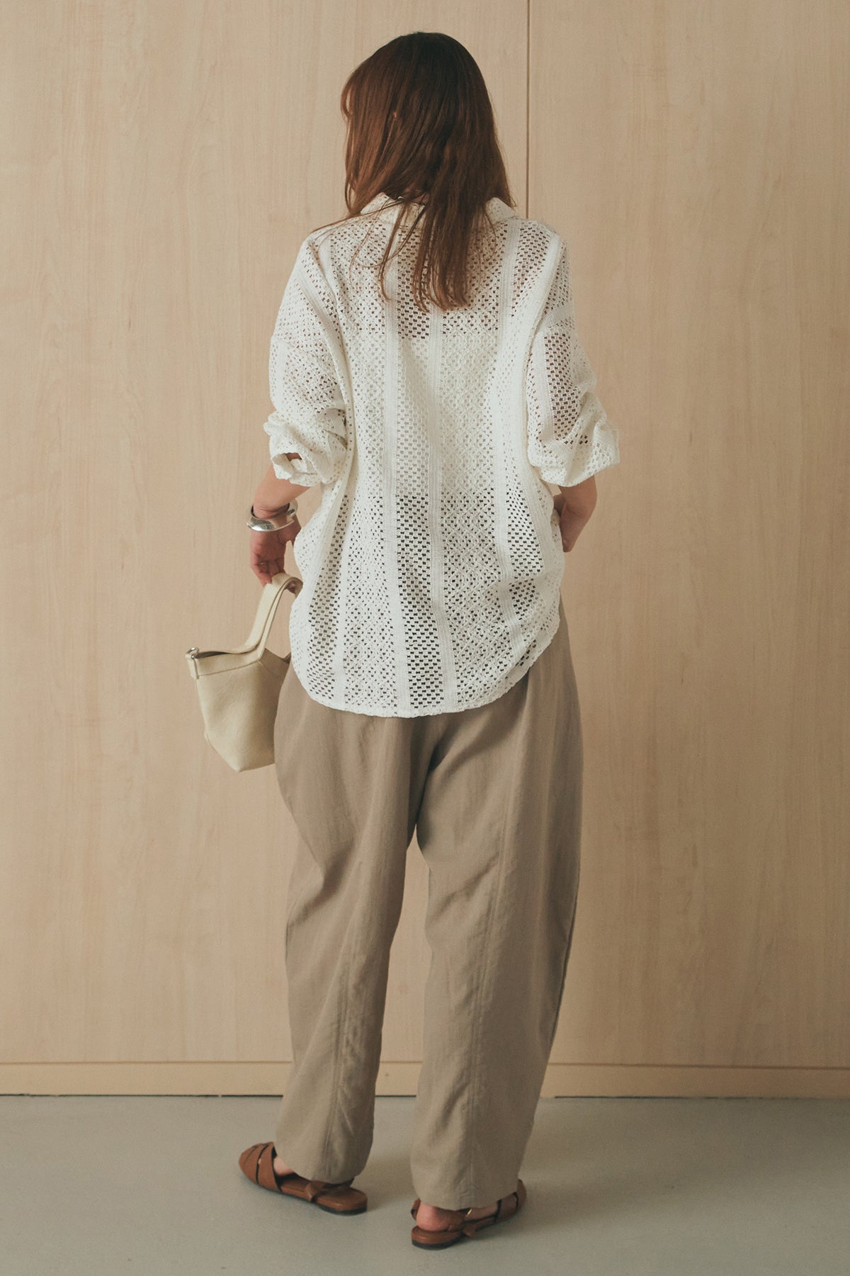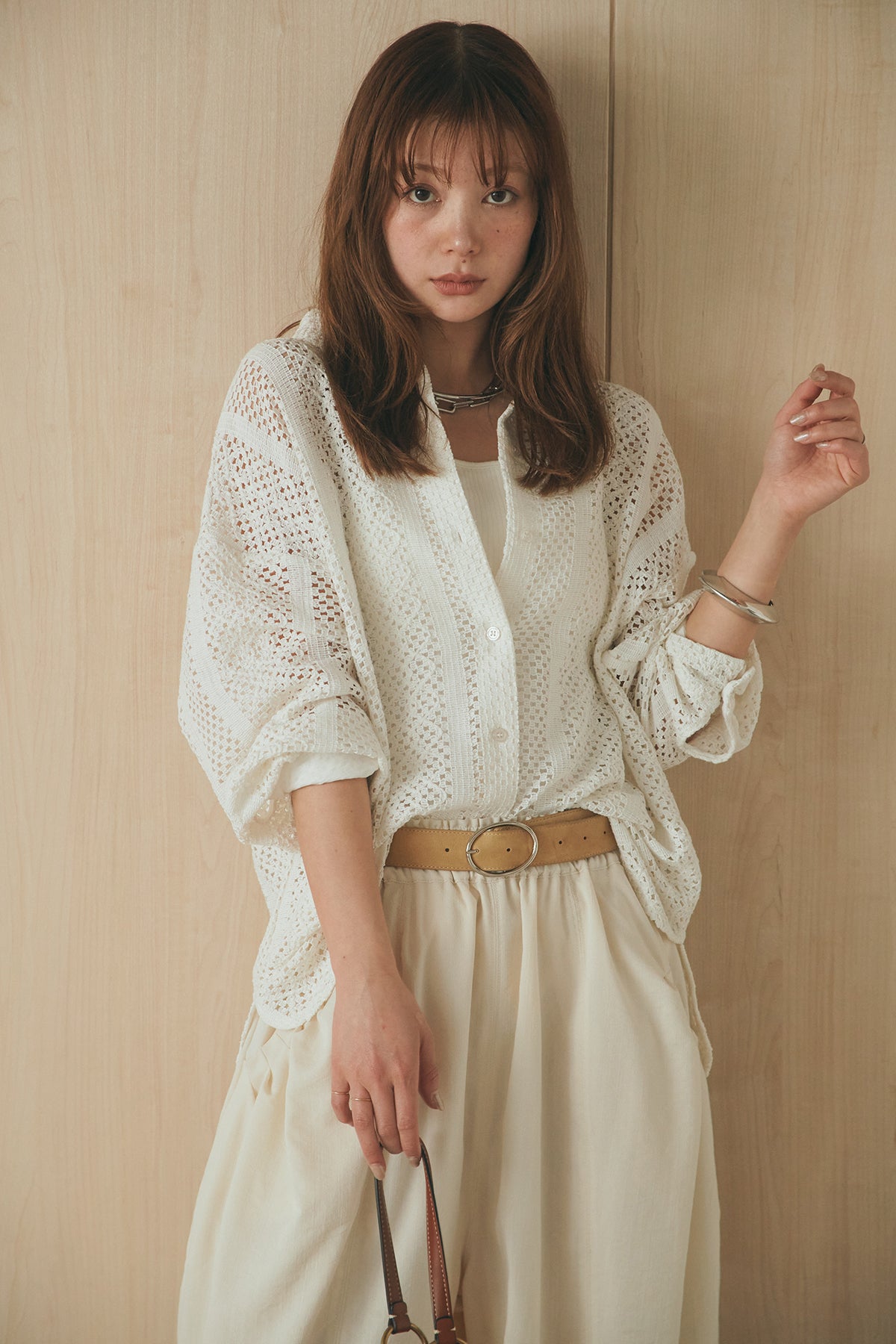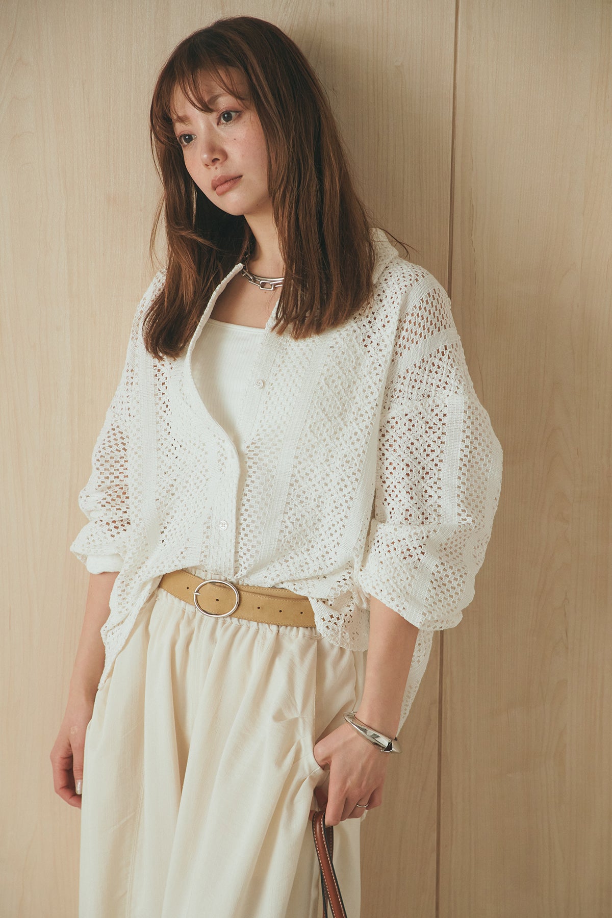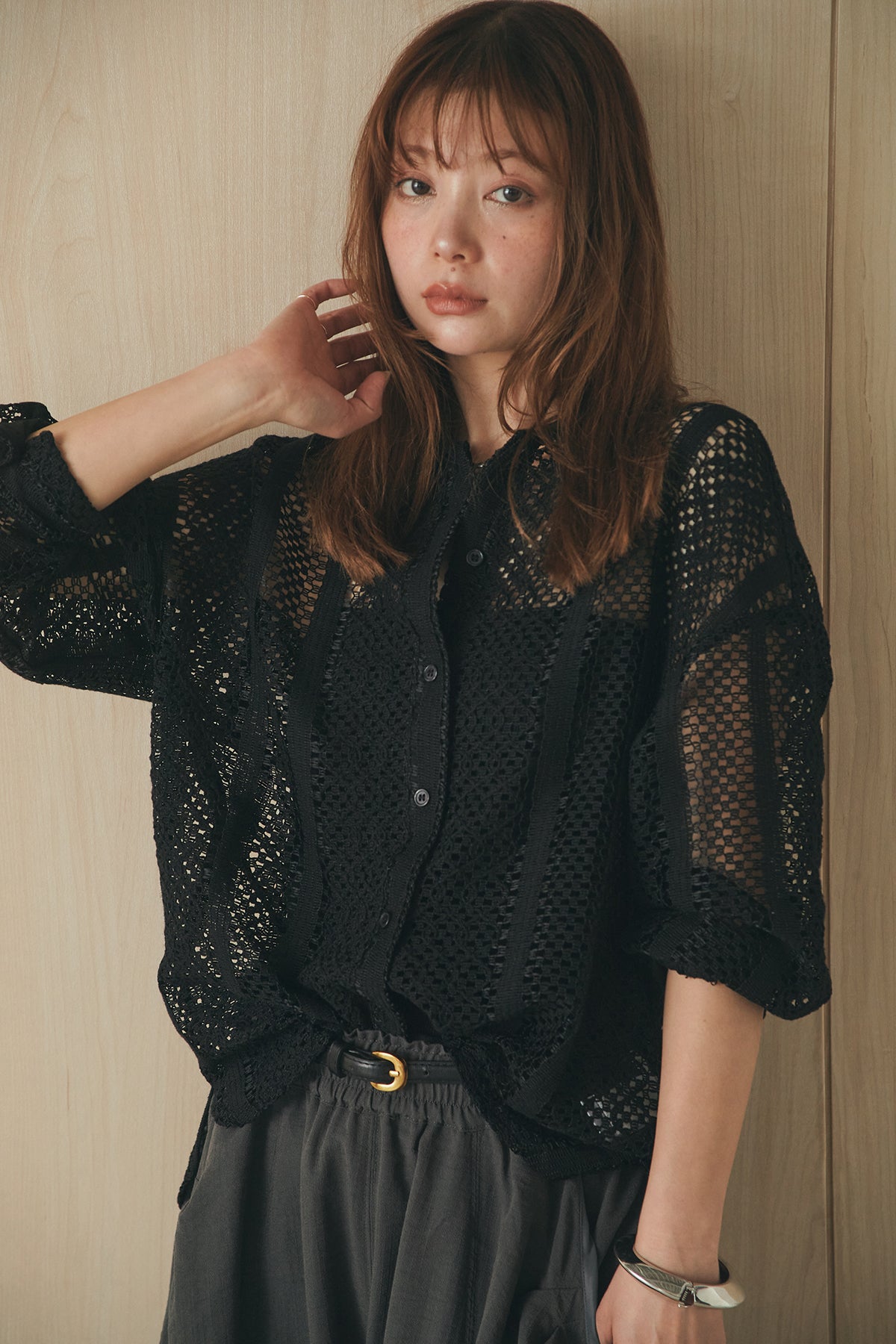 繊細なレースが印象的な長袖襟付きシャツ。 透け感のある軽やかな素材が抜け感を生み、スタイリングにさりげない華やかさをプラスします。ゆとりのあるシルエットでラフに着こなせながらも、襟付きデザインが全体をすっきりとまとめてくれる一枚。 前を閉じてトップスとしても、羽織りとしても活躍し、インナーとのレイヤードで幅広いスタイリングが楽しめるアイテムです。