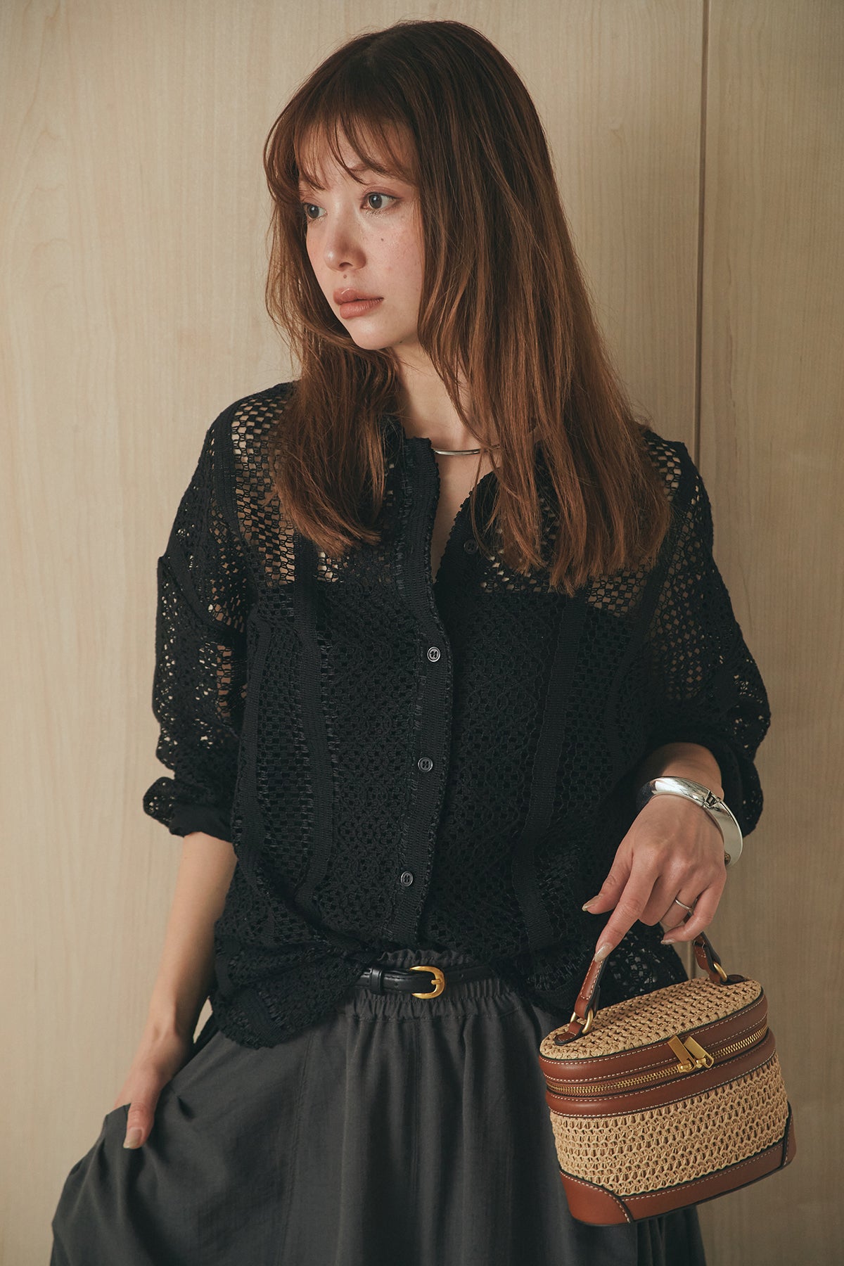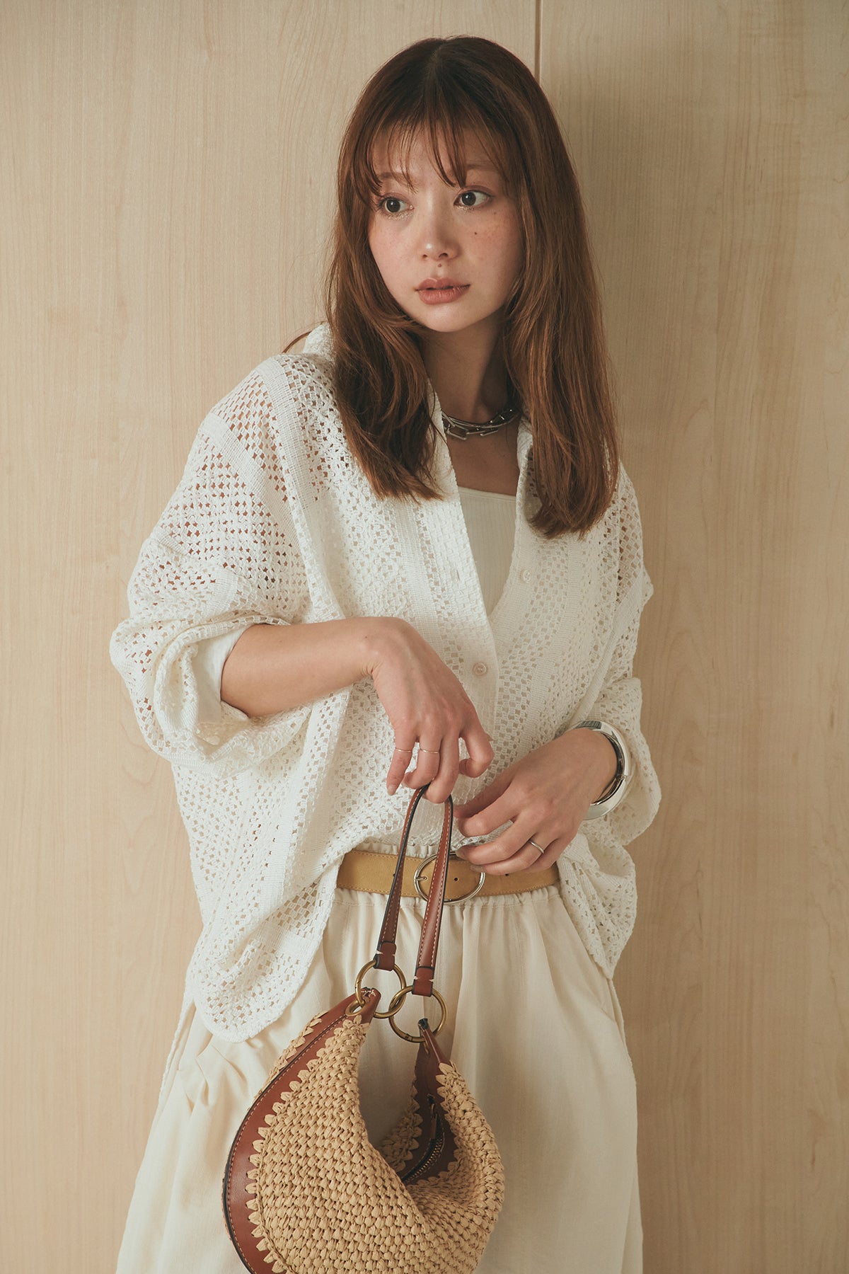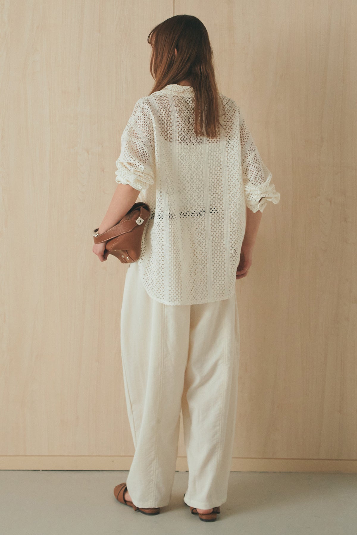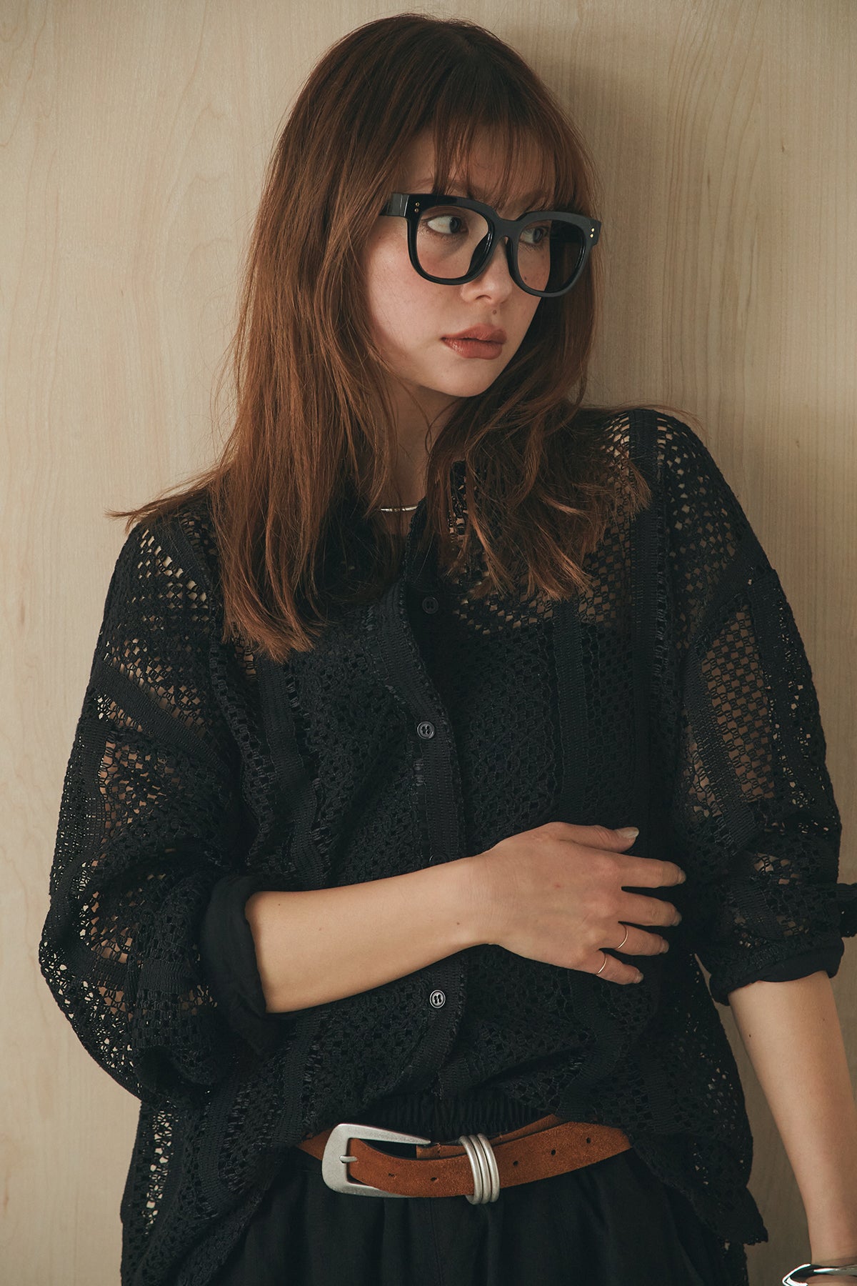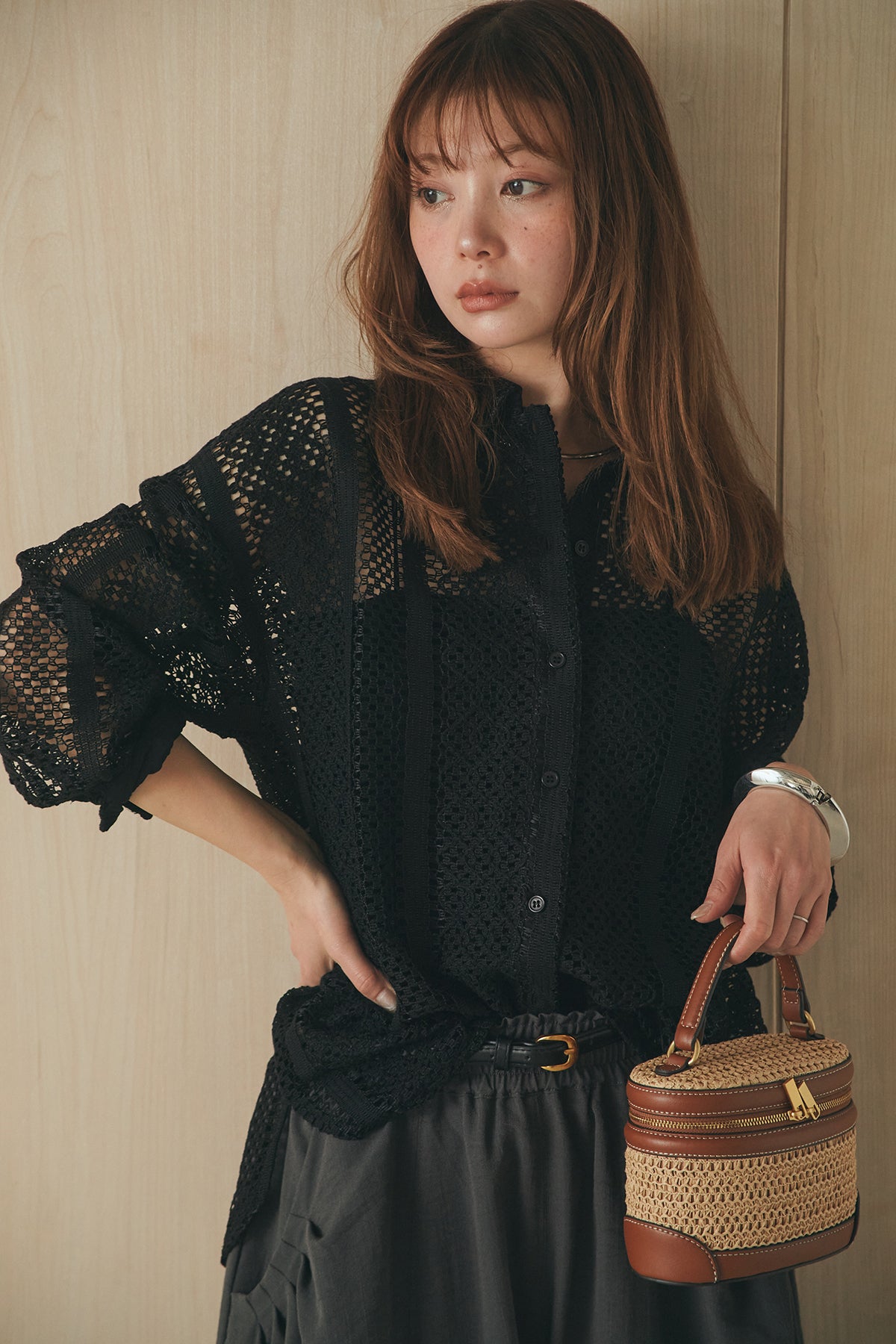 繊細なレースが印象的な長袖襟付きシャツ。 透け感のある軽やかな素材が抜け感を生み、スタイリングにさりげない華やかさをプラスします。ゆとりのあるシルエットでラフに着こなせながらも、襟付きデザインが全体をすっきりとまとめてくれる一枚。 前を閉じてトップスとしても、羽織りとしても活躍し、インナーとのレイヤードで幅広いスタイリングが楽しめるアイテムです。