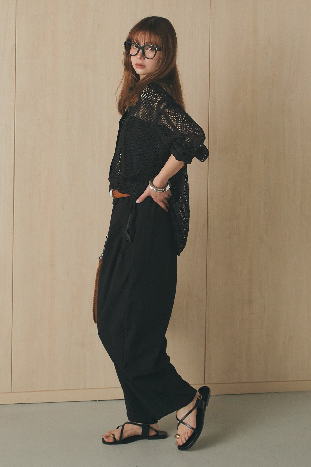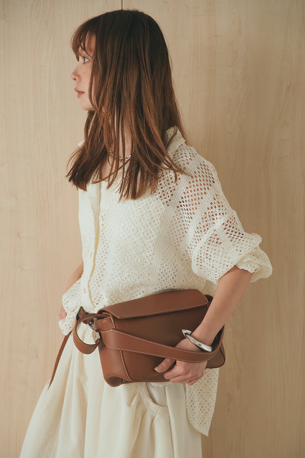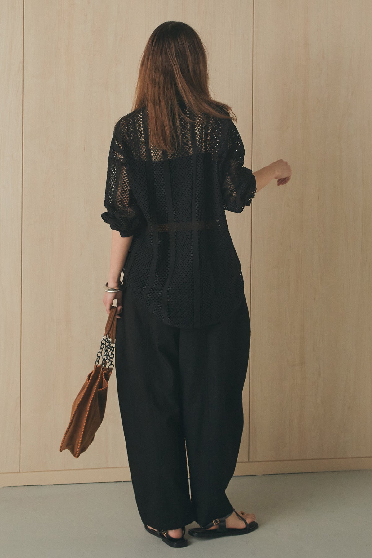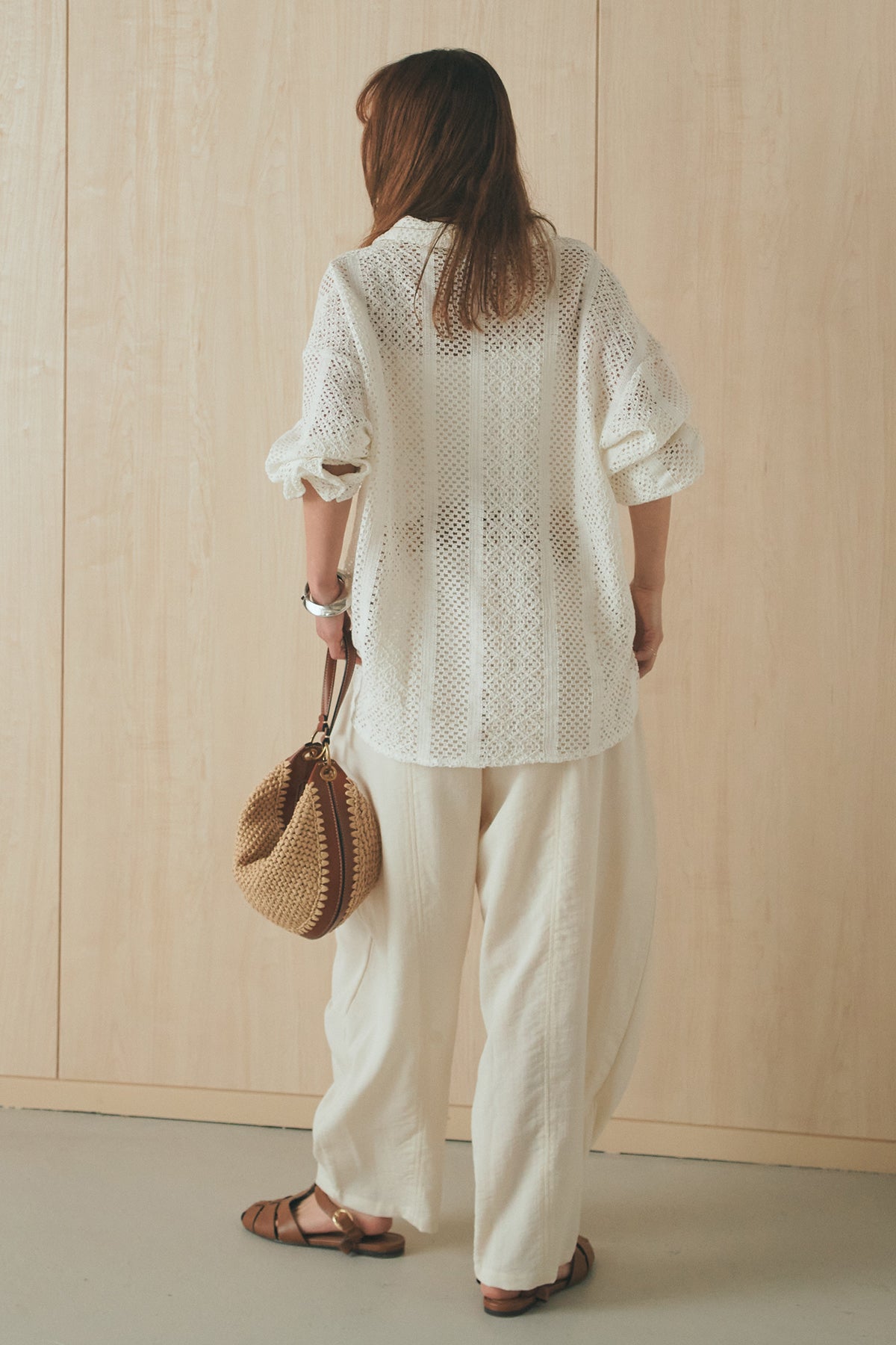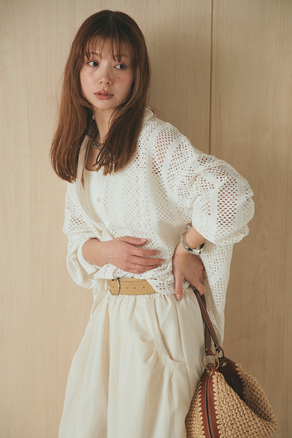 繊細なレースが印象的な長袖襟付きシャツ。 透け感のある軽やかな素材が抜け感を生み、スタイリングにさりげない華やかさをプラスします。ゆとりのあるシルエットでラフに着こなせながらも、襟付きデザインが全体をすっきりとまとめてくれる一枚。 前を閉じてトップスとしても、羽織りとしても活躍し、インナーとのレイヤードで幅広いスタイリングが楽しめるアイテムです。
