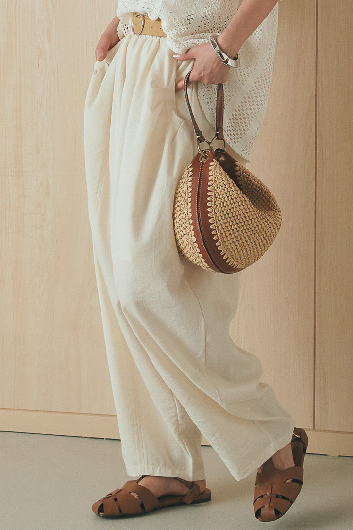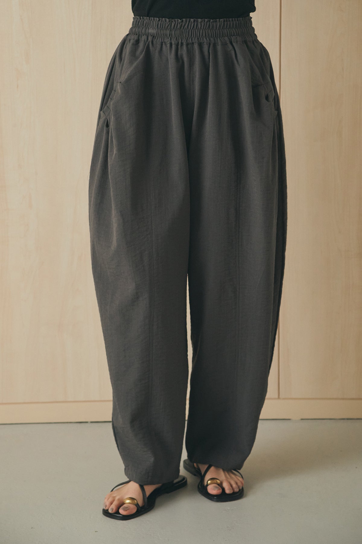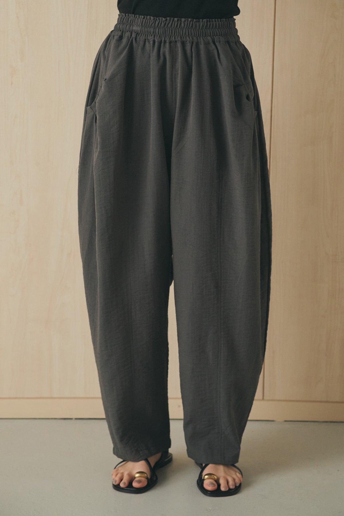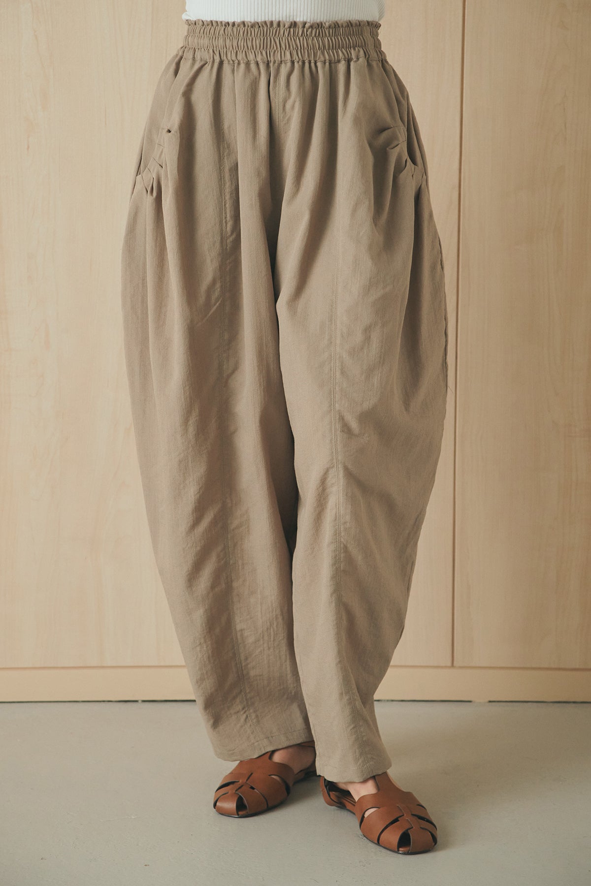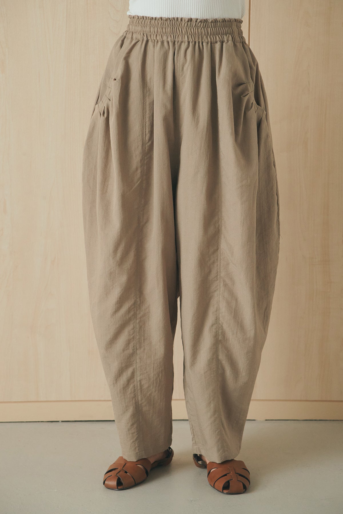 立体感のあるフォルムが印象的なタックパンツ。 ポケット部分に施したタックデザインがシルエットに奥行きを生み、ゆとりのあるラインながらもすっきりとしたバランスに仕上げました。軽やかな素材感でリラックスした穿き心地を叶えつつ、さりげないデザイン性をプラス。 ウエストはゴム仕様で快適に着用でき、シンプルなトップス合わせでもスタイリングに表情が生まれる一本です。