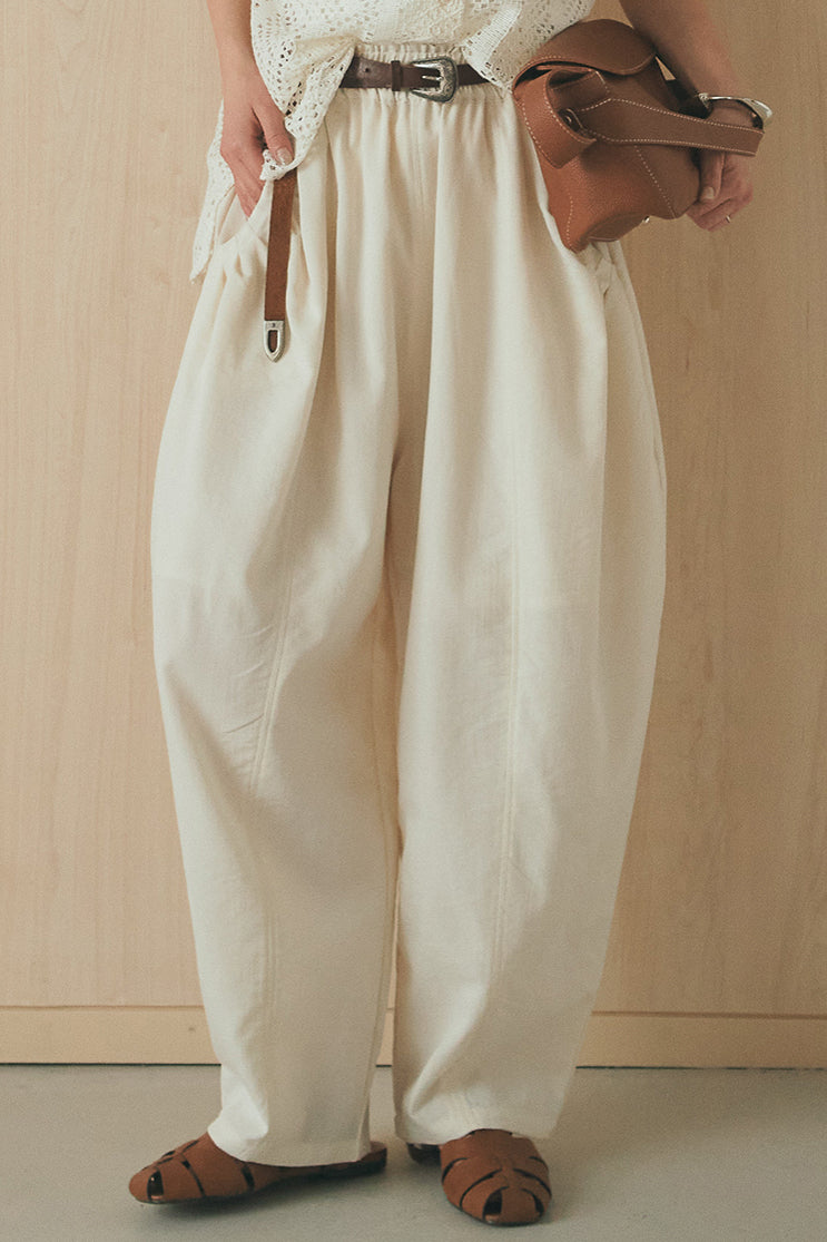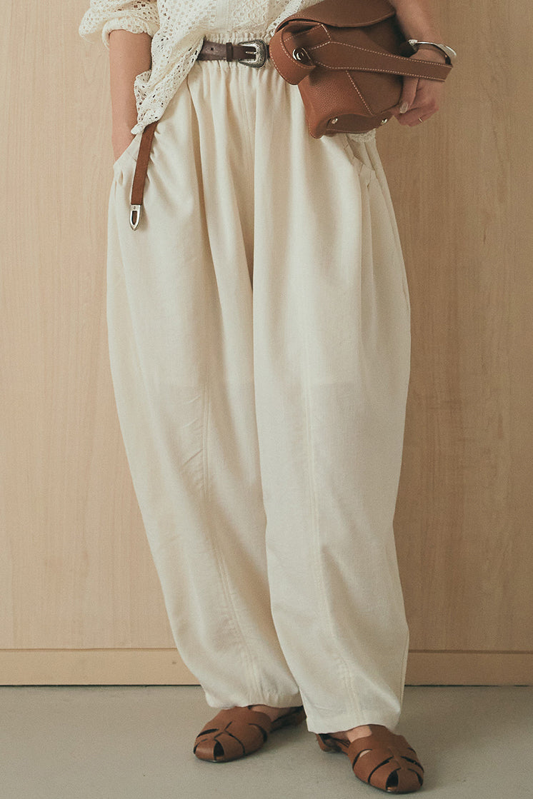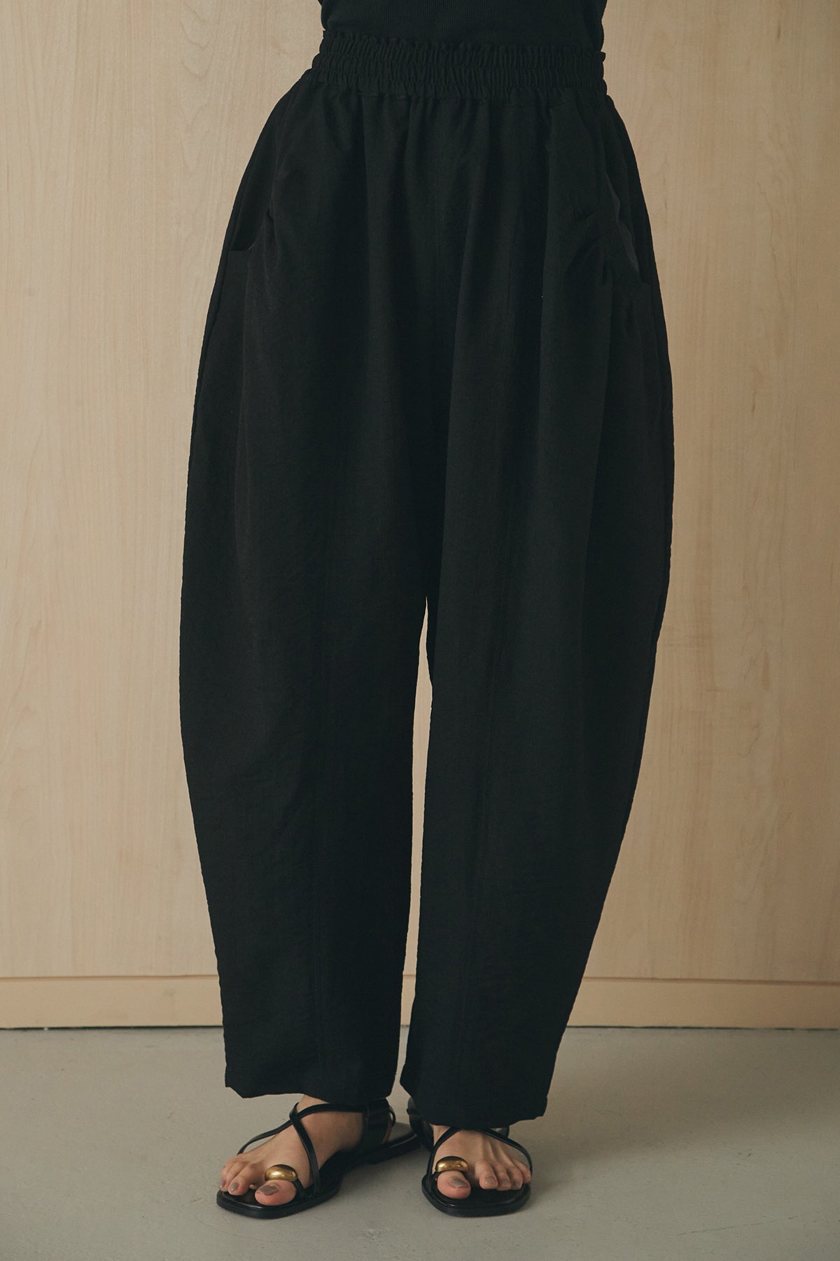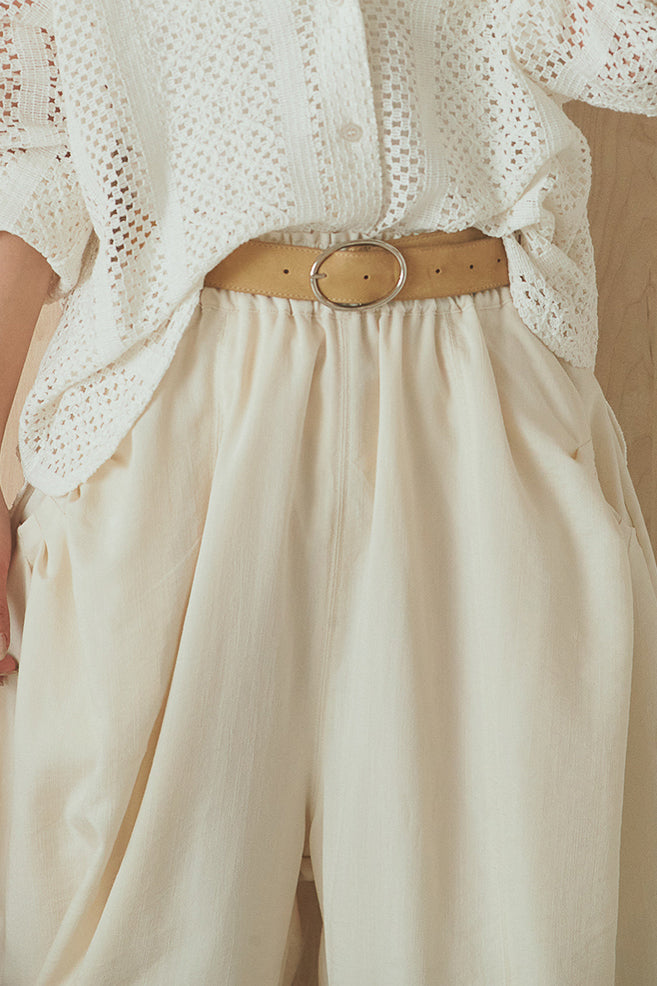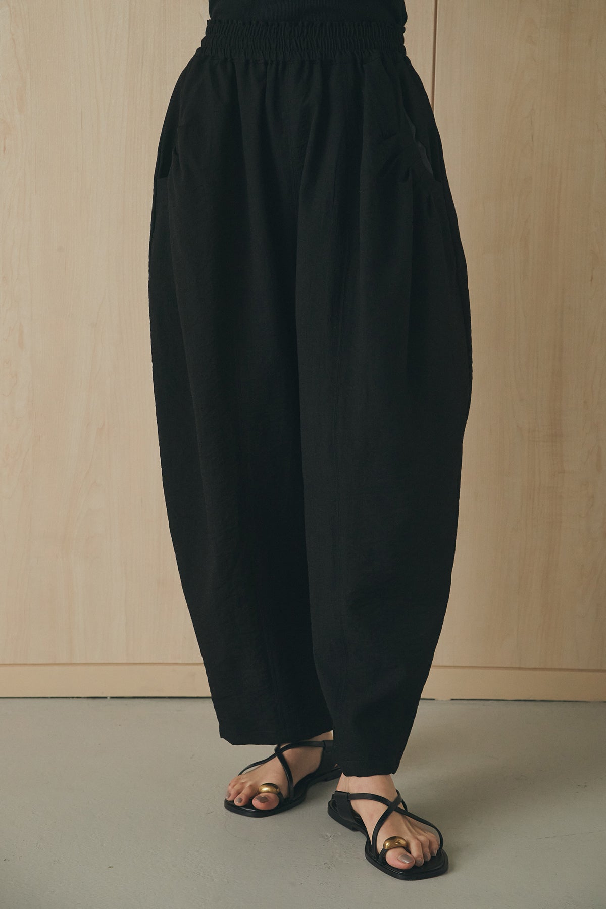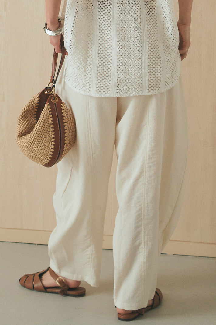 立体感のあるフォルムが印象的なタックパンツ。 ポケット部分に施したタックデザインがシルエットに奥行きを生み、ゆとりのあるラインながらもすっきりとしたバランスに仕上げました。軽やかな素材感でリラックスした穿き心地を叶えつつ、さりげないデザイン性をプラス。 ウエストはゴム仕様で快適に着用でき、シンプルなトップス合わせでもスタイリングに表情が生まれる一本です。