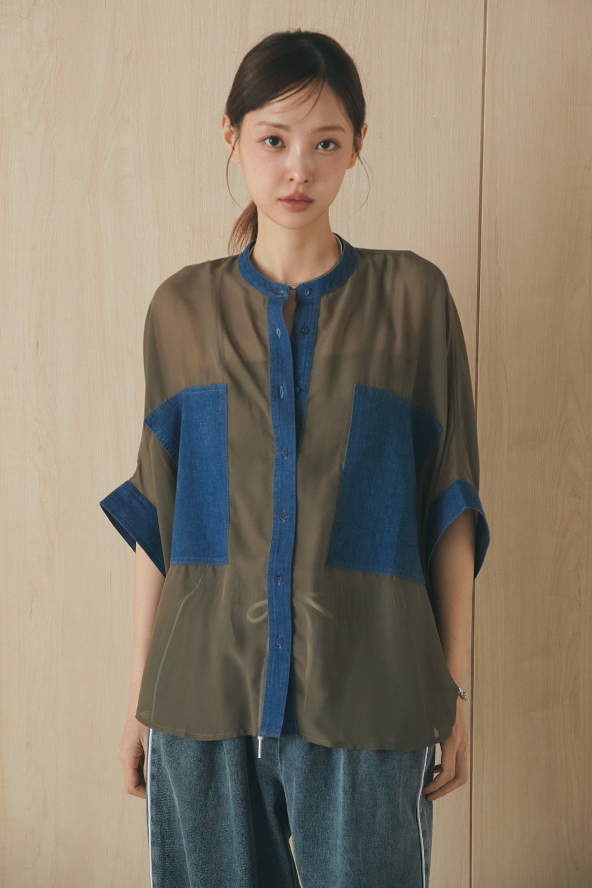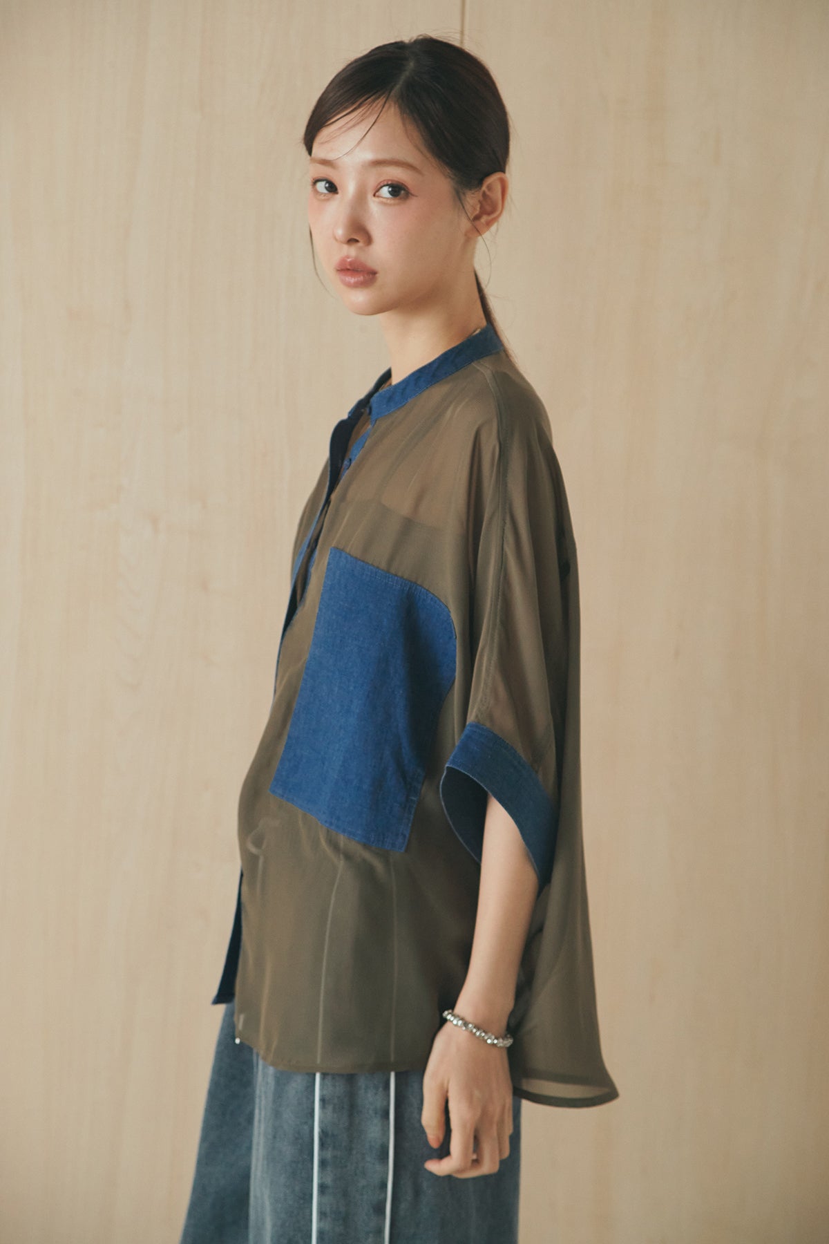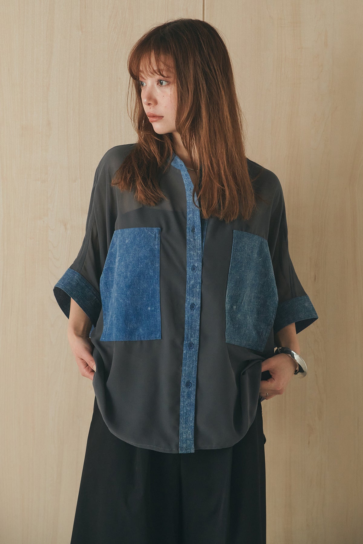 シアー素材にデニムライクなディテールを組み合わせたシャツ。 透け感のある軽やかな生地に、大きめのツーポケットデザインがアクセントとなり、シンプルながらも存在感のある一枚に仕上げました。ゆとりのあるシルエットでさらっと羽織りやすく、抜け感のあるスタイリングに。 前を閉じてトップスとしても、羽織りとしても活躍し、インナーとのレイヤードで幅広い着こなしが楽しめるアイテムです。