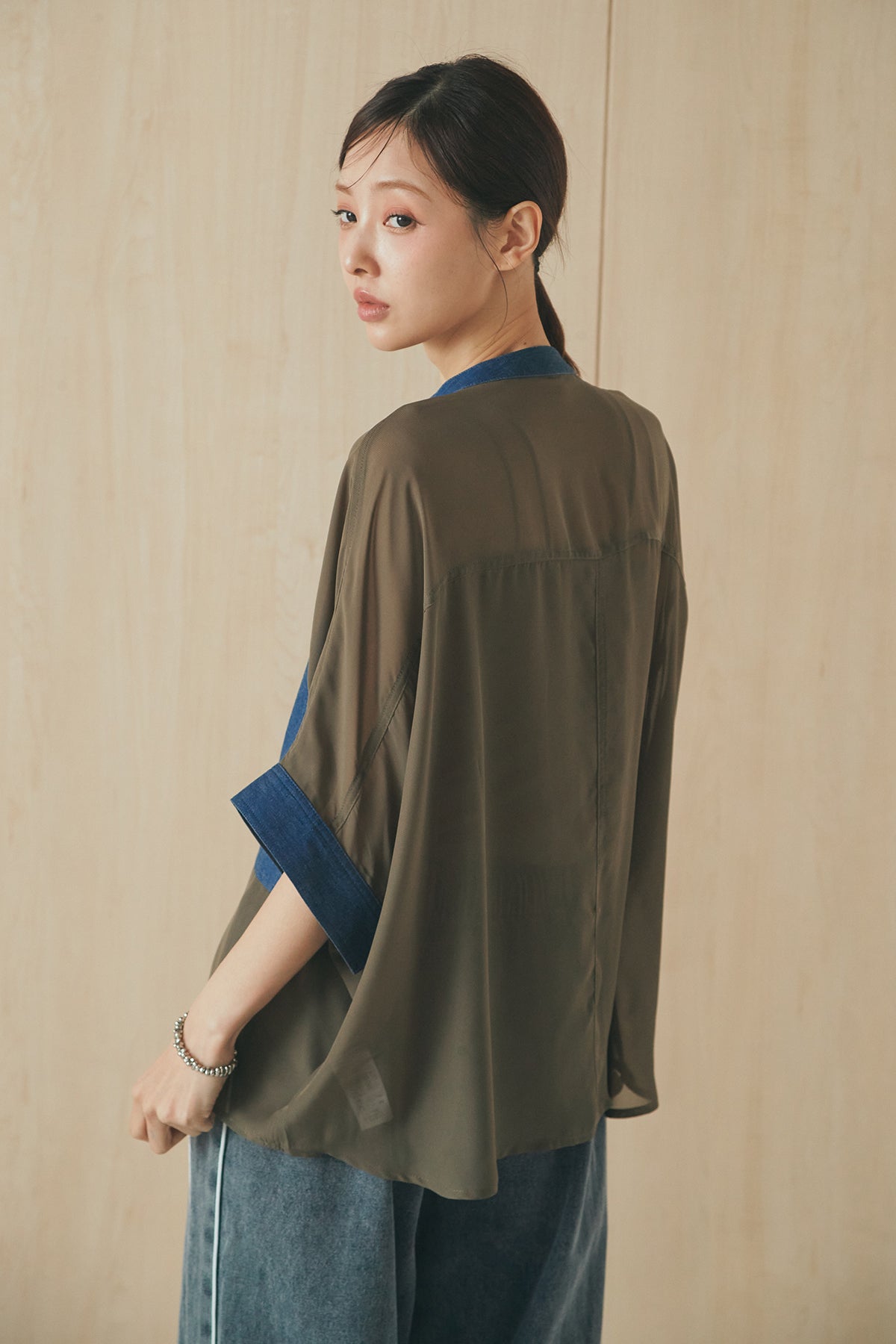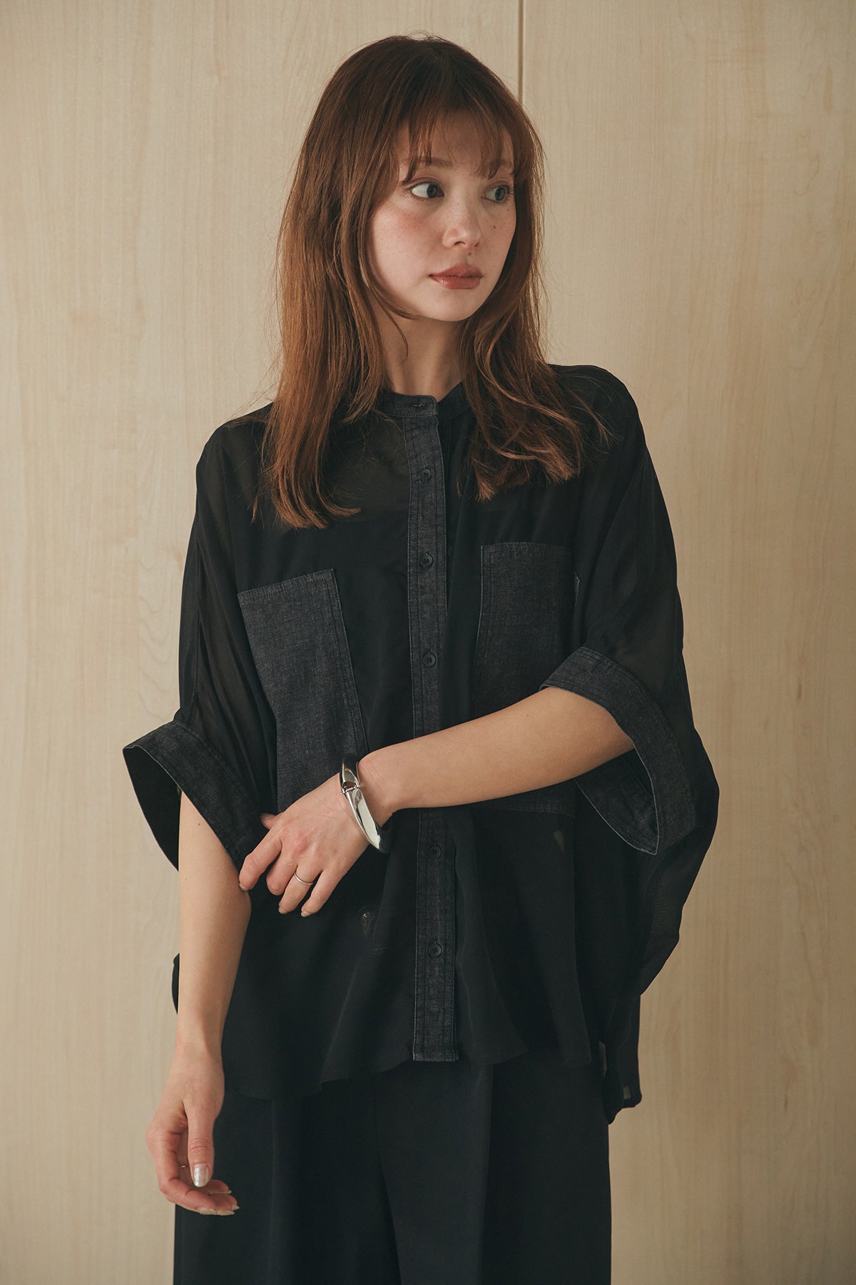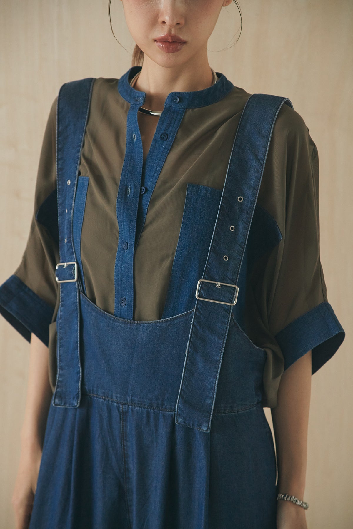シアー素材にデニムライクなディテールを組み合わせたシャツ。 透け感のある軽やかな生地に、大きめのツーポケットデザインがアクセントとなり、シンプルながらも存在感のある一枚に仕上げました。ゆとりのあるシルエットでさらっと羽織りやすく、抜け感のあるスタイリングに。 前を閉じてトップスとしても、羽織りとしても活躍し、インナーとのレイヤードで幅広い着こなしが楽しめるアイテムです。