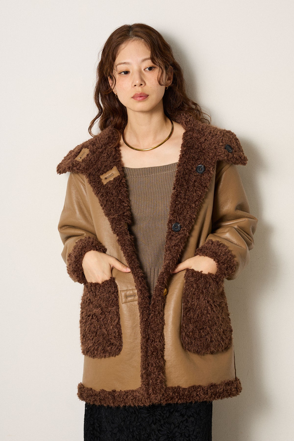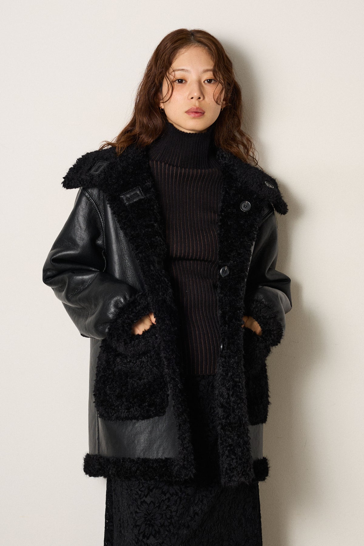 ふんわりとしたボア素材がシーズンムードを高めるリバーシブルアウター。ボア面とエコレザー面、どちらを表にしても着られる2WAY仕様で、スタイリングの幅が広がります。ゆったりとしたシルエットで厚手のニットも重ねやすく、寒い季節も快適に。カジュアルからシックまで幅広いコーデにマッチする、万能な一着です。
