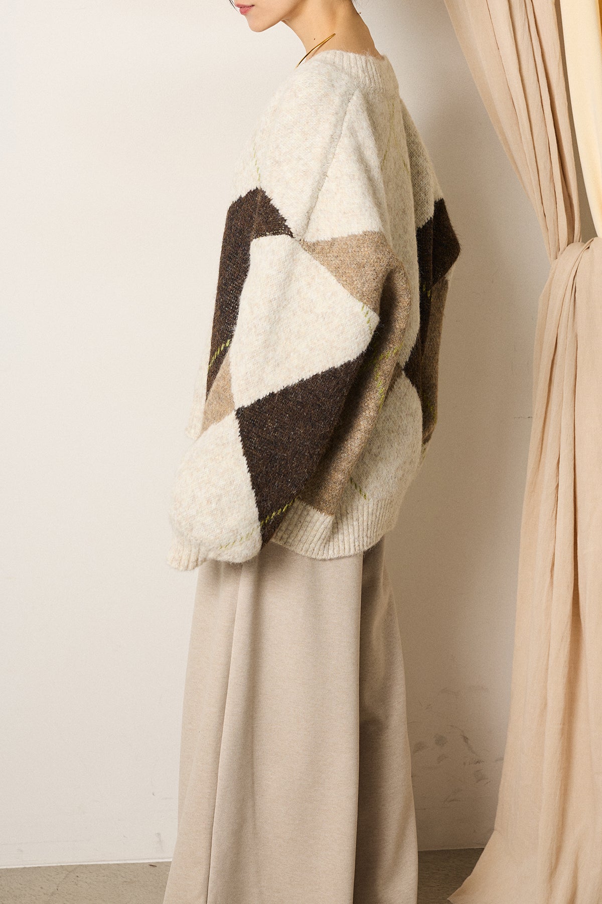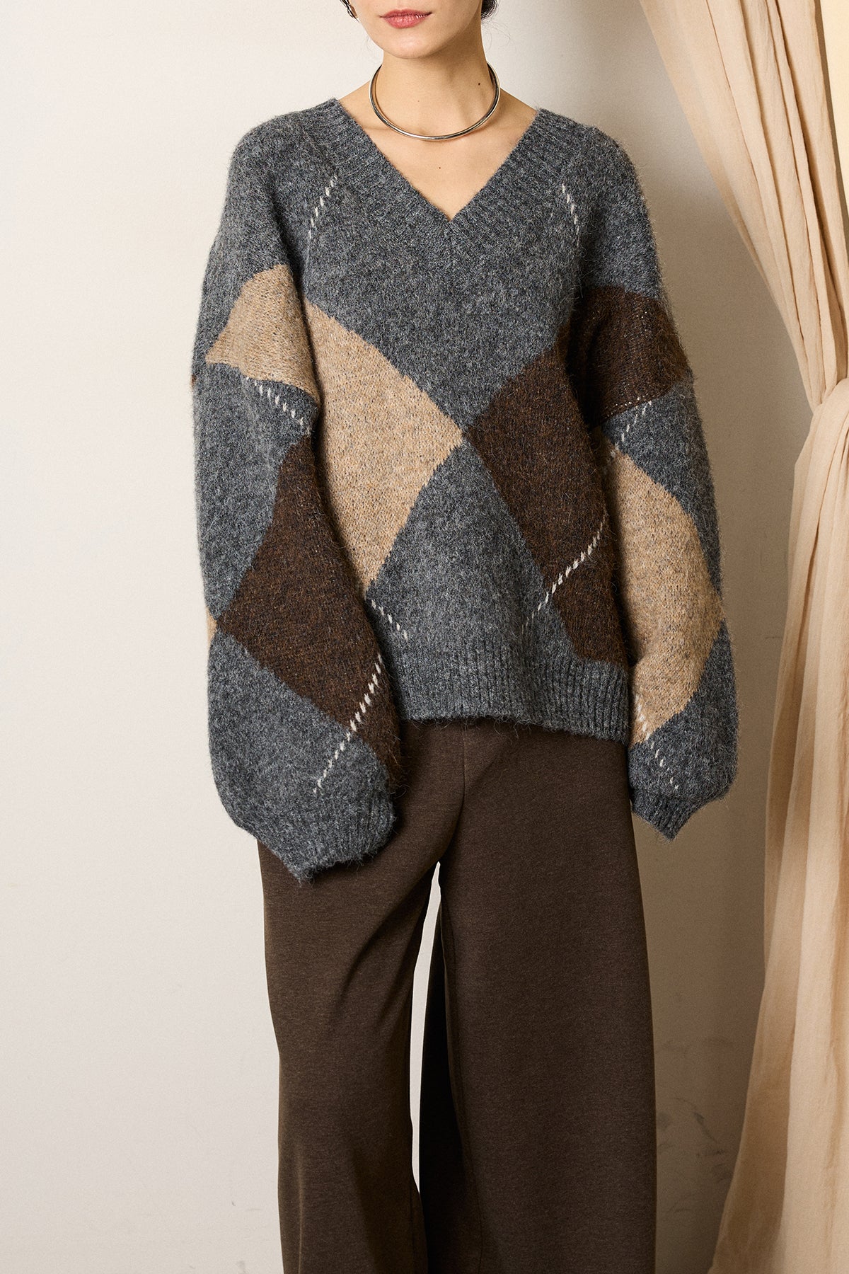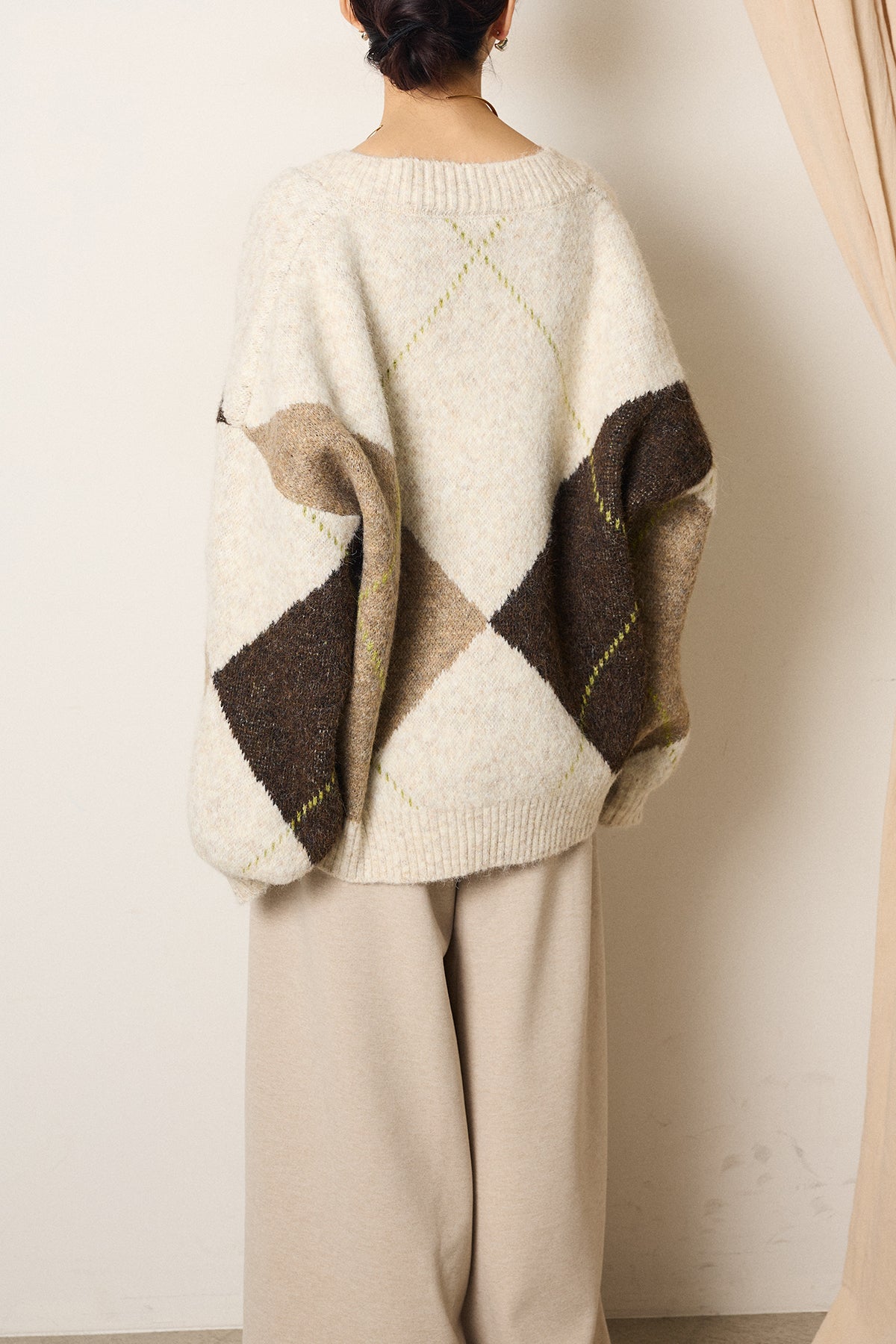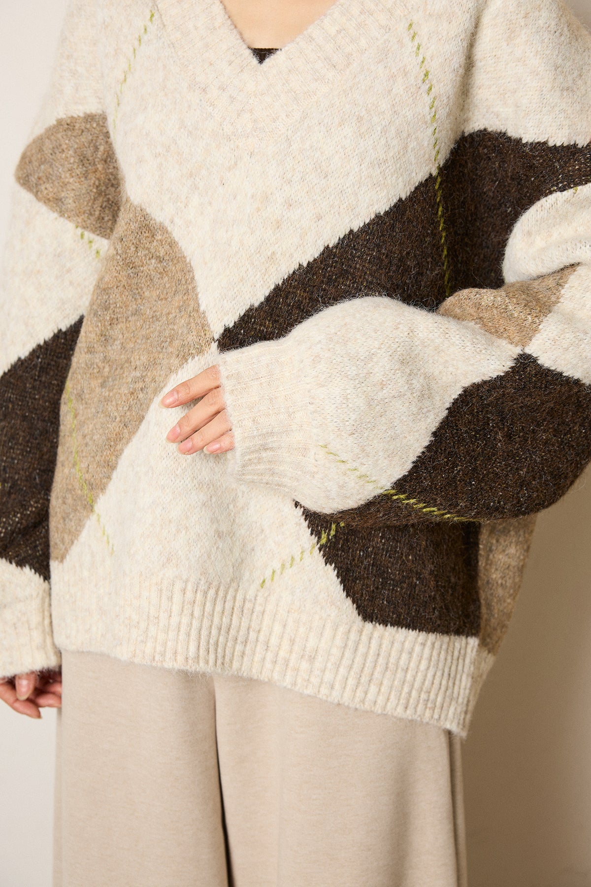 大きめのアーガイル柄が印象的なVネックニット。 ふんわりとした糸で編み立てた優しい風合いが、温もりのあるムードを引き立てます。 ゆったりとしたシルエットが抜け感を生み、リラックス感のある着こなしに。 深めのVネックが顔まわりをすっきり見せ、上品な抜け感をプラスします。 シンプルなボトムと合わせるだけで、主役になる存在感のあるアイテムです。