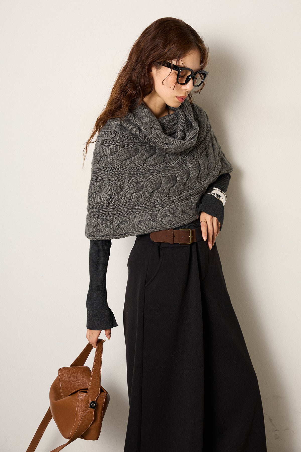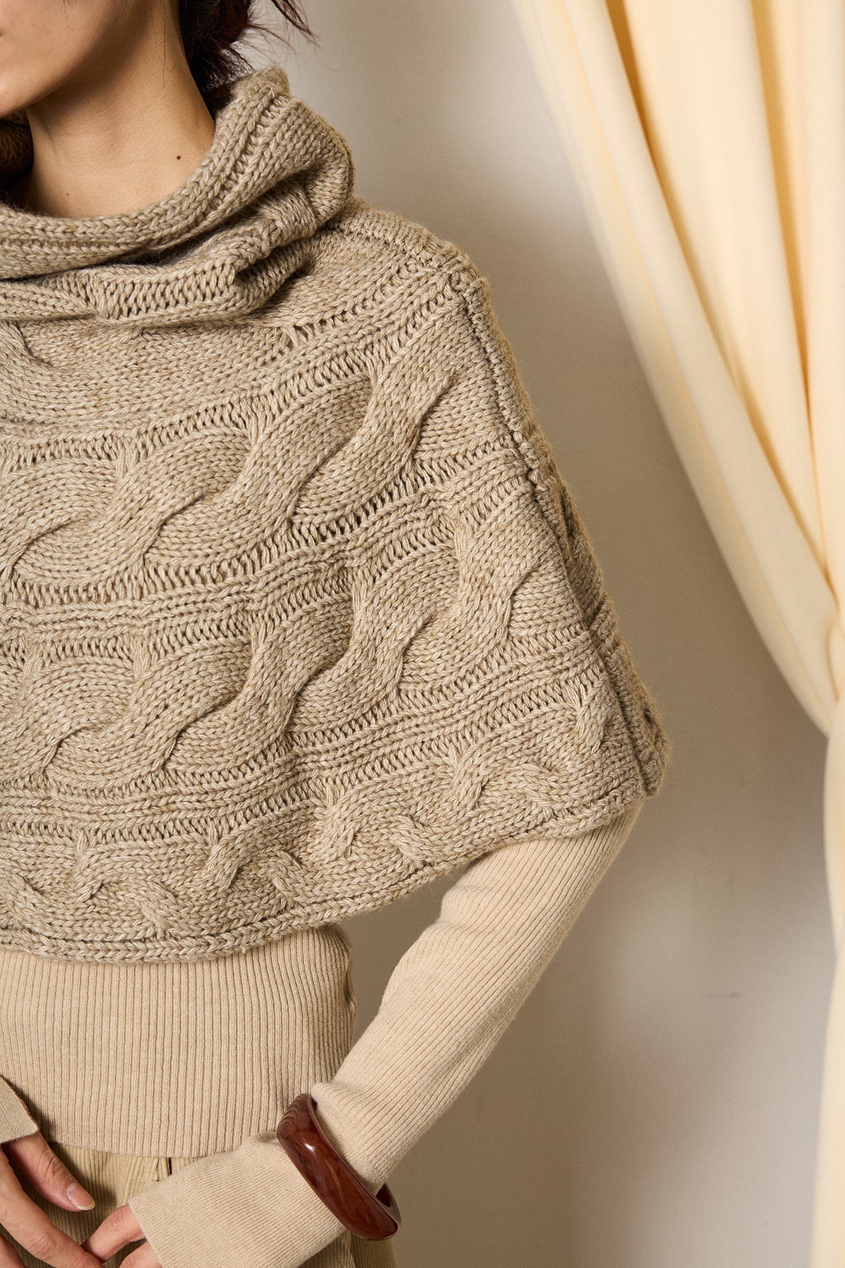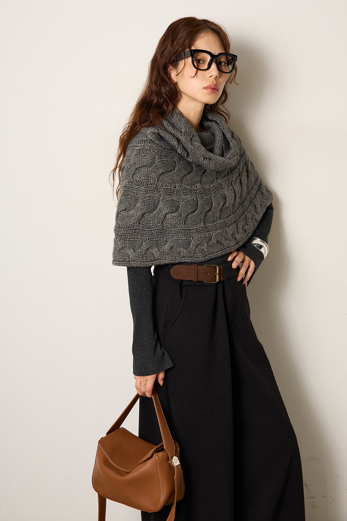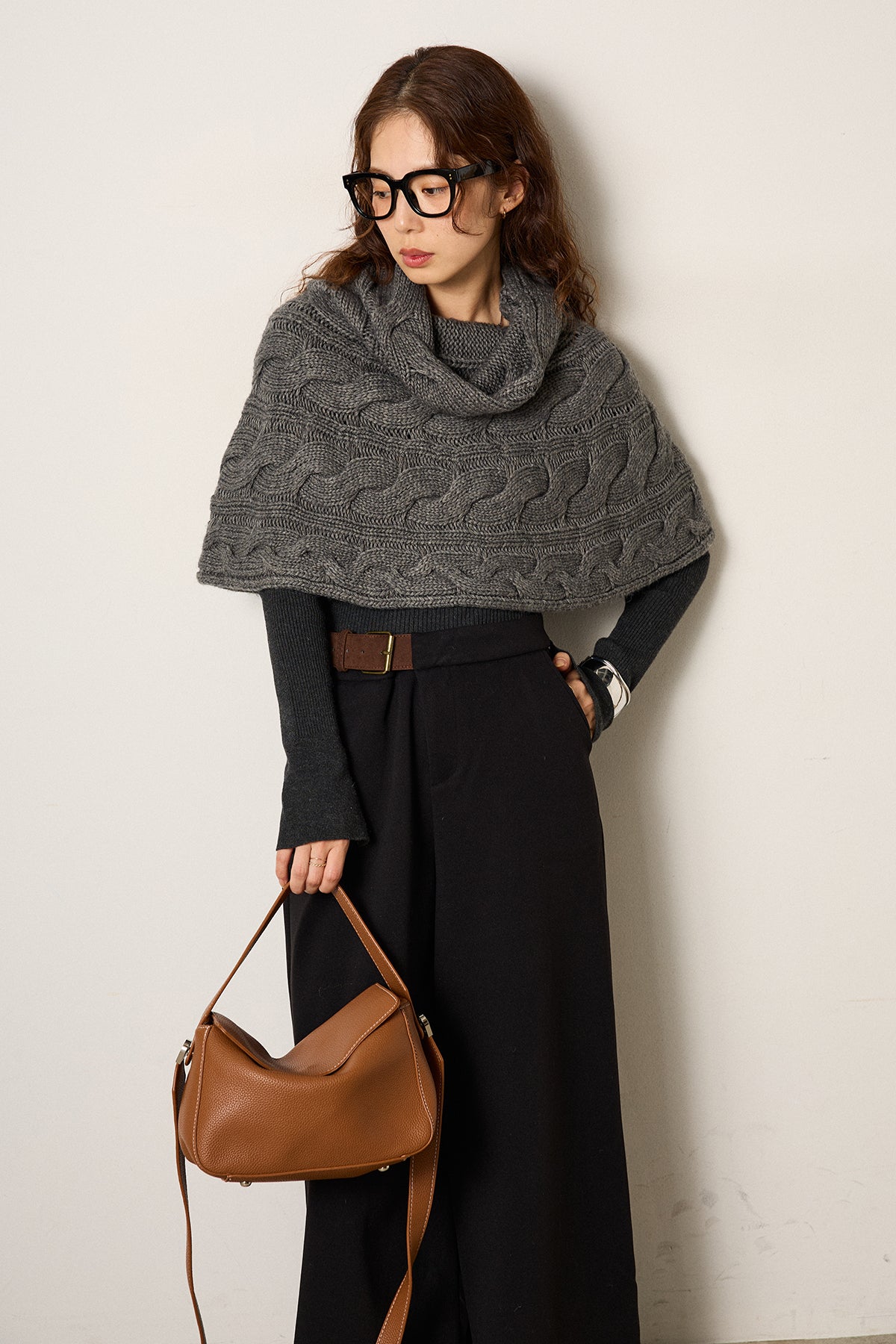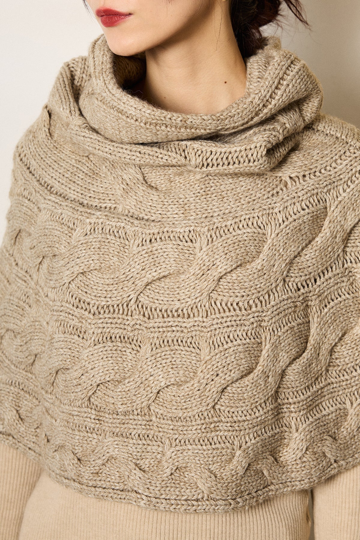 立体感のあるケーブル編みが魅力のケープ付きニット。 ショルダーラインを包み込むようなデザインで、柔らかなニュアンスをプラス。 レイヤード風のシルエットが一枚でスタイルを完成させ、上品な抜け感を演出します。 パンツにもスカートにも合わせやすく、秋冬のコーディネートに温もりを添えるアイテムです。
