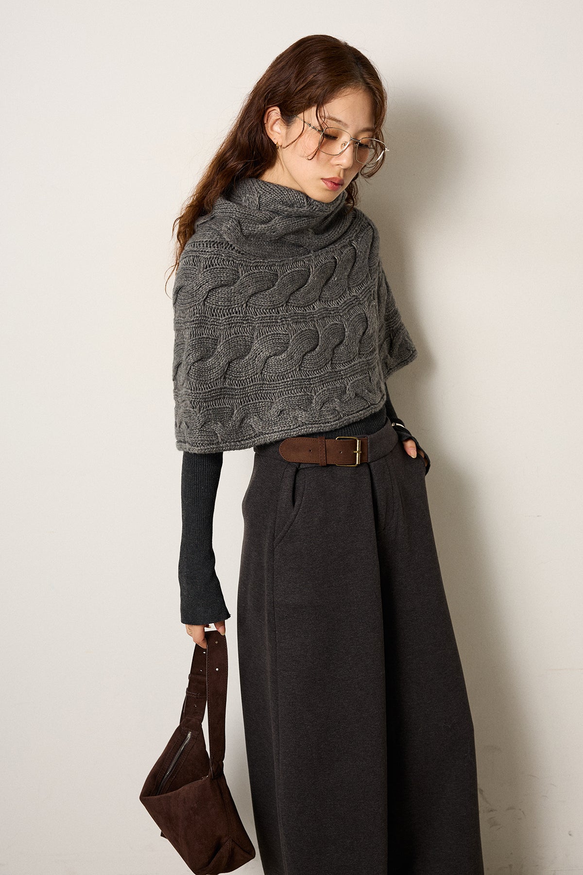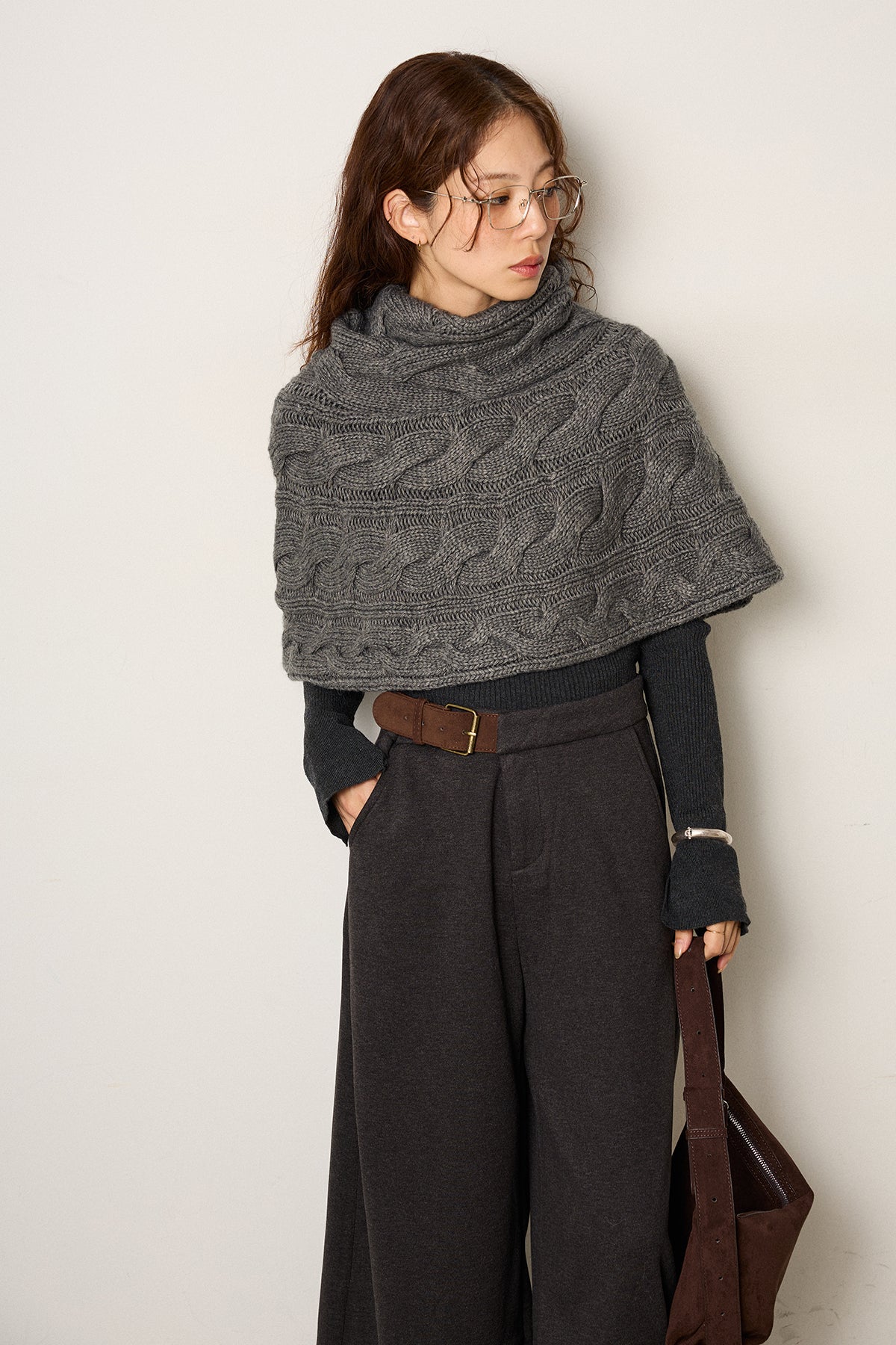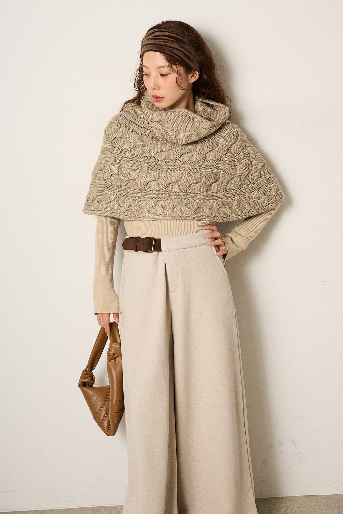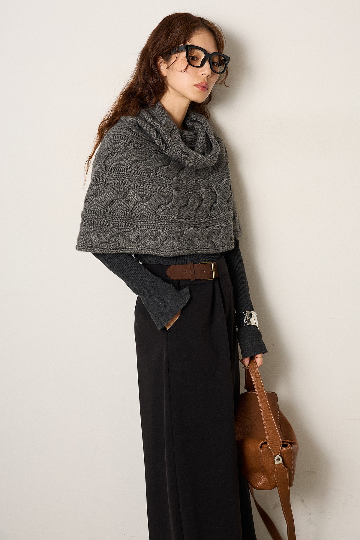 立体感のあるケーブル編みが魅力のケープ付きニット。 ショルダーラインを包み込むようなデザインで、柔らかなニュアンスをプラス。 レイヤード風のシルエットが一枚でスタイルを完成させ、上品な抜け感を演出します。 パンツにもスカートにも合わせやすく、秋冬のコーディネートに温もりを添えるアイテムです。