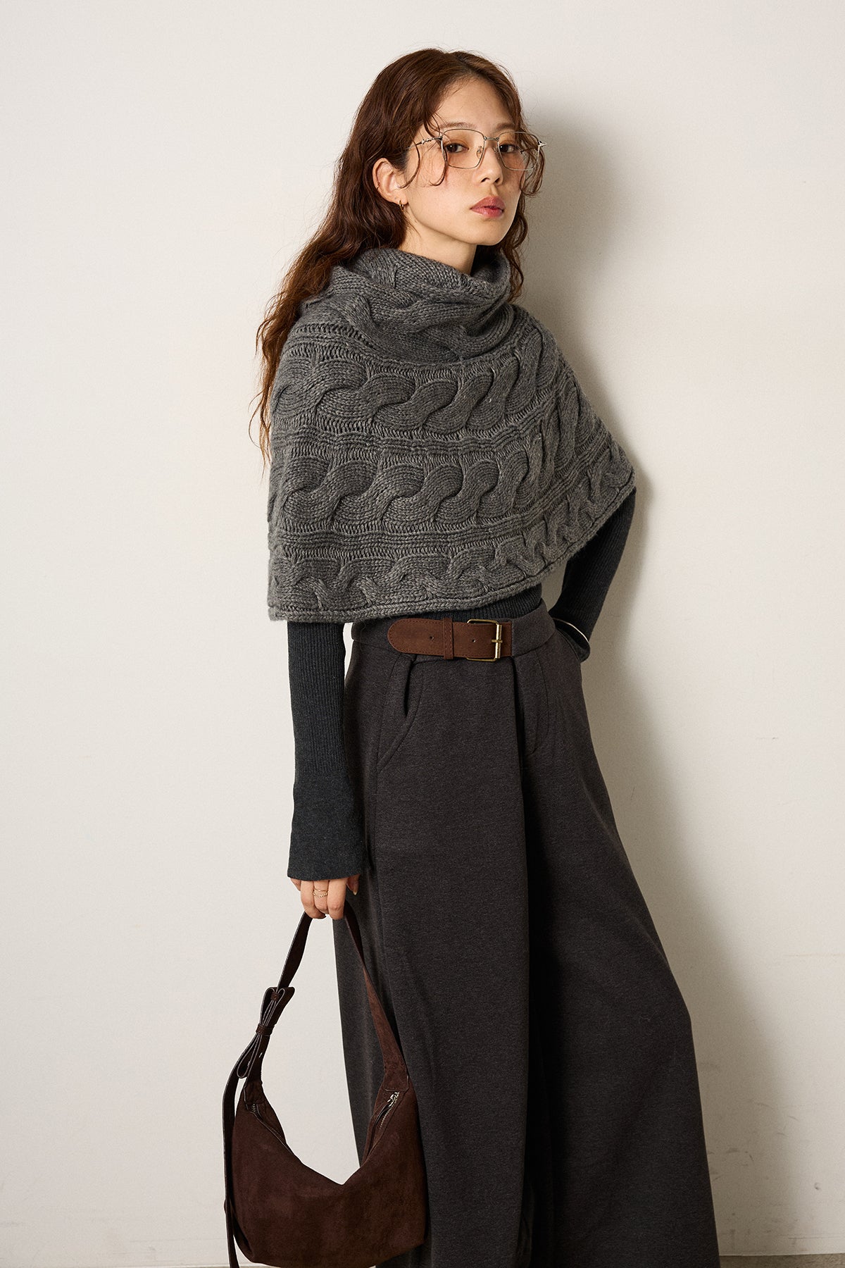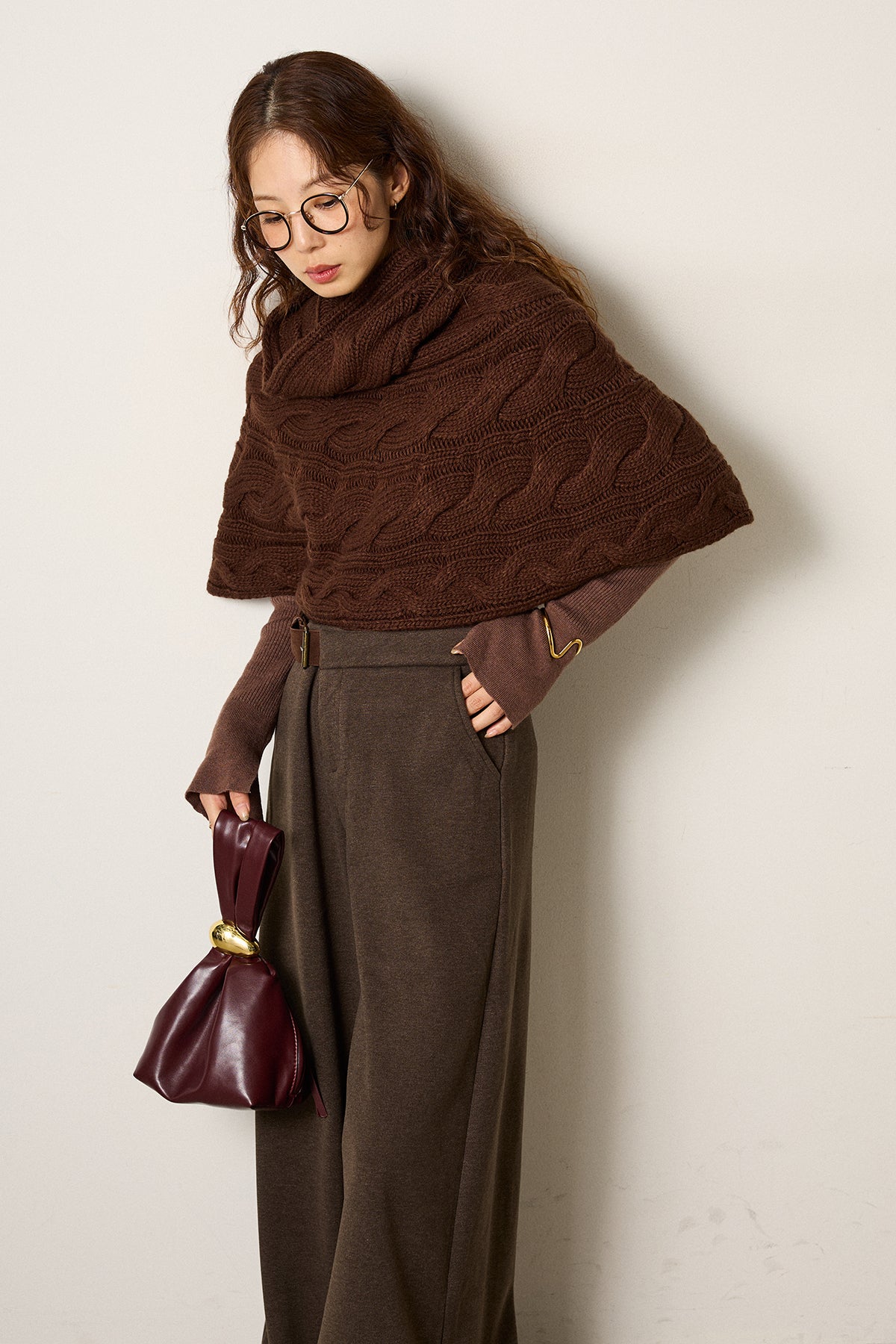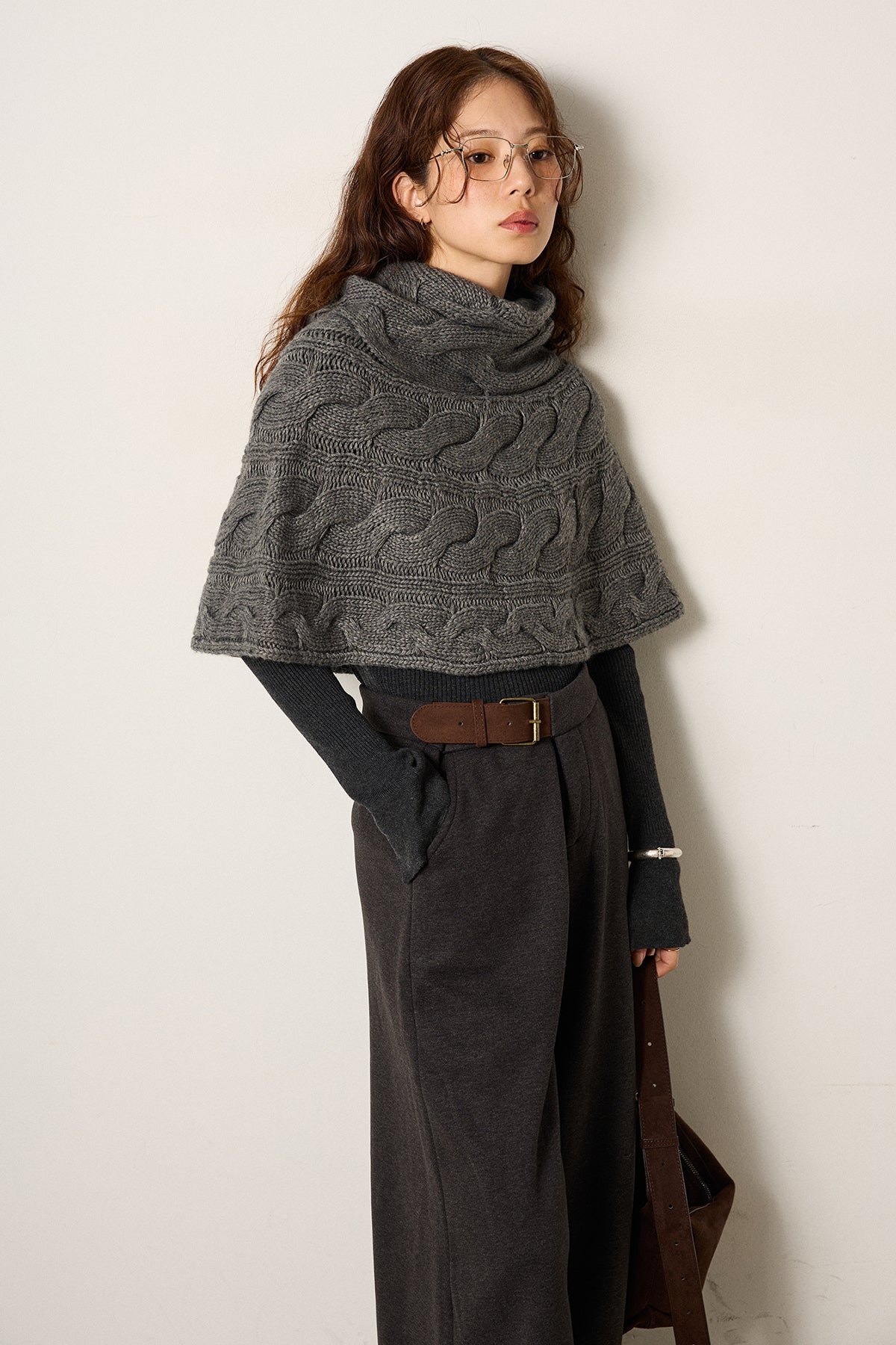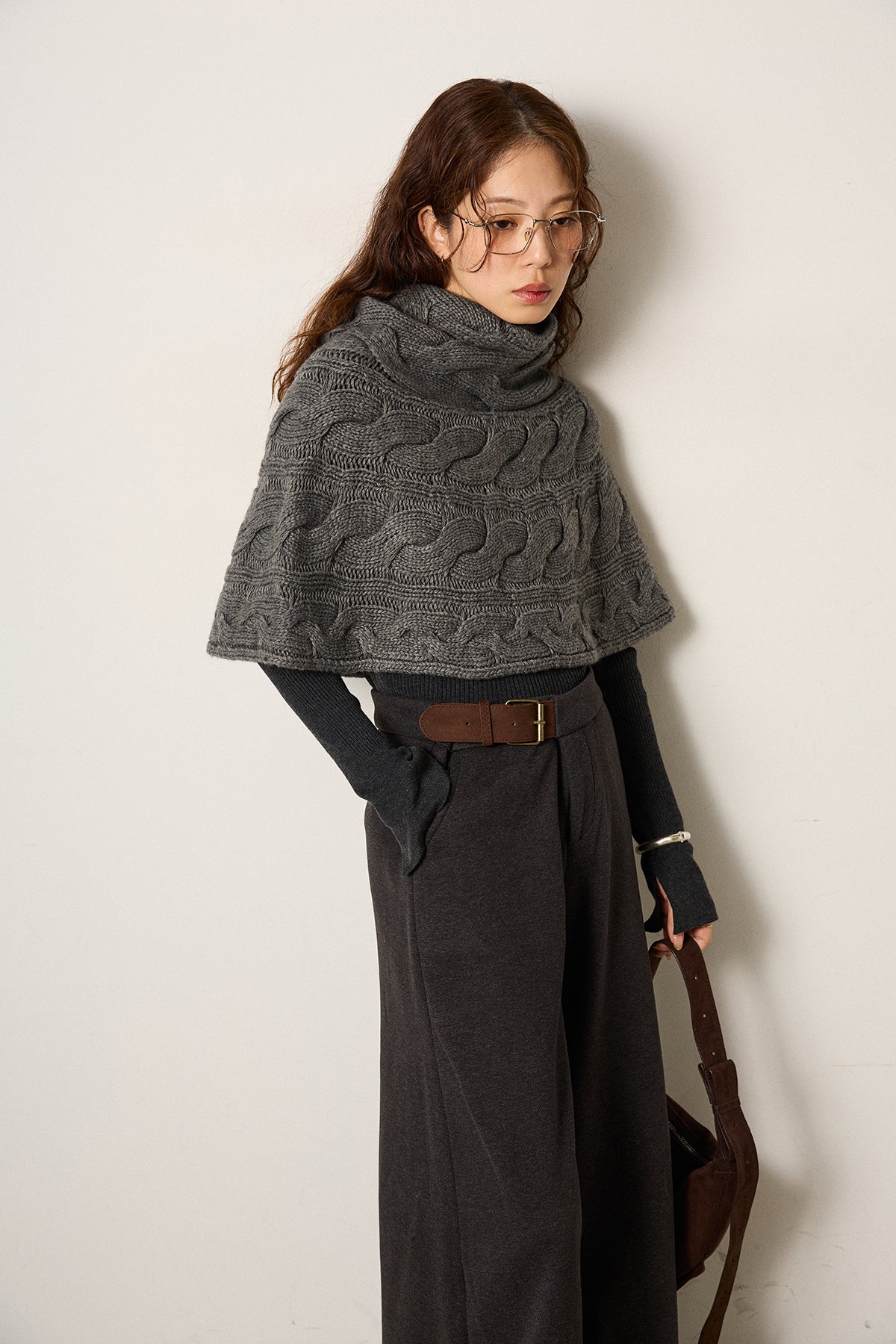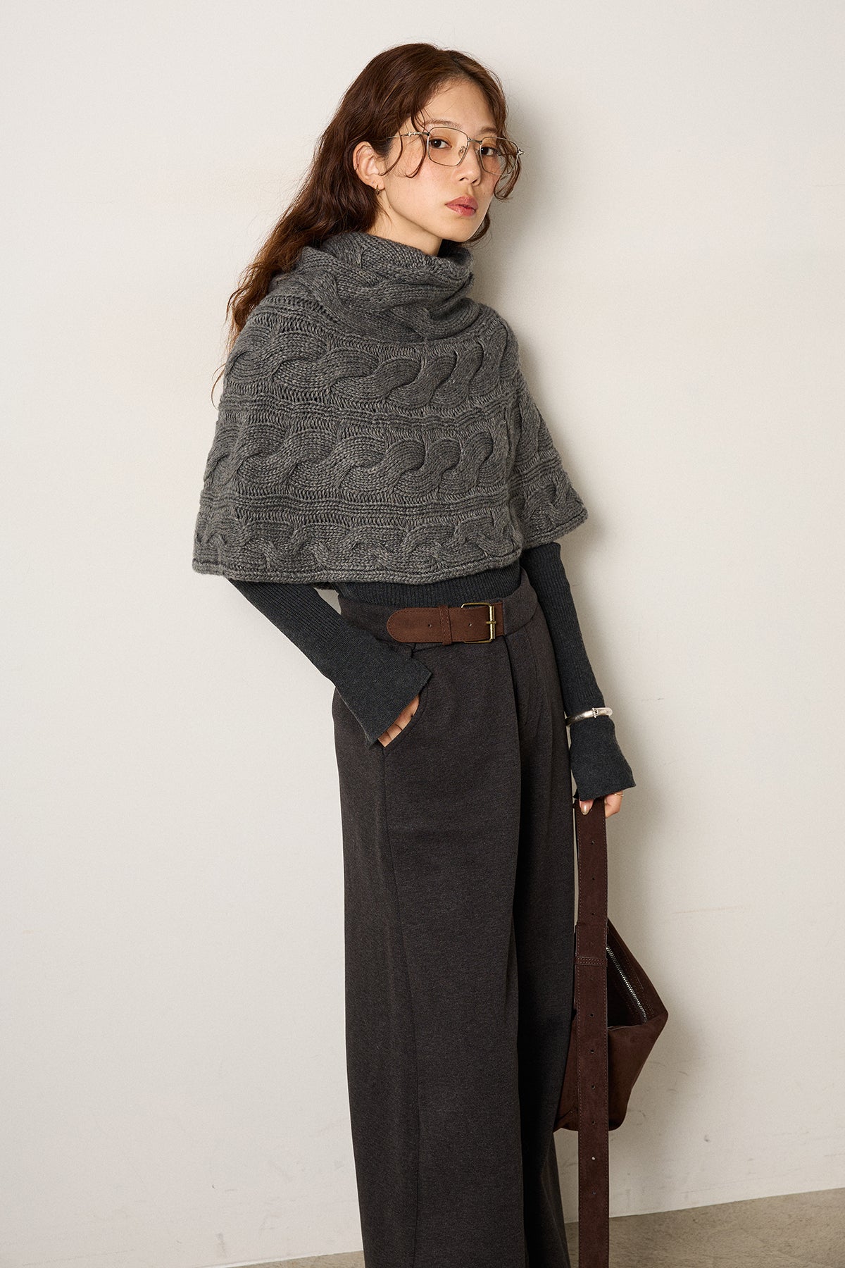 立体感のあるケーブル編みが魅力のケープ付きニット。 ショルダーラインを包み込むようなデザインで、柔らかなニュアンスをプラス。 レイヤード風のシルエットが一枚でスタイルを完成させ、上品な抜け感を演出します。 パンツにもスカートにも合わせやすく、秋冬のコーディネートに温もりを添えるアイテムです。