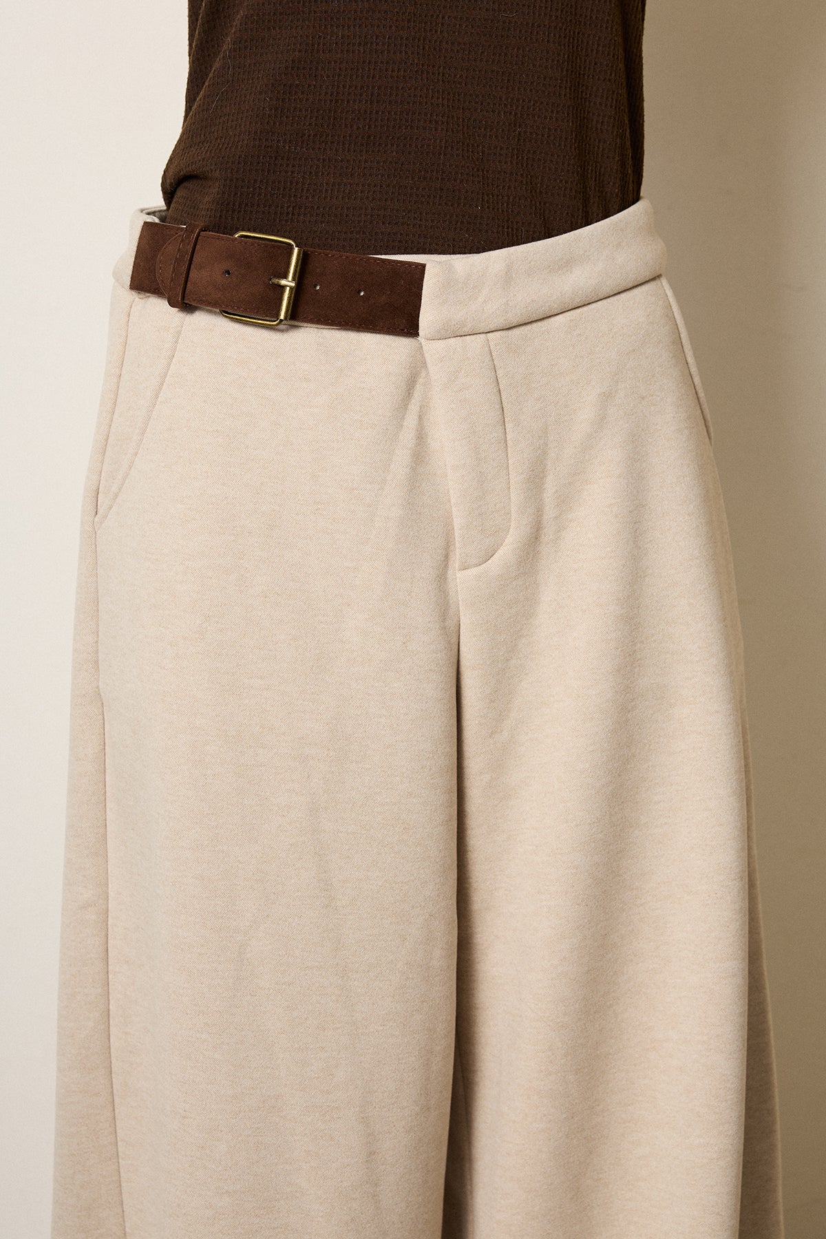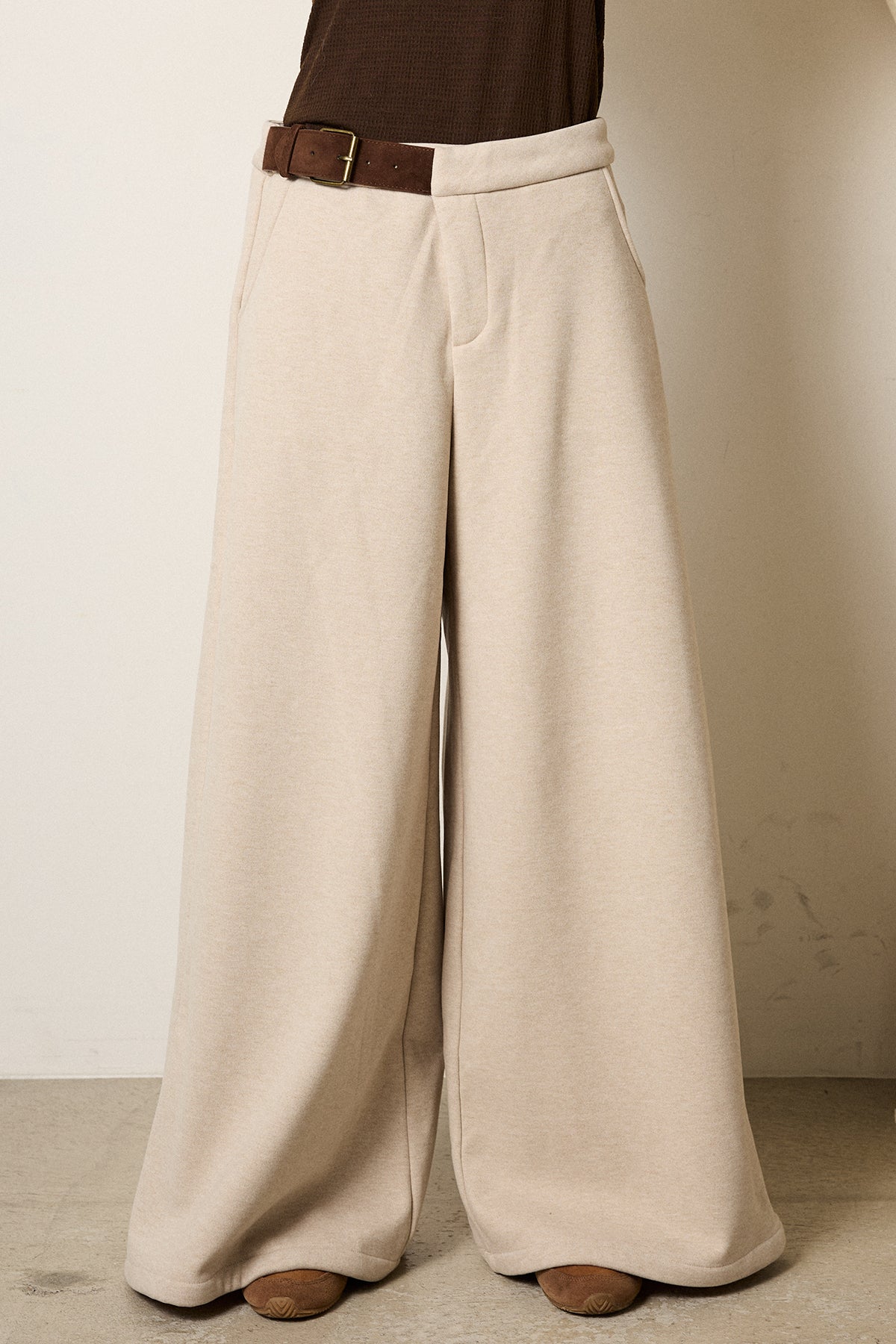 柔らかな風合いと落ち感のある素材が魅力のワイドパンツ。 サイドのバックルベルトが程よいアクセントとなり、ウエストまわりをすっきりと見せてくれます。 ボリュームのあるシルエットながらも縦のラインを強調し、脚長効果を叶える一本。 シンプルなトップスを合わせるだけで洗練された印象に仕上がります。