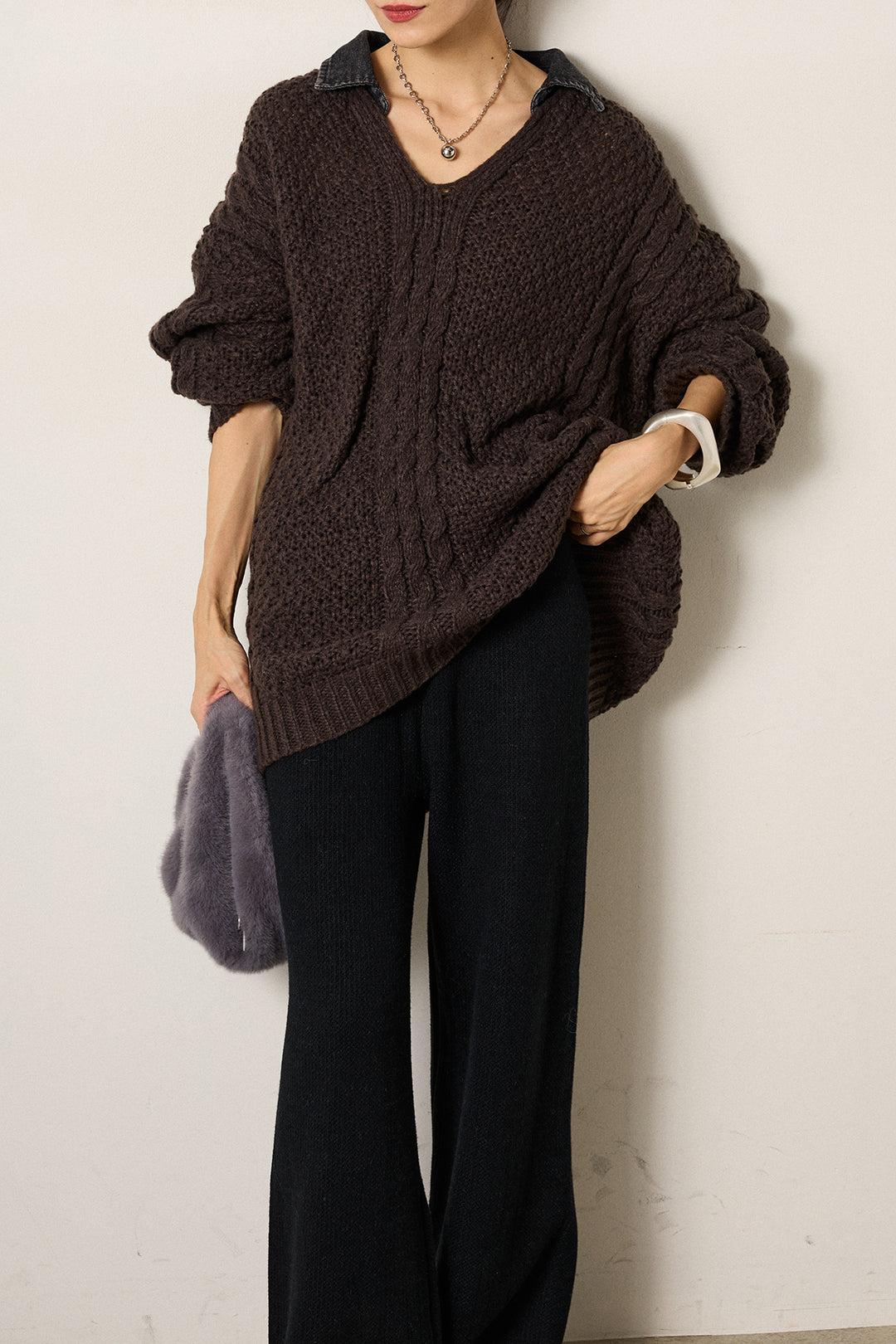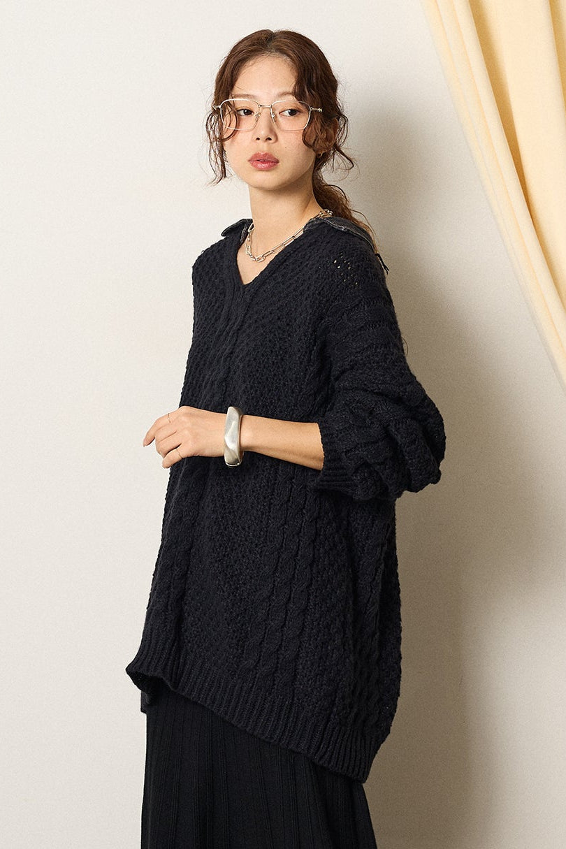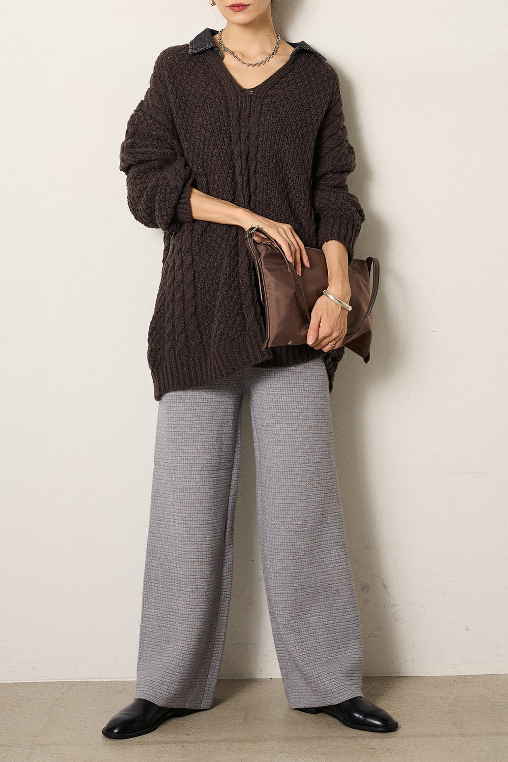 [SET]デニムカラーケーブルオーバーニット+ワイドリブニットイージーパンツ(2set)