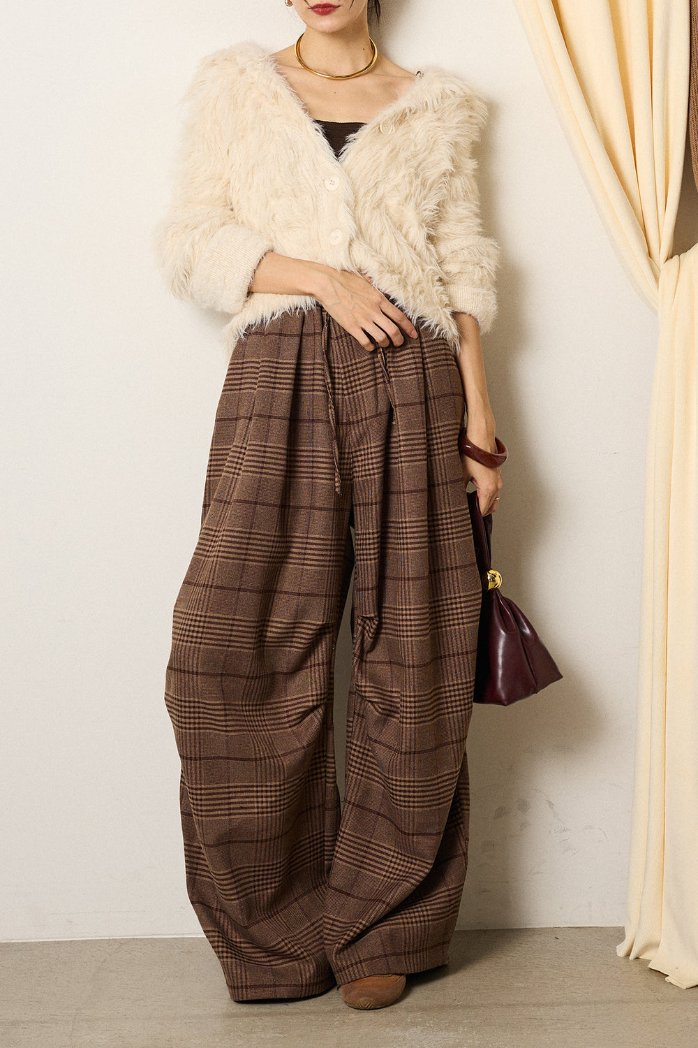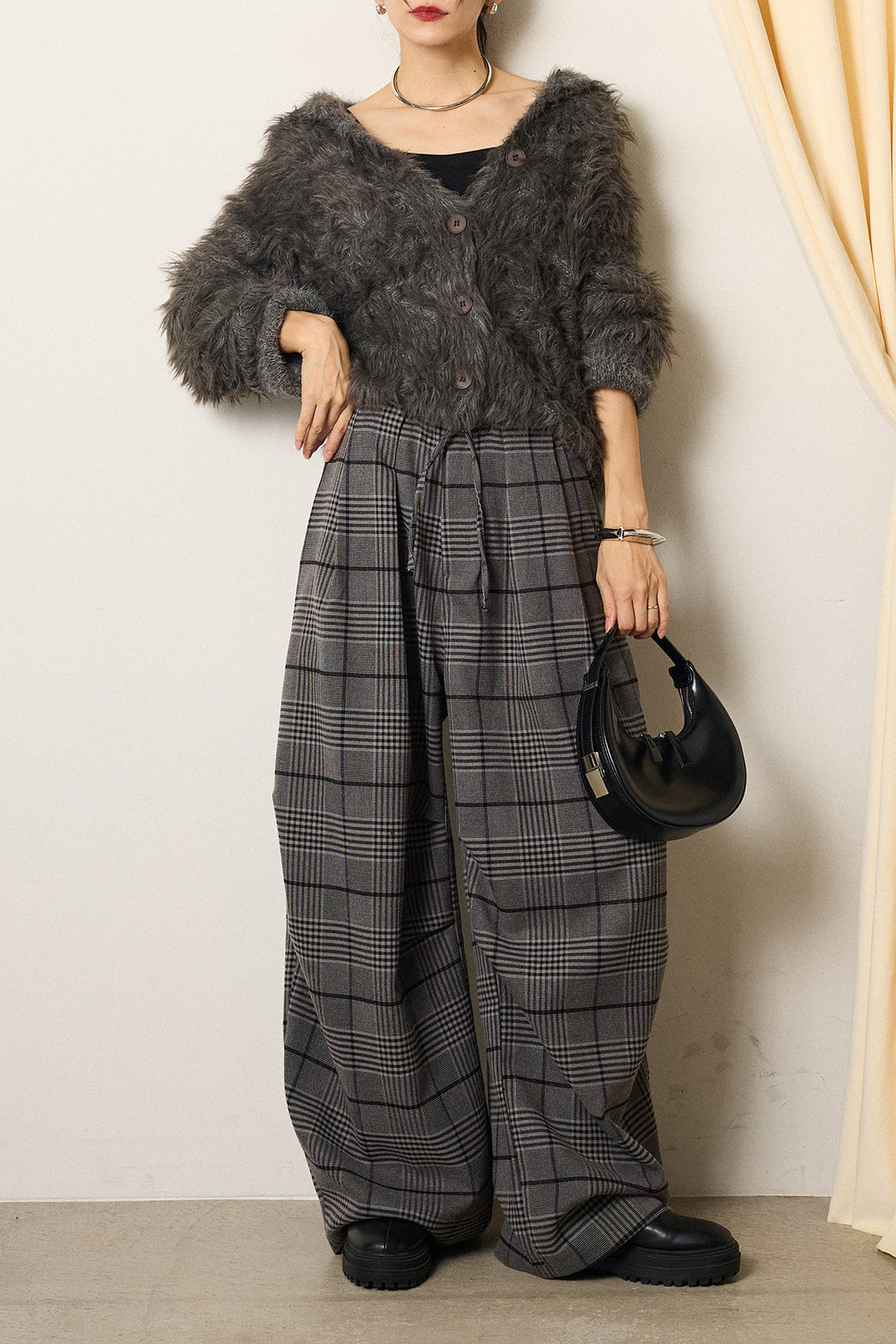 [SET]襟付きシャギーニットカーディガン+グレンチェックルーズタックパンツ(2set)